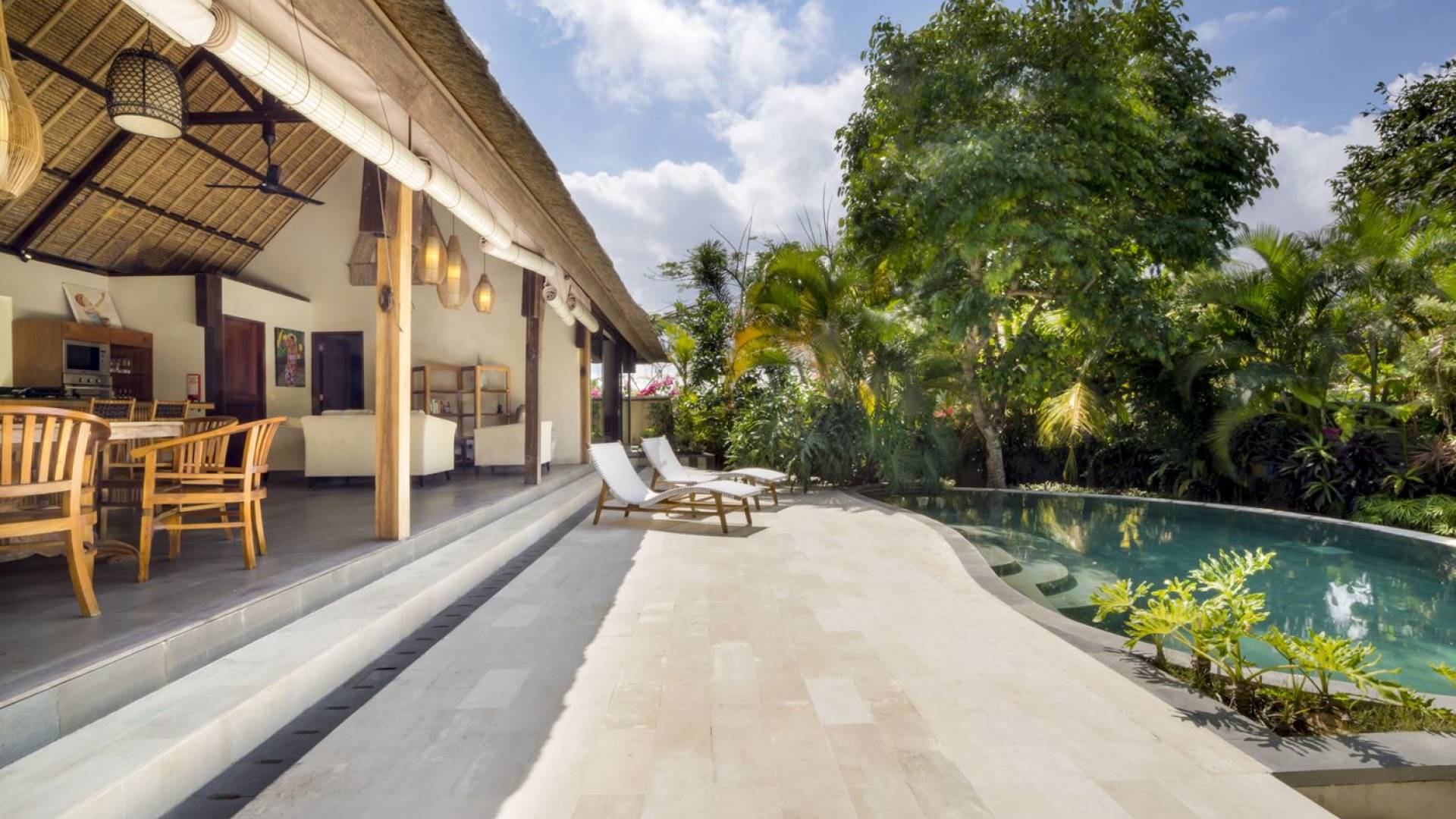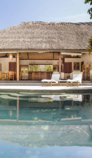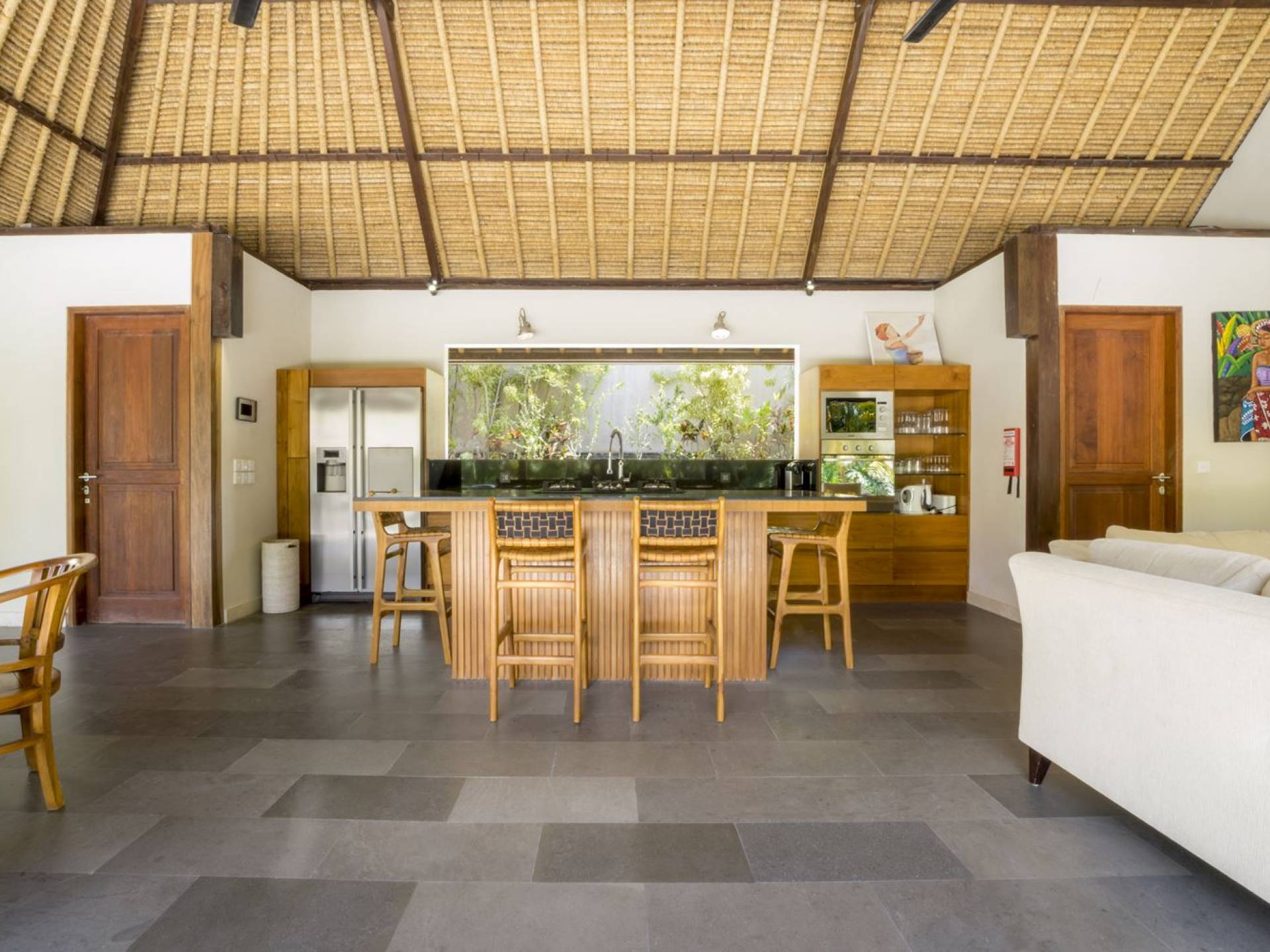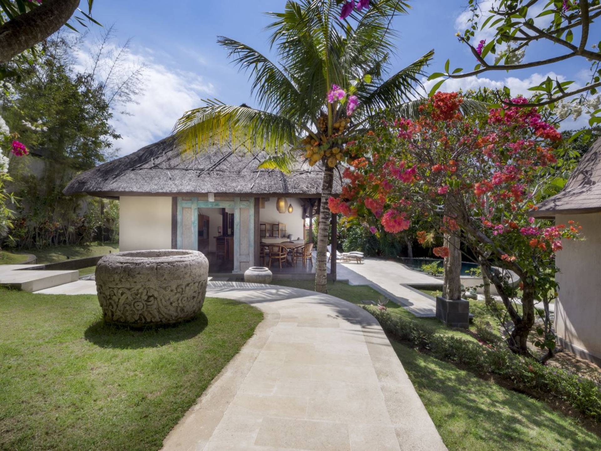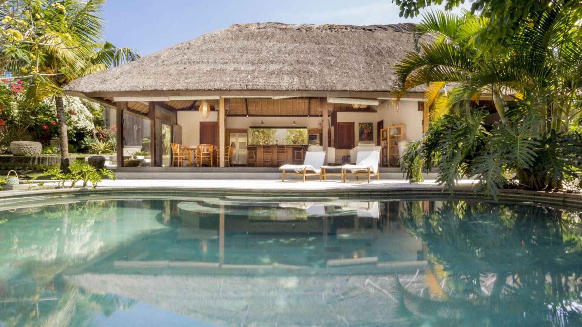 Esta hermosa villa cuenta con una sala de estar tradicional de planta abierta con un alto techo de paja "alang-alang" e interiores sofisticados y elegantes inspirados en la naturaleza. El uso de madera de teca recuperada, ratán y bambú le da a la villa una sensación cálida y auténtica. El jardín es como un verdadero oasis tropical, intacto y floreciente. Rodeada de árboles de frangipani, buganvillas, palmeras y más vegetación local brilla la piscina privada en forma de frijol. La piscina cuenta con un escalón poco profundo y se desborda por todos lados para crear una sensación de infinito, mientras que el sonido del agua ondulante solo se suma a la sensación de paraíso. El jardín cuenta con islas de césped verde bien cuidado donde los niños pueden jugar a la sombra de los árboles y la piscina está flanqueada por una terraza de piedra con sillas reclinables de lujo para tomar el sol. Villa Lalita cuenta con una mesa de comedor redonda de madera para disfrutar de desayunos y cenas en familia, una cocina moderna con barra y sillas altas para sentarse a tomar algo, escuchar música o navegar por el Wifi de cortesía en su computadora portátil y hay un sofá lounge para relajarse y disfruta de la vista al jardín y la piscina.