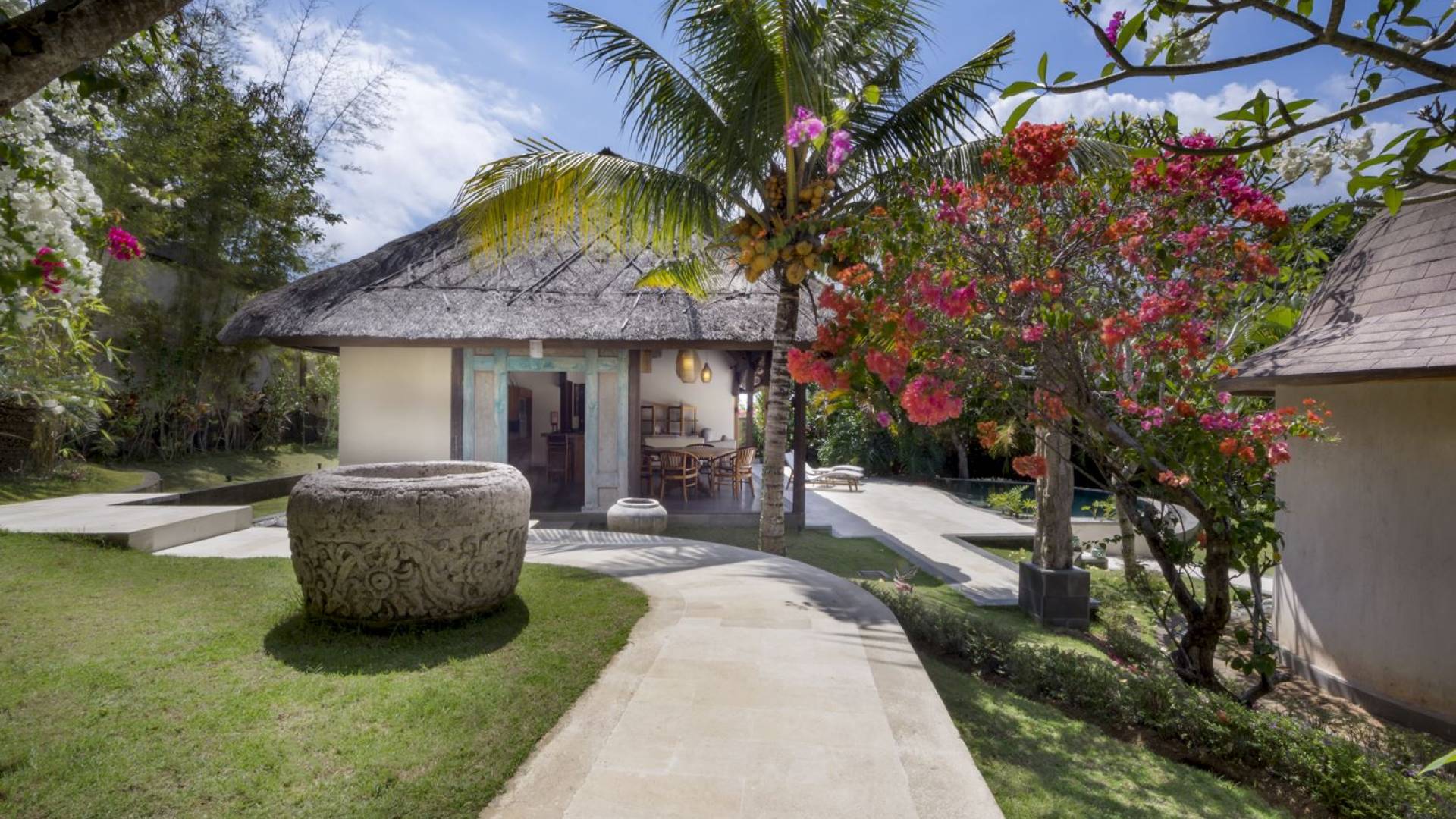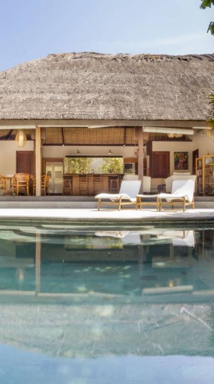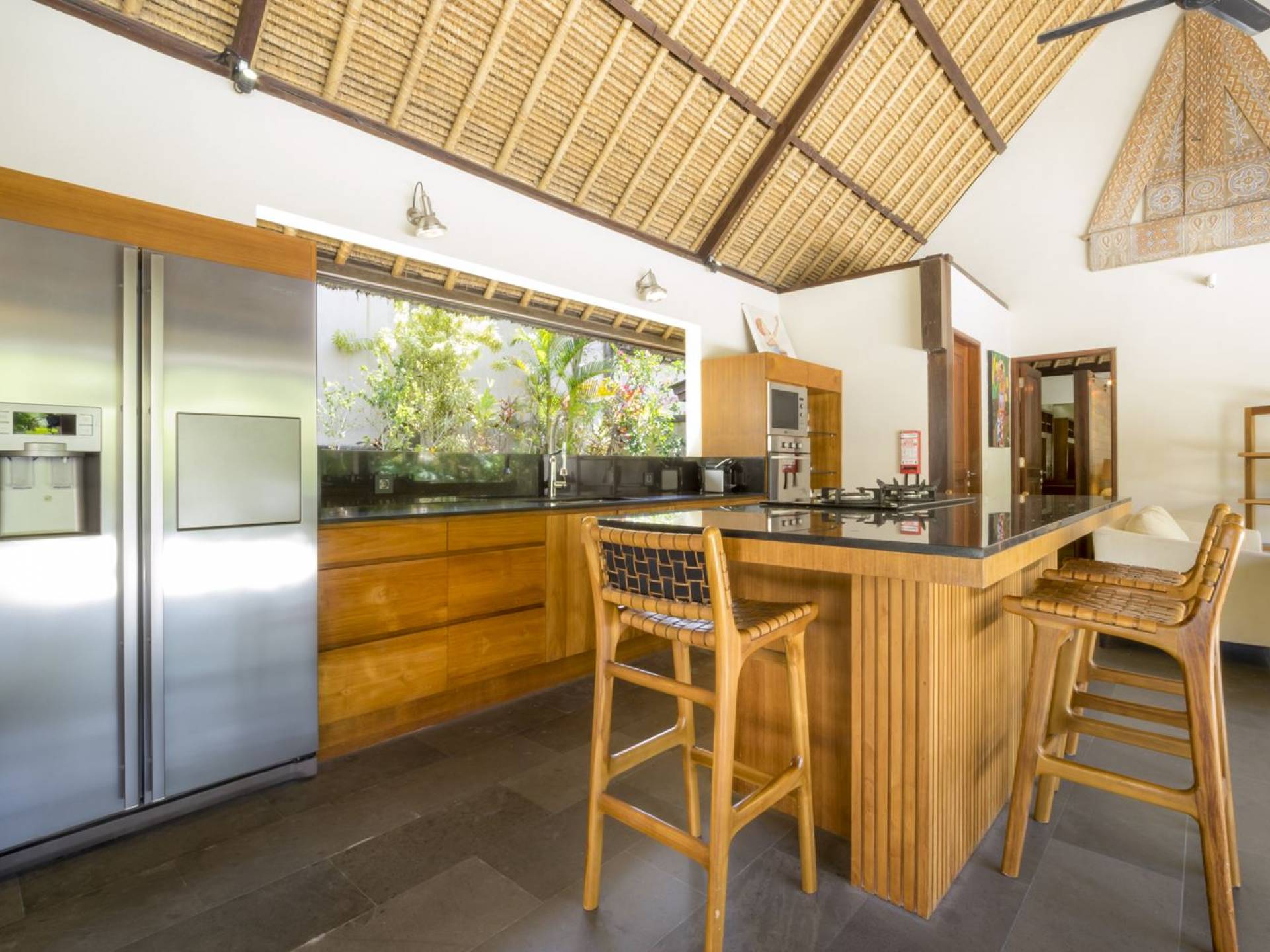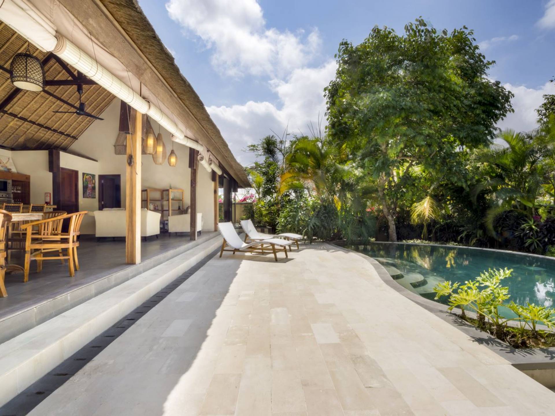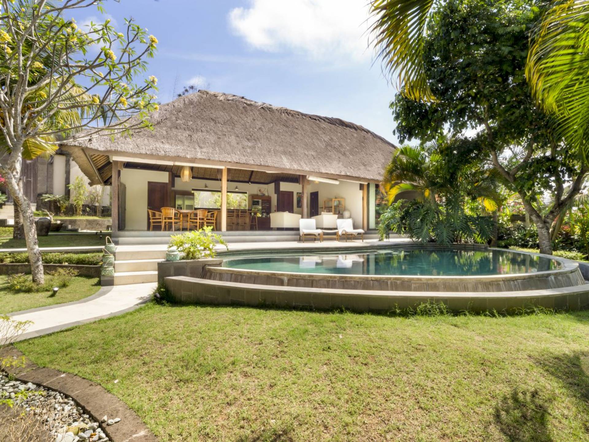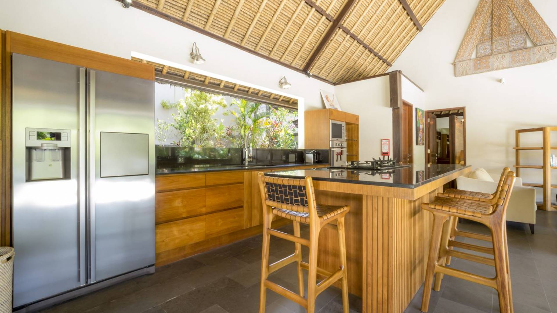 Esta hermosa villa cuenta con una sala de estar tradicional de planta abierta con un alto techo de paja "alang-alang" e interiores sofisticados y elegantes inspirados en la naturaleza. El uso de madera de teca recuperada, ratán y bambú le da a la villa una sensación cálida y auténtica. El jardín es como un verdadero oasis tropical, intacto y floreciente. Rodeada de árboles de frangipani, buganvillas, palmeras y más vegetación local brilla la piscina privada en forma de frijol. La piscina cuenta con un escalón poco profundo y se desborda por todos lados para crear una sensación de infinito, mientras que el sonido del agua ondulante solo se suma a la sensación de paraíso. El jardín cuenta con islas de césped verde bien cuidado donde los niños pueden jugar a la sombra de los árboles y la piscina está flanqueada por una terraza de piedra con sillas reclinables de lujo para tomar el sol. Villa Lalita cuenta con una mesa de comedor redonda de madera para disfrutar de desayunos y cenas en familia, una cocina moderna con barra y sillas altas para sentarse a tomar algo, escuchar música o navegar por el Wifi de cortesía en su computadora portátil y hay un sofá lounge para relajarse y disfruta de la vista al jardín y la piscina.
