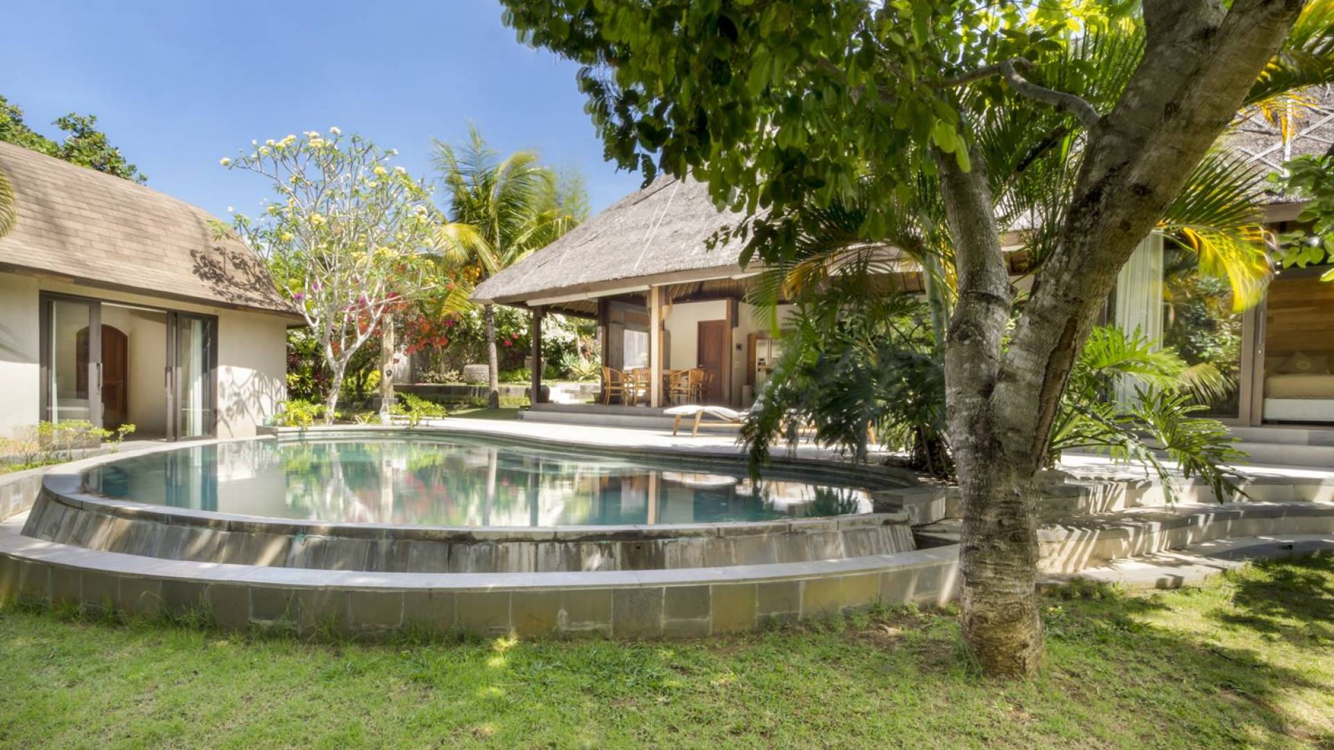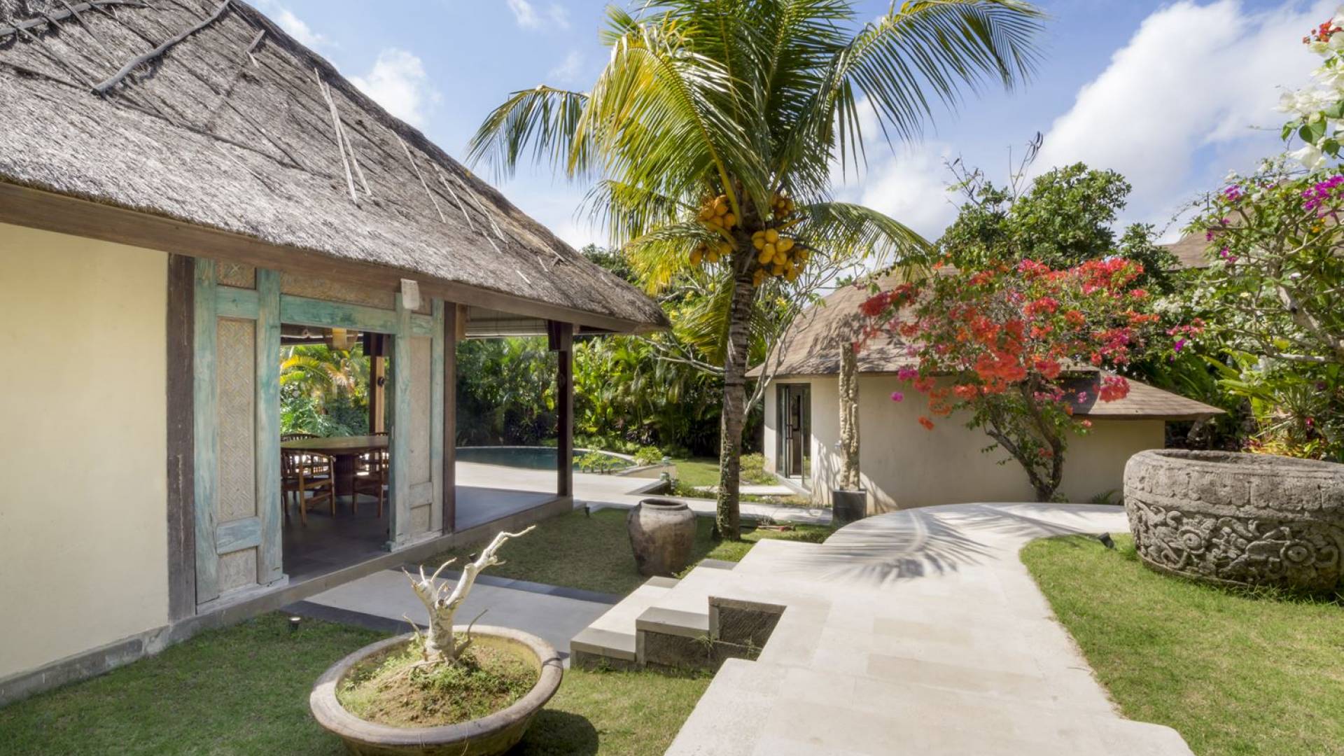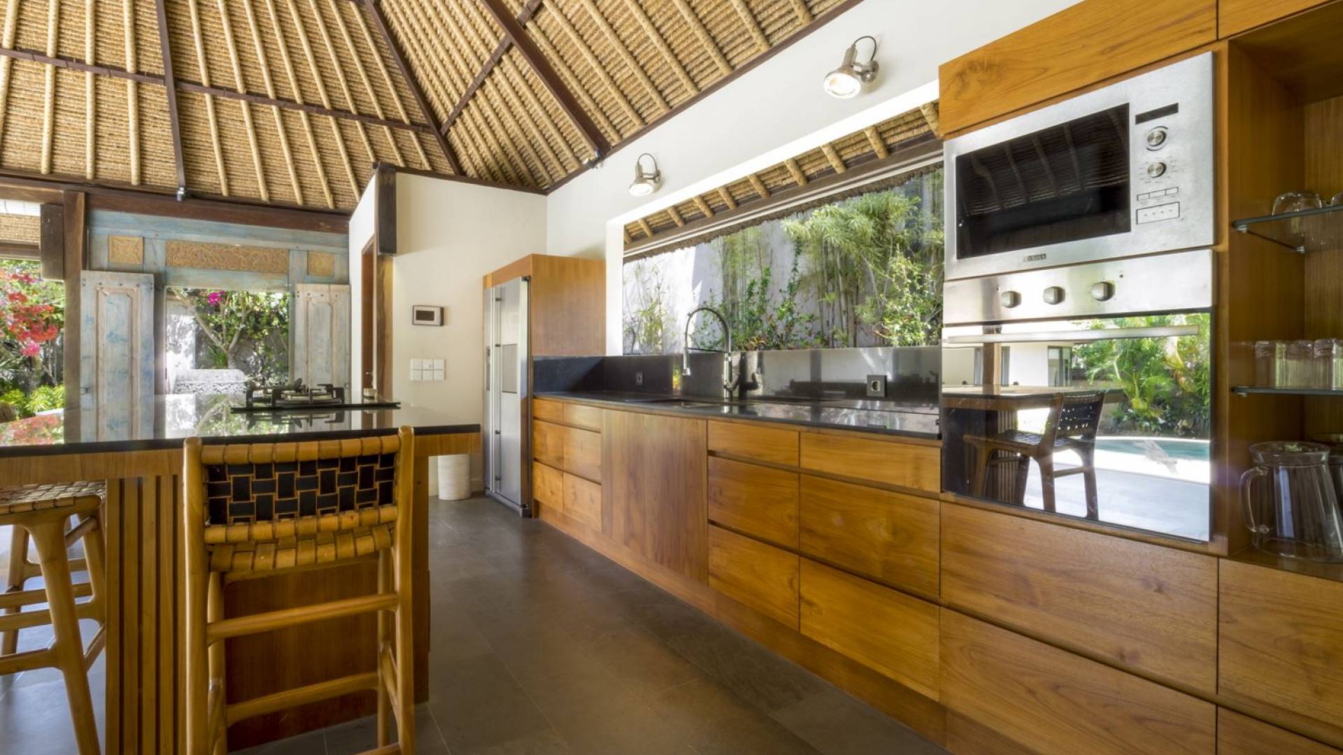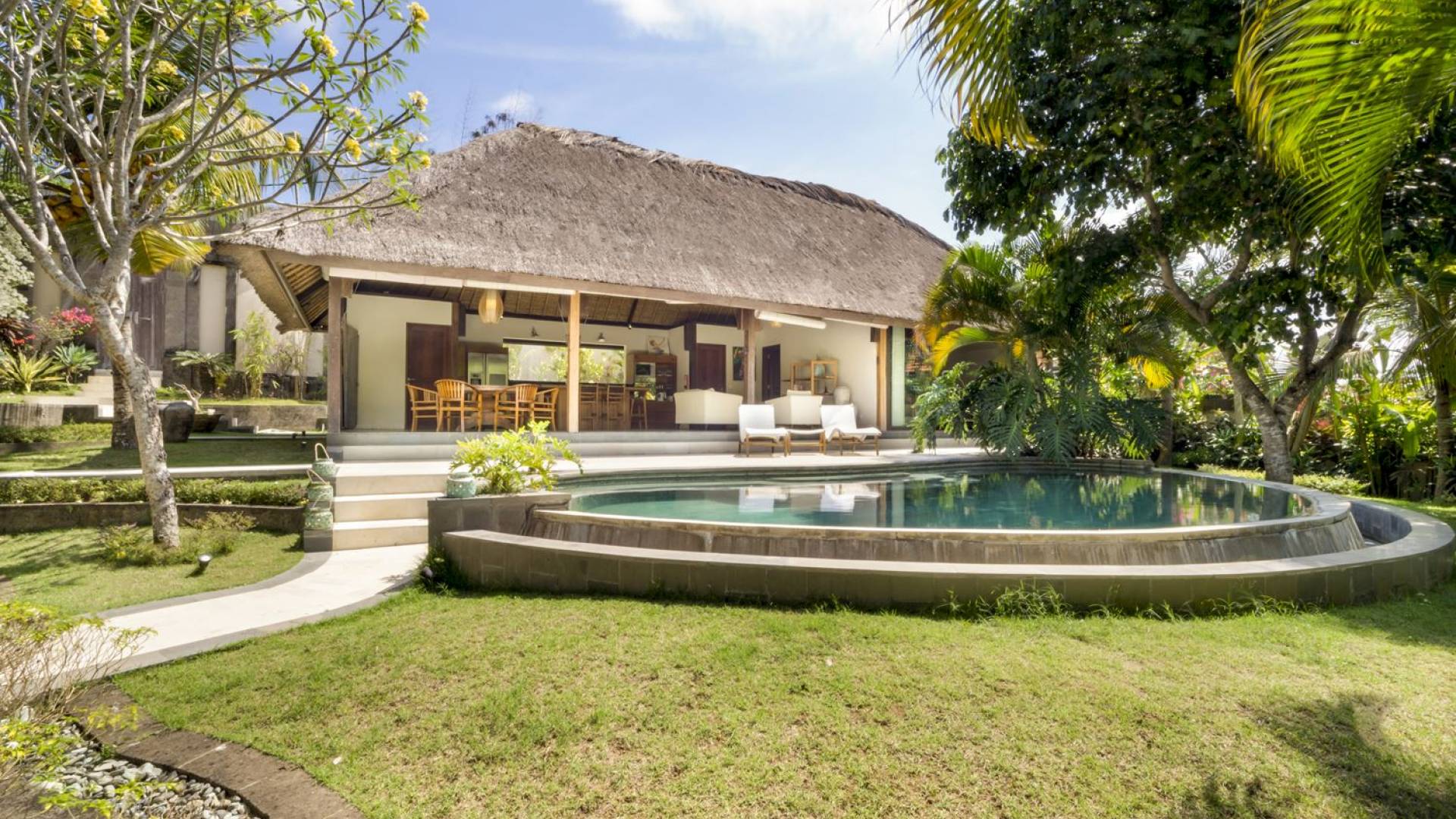 Esta hermosa villa cuenta con una sala de estar tradicional de planta abierta con un alto techo de paja "alang-alang" e interiores sofisticados y elegantes inspirados en la naturaleza. El uso de madera de teca recuperada, ratán y bambú le da a la villa una sensación cálida y auténtica. El jardín es como un verdadero oasis tropical, intacto y floreciente. Rodeada de árboles de frangipani, buganvillas, palmeras y más vegetación local brilla la piscina privada en forma de frijol. La piscina cuenta con un escalón poco profundo y se desborda por todos lados para crear una sensación de infinito, mientras que el sonido del agua ondulante solo se suma a la sensación de paraíso. El jardín cuenta con islas de césped verde bien cuidado donde los niños pueden jugar a la sombra de los árboles y la piscina está flanqueada por una terraza de piedra con sillas reclinables de lujo para tomar el sol. Villa Lalita cuenta con una mesa de comedor redonda de madera para disfrutar de desayunos y cenas en familia, una cocina moderna con barra y sillas altas para sentarse a tomar algo, escuchar música o navegar por el Wifi de cortesía en su computadora portátil y hay un sofá lounge para relajarse y disfruta de la vista al jardín y la piscina.