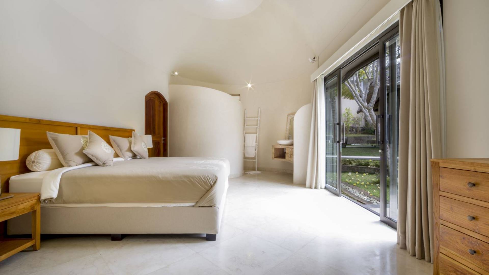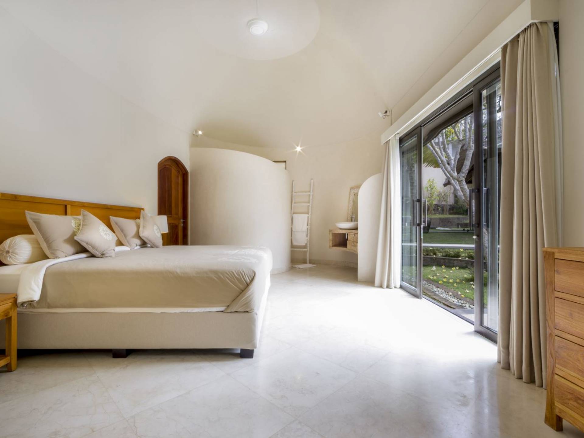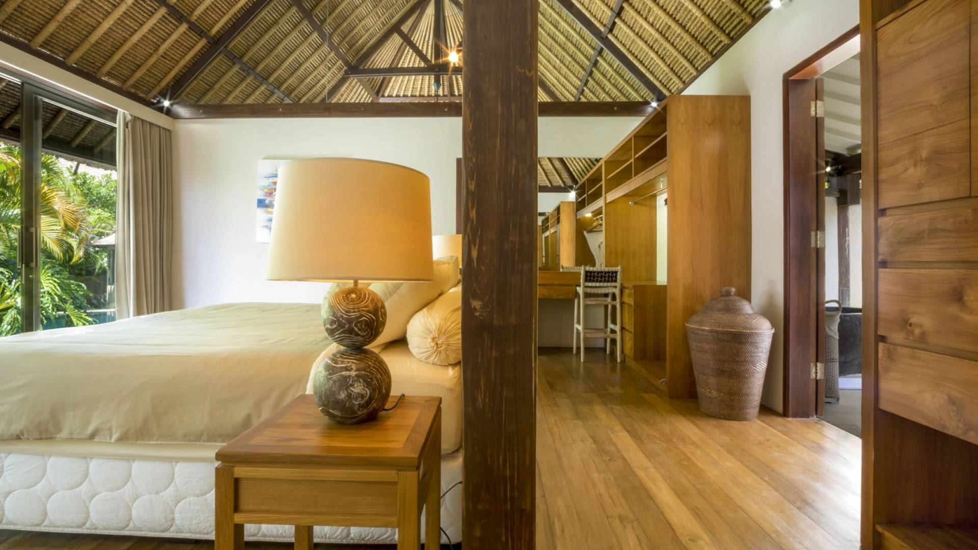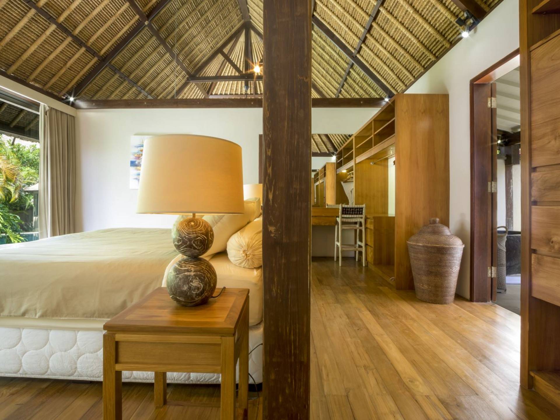 Esta adorable villa de lujo tradicional alberga 2 opulentas suites de un dormitorio. El dormitorio principal se encuentra dentro de la casa principal y el segundo dormitorio está ubicado en una casa de jardín separada de forma redonda, lo que brinda privacidad a todos los que se hospedan en Villa Lalita. El techo de paja tradicional de tono alto y el piso de madera rústica le dan al maestro dulce un ambiente natural y cálido. La luz natural del sol brilla durante todo el día, el aire puede circular fácilmente y la habitación está equipada con aire acondicionado. La gran cama tamaño king es súper cómoda y, antes de dormir, puede acurrucarse para ver una película o dos en el televisor de pantalla plana con canales internacionales y un reproductor de DVD. Detrás de la cama, hay un amplio vestidor con armarios de madera, un tocador y una caja de seguridad para guardar los objetos de valor que pueda tener. El baño privado está parcialmente al aire libre y está decorado con plantas con flores y vegetación tropical, un lugar maravilloso para disfrutar de una ducha bajo las estrellas o de un largo baño caliente en la bañera de roca de río. El segundo dormitorio también está completamente climatizado, equipado con dos camas individuales (convertibles en una cama doble extragrande bajo petición) y la habitación cuenta con una ducha en la habitación con un diseño único. ¡Lo verás cuando estés allí!