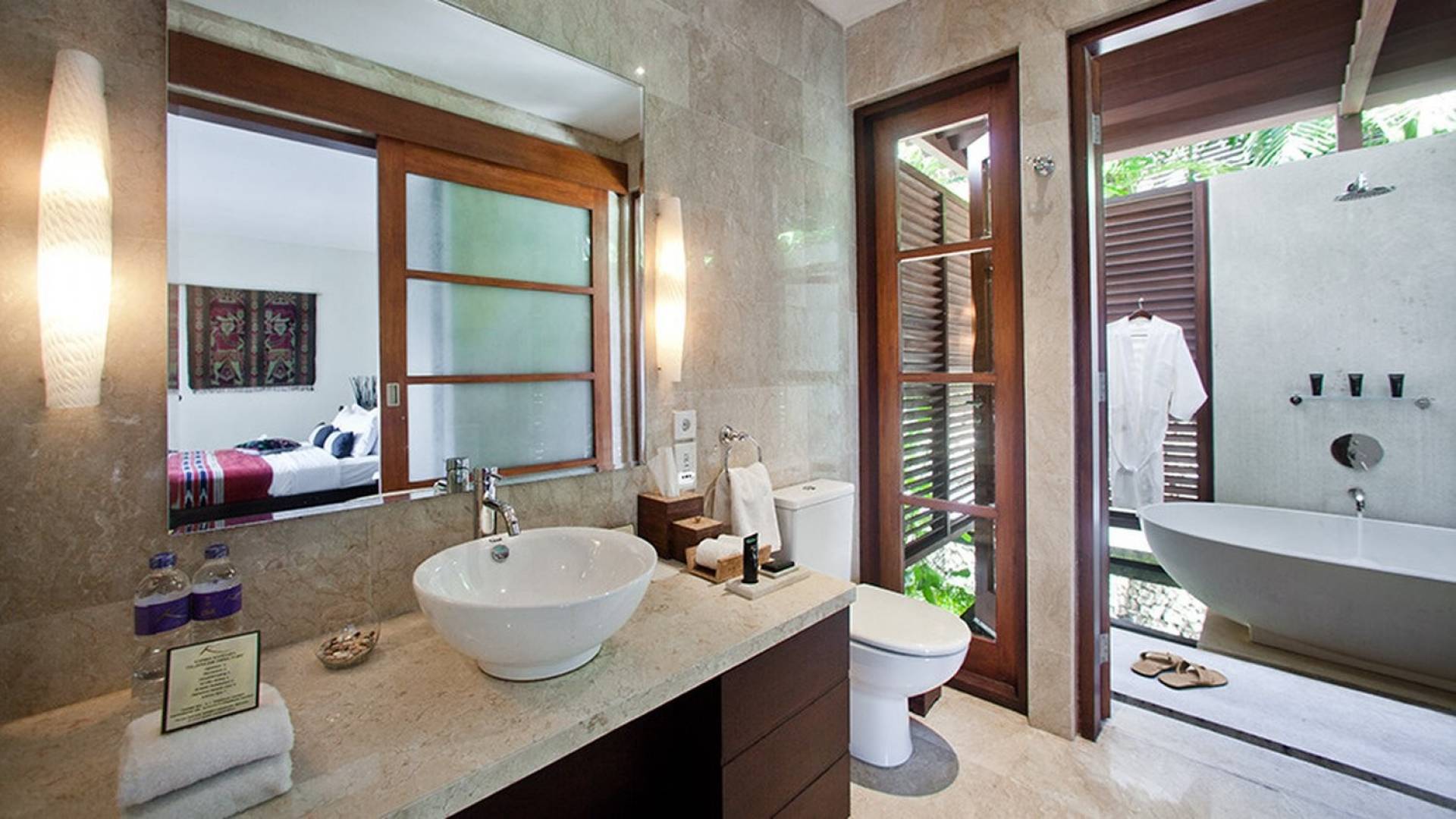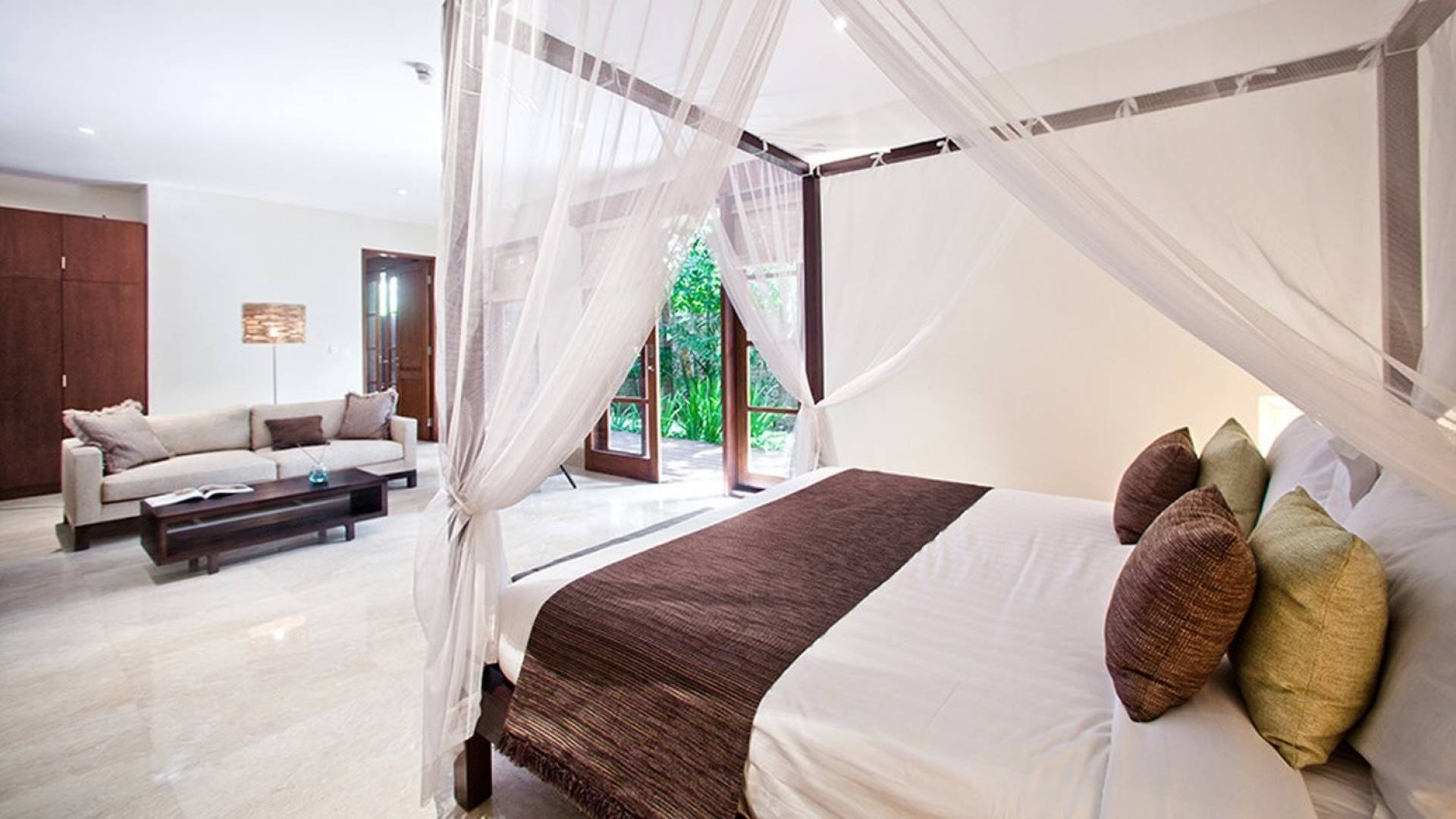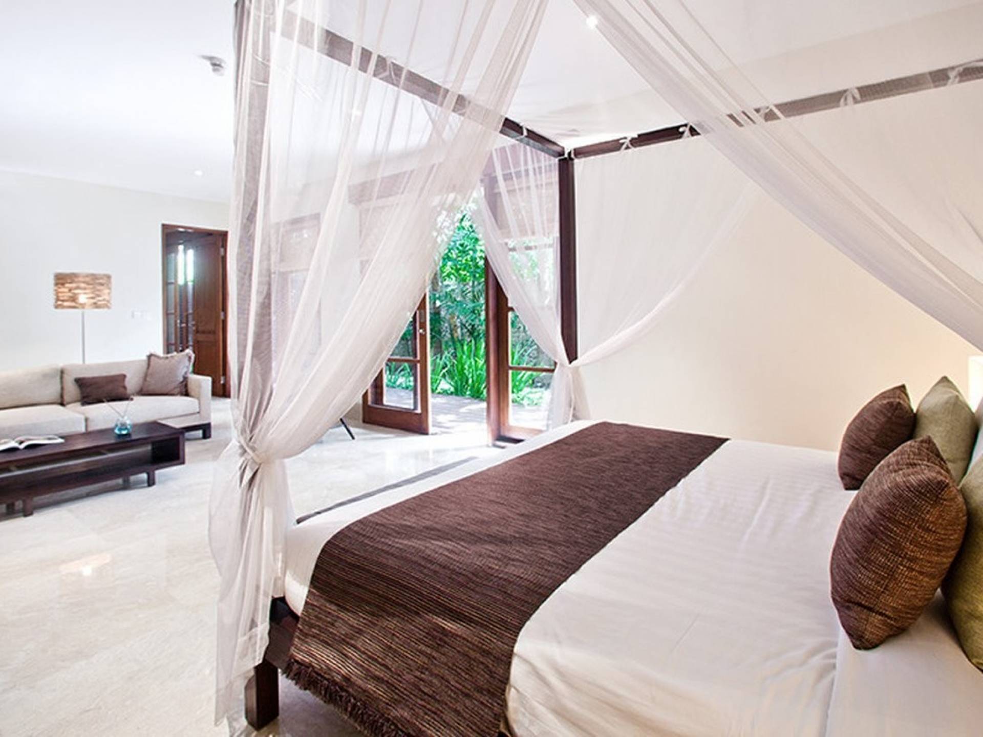 Se accede al tercer dormitorio espacioso a través de una escalera cerrada que conduce hacia abajo desde la sala de estar y también tiene una entrada completamente separada de las instalaciones del complejo, lo que lo convierte en una buena opción para los huéspedes a quienes les gusta salir por la noche. Esta habitación está equipada con una cama de matrimonio con dosel, un sofá con una mesa de café y un baño con ducha al aire libre y bañera. Las puertas corredizas dan a un pequeño jardín con flores tropicales.