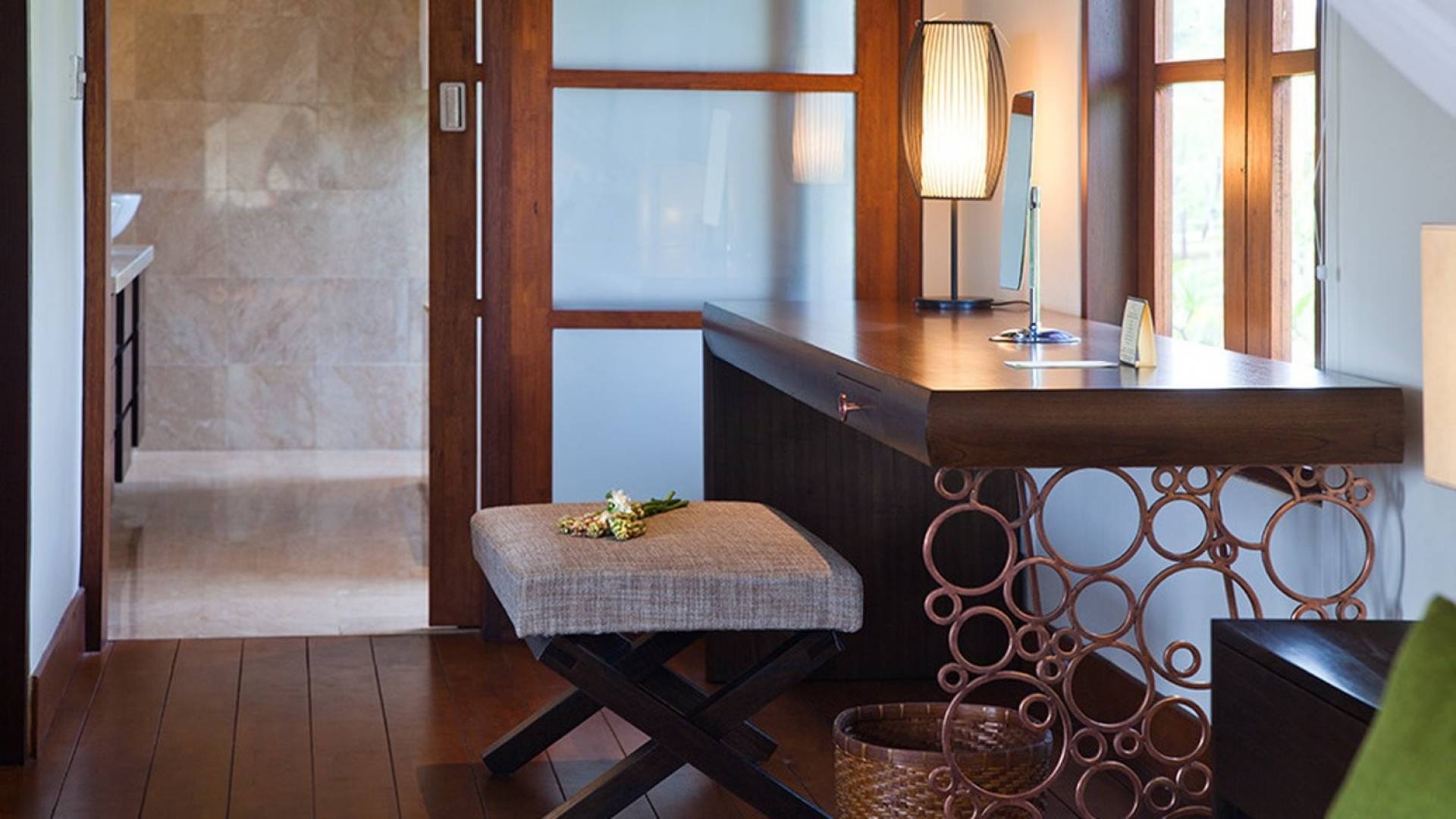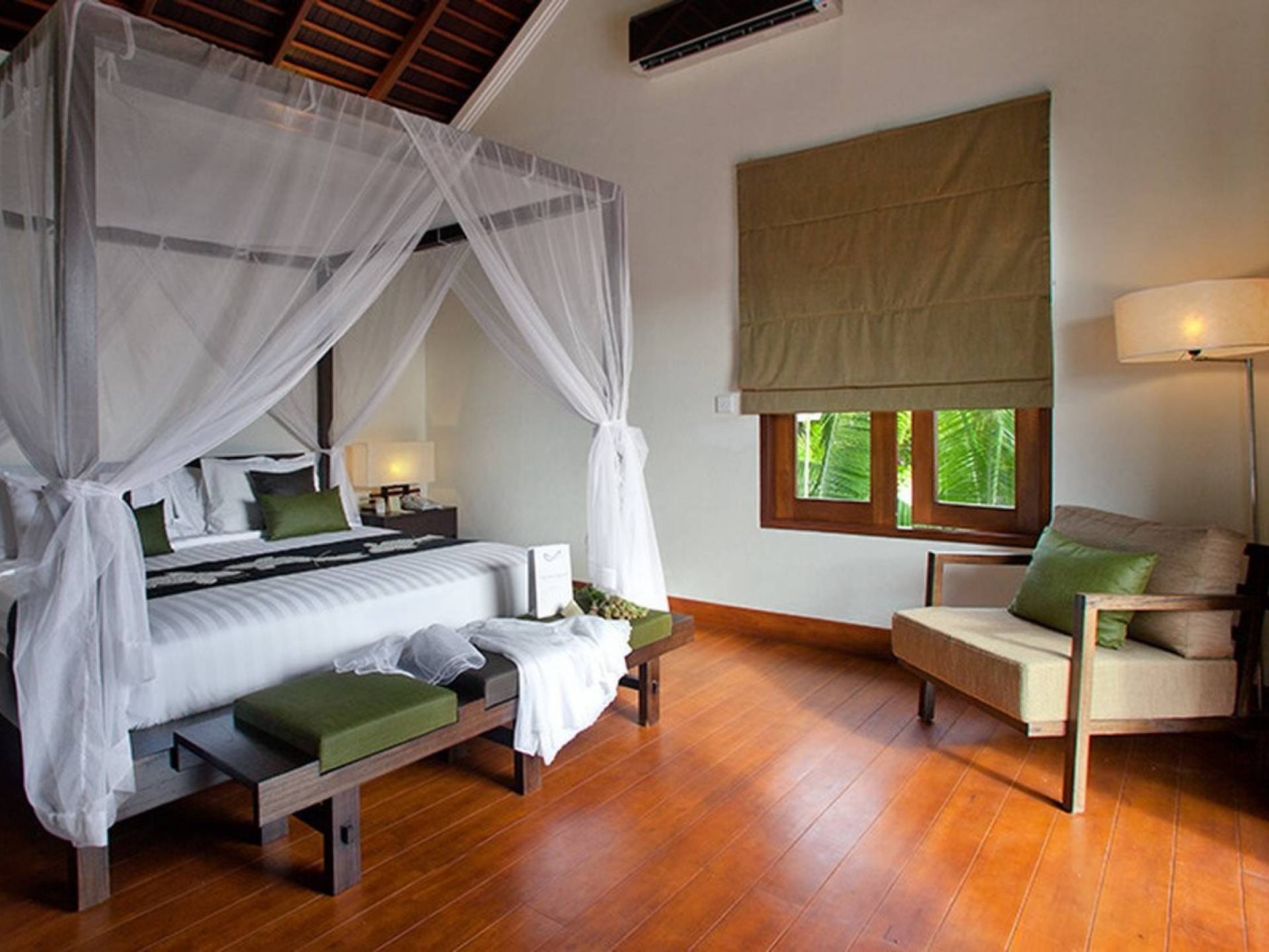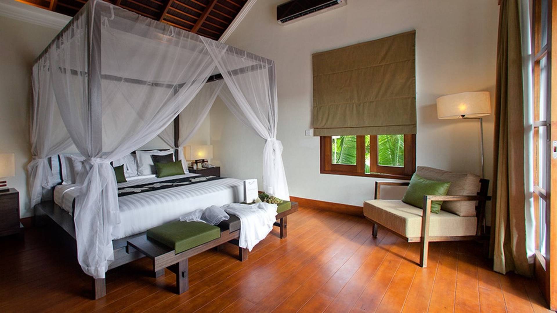 Se accede al tercer dormitorio espacioso a través de una escalera cerrada que conduce hacia abajo desde la sala de estar y también tiene una entrada completamente separada de las instalaciones del complejo, lo que lo convierte en una buena opción para los huéspedes a quienes les gusta salir por la noche. Esta habitación está equipada con una cama de matrimonio con dosel, un sofá con una mesa de café y un baño con ducha al aire libre y bañera. Las puertas corredizas dan a un pequeño jardín con flores tropicales.