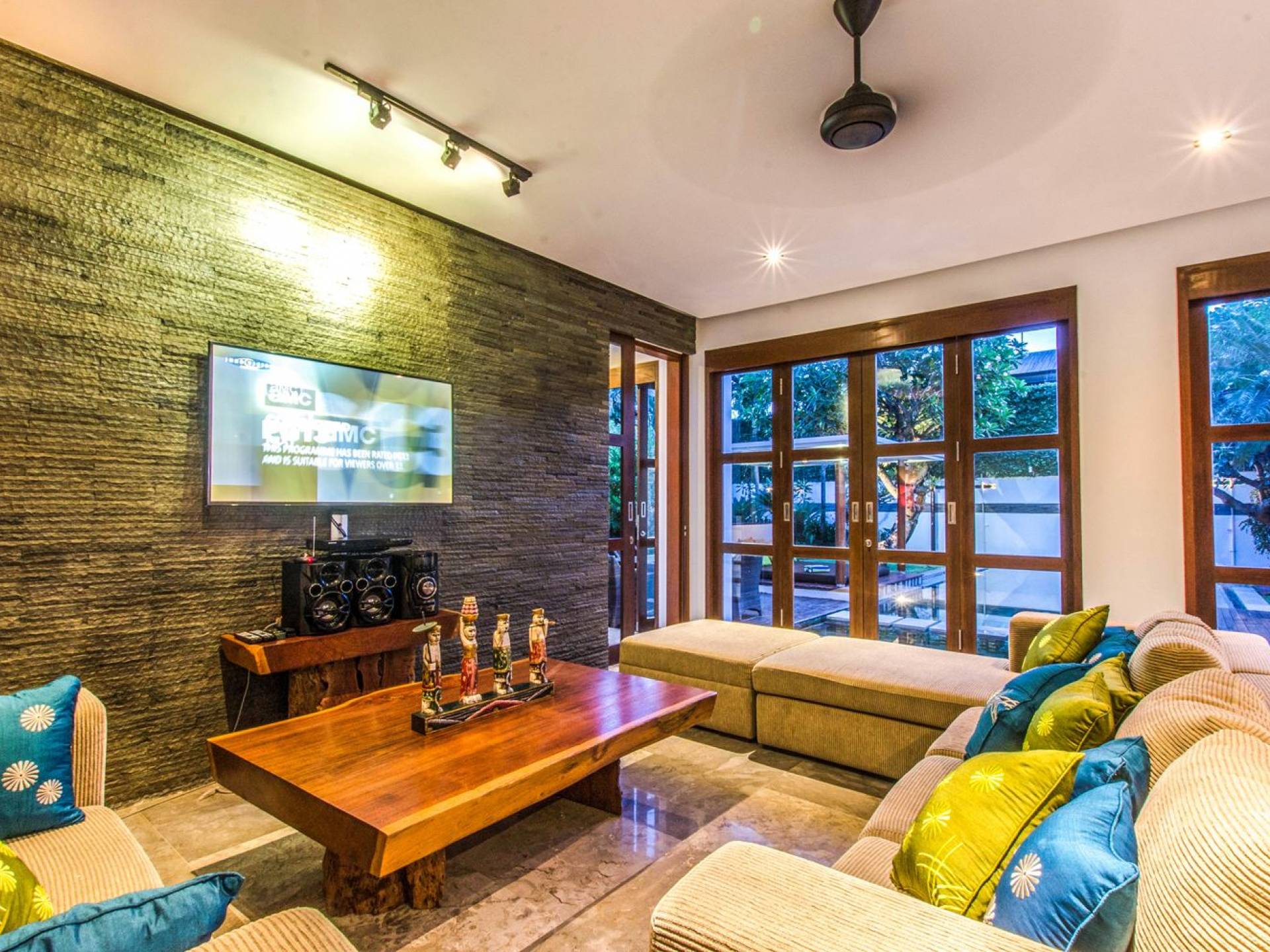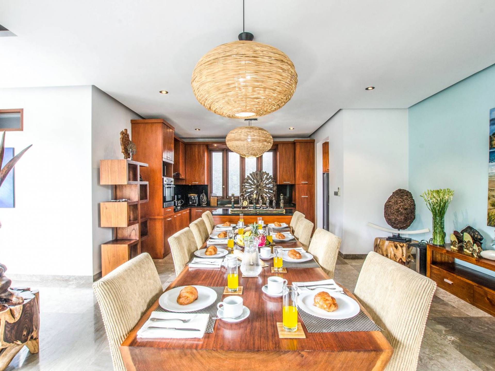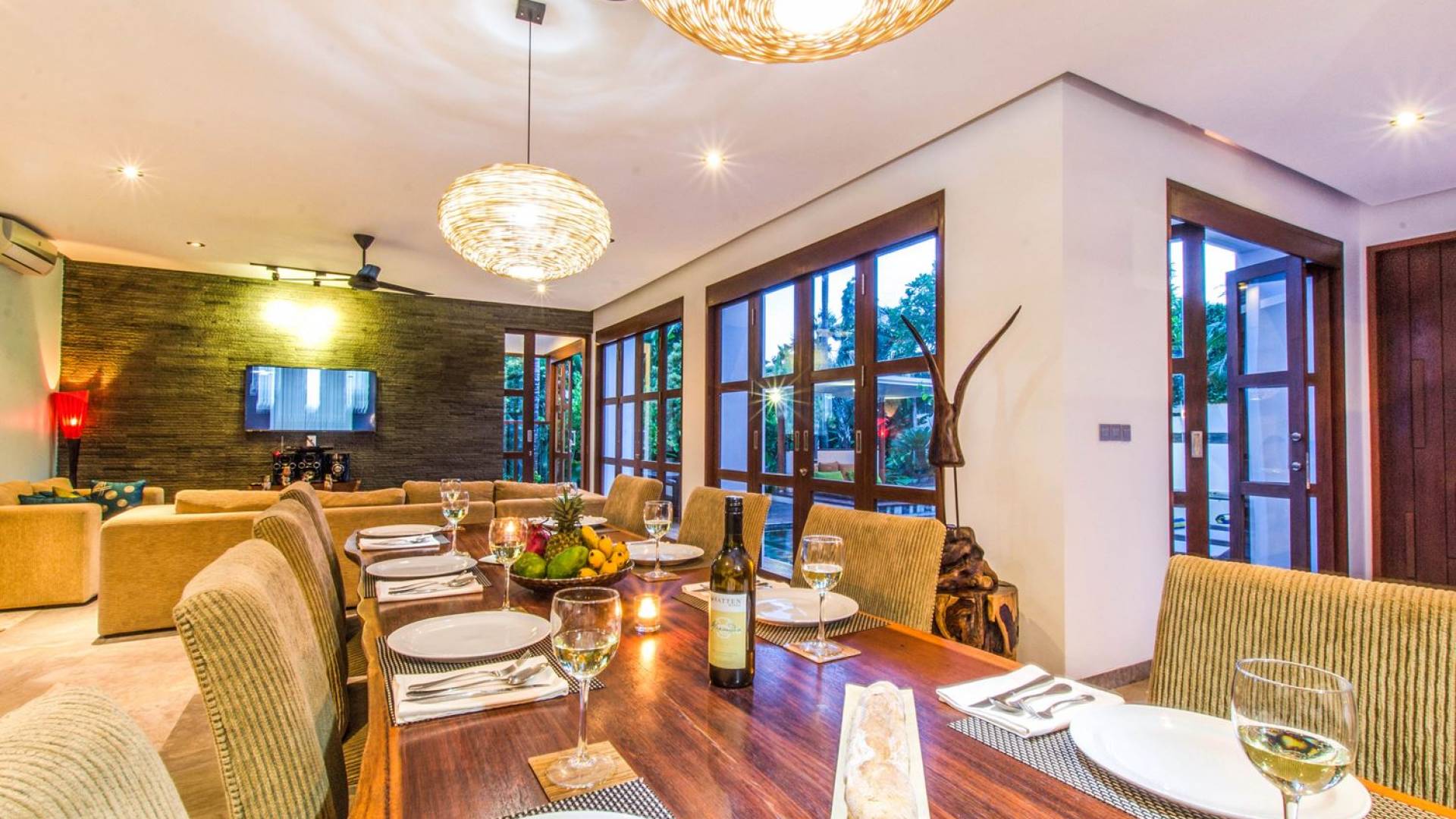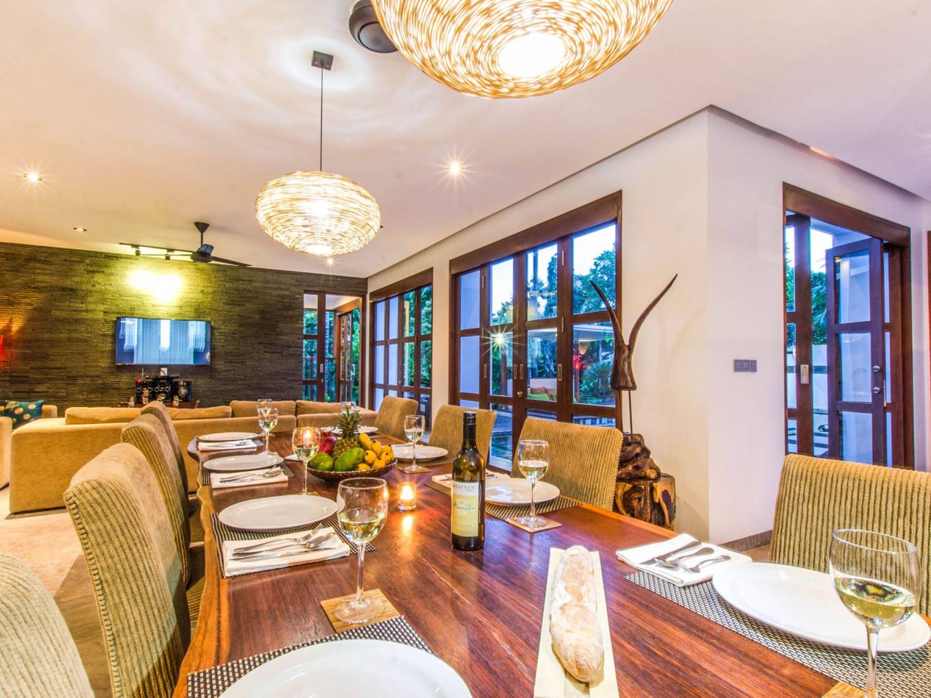 Esta amplia sala de planta abierta es el corazón de la villa. Se compone de cocina de chef en la parte trasera con dispensador de hielo y agua fría, mesa de comedor de 8 plazas de una pieza de merbeau macizo, con ventiladores de techo, lujosa sala de estar y una gran mesa de café. Las puertas plegables se abren fácilmente al área de la piscina para acceder directamente a la terraza, la piscina y el área de entretenimiento. Perfecto para albergar grandes reuniones y fiestas, o se puede cerrar para disfrutar de la comodidad del aire acondicionado con un televisor LED LCD de 55" montado en la pared de piedra y un sistema HI-FI con una selección de CD y DVD