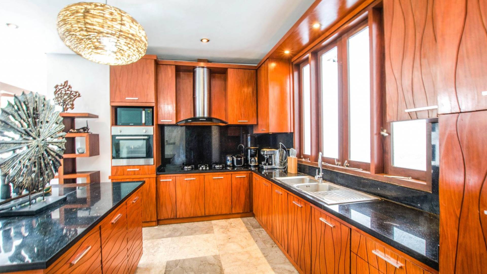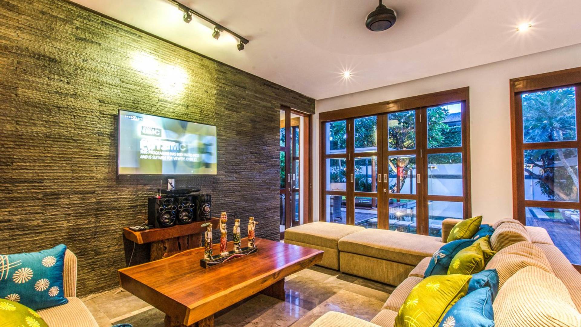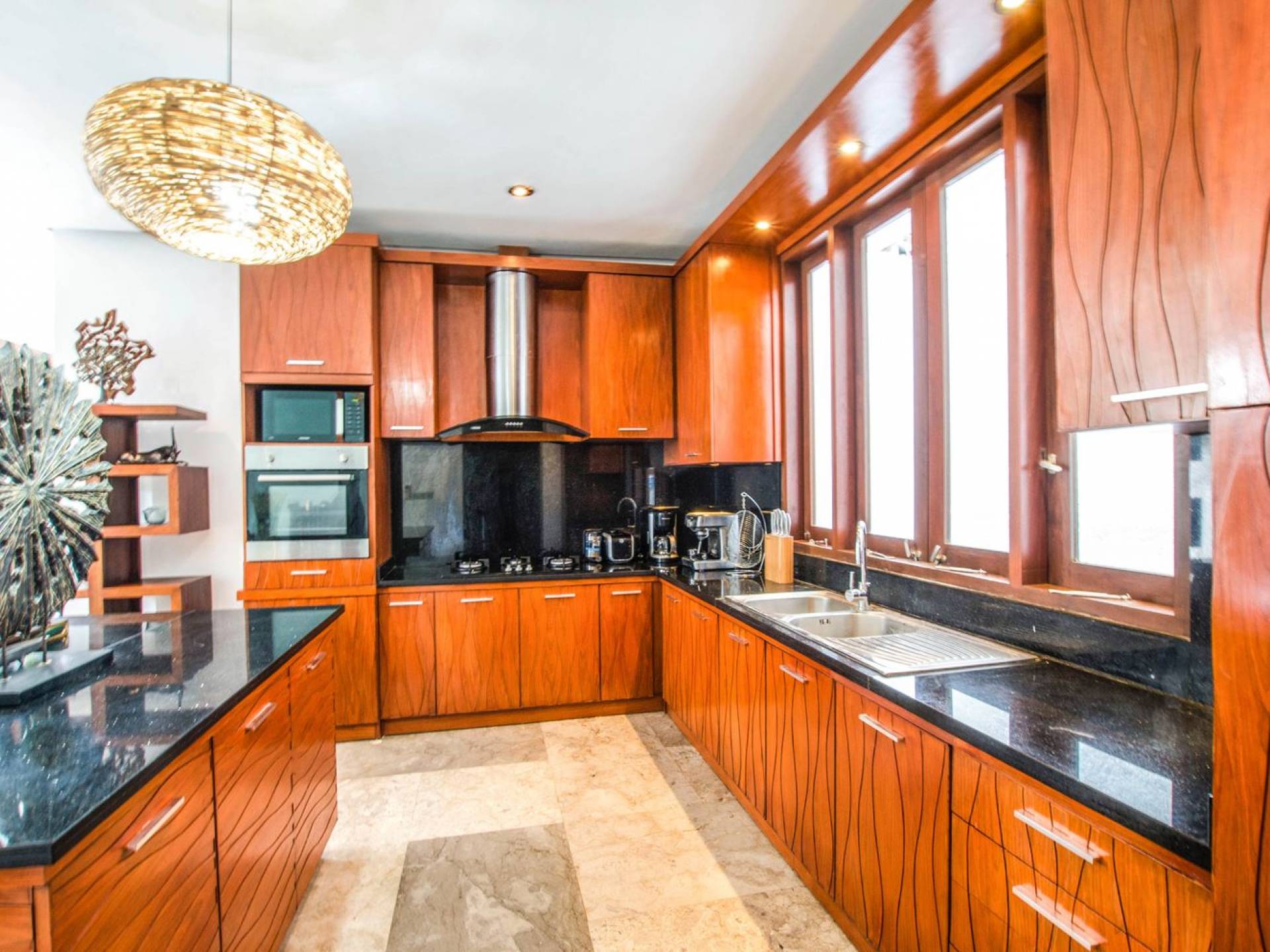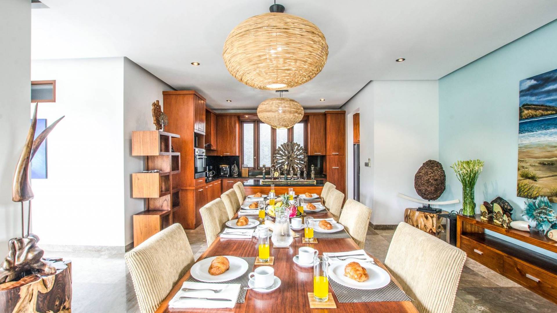 Esta amplia sala de planta abierta es el corazón de la villa. Se compone de cocina de chef en la parte trasera con dispensador de hielo y agua fría, mesa de comedor de 8 plazas de una pieza de merbeau macizo, con ventiladores de techo, lujosa sala de estar y una gran mesa de café. Las puertas plegables se abren fácilmente al área de la piscina para acceder directamente a la terraza, la piscina y el área de entretenimiento. Perfecto para albergar grandes reuniones y fiestas, o se puede cerrar para disfrutar de la comodidad del aire acondicionado con un televisor LED LCD de 55" montado en la pared de piedra y un sistema HI-FI con una selección de CD y DVD