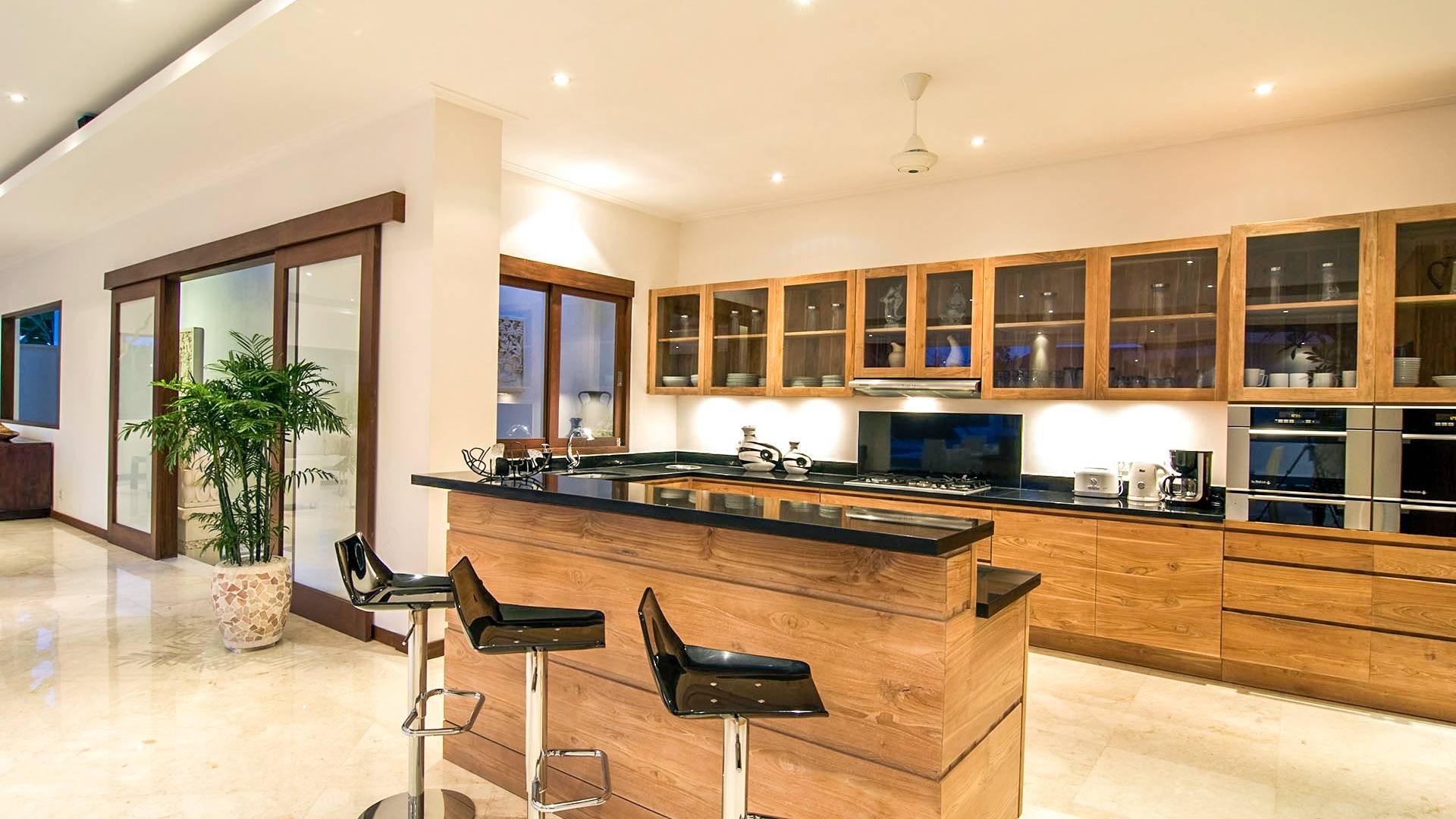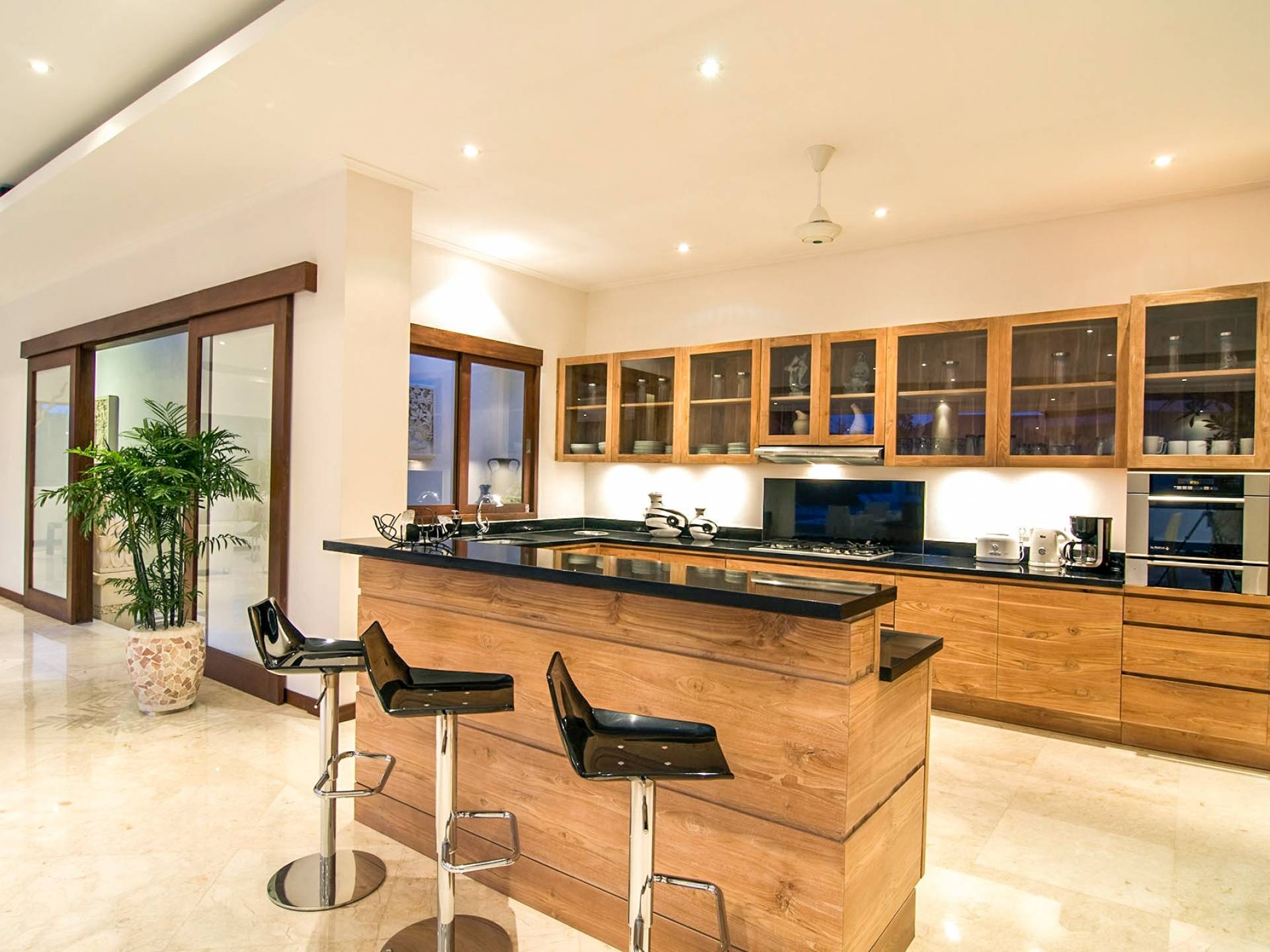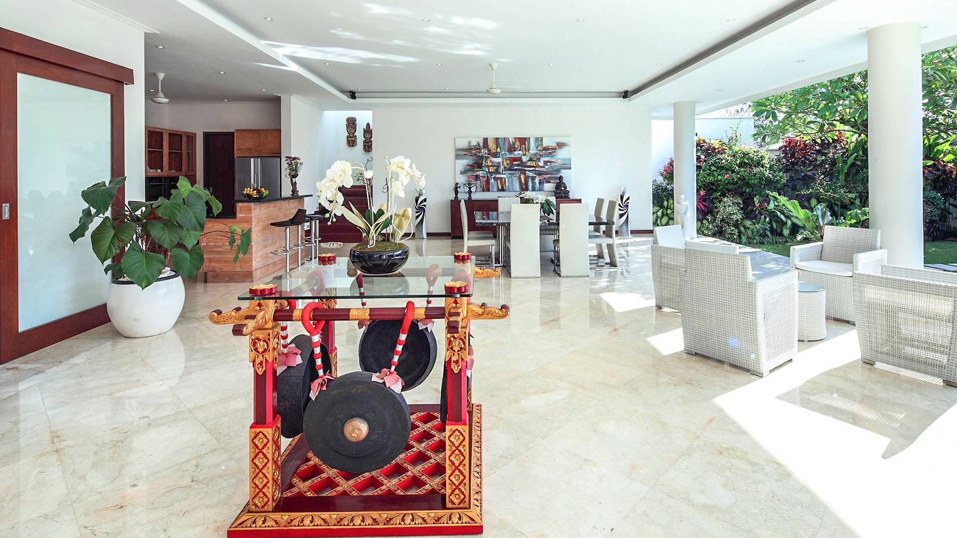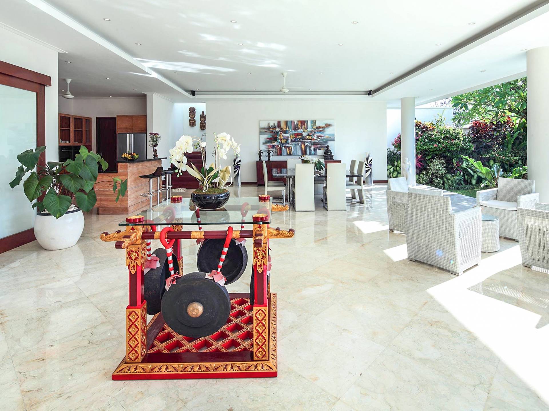La amplia sala de estar de concepto abierto de la villa Istana Putih es hermosa, moderna, elegante y luminosa, con un techo alto y un impresionante diseño interior blanco impecable enriquecido con piezas de arte de buen gusto que incluyen un instrumento tradicional. El salón cuenta con sofás de cuero blanco y dos sillones con cojines rojos y blancos y pufs a juego alrededor de una gran mesa de café. También puede relajarse en la terraza en las sillas de mimbre. El comedor está equipado con una gran mesa de comedor de mármol negro y 8 sillas de cuero blanco para disfrutar de una deliciosa cena junto con la música de su elección en la base para iPod. La moderna cocina abierta con barra y 4 taburetes está equipada con todo lo que necesita, incluida una máquina Nespresso para una deliciosa taza de café por la mañana.