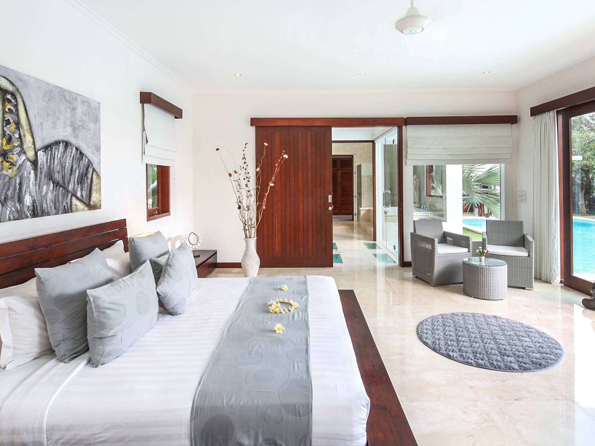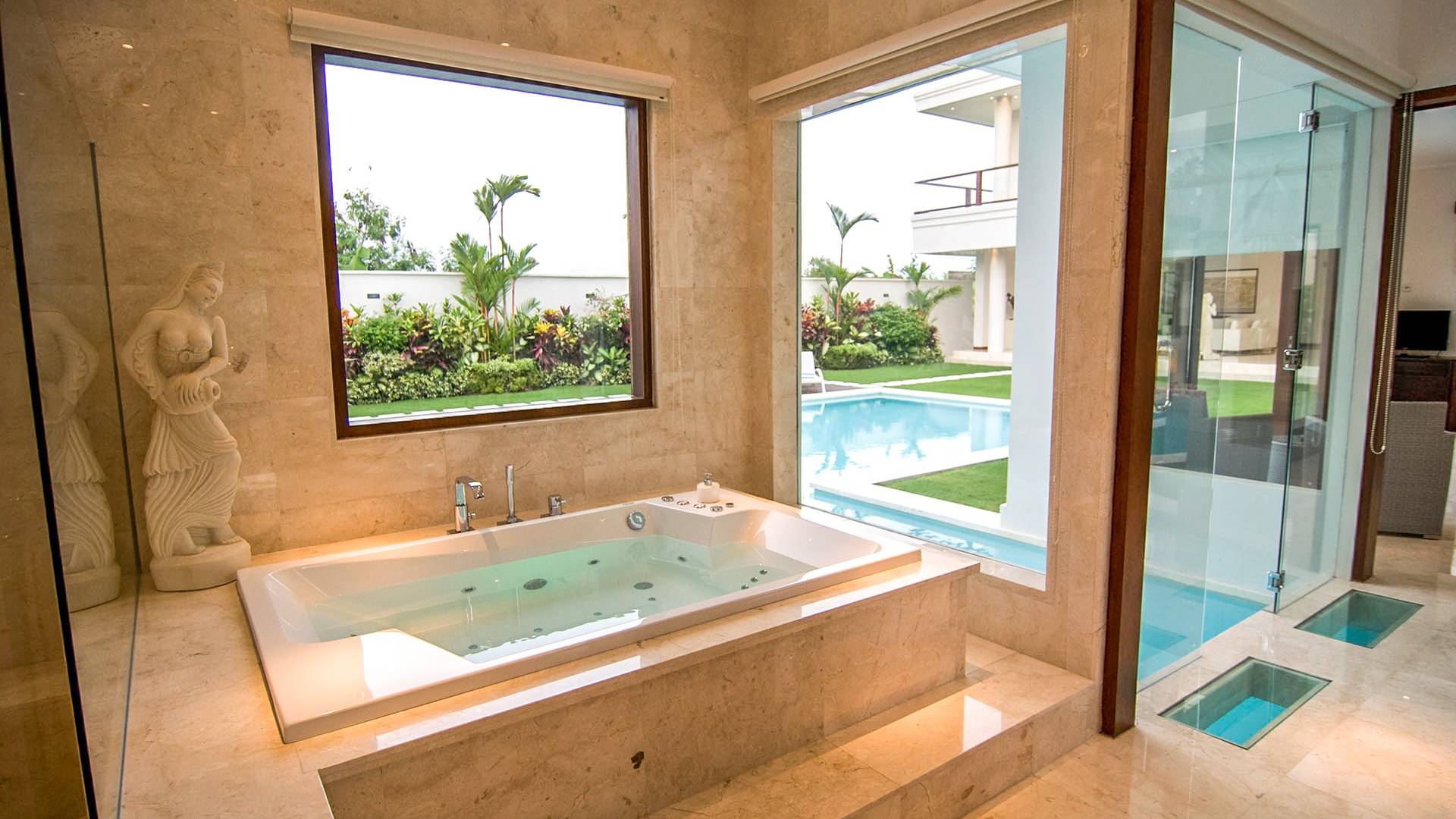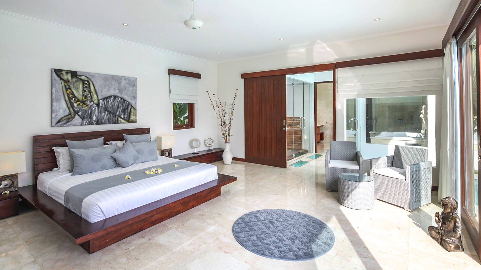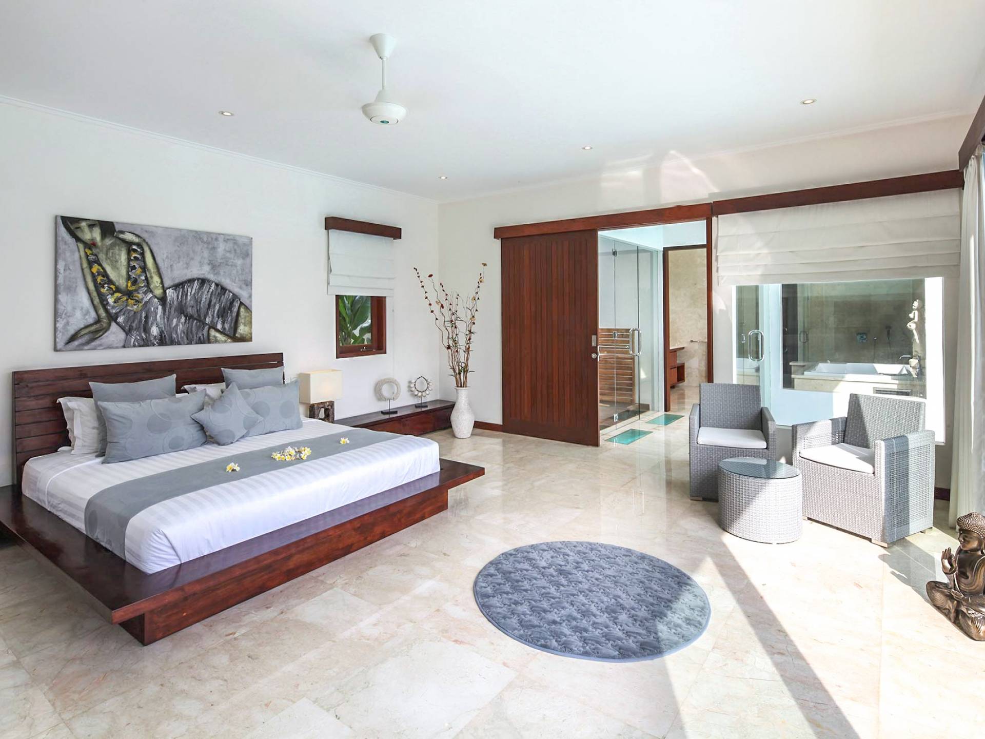 El dormitorio principal hará realidad tus sueños ya que está contiguo a la piscina, listo para que puedas sumergirte en cualquier momento y la habitación cuenta con un jacuzzi de súper lujo y una ducha tipo lluvia exterior e interior. Esta amplia habitación blanca cuenta con una cama extragrande, hermosas obras de arte y una zona de estar con TV de pantalla plana con reproductor de DVD. También hay un vestidor con aire acondicionado, caja fuerte y minibar.