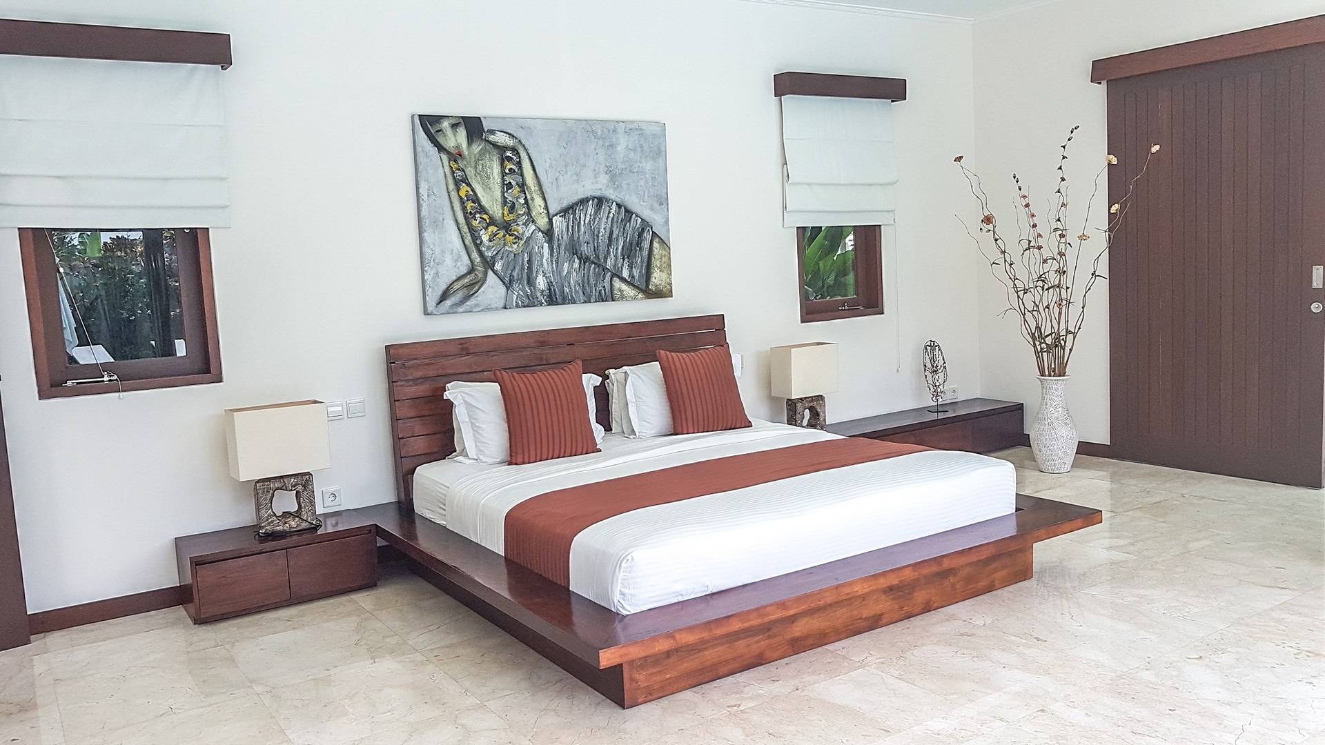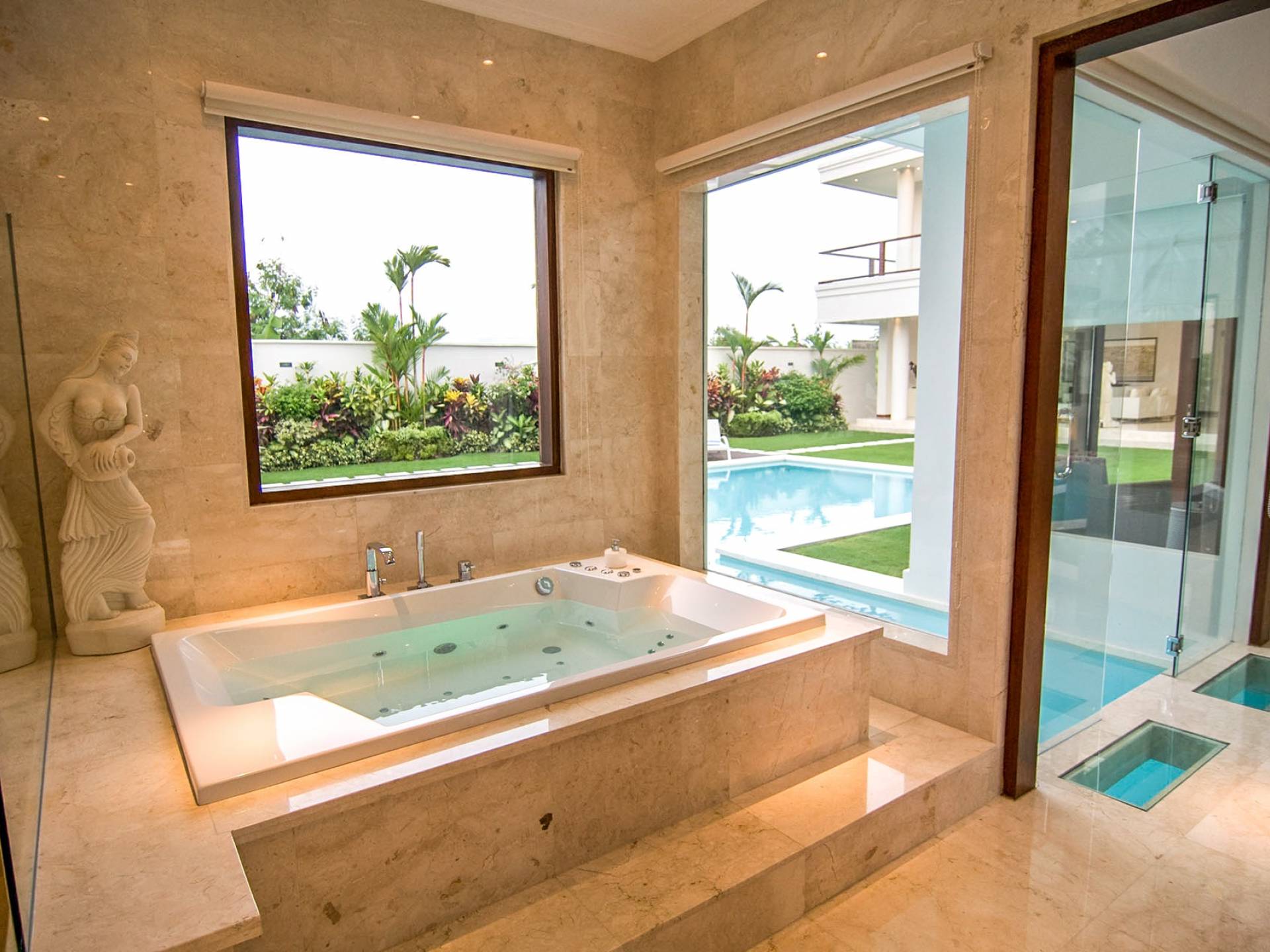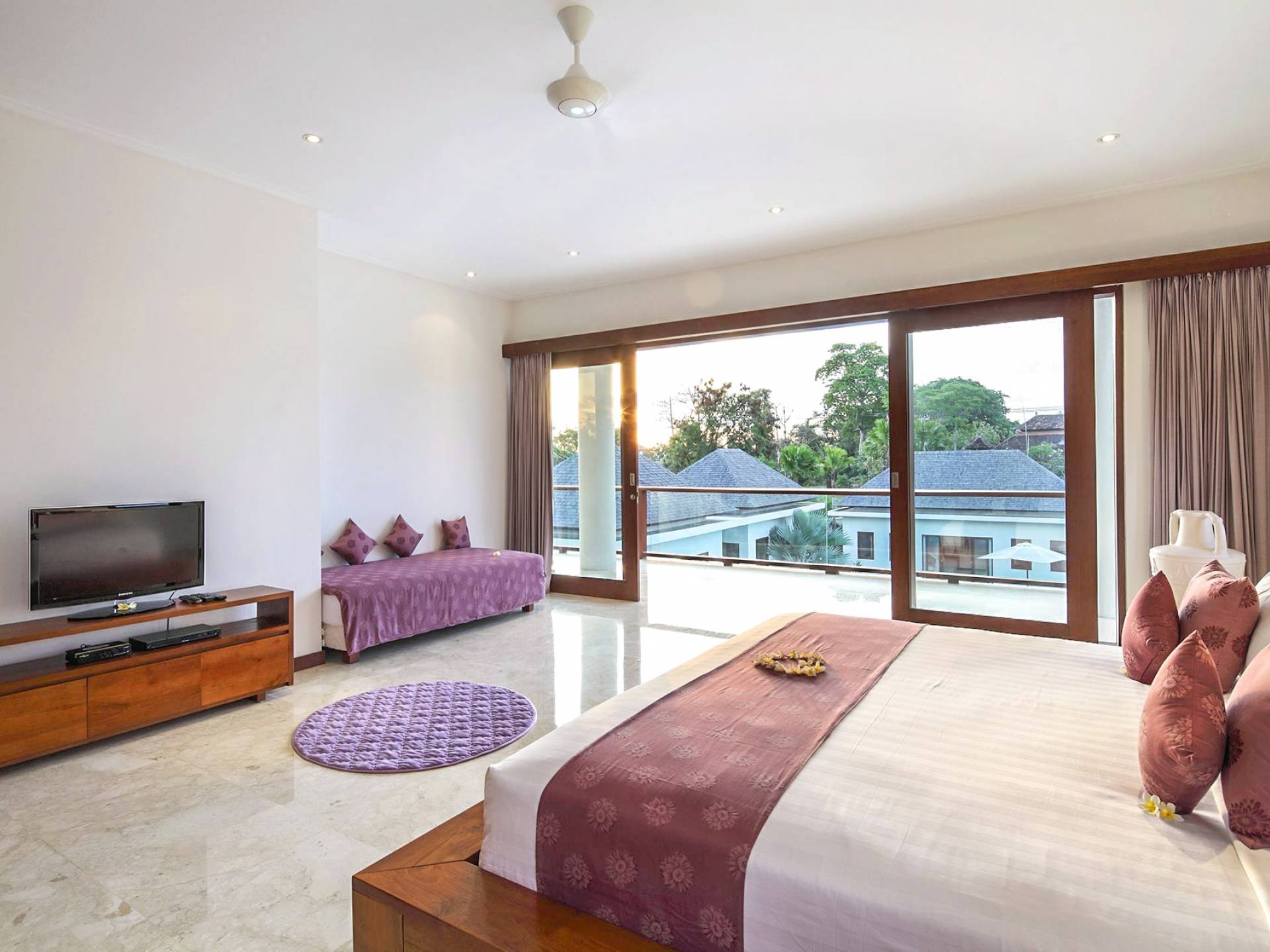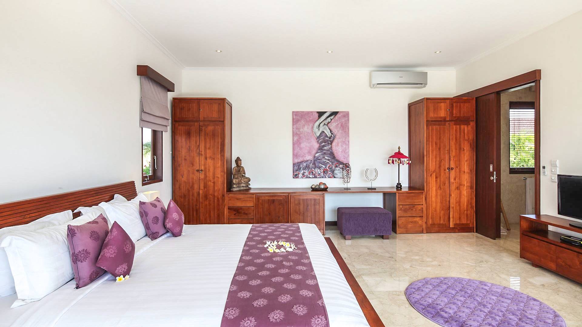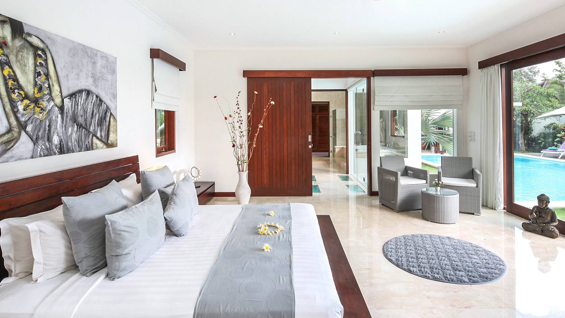 El dormitorio principal hará realidad tus sueños ya que está contiguo a la piscina, listo para que puedas sumergirte en cualquier momento y la habitación cuenta con un jacuzzi de súper lujo y una ducha tipo lluvia exterior e interior. Esta amplia habitación blanca cuenta con una cama extragrande, hermosas obras de arte y una zona de estar con TV de pantalla plana con reproductor de DVD. También hay un vestidor con aire acondicionado, caja fuerte y minibar.