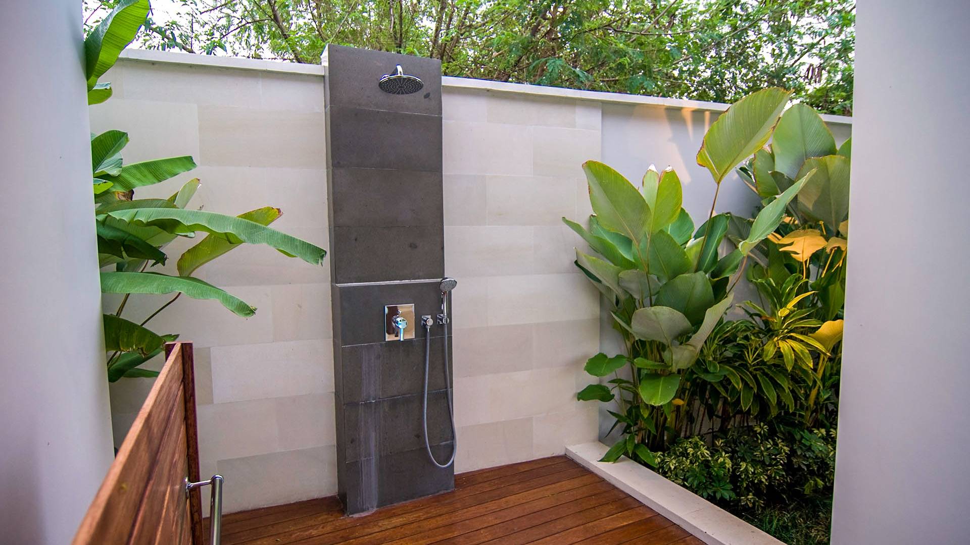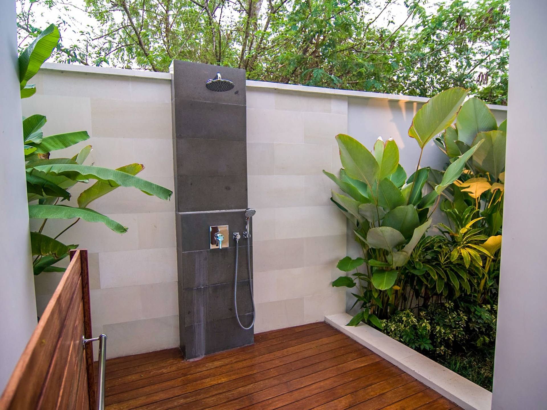 El jardín es un verdadero placer para la vista con estatuas y paredes blancas talladas en piedra y la magnífica vista del jardín que se mezcla con los impresionantes campos de arroz circundantes. Hay una exuberante hierba verde, plantas tropicales y una piscina de agua cristalina de 15 metros esperando a que se sumerja y se sienta renacido. Hay 6 hamacas junto a la piscina con cojines azules y sombrillas que le brindan sombra.