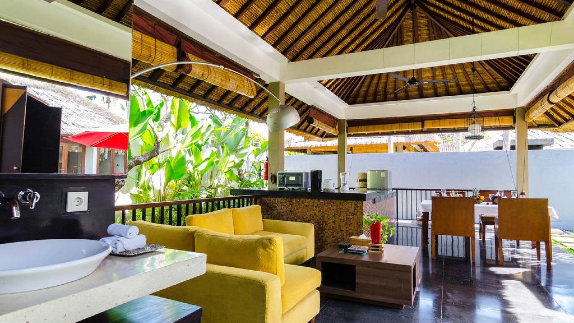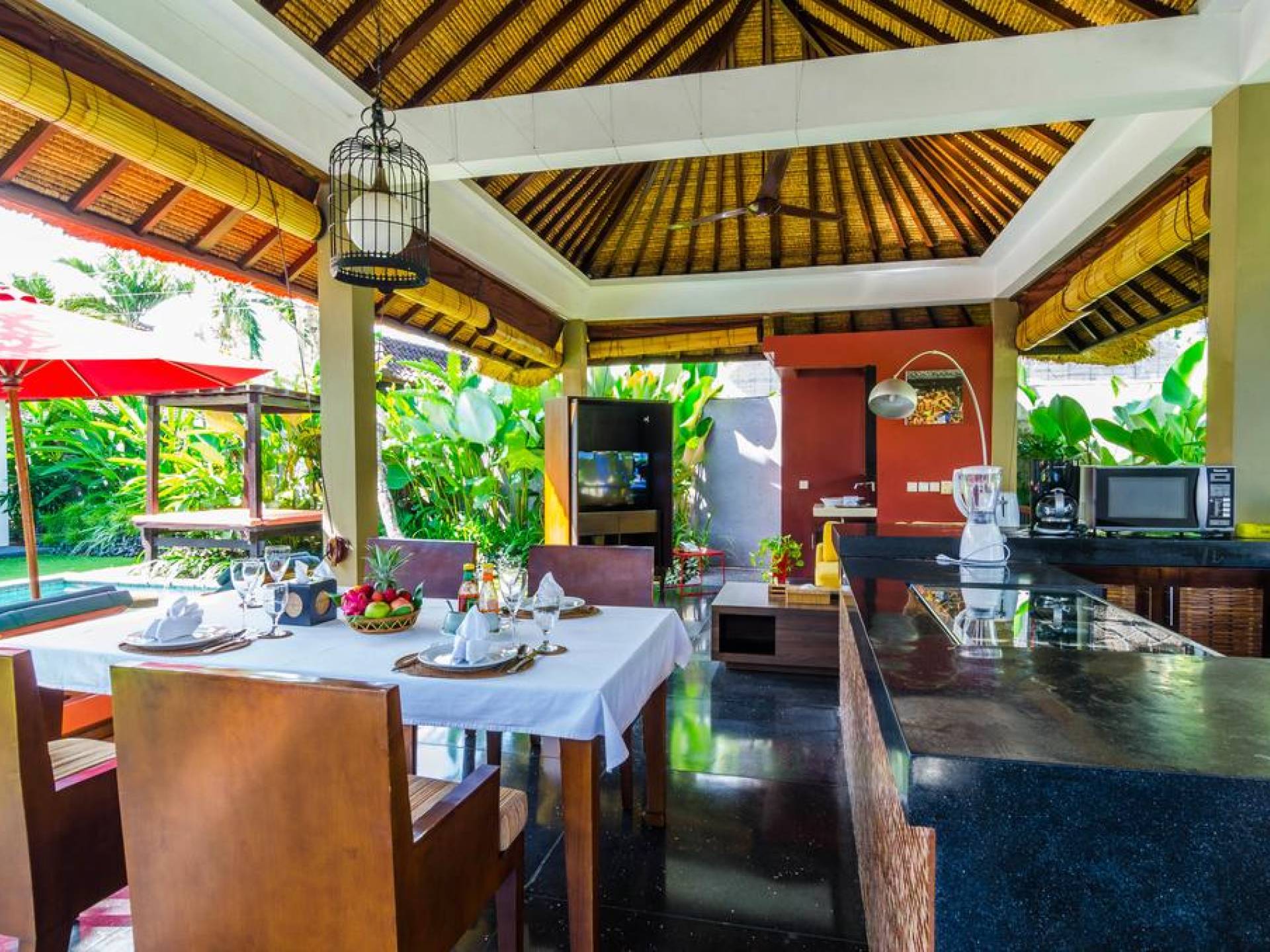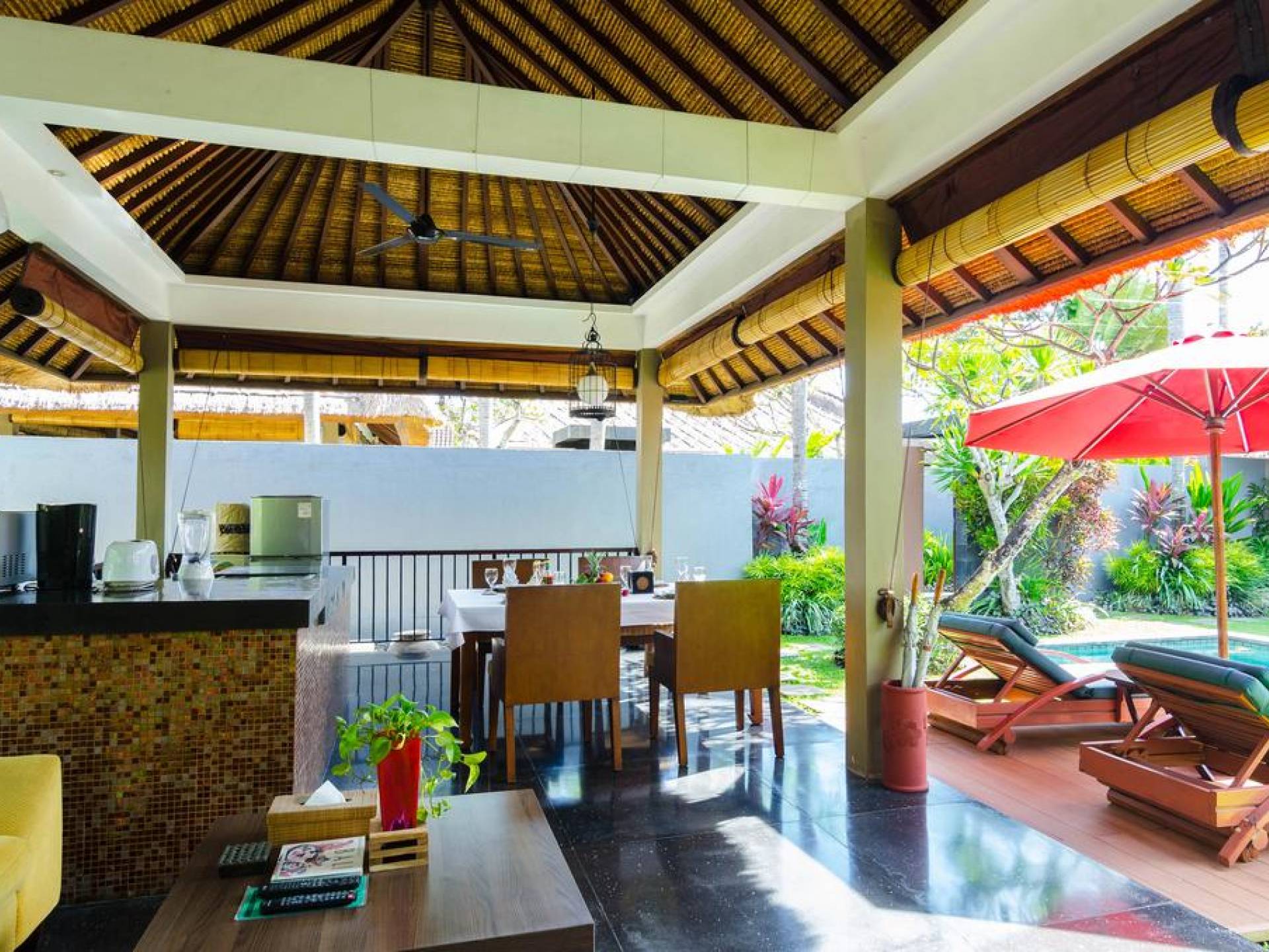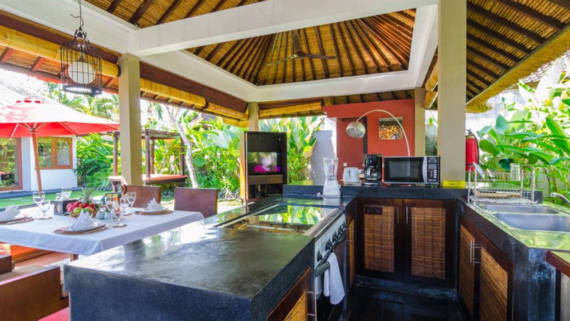 El pabellón de estar y comedor de lados abiertos cuenta con un techo elevado a lo largo de un alang sostenido por pilares sobre un piso de terrazo negro. El ventilador de techo y la suave brisa mantienen el área fresca. El pabellón está amueblado con buen gusto con un sofá moderno profundamente acolchado, una mesa de café ovalada y un armario de madera que alberga una TV vía satélite y un sistema de cine en casa con mini DVD. El pabellón también integra una cocina de planta abierta ubicada detrás de una barra de terrazo negro en forma de L con una llamativa fachada de mosaico metálico. La cocina está equipada con una estufa a gas de seis quemadores, horno, microondas, refrigerador, dispensador de agua y una buena variedad de menaje y utensilios de cocina.