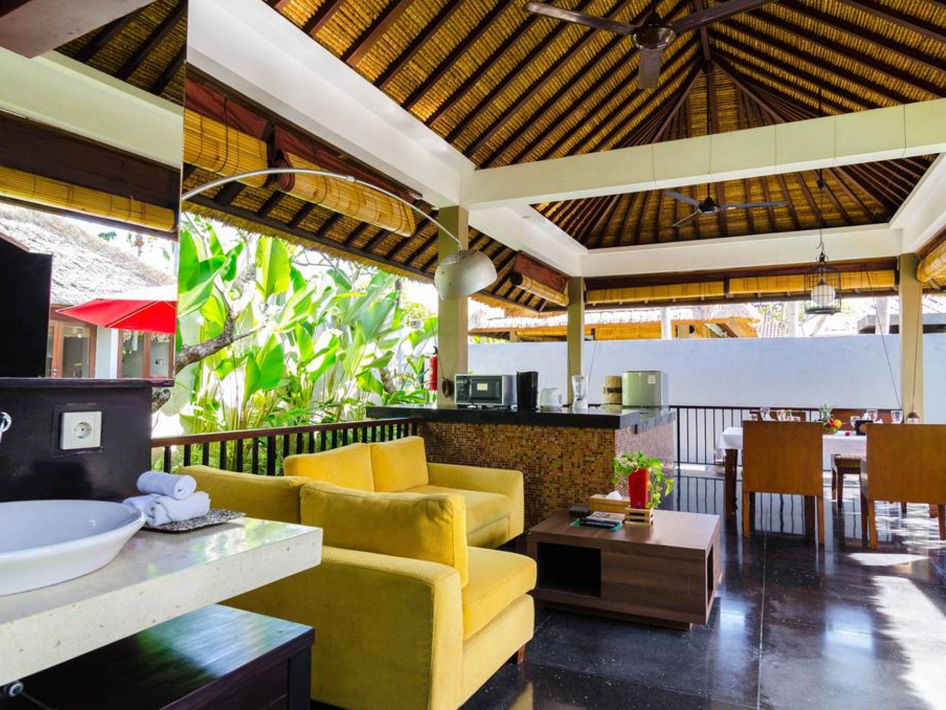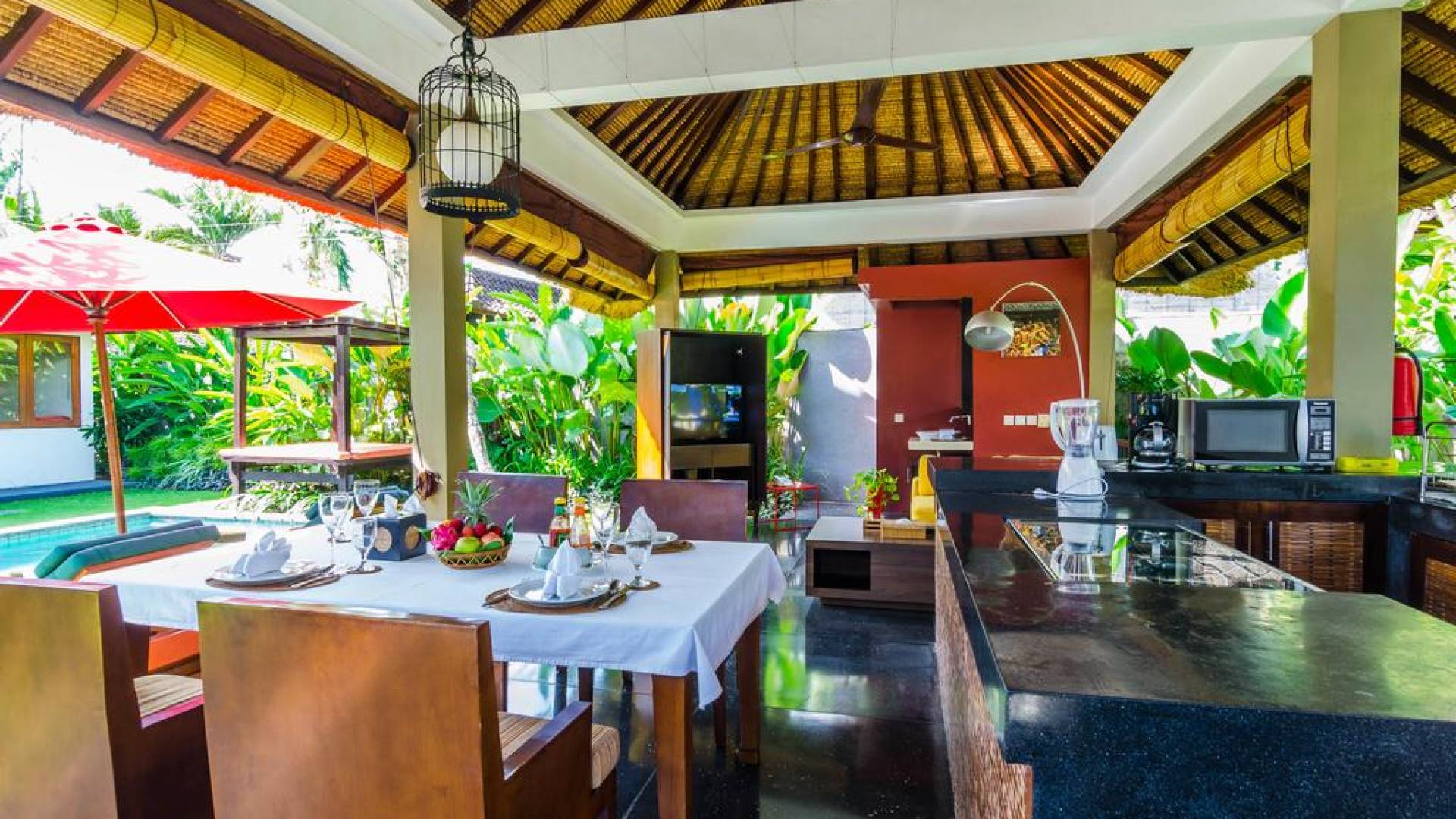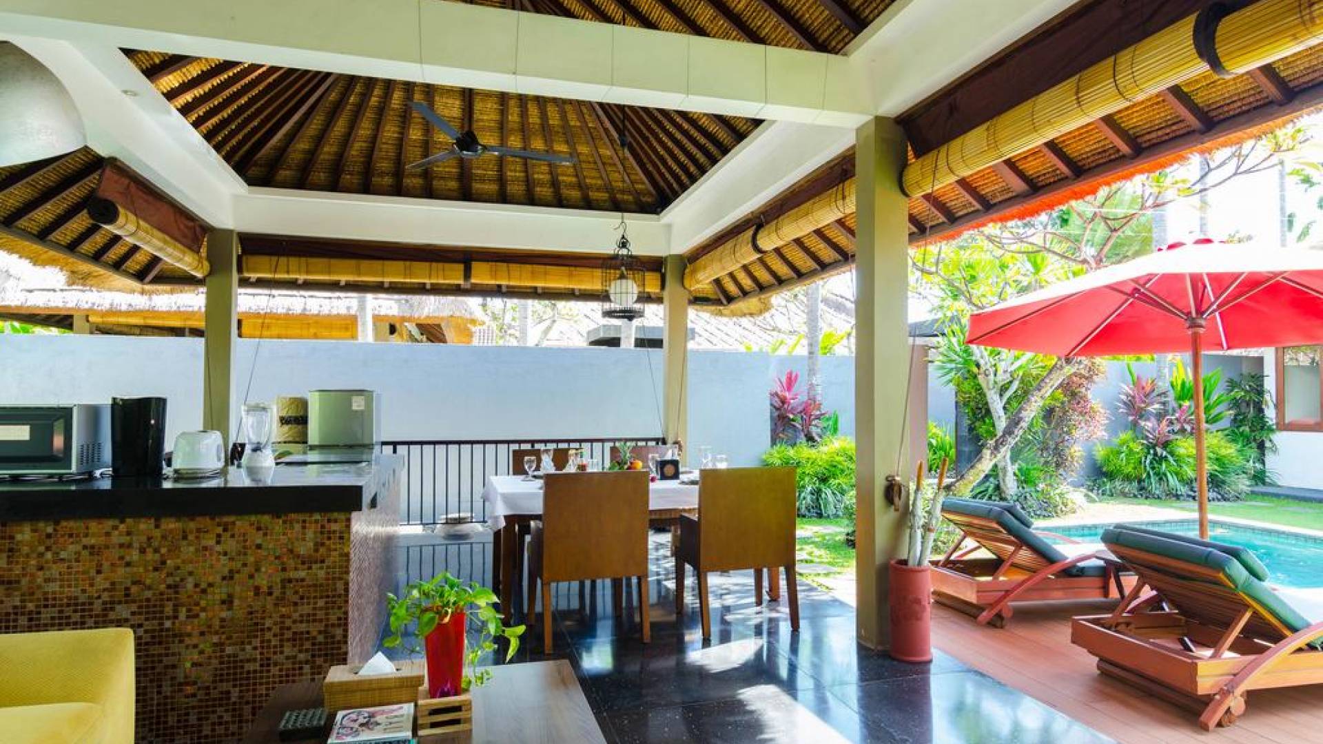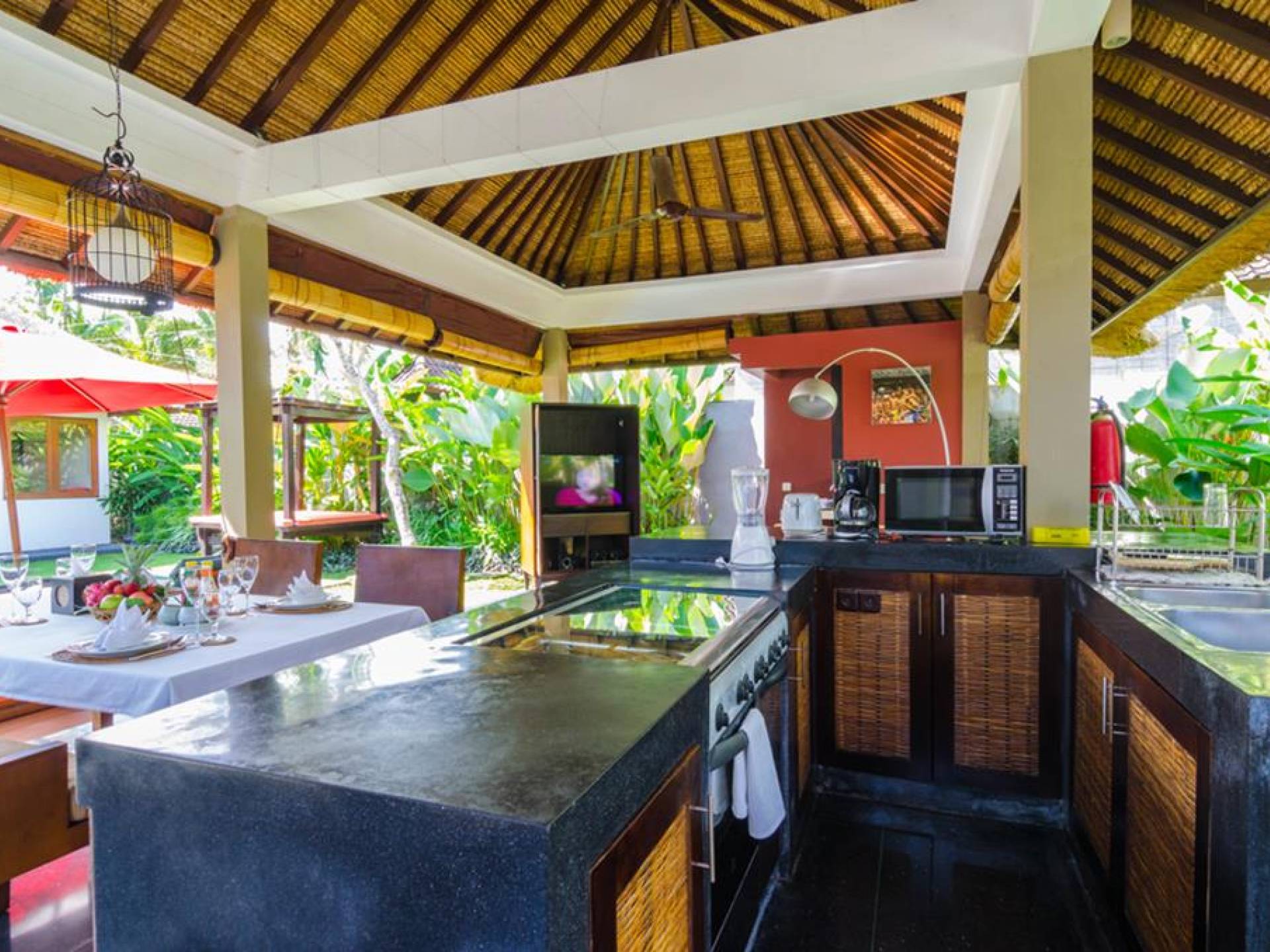 El pabellón de estar y comedor de lados abiertos cuenta con un techo elevado a lo largo de un alang sostenido por pilares sobre un piso de terrazo negro. El ventilador de techo y la suave brisa mantienen el área fresca. El pabellón está amueblado con buen gusto con un sofá moderno profundamente acolchado, una mesa de café ovalada y un armario de madera que alberga una TV vía satélite y un sistema de cine en casa con mini DVD. El pabellón también integra una cocina de planta abierta ubicada detrás de una barra de terrazo negro en forma de L con una llamativa fachada de mosaico metálico. La cocina está equipada con una estufa a gas de seis quemadores, horno, microondas, refrigerador, dispensador de agua y una buena variedad de menaje y utensilios de cocina.