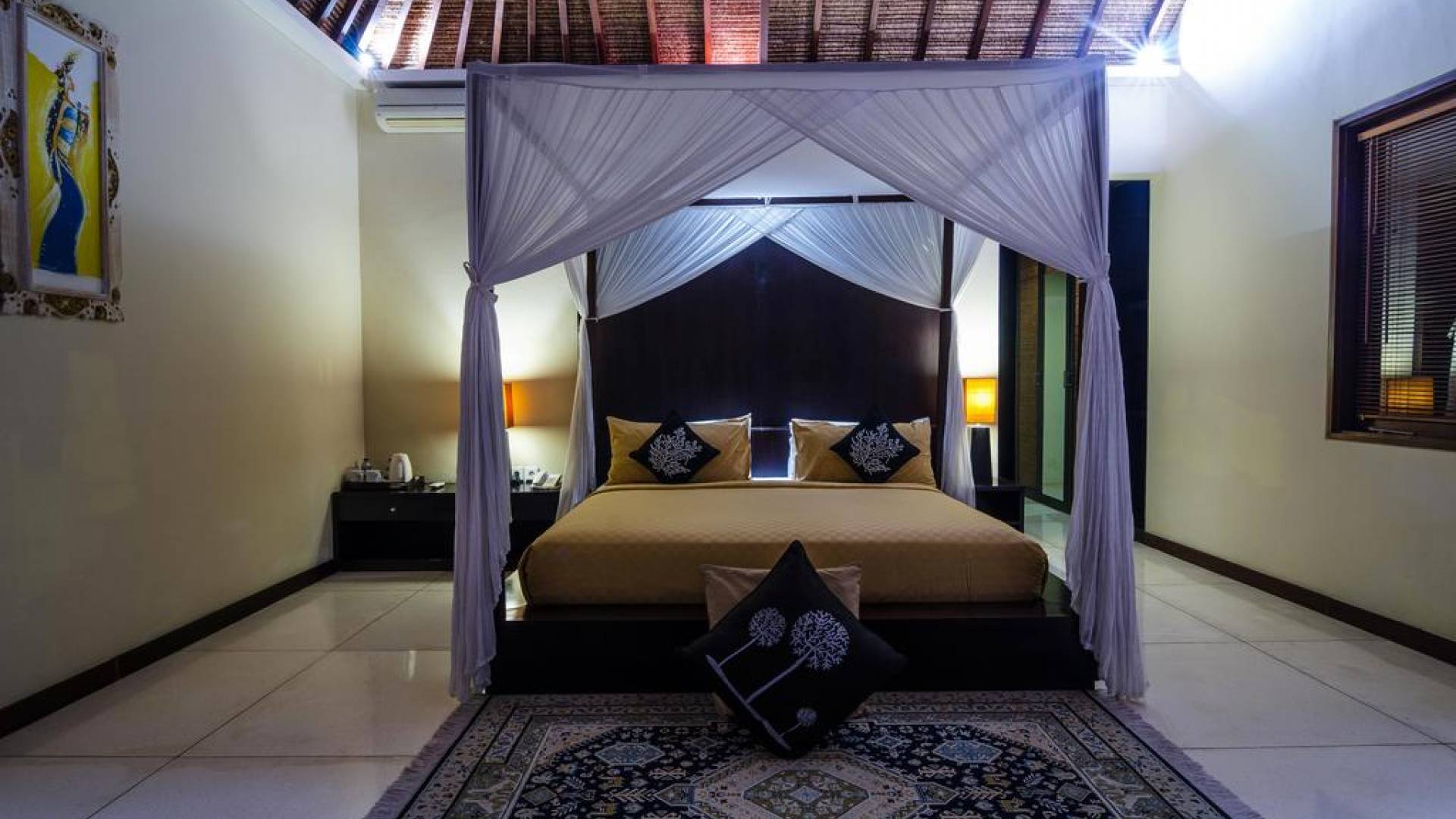 Los dos dormitorios independientes, con sus baños en suite en el jardín, miden cada uno 5x5 metros cuadrados, cada uno con un fresco piso de terrazo color crema y grandes ventanales que dejan pasar mucha luz natural. Cada una está amueblada con una cama king-size, escritorio, silla, televisión con canales locales, caja de seguridad, ventilador de techo y menaje para preparar té y café.