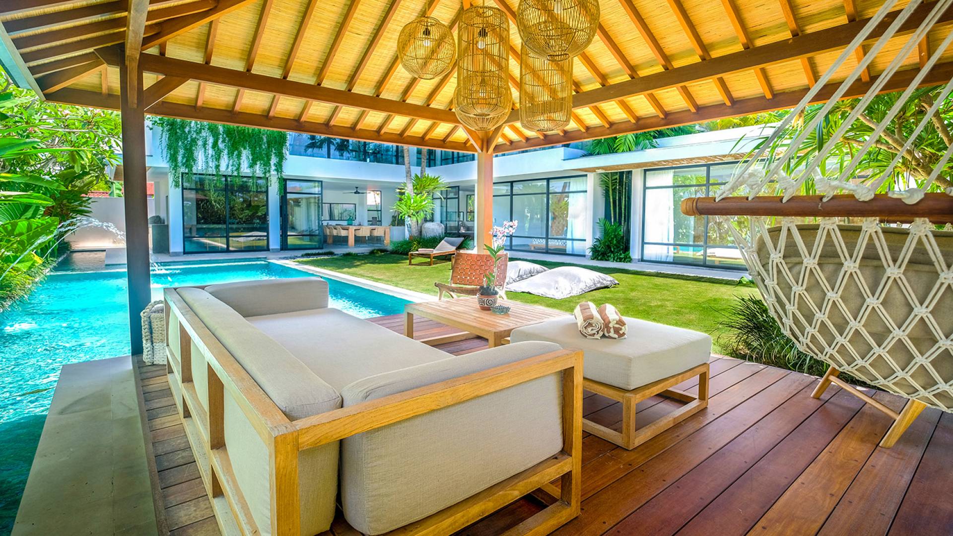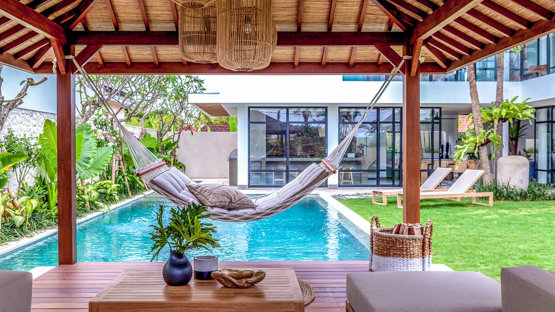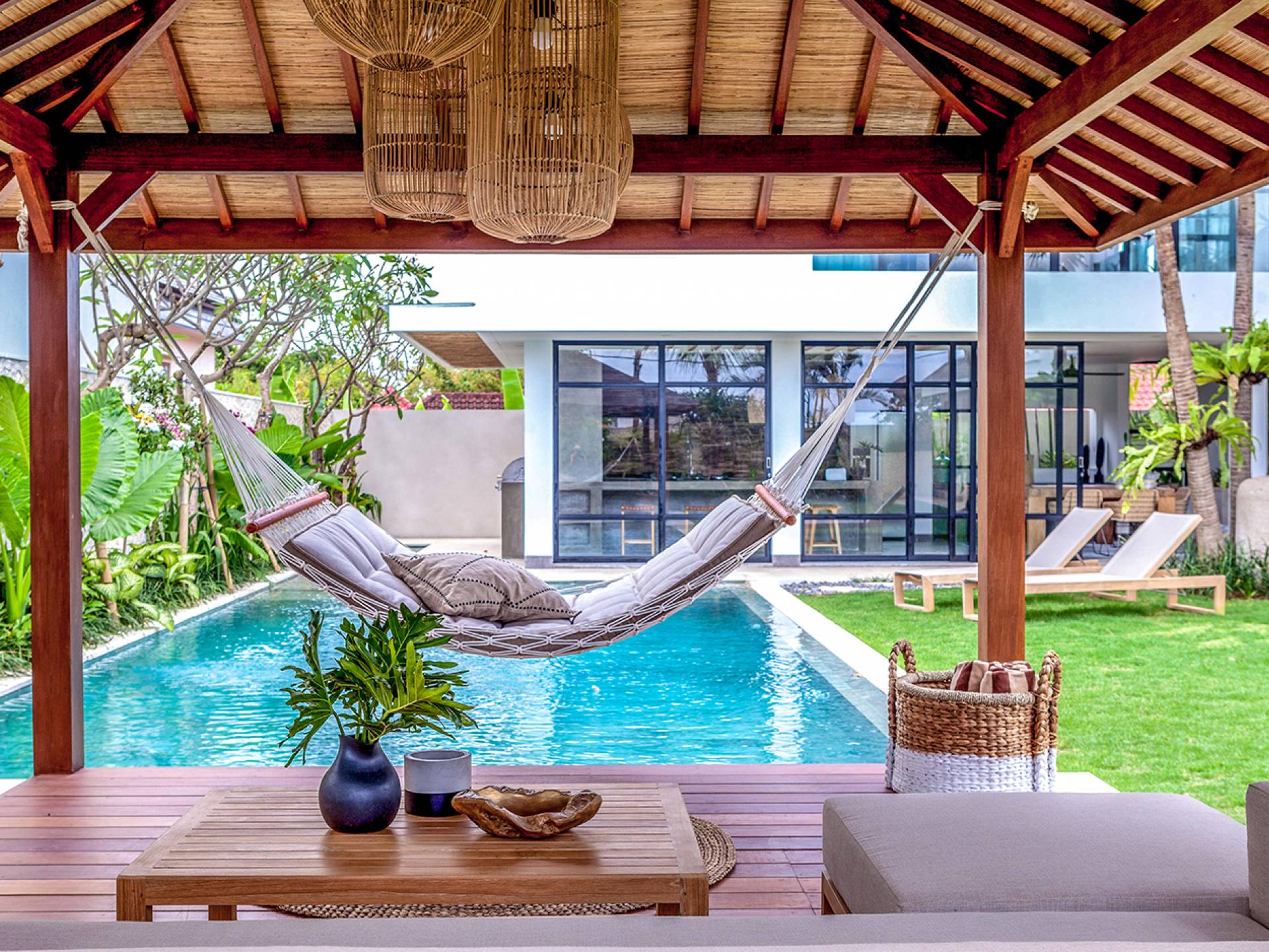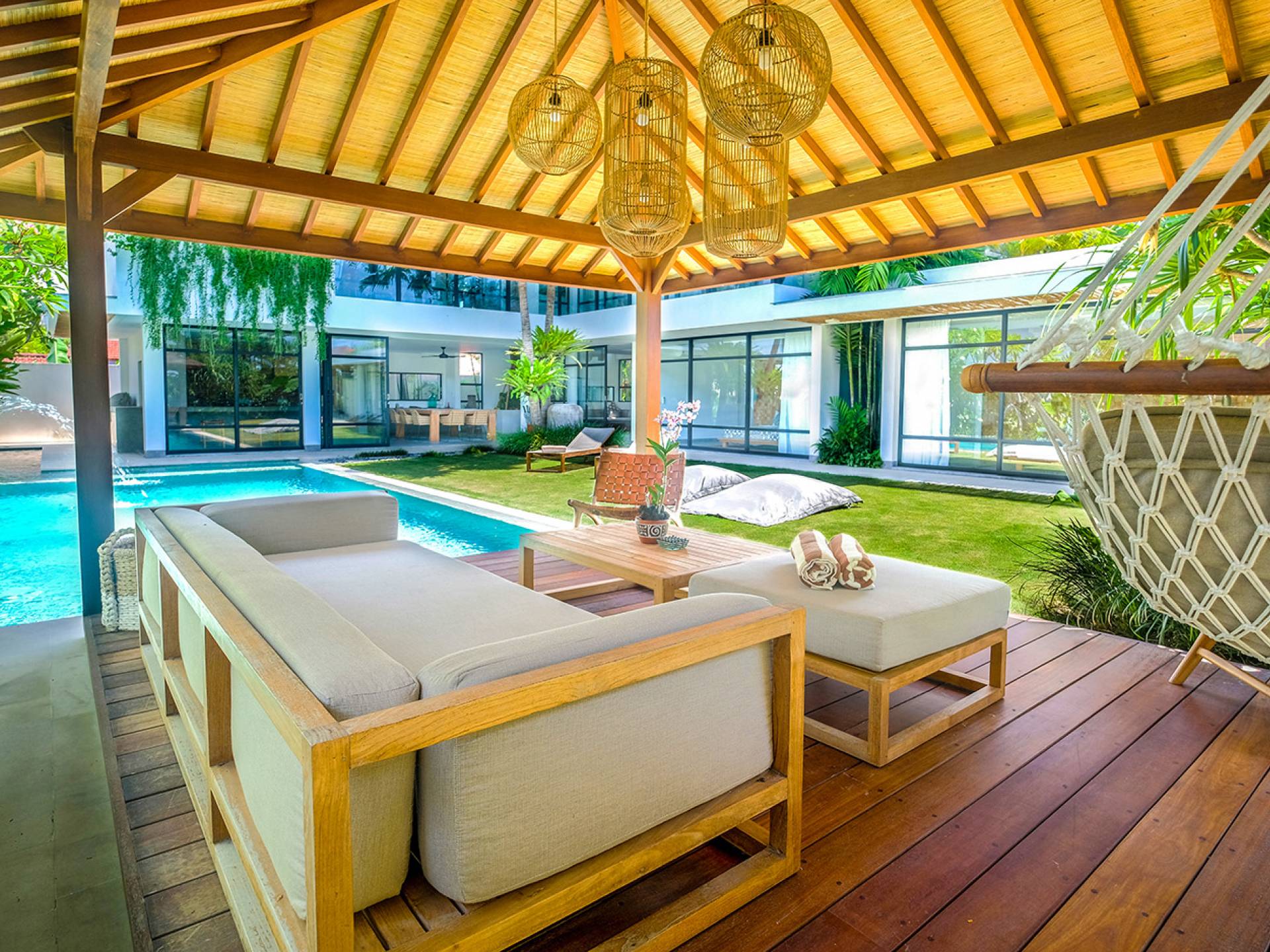 Villa Nonnavana Canggu es una villa de lujo en alquiler con 4 dormitorios y piscina privada. Villa Nonnavana es una elegante casa de playa, decorada con cálidos tonos de madera y acentos rústicos de ratán, en contraste con líneas limpias y modernas y vegetación alrededor. Las elegantes habitaciones con baño están ubicadas alrededor de una piscina central, y las espaciosas áreas de estar y comedor de planta abierta lo convierten en el espacio perfecto para el entretenimiento o simplemente para relajarse. Relájese junto a la piscina de 7x4 m en los sillones y las bolsas de arena, o pase el día en la hamaca de la acogedora cabaña.