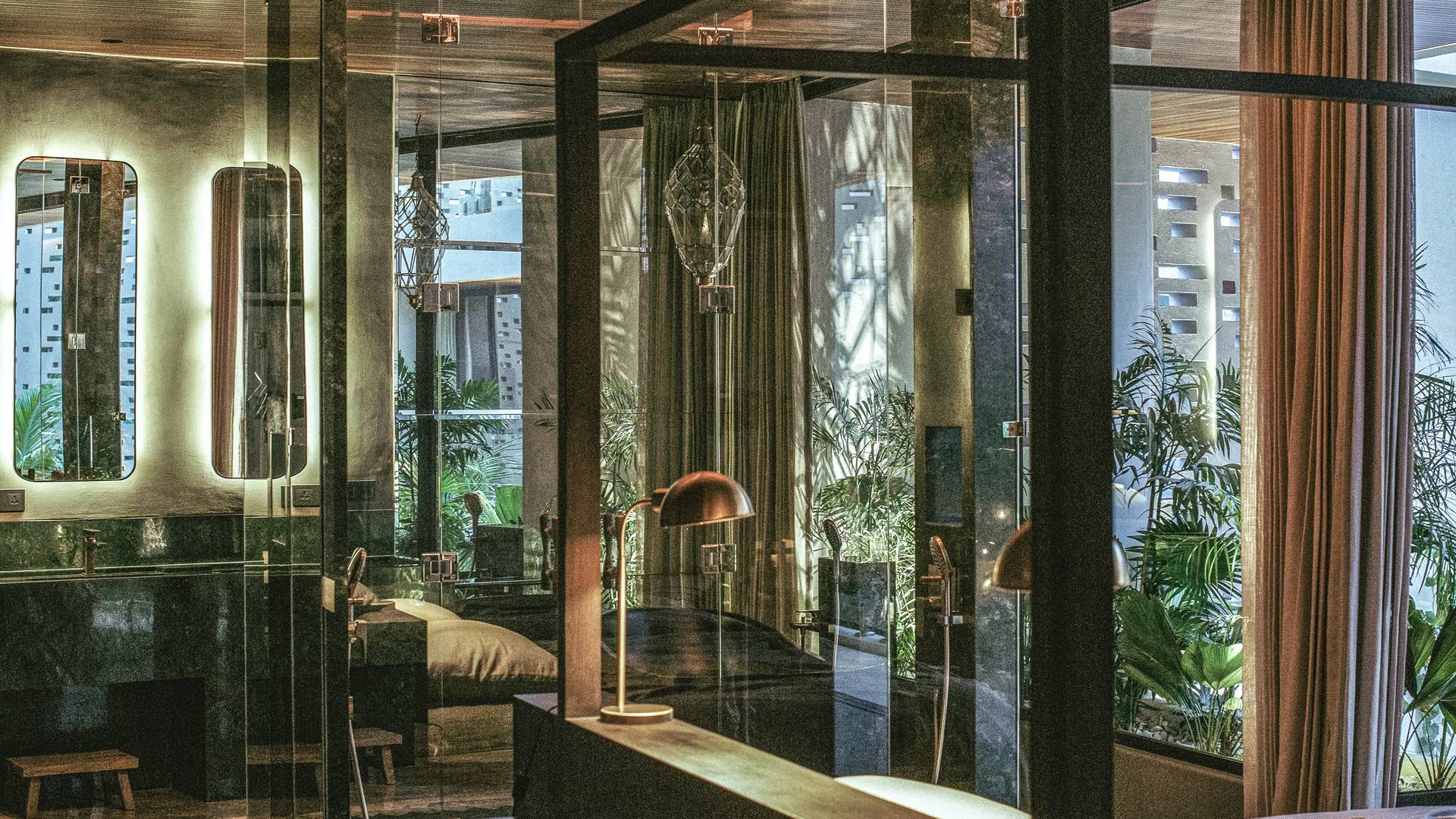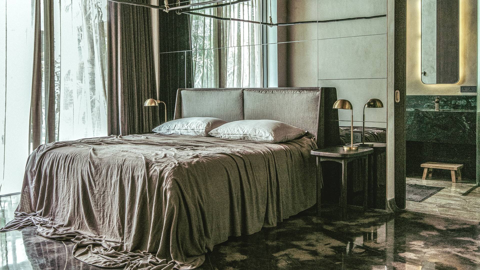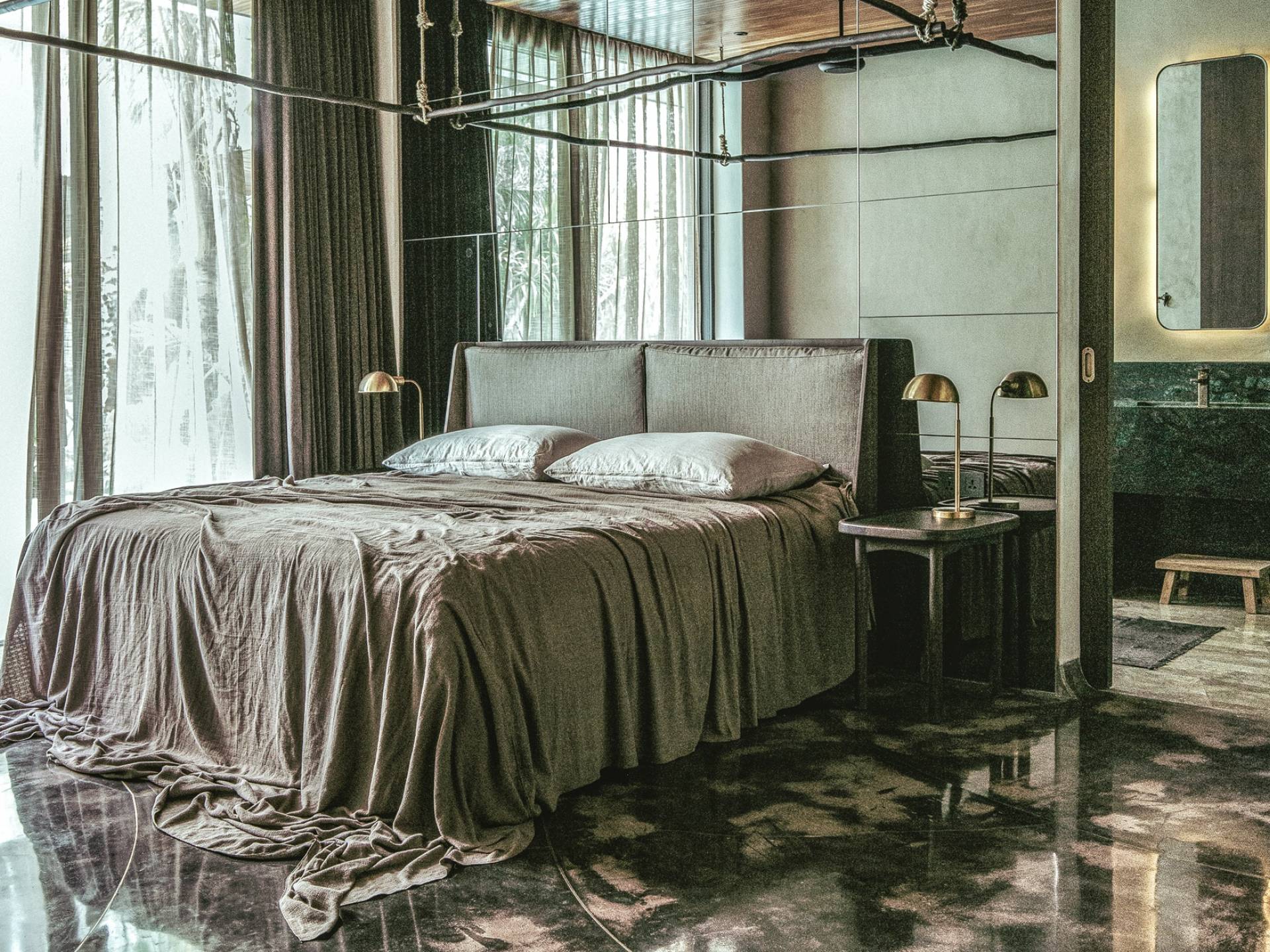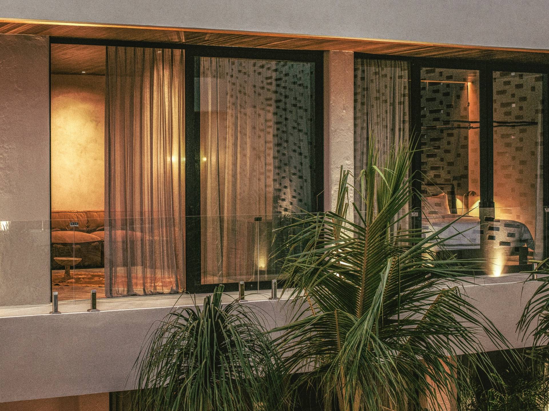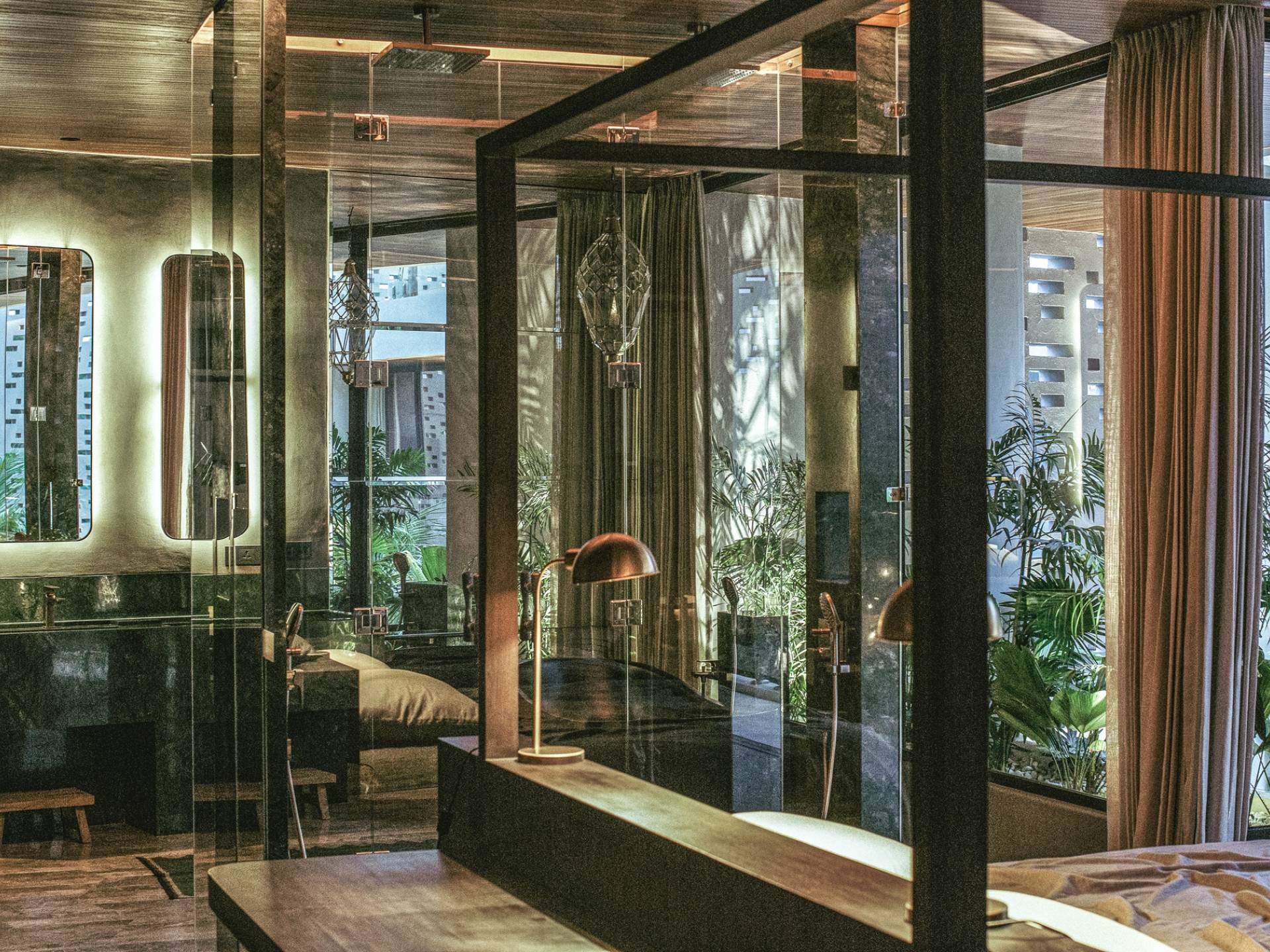 Las suites de dormitorio están diseñadas para un sueño profundo, quietud y relajación de lujo, mientras uno entra en los estados de sueño y sin sueños de Turiya. Con una iluminación ambiental cambiante, ropa de cama de 500 hilos, colchones de alta calidad, cortinas opacas y pisos de cemento pulido con incrustaciones de latón, los huéspedes pueden sumergirse por completo y disfrutar de un tiempo de inactividad de calidad. Los baños en suite cuentan con lavabos dobles de mármol personalizados, duchas de lluvia y bañeras independientes, equipadas con grifos y juegos de ducha Hansgrohe de latón cepillado.