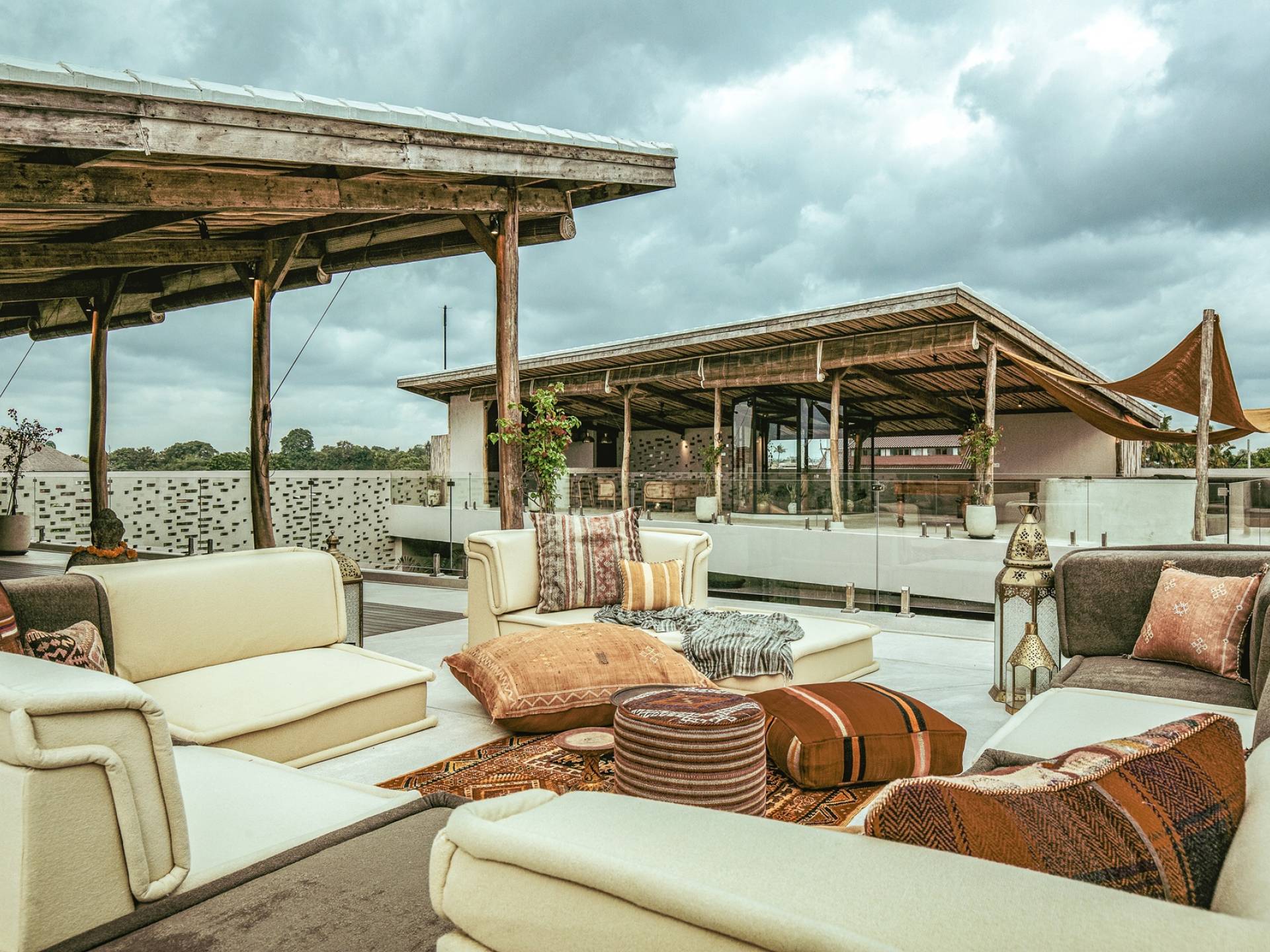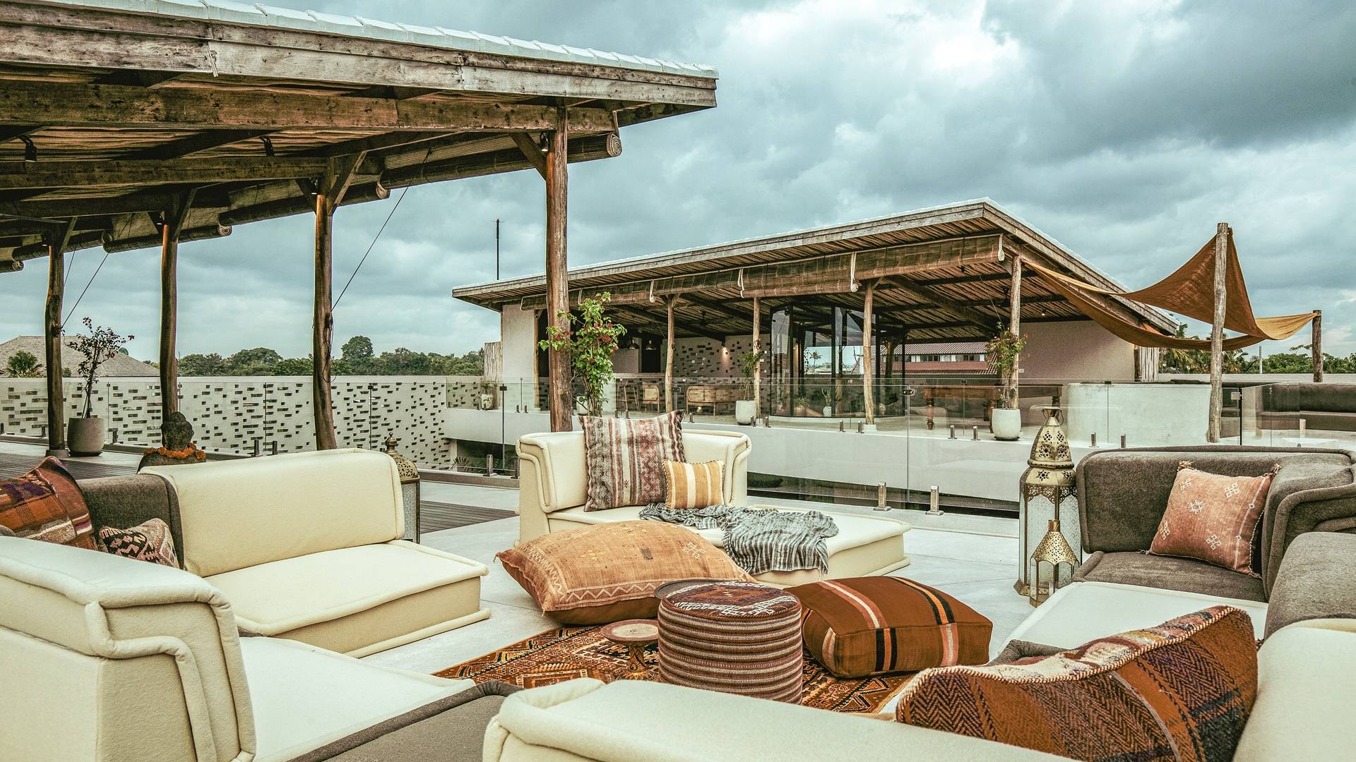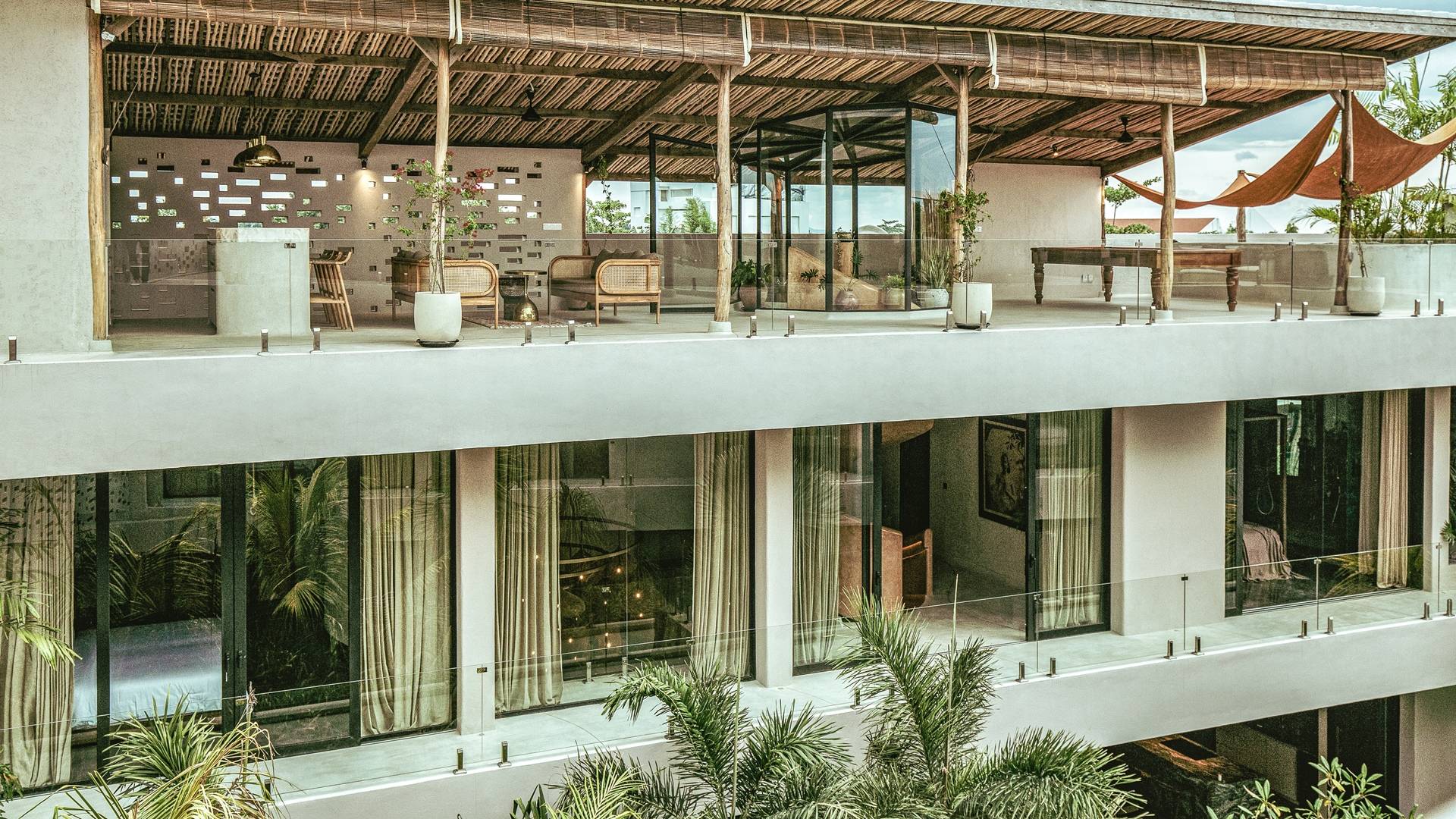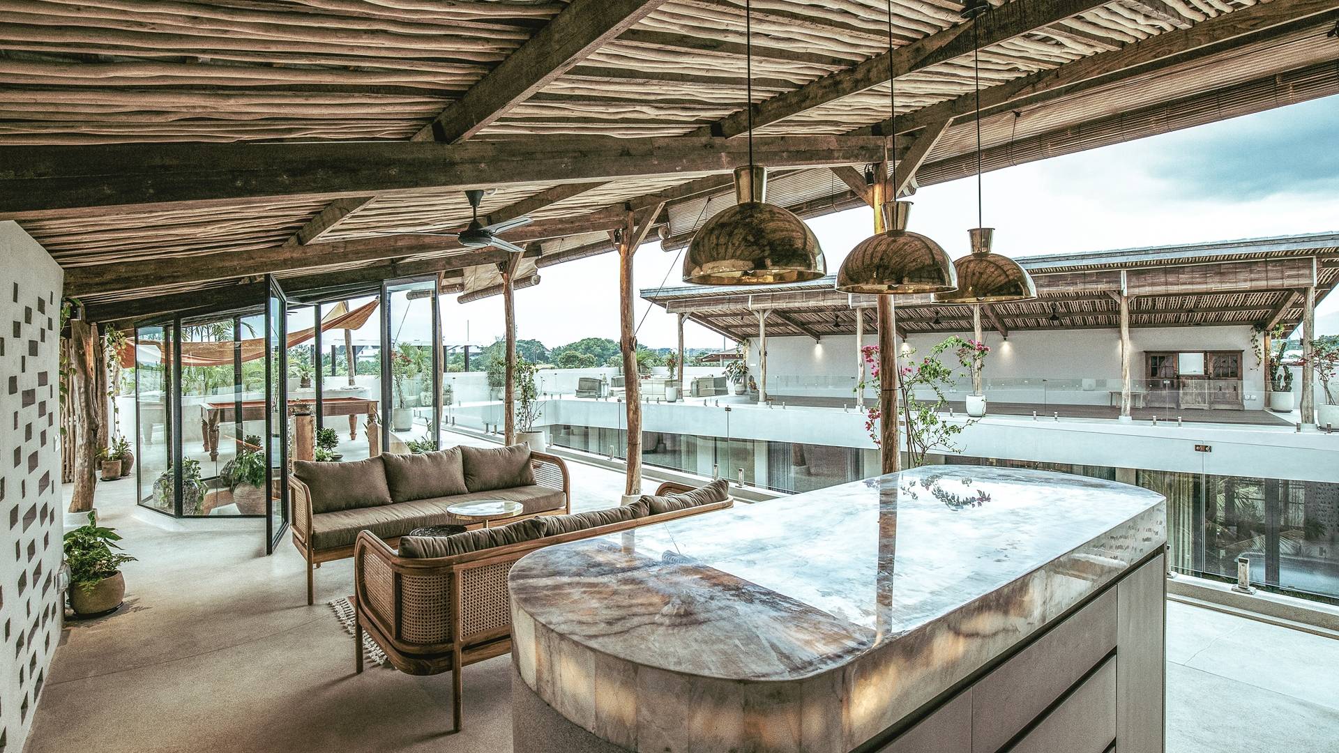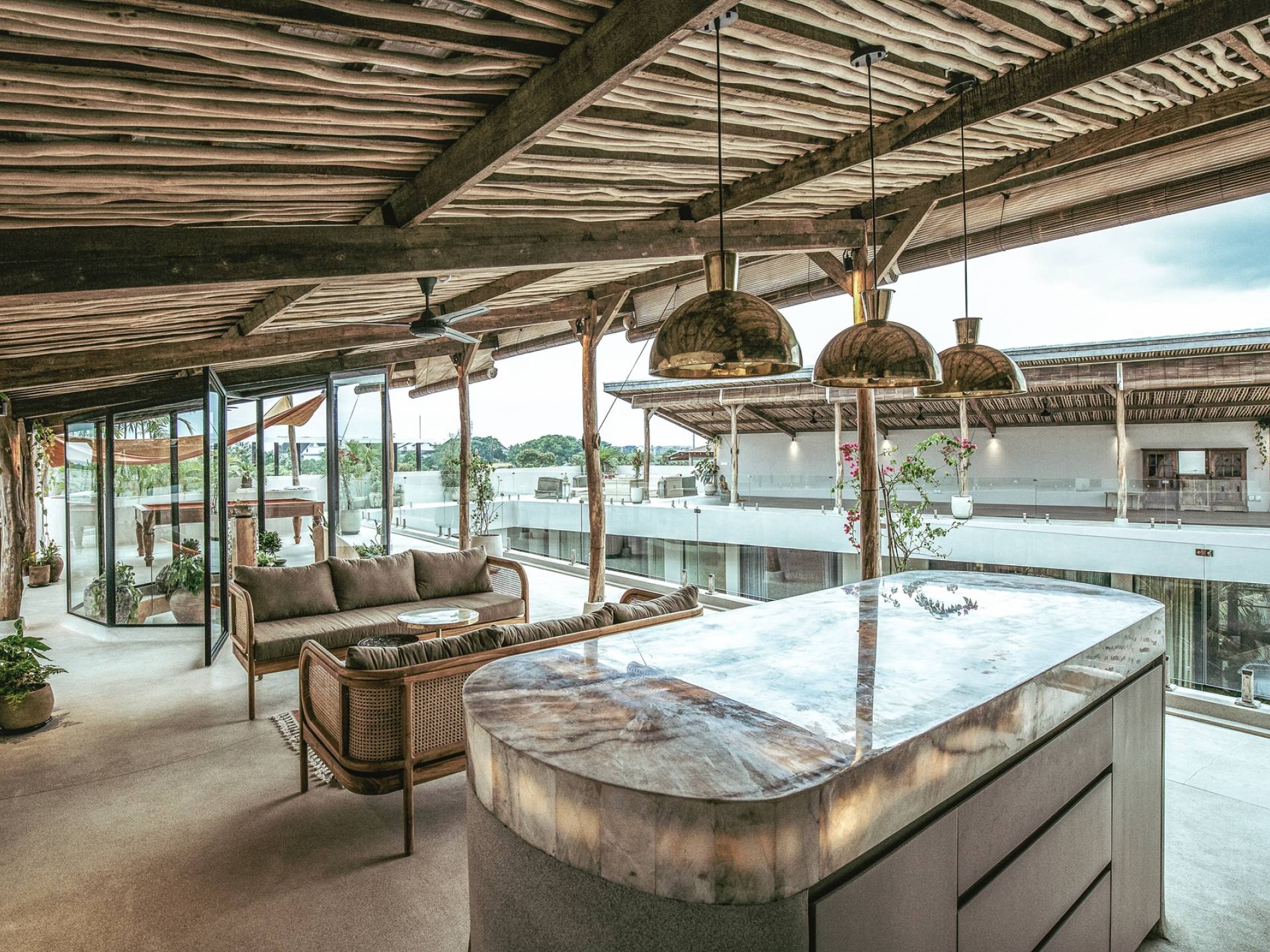 Las dos amplias terrazas en la azotea tienen cada una 150 metros cuadrados y ofrecen vistas del océano Índico, así como de la estatua de Vishnu en Uluwatu. Por un lado, hay una cocina al aire libre y un área de bar, una mesa de billar y áreas para sentarse, y por el otro lado, un gran espacio para ejercicios/yoga para garantizar una alineación saludable de la mente y el cuerpo durante su estadía.