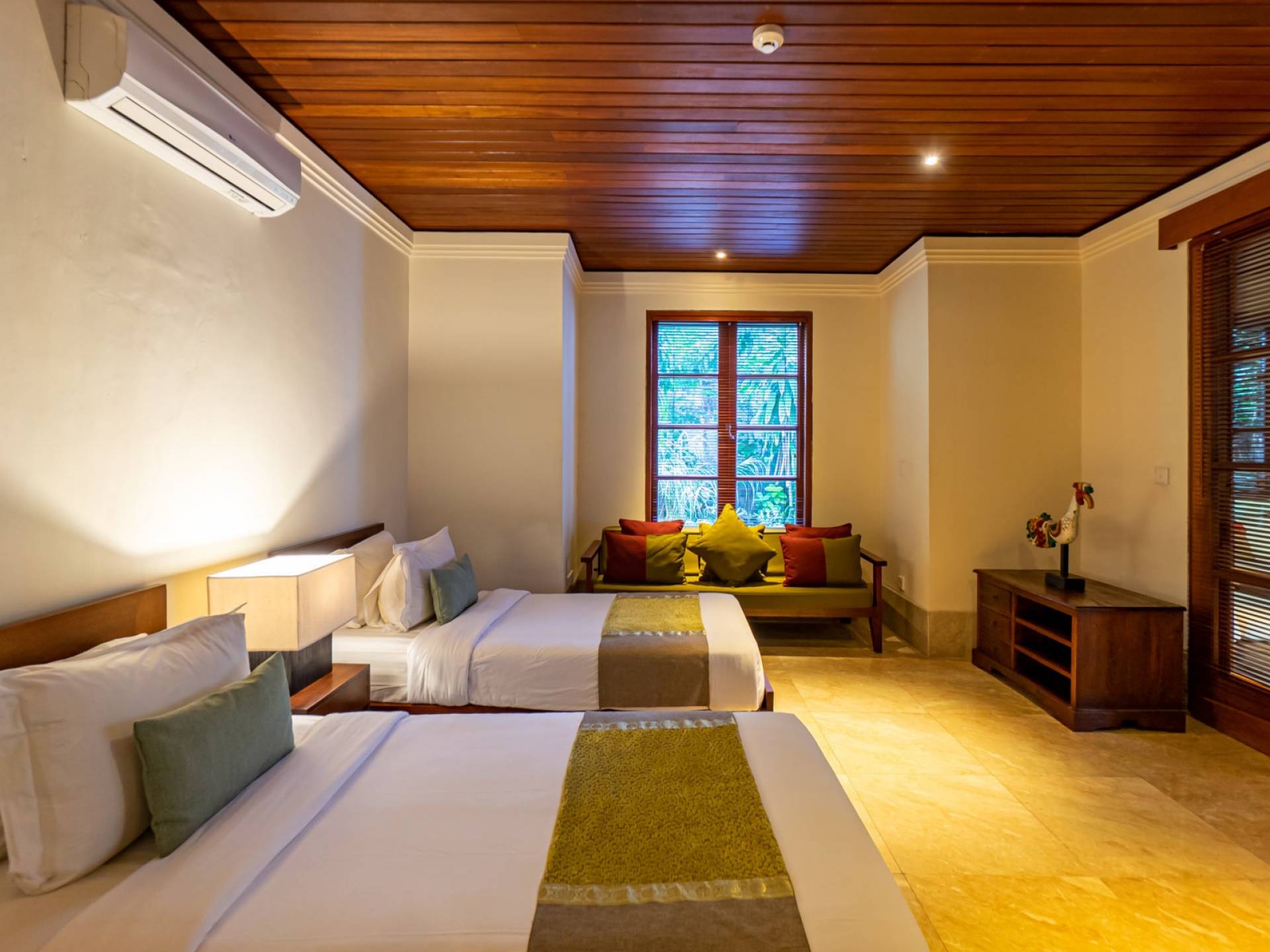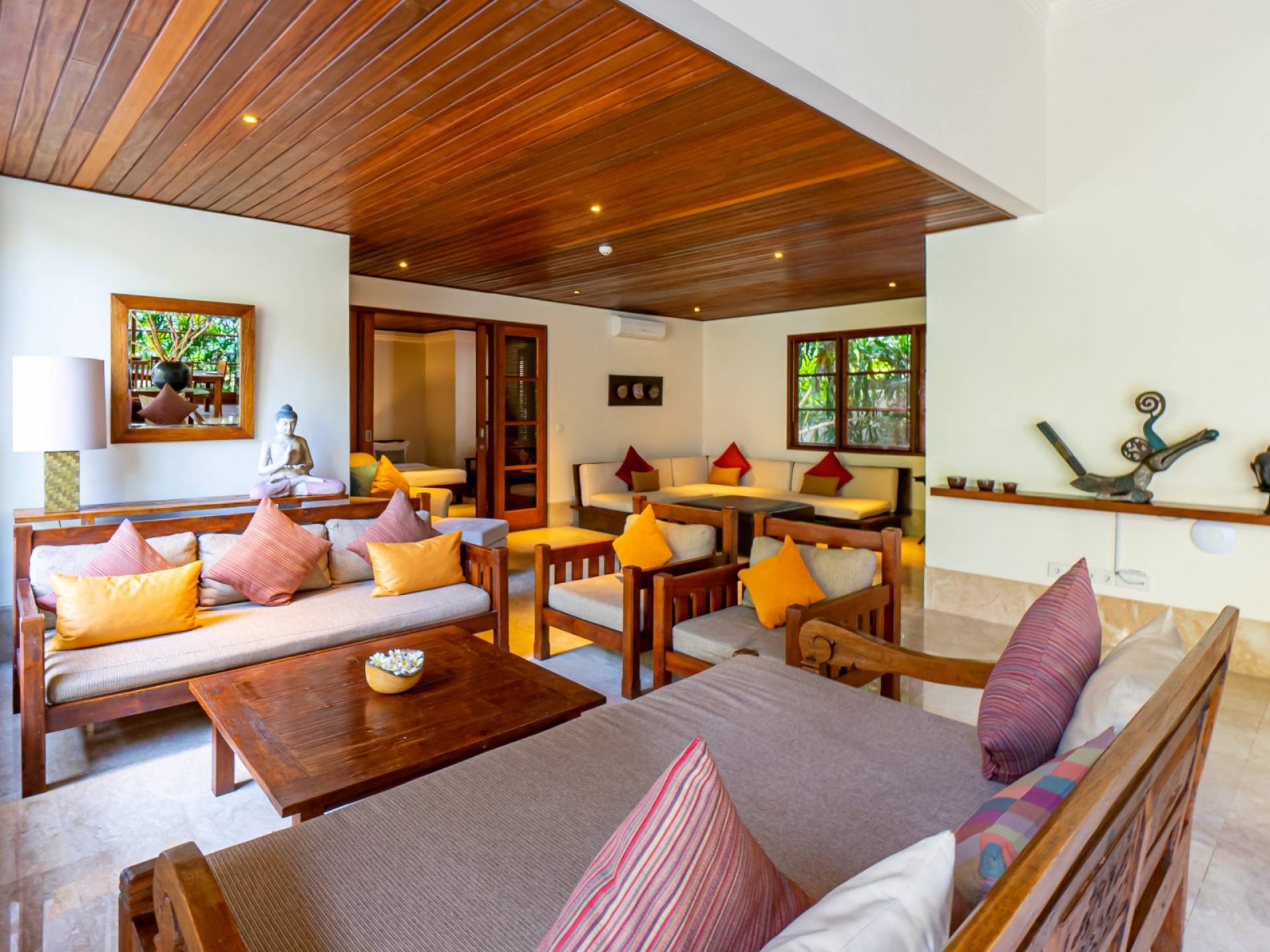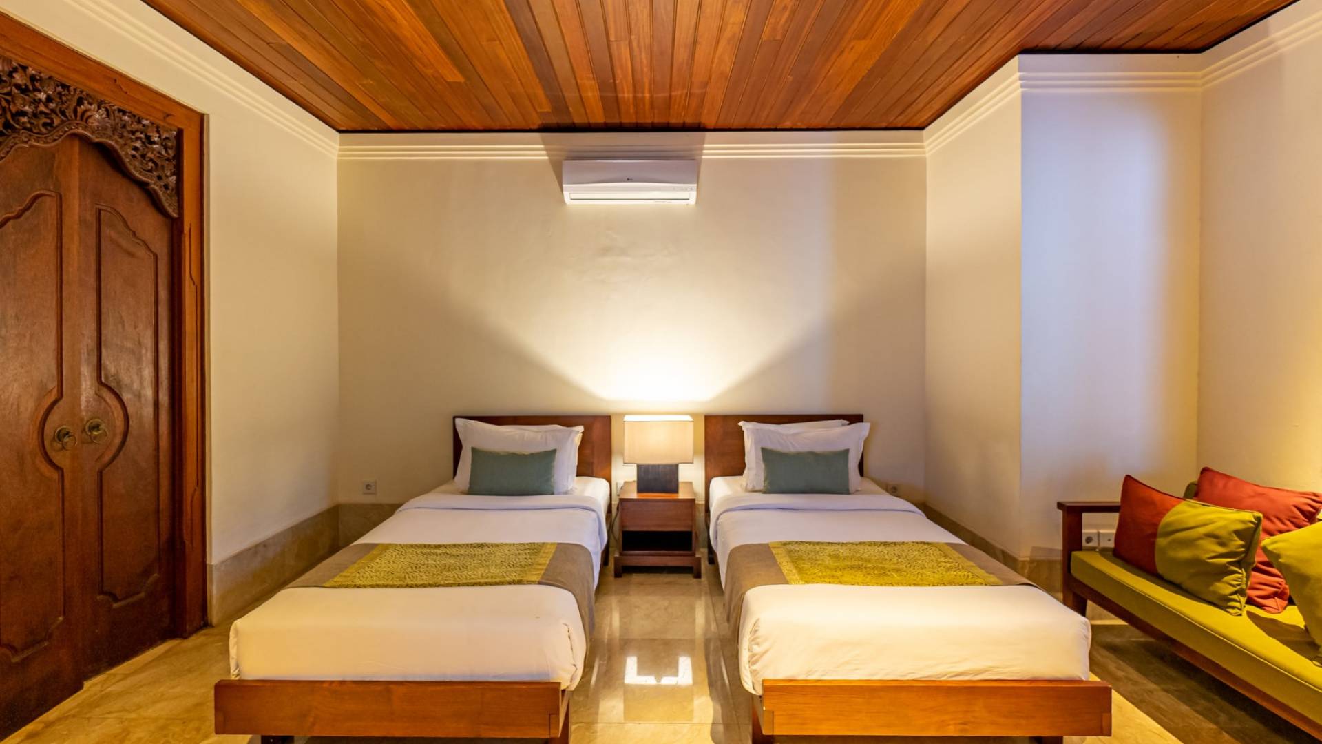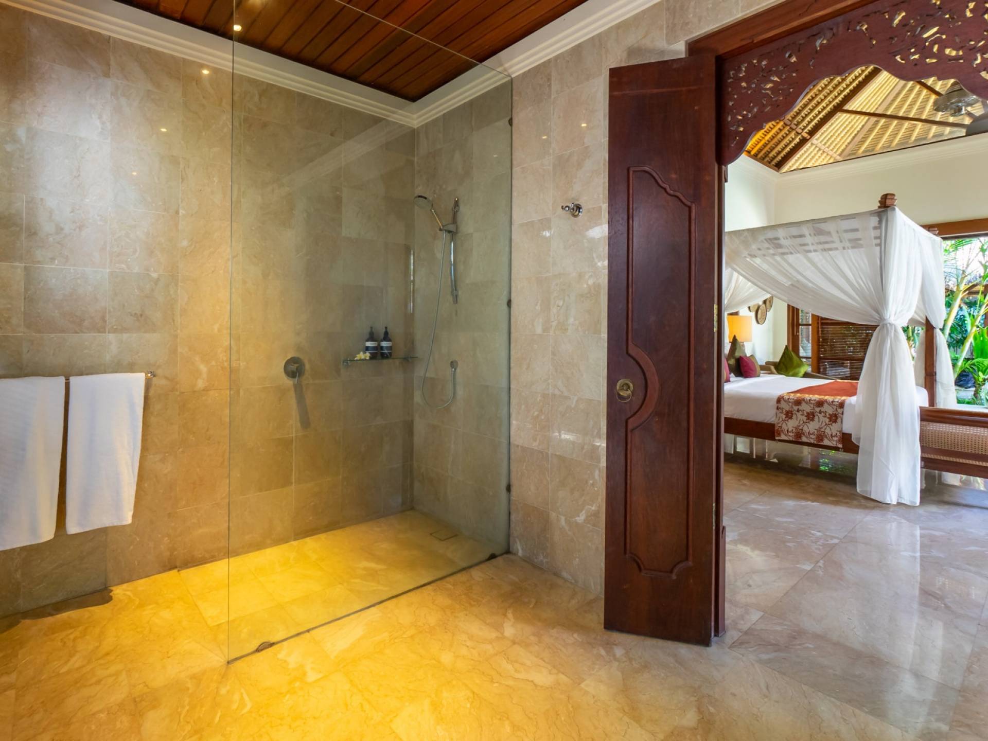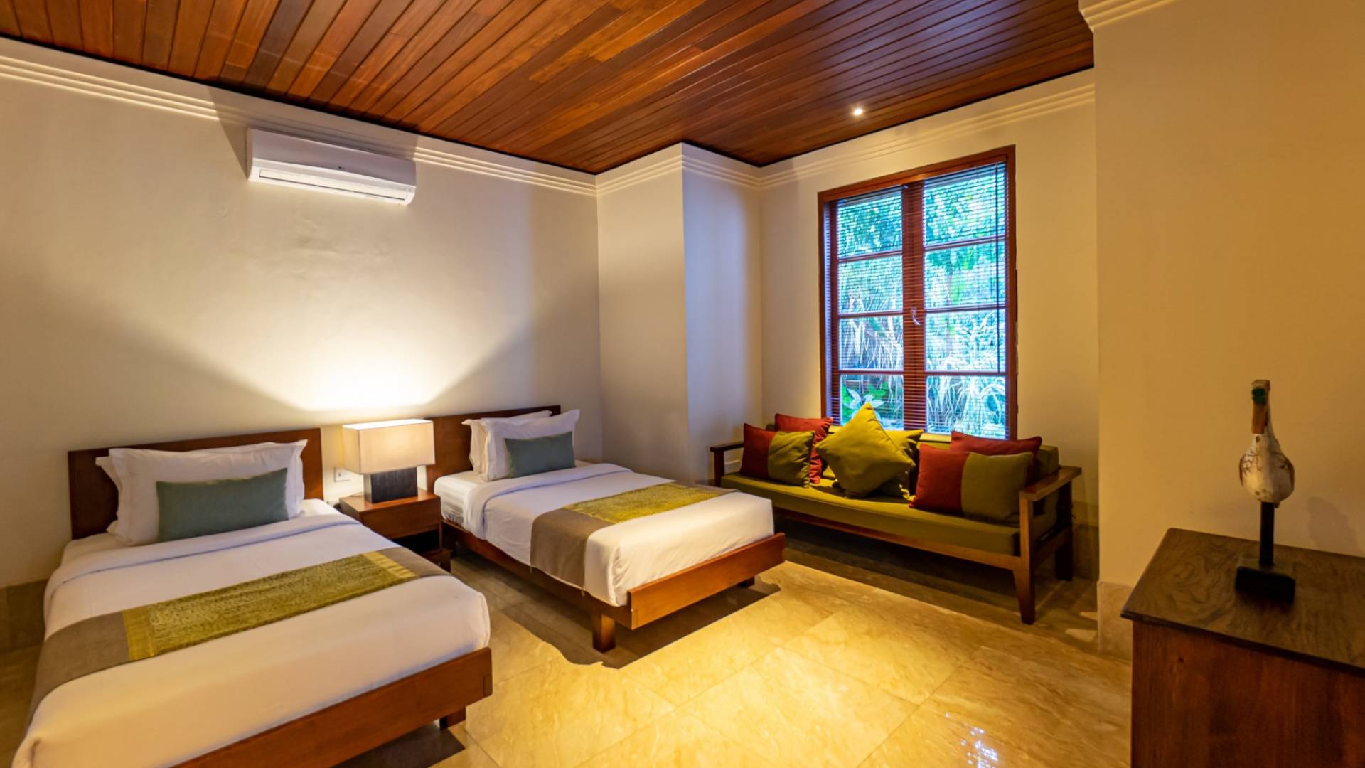 Cada una de las habitaciones tiene camas dobles, TV, aire acondicionado y está ubicada muy cerca para garantizar la máxima privacidad. Todos con baño y grandes armarios de madera, dos de los baños en la planta baja se abren a la zona del jardín exterior y el otro a un jacuzzi exterior. El dormitorio principal en el piso superior personifica la vida de lujo con una habitación separada para jacuzzi y duchas, respectivamente, y un balcón con vista al verde jardín de abajo. La decoración interior combina a la perfección el confort moderno con el toque tradicional balinés con abundante luz natural.