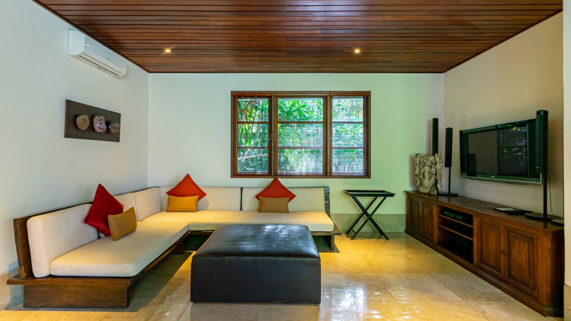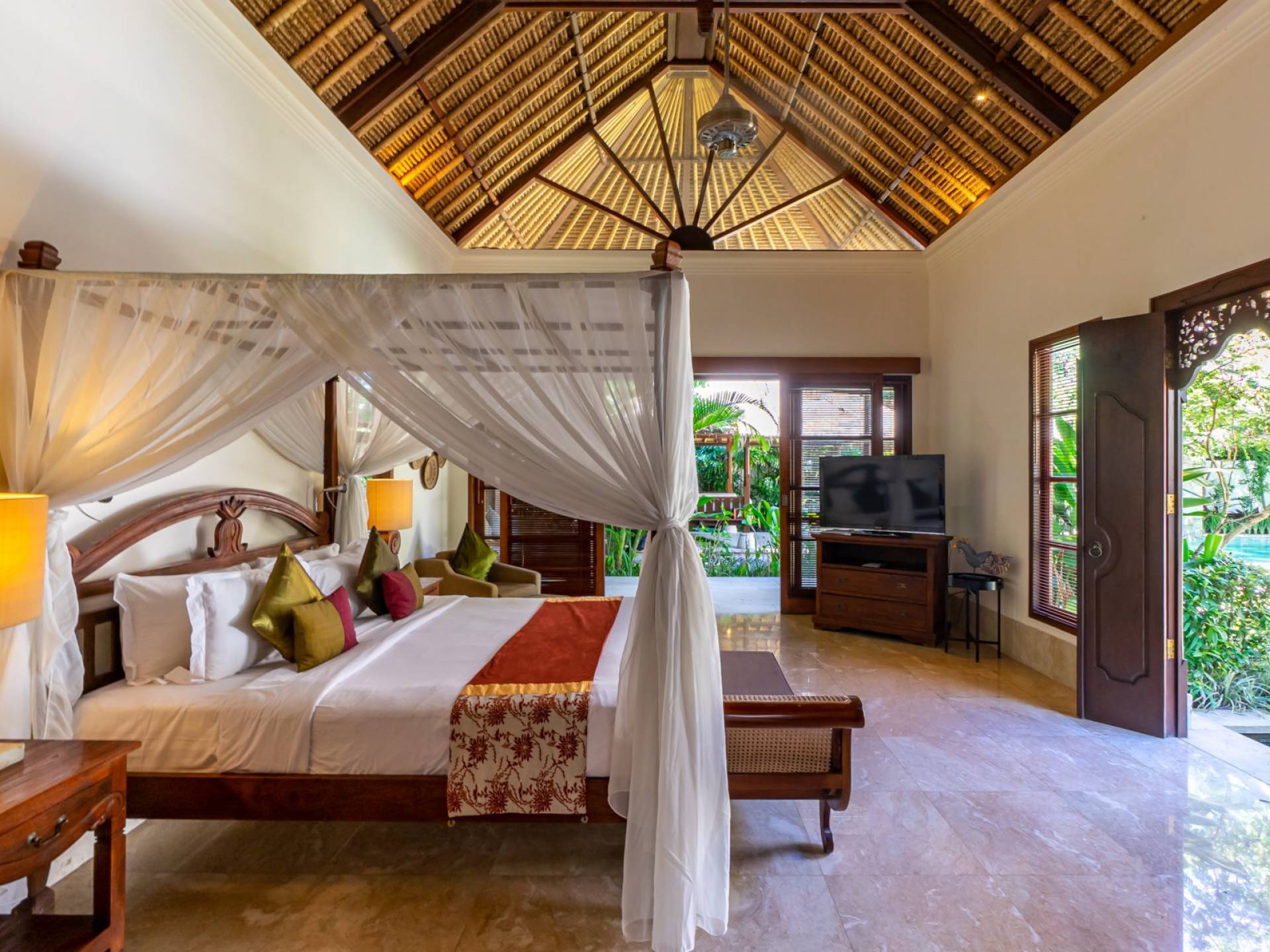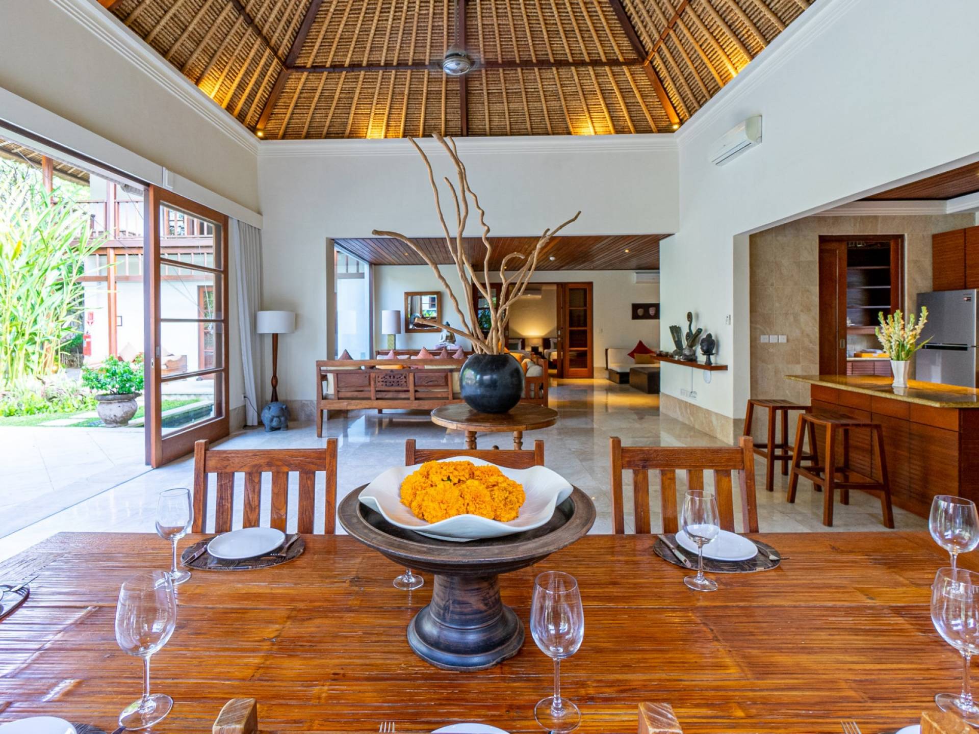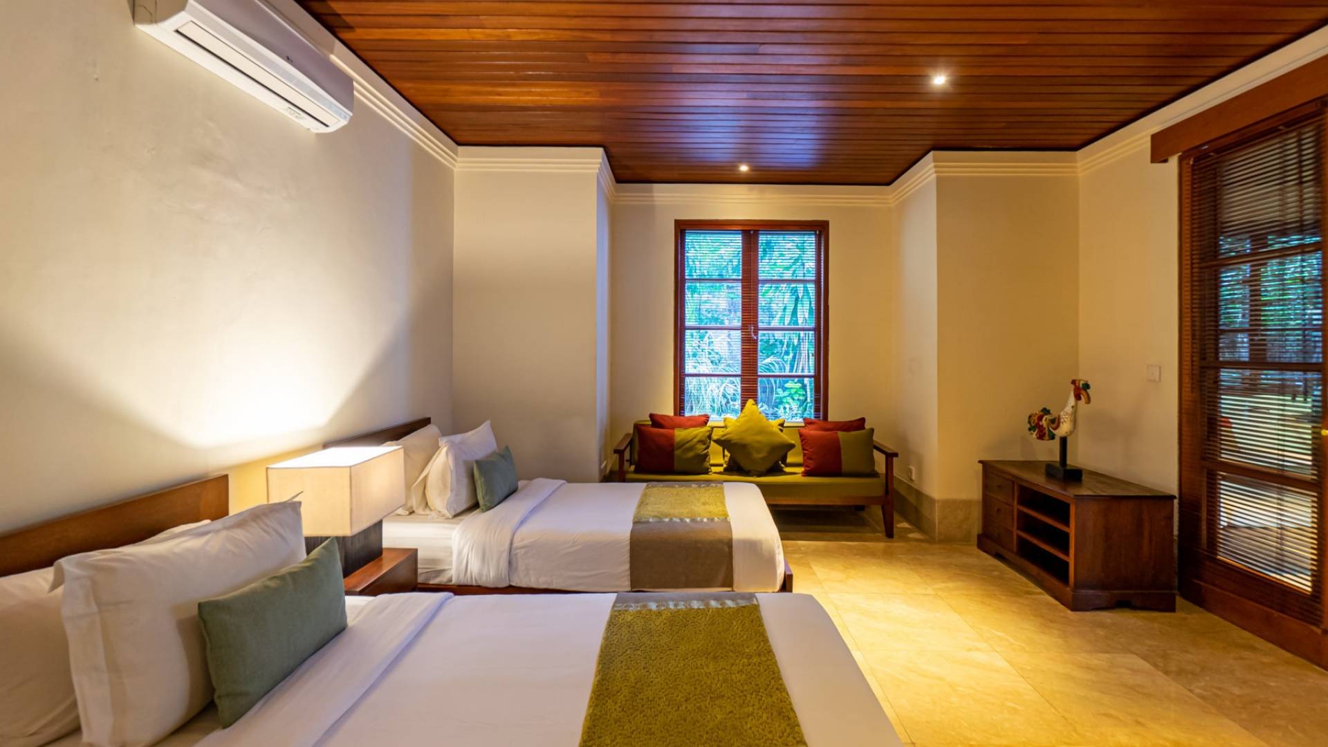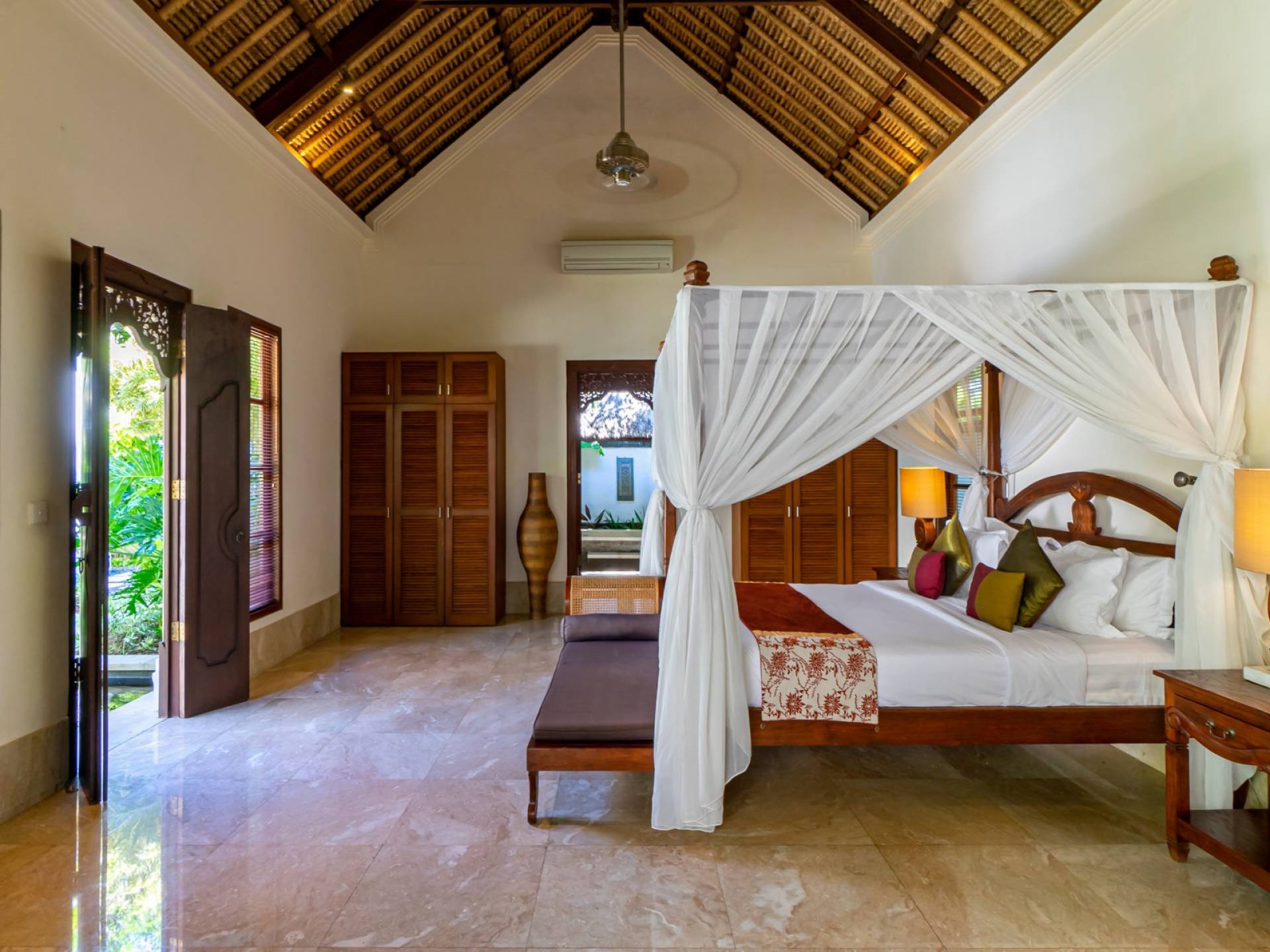 Cada una de las habitaciones tiene camas dobles, TV, aire acondicionado y está ubicada muy cerca para garantizar la máxima privacidad. Todos con baño y grandes armarios de madera, dos de los baños en la planta baja se abren a la zona del jardín exterior y el otro a un jacuzzi exterior. El dormitorio principal en el piso superior personifica la vida de lujo con una habitación separada para jacuzzi y duchas, respectivamente, y un balcón con vista al verde jardín de abajo. La decoración interior combina a la perfección el confort moderno con el toque tradicional balinés con abundante luz natural.