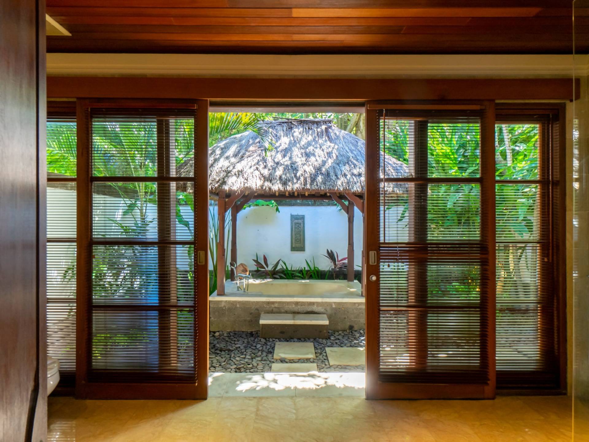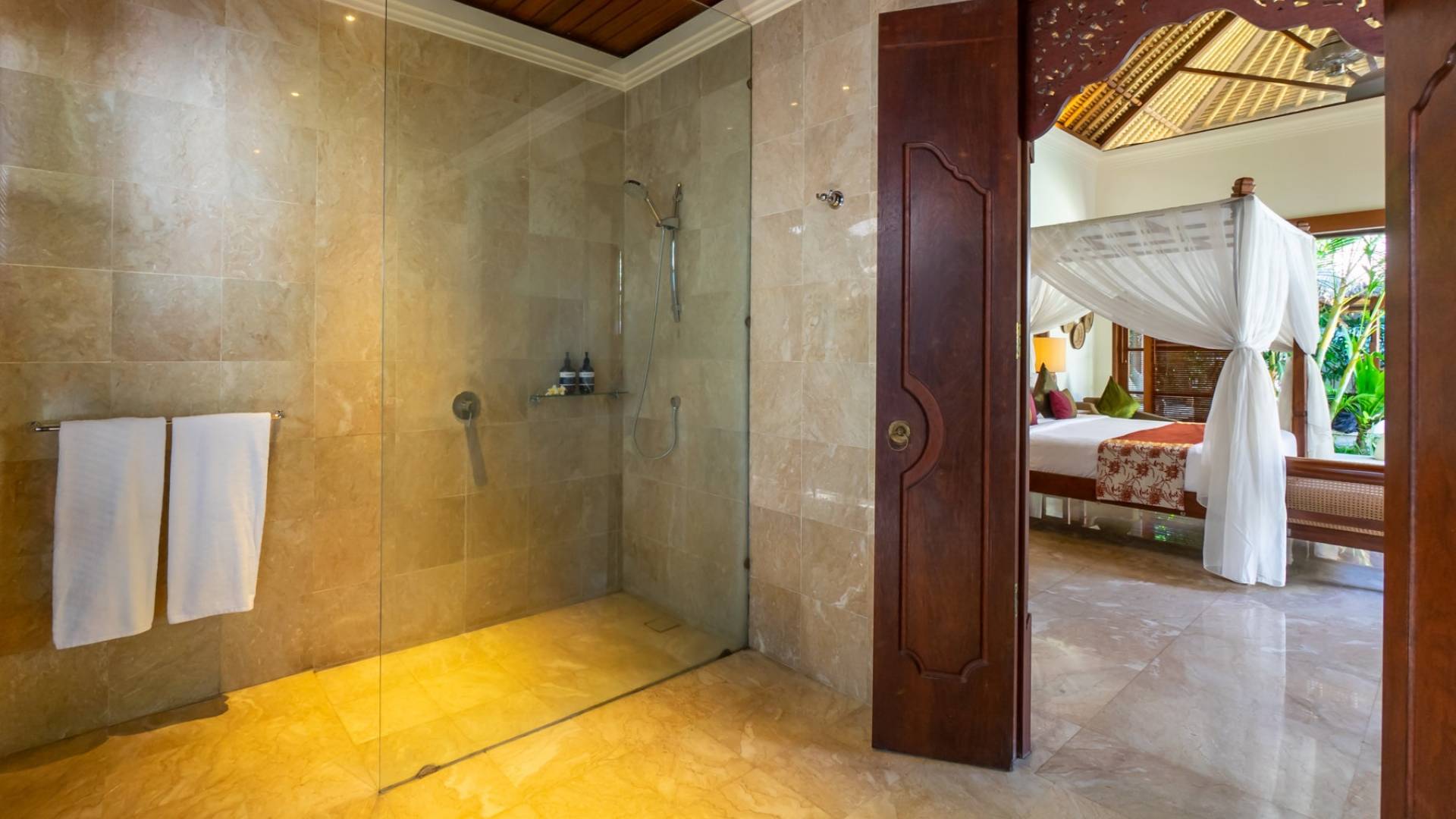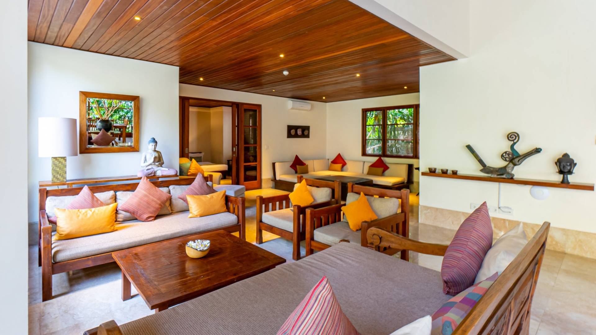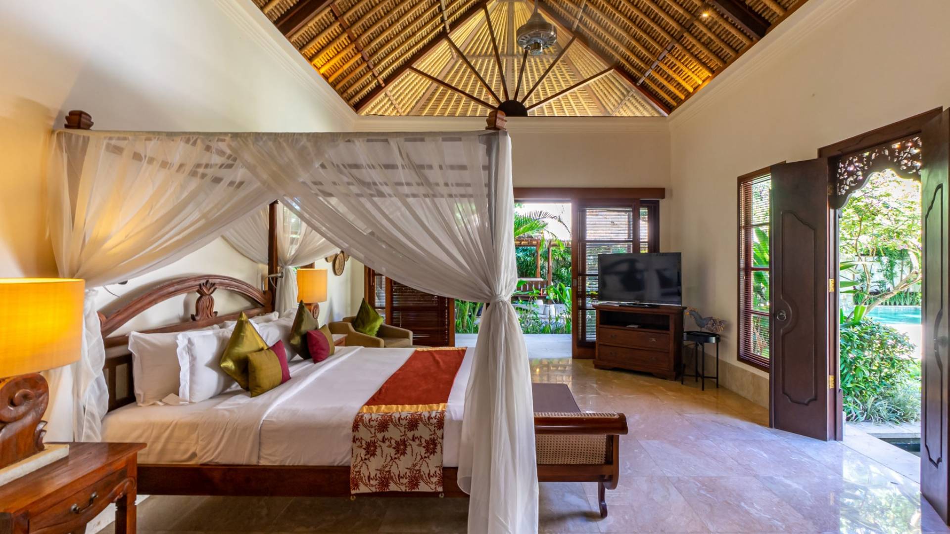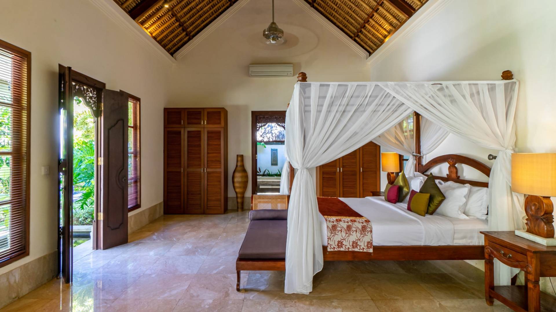 Cada una de las habitaciones tiene camas dobles, TV, aire acondicionado y está ubicada muy cerca para garantizar la máxima privacidad. Todos con baño y grandes armarios de madera, dos de los baños en la planta baja se abren a la zona del jardín exterior y el otro a un jacuzzi exterior. El dormitorio principal en el piso superior personifica la vida de lujo con una habitación separada para jacuzzi y duchas, respectivamente, y un balcón con vista al verde jardín de abajo. La decoración interior combina a la perfección el confort moderno con el toque tradicional balinés con abundante luz natural.