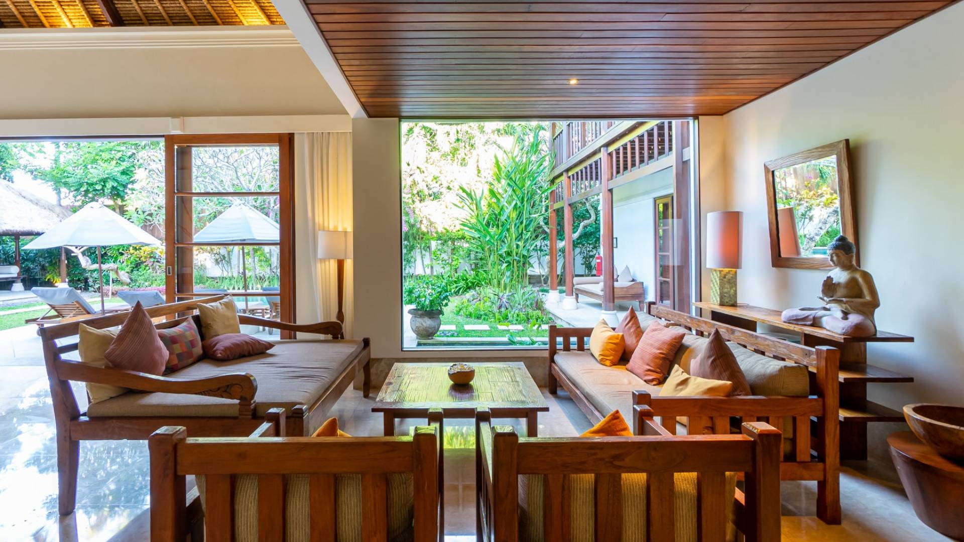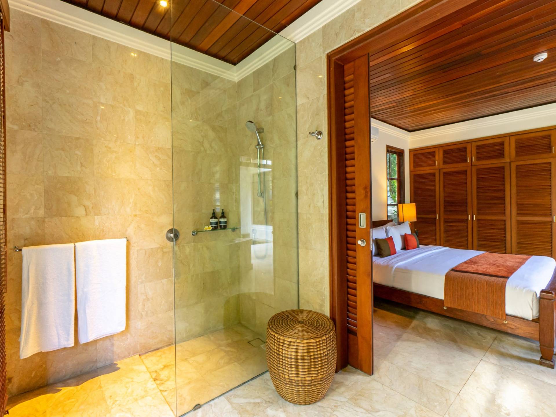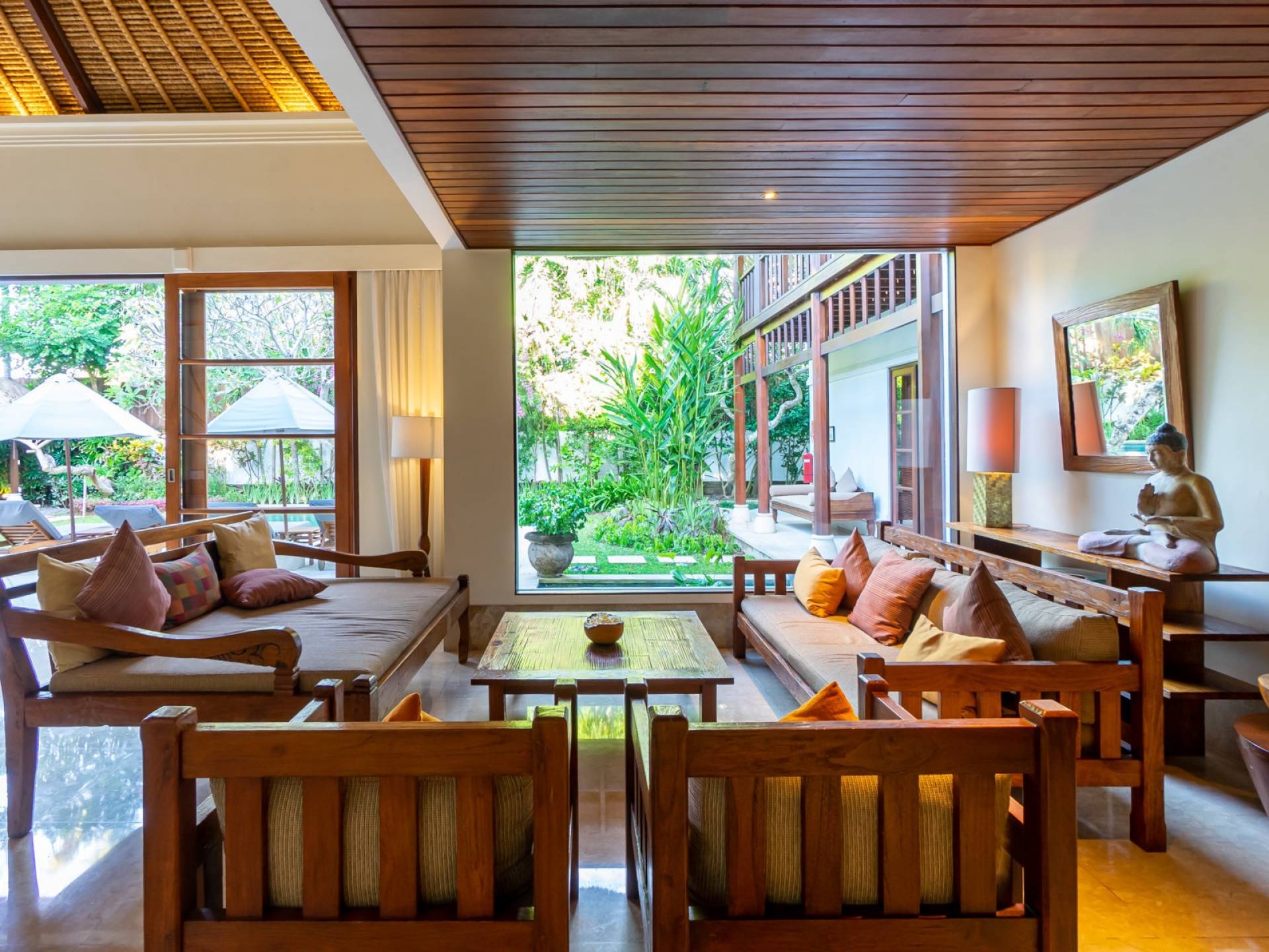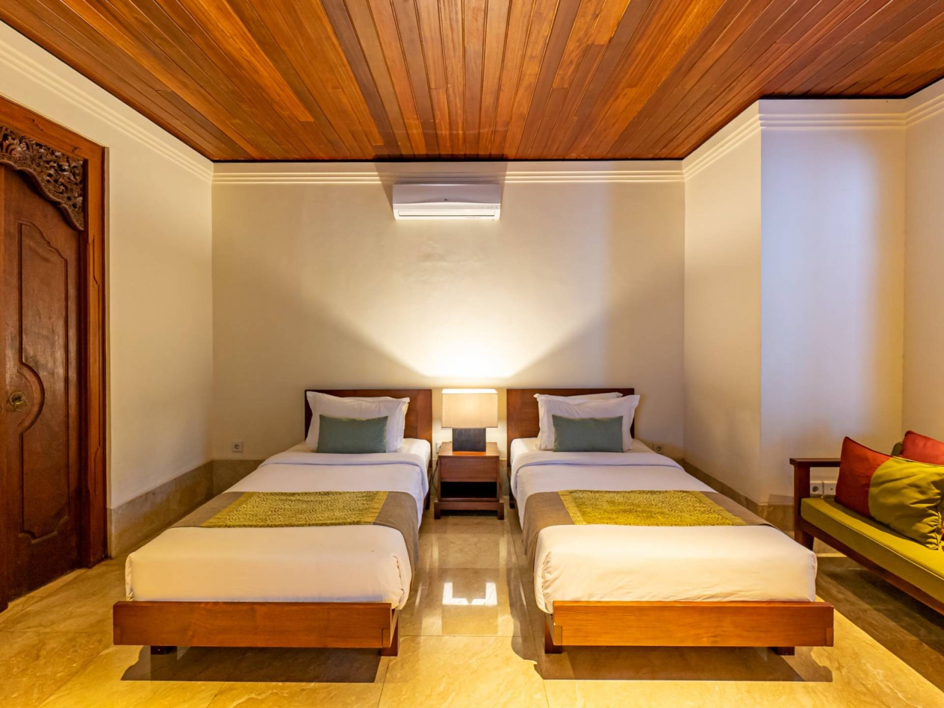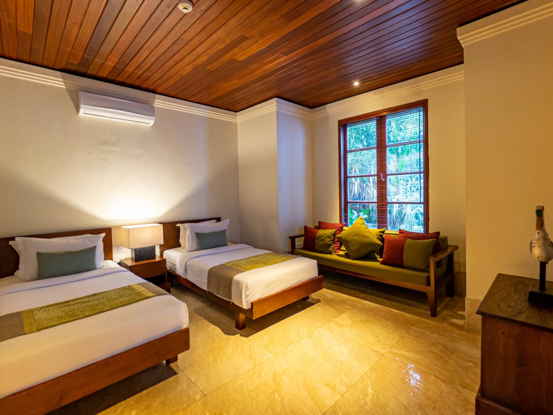 Cada una de las habitaciones tiene camas dobles, TV, aire acondicionado y está ubicada muy cerca para garantizar la máxima privacidad. Todos con baño y grandes armarios de madera, dos de los baños en la planta baja se abren a la zona del jardín exterior y el otro a un jacuzzi exterior. El dormitorio principal en el piso superior personifica la vida de lujo con una habitación separada para jacuzzi y duchas, respectivamente, y un balcón con vista al verde jardín de abajo. La decoración interior combina a la perfección el confort moderno con el toque tradicional balinés con abundante luz natural.