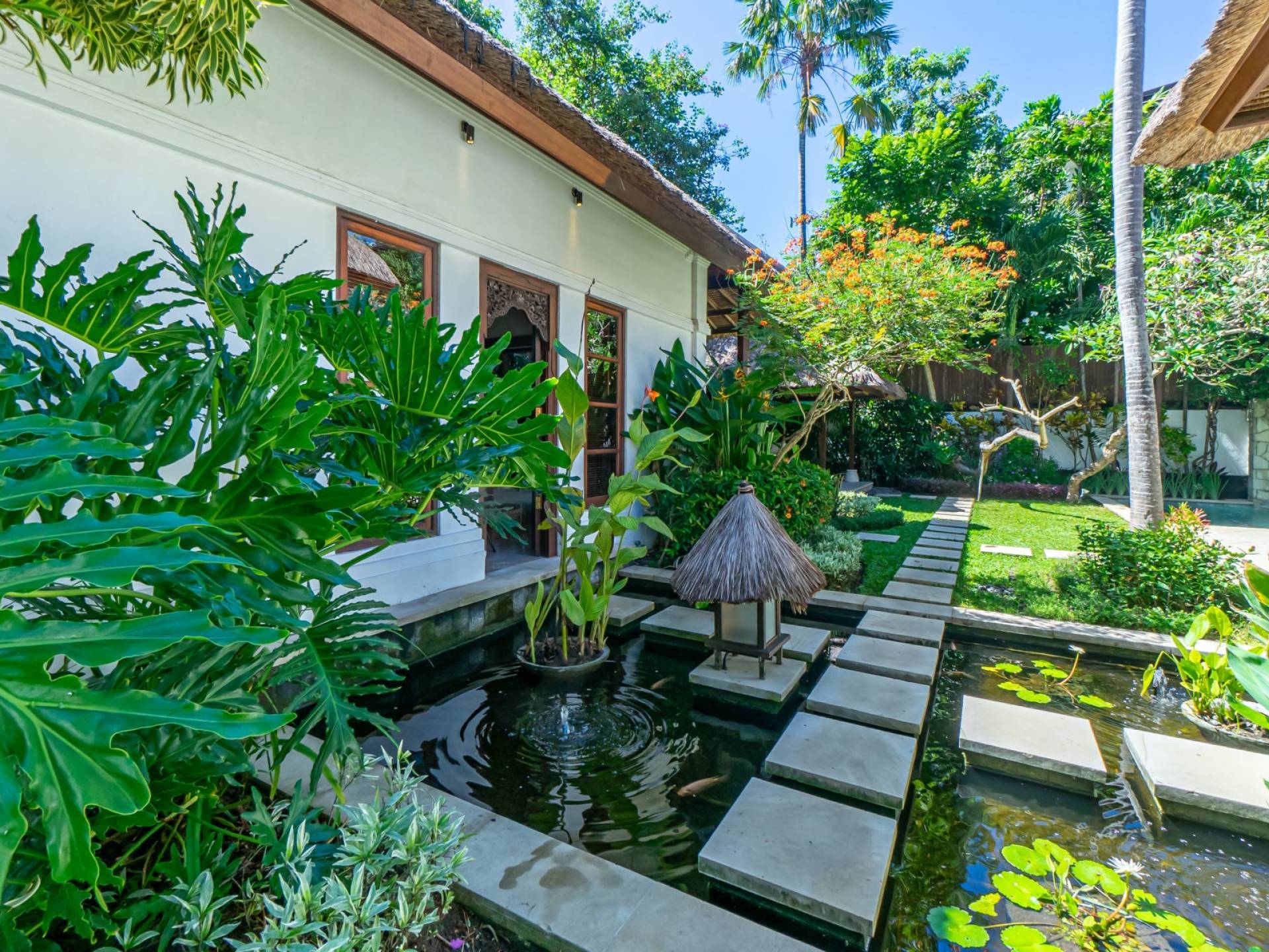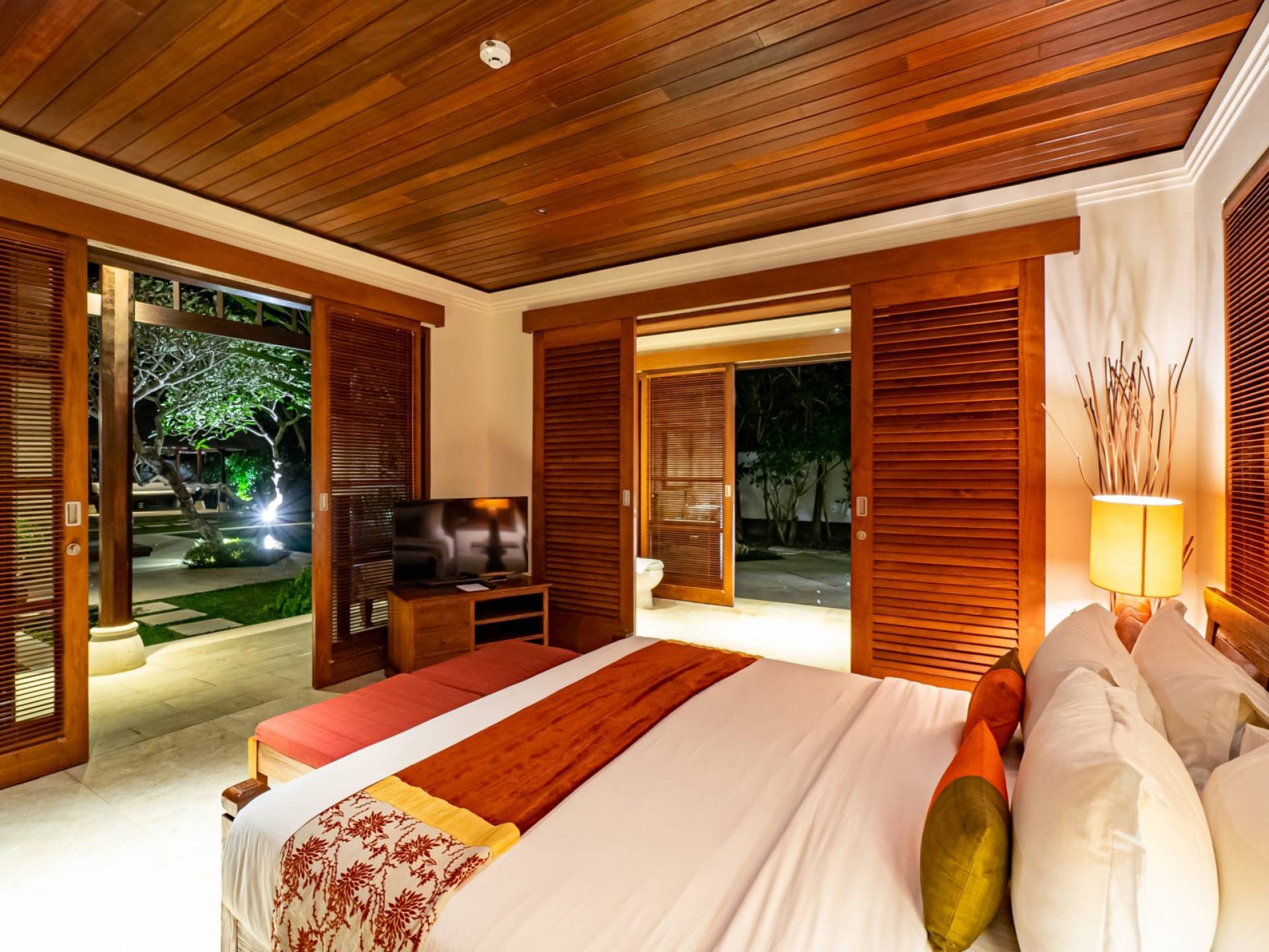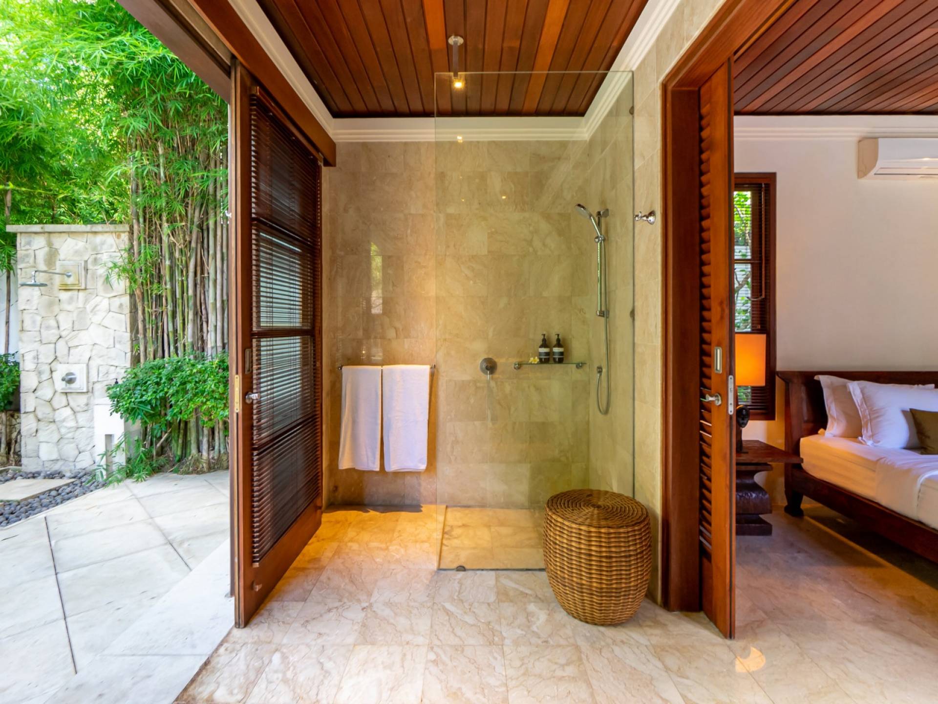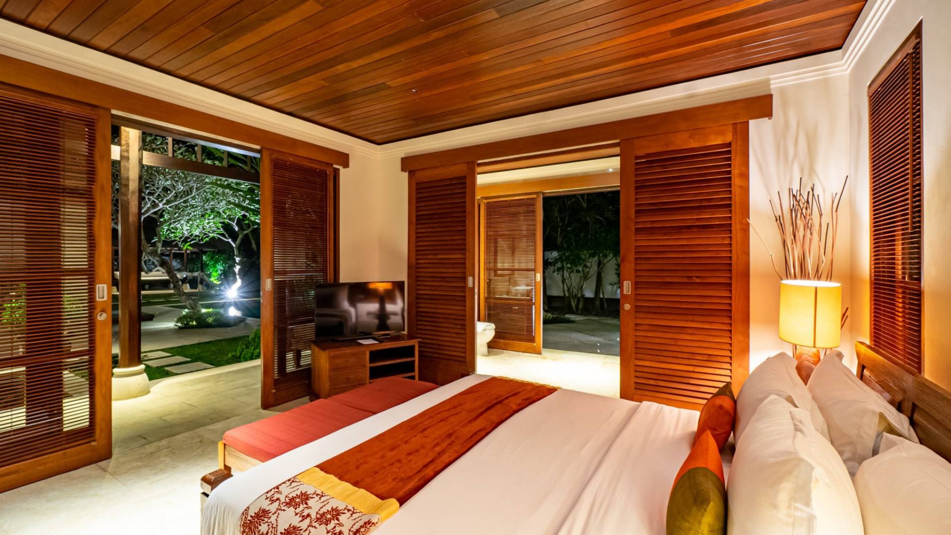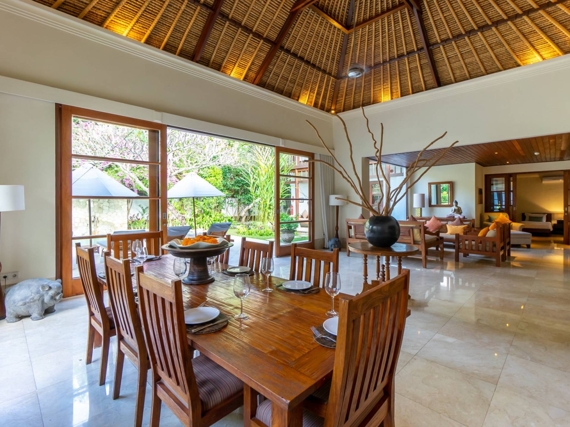 Cada una de las habitaciones tiene camas dobles, TV, aire acondicionado y está ubicada muy cerca para garantizar la máxima privacidad. Todos con baño y grandes armarios de madera, dos de los baños en la planta baja se abren a la zona del jardín exterior y el otro a un jacuzzi exterior. El dormitorio principal en el piso superior personifica la vida de lujo con una habitación separada para jacuzzi y duchas, respectivamente, y un balcón con vista al verde jardín de abajo. La decoración interior combina a la perfección el confort moderno con el toque tradicional balinés con abundante luz natural.
