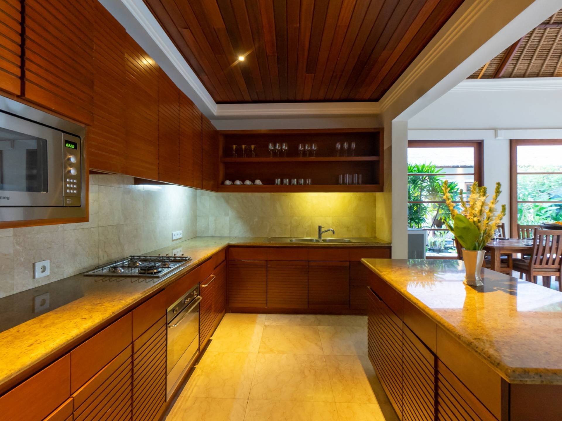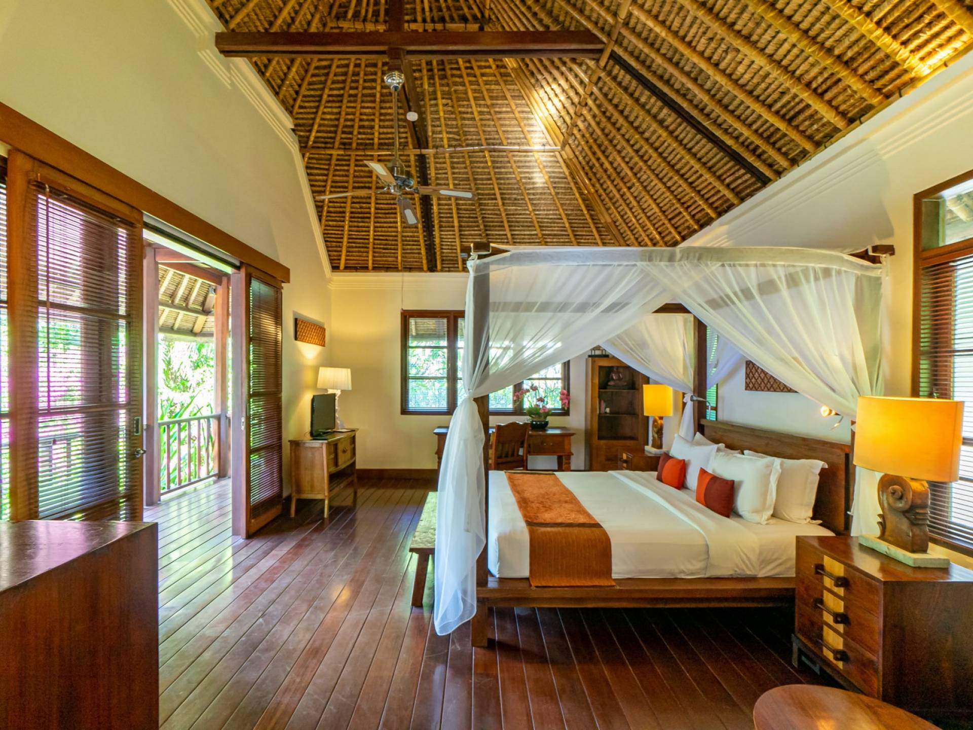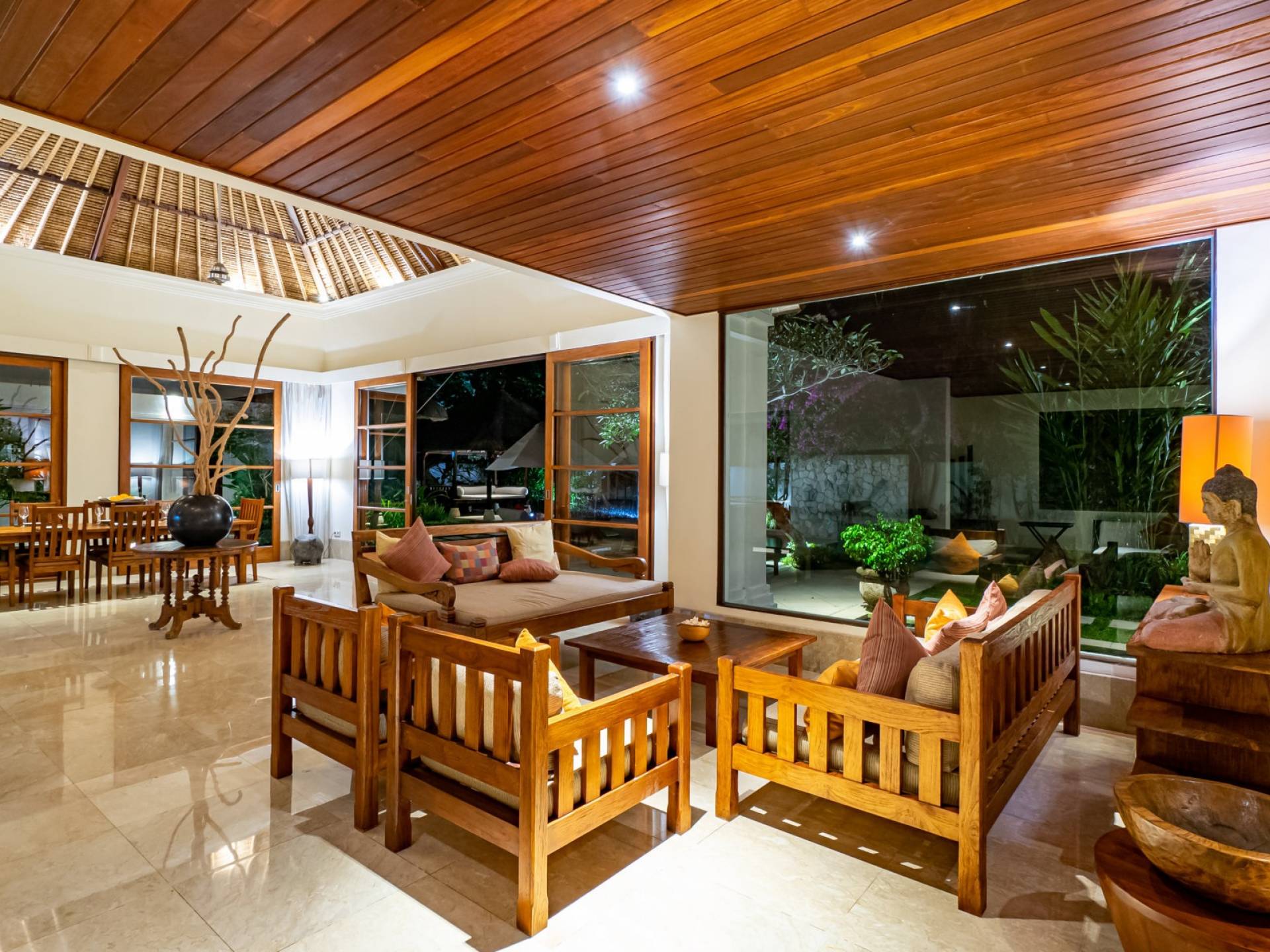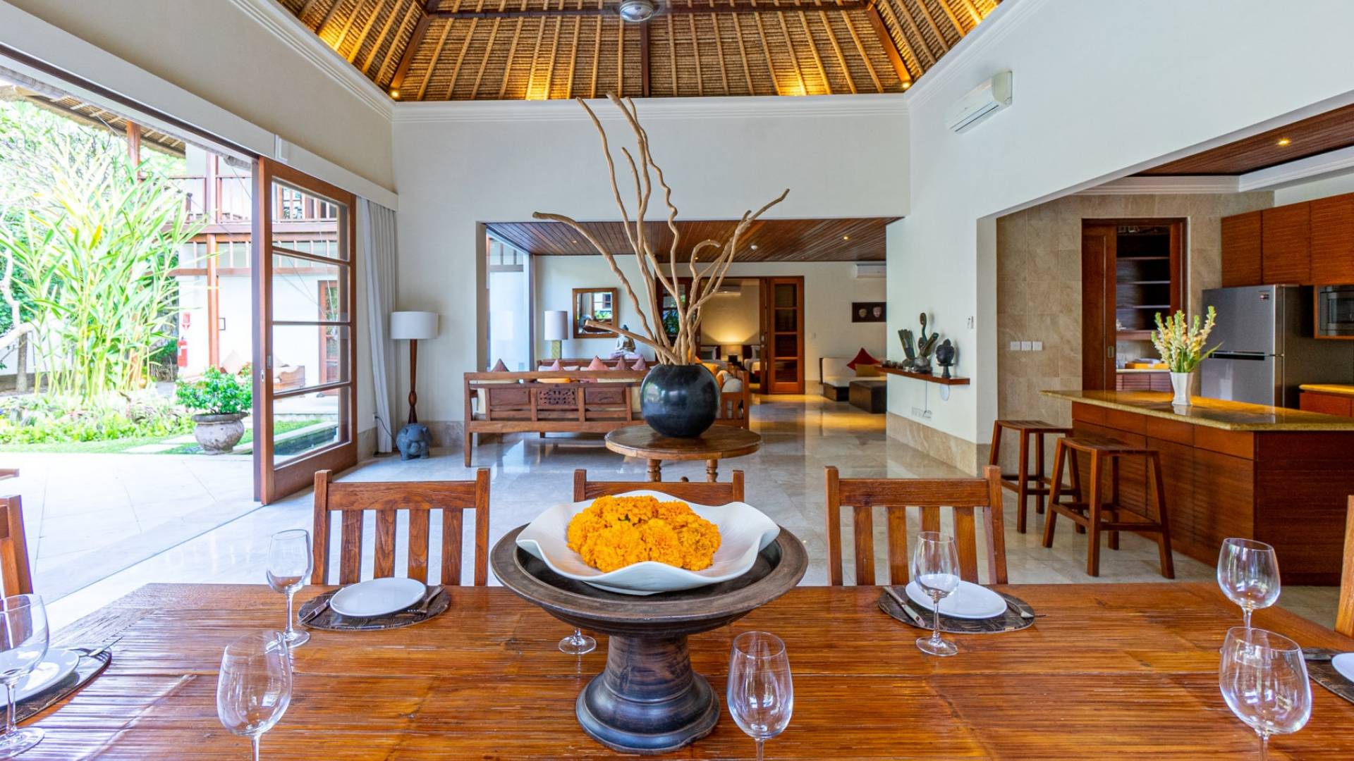 Cada una de las habitaciones tiene camas dobles, TV, aire acondicionado y está ubicada muy cerca para garantizar la máxima privacidad. Todos con baño y grandes armarios de madera, dos de los baños en la planta baja se abren a la zona del jardín exterior y el otro a un jacuzzi exterior. El dormitorio principal en el piso superior personifica la vida de lujo con una habitación separada para jacuzzi y duchas, respectivamente, y un balcón con vista al verde jardín de abajo. La decoración interior combina a la perfección el confort moderno con el toque tradicional balinés con abundante luz natural.