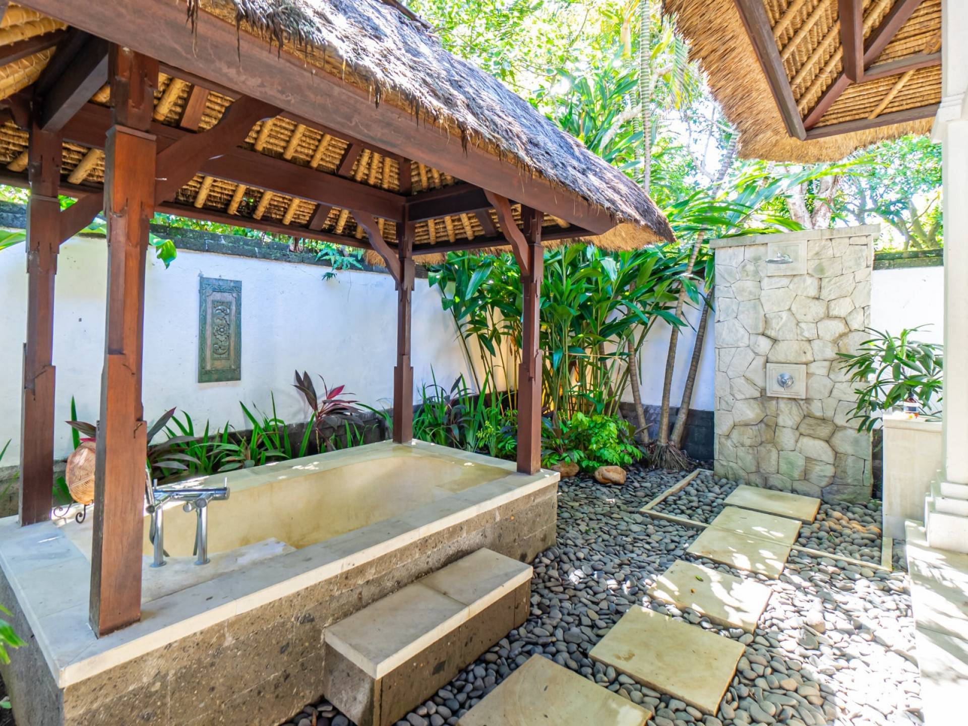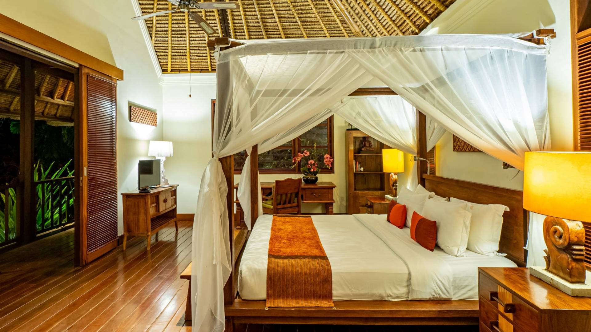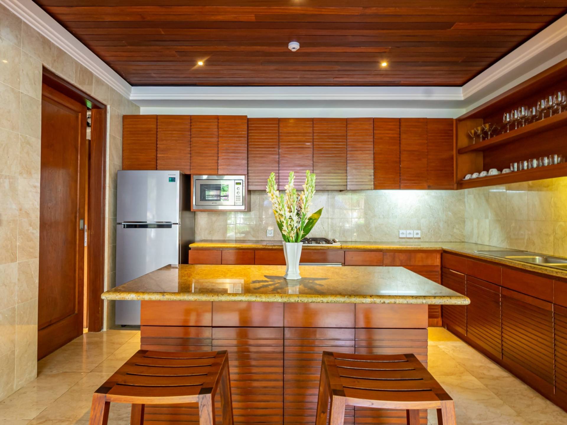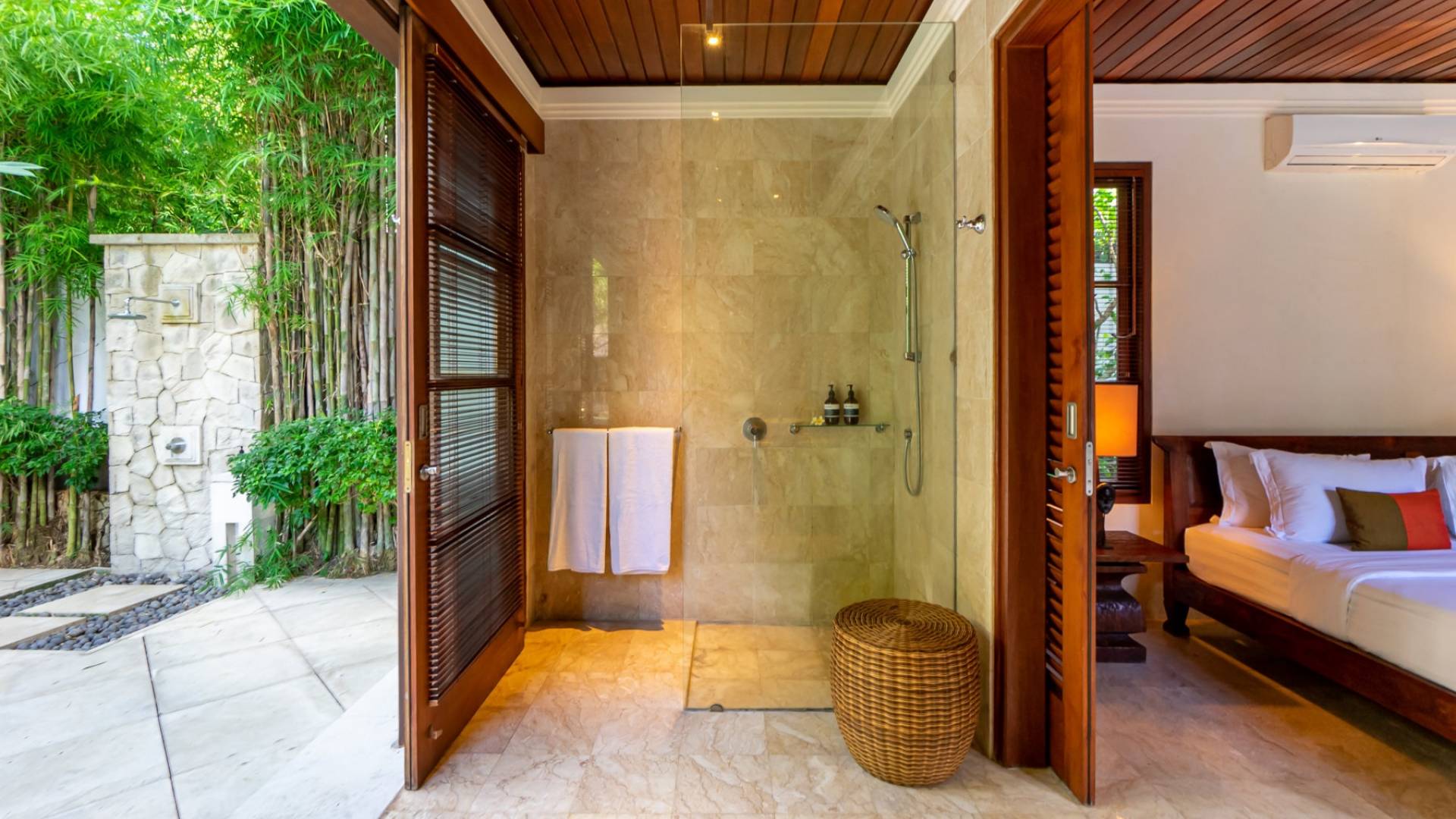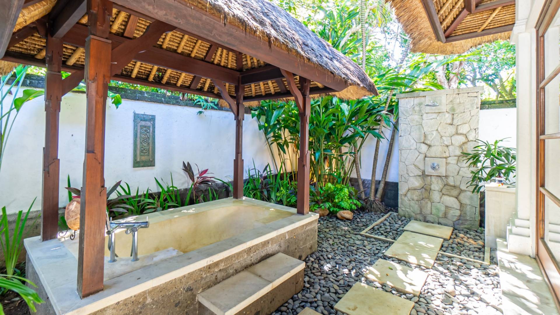 Cada una de las habitaciones tiene camas dobles, TV, aire acondicionado y está ubicada muy cerca para garantizar la máxima privacidad. Todos con baño y grandes armarios de madera, dos de los baños en la planta baja se abren a la zona del jardín exterior y el otro a un jacuzzi exterior. El dormitorio principal en el piso superior personifica la vida de lujo con una habitación separada para jacuzzi y duchas, respectivamente, y un balcón con vista al verde jardín de abajo. La decoración interior combina a la perfección el confort moderno con el toque tradicional balinés con abundante luz natural.