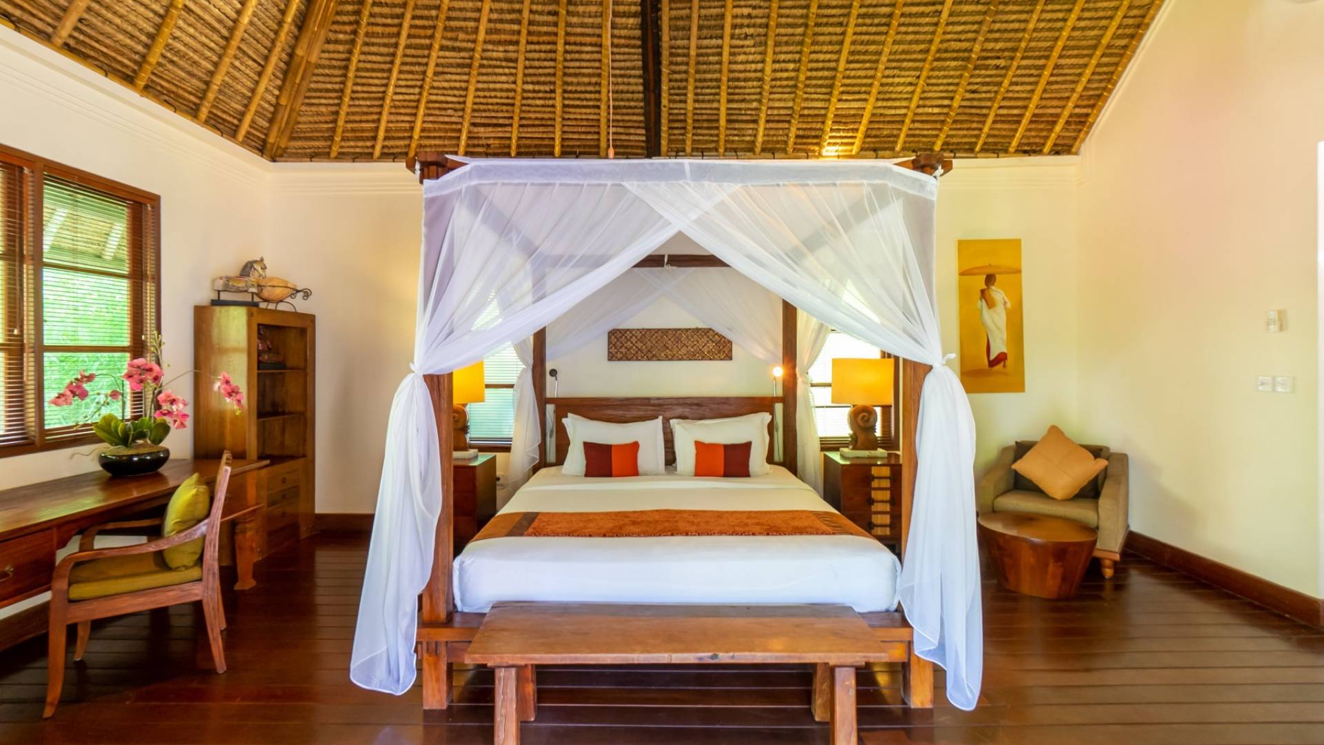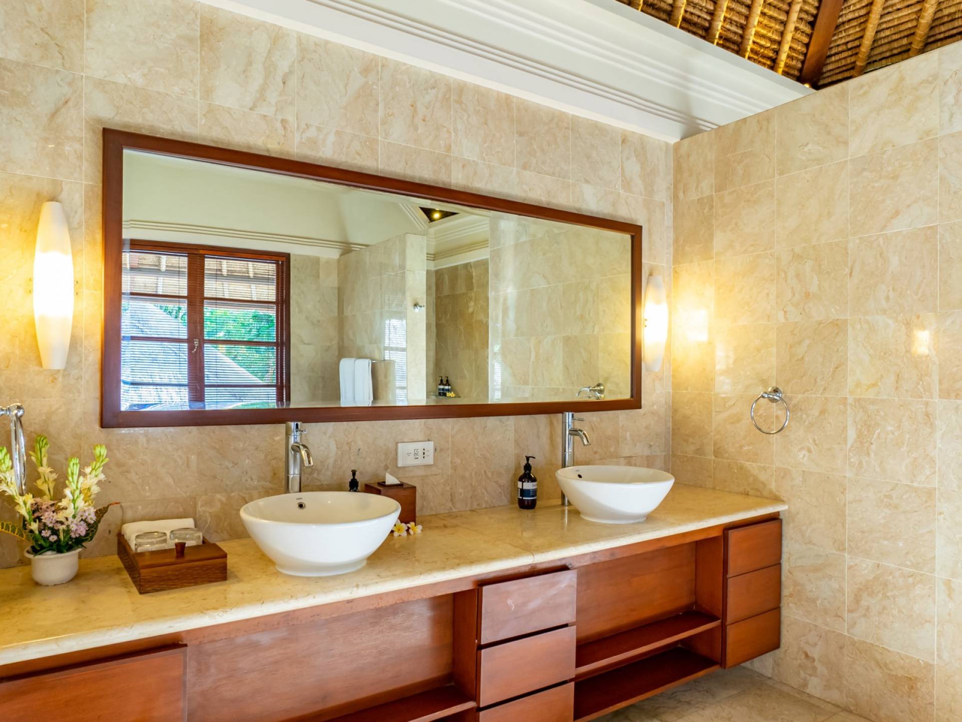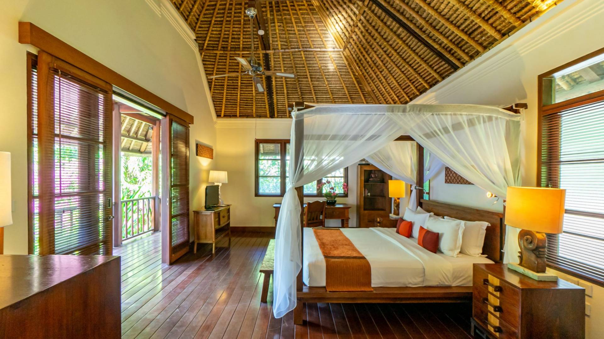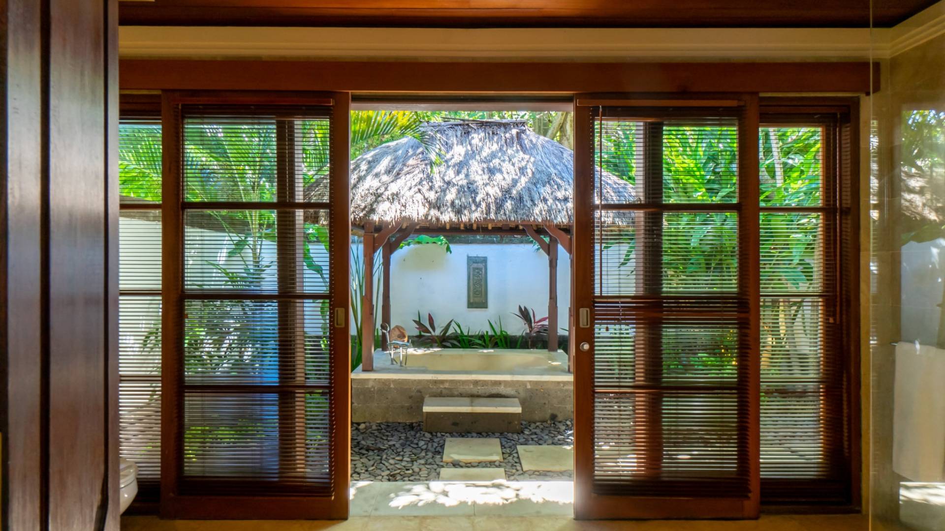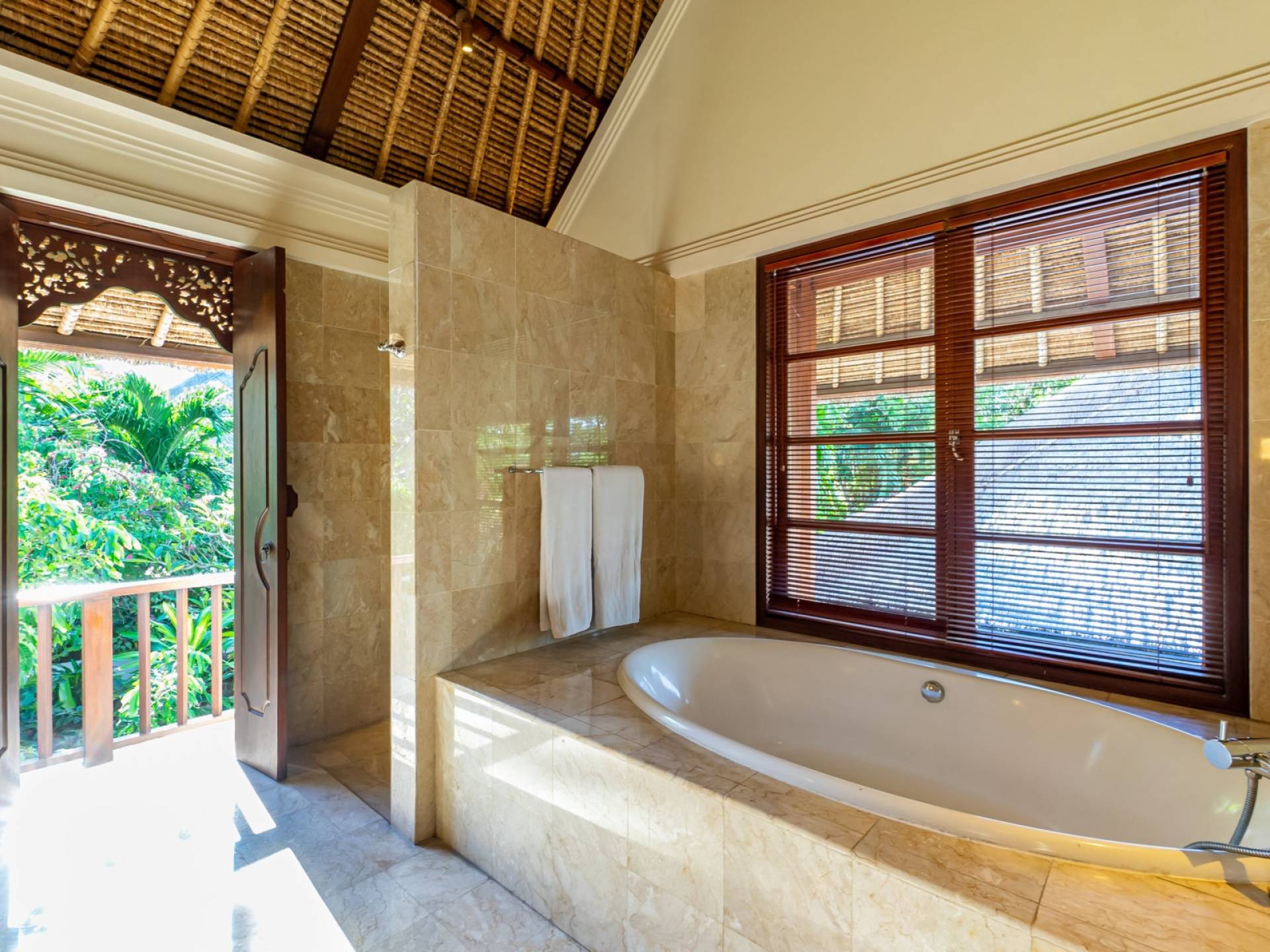 Cada una de las habitaciones tiene camas dobles, TV, aire acondicionado y está ubicada muy cerca para garantizar la máxima privacidad. Todos con baño y grandes armarios de madera, dos de los baños en la planta baja se abren a la zona del jardín exterior y el otro a un jacuzzi exterior. El dormitorio principal en el piso superior personifica la vida de lujo con una habitación separada para jacuzzi y duchas, respectivamente, y un balcón con vista al verde jardín de abajo. La decoración interior combina a la perfección el confort moderno con el toque tradicional balinés con abundante luz natural.
