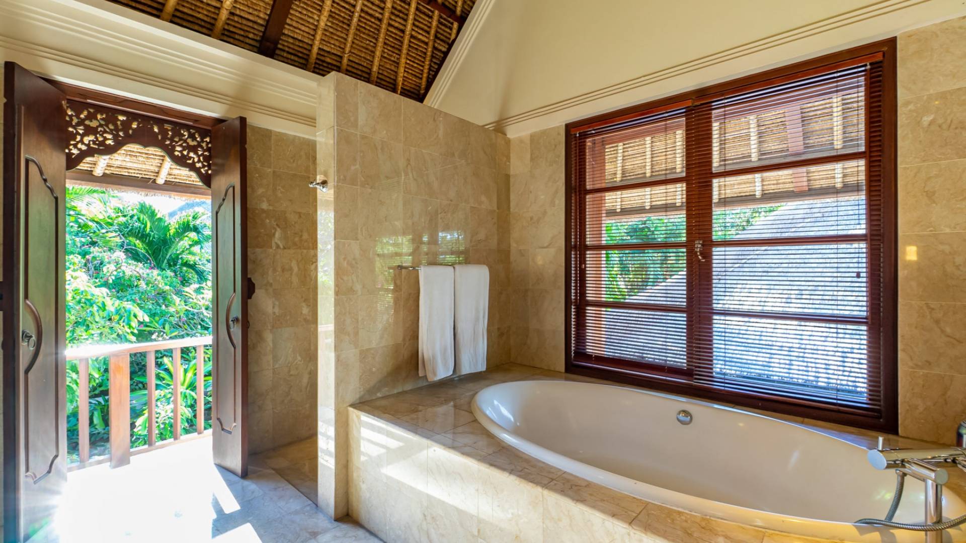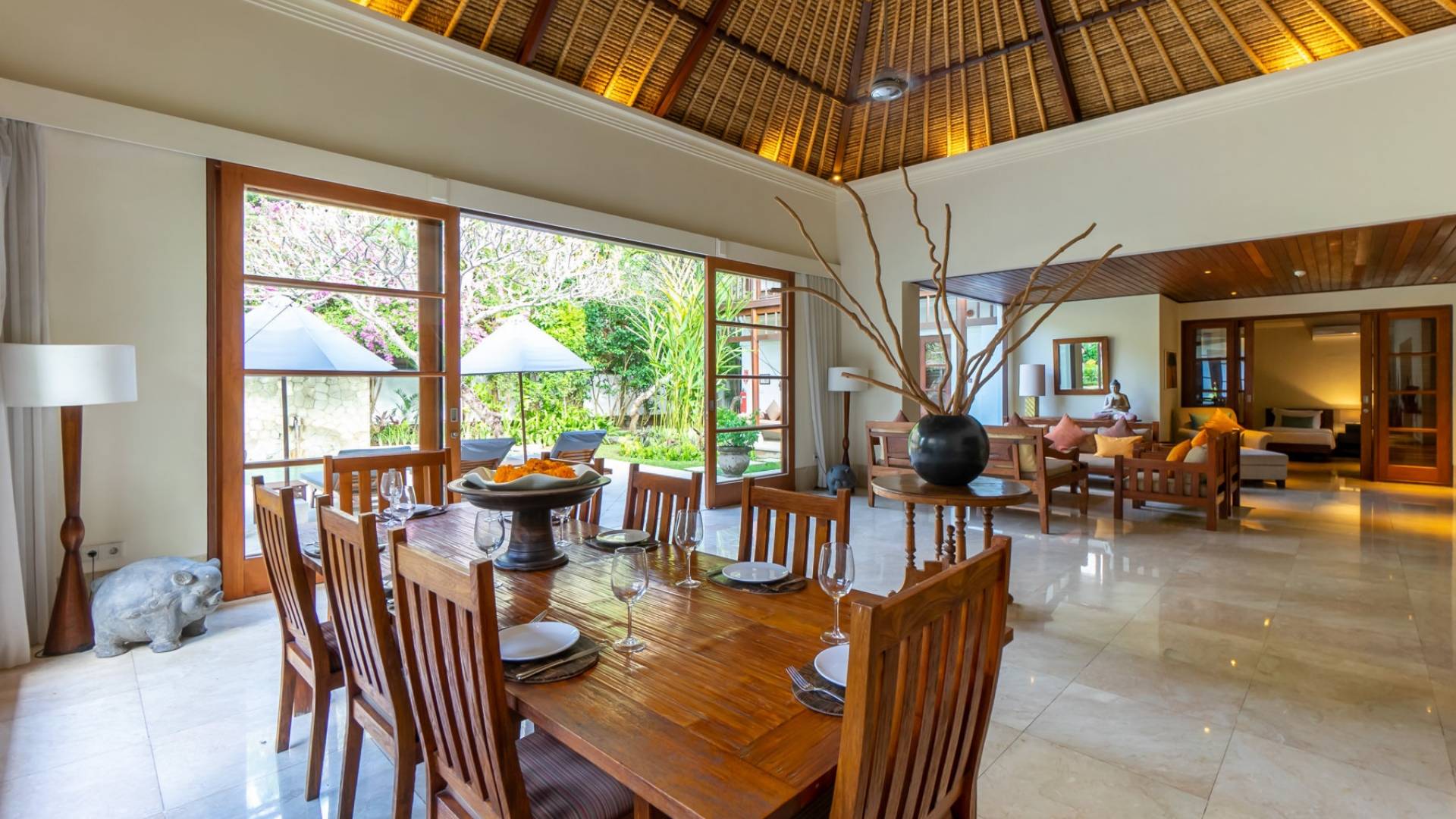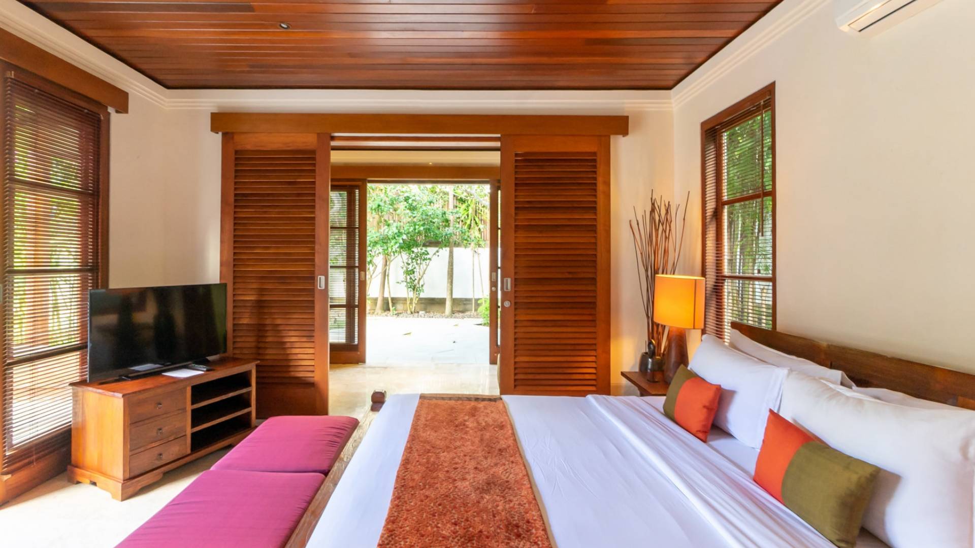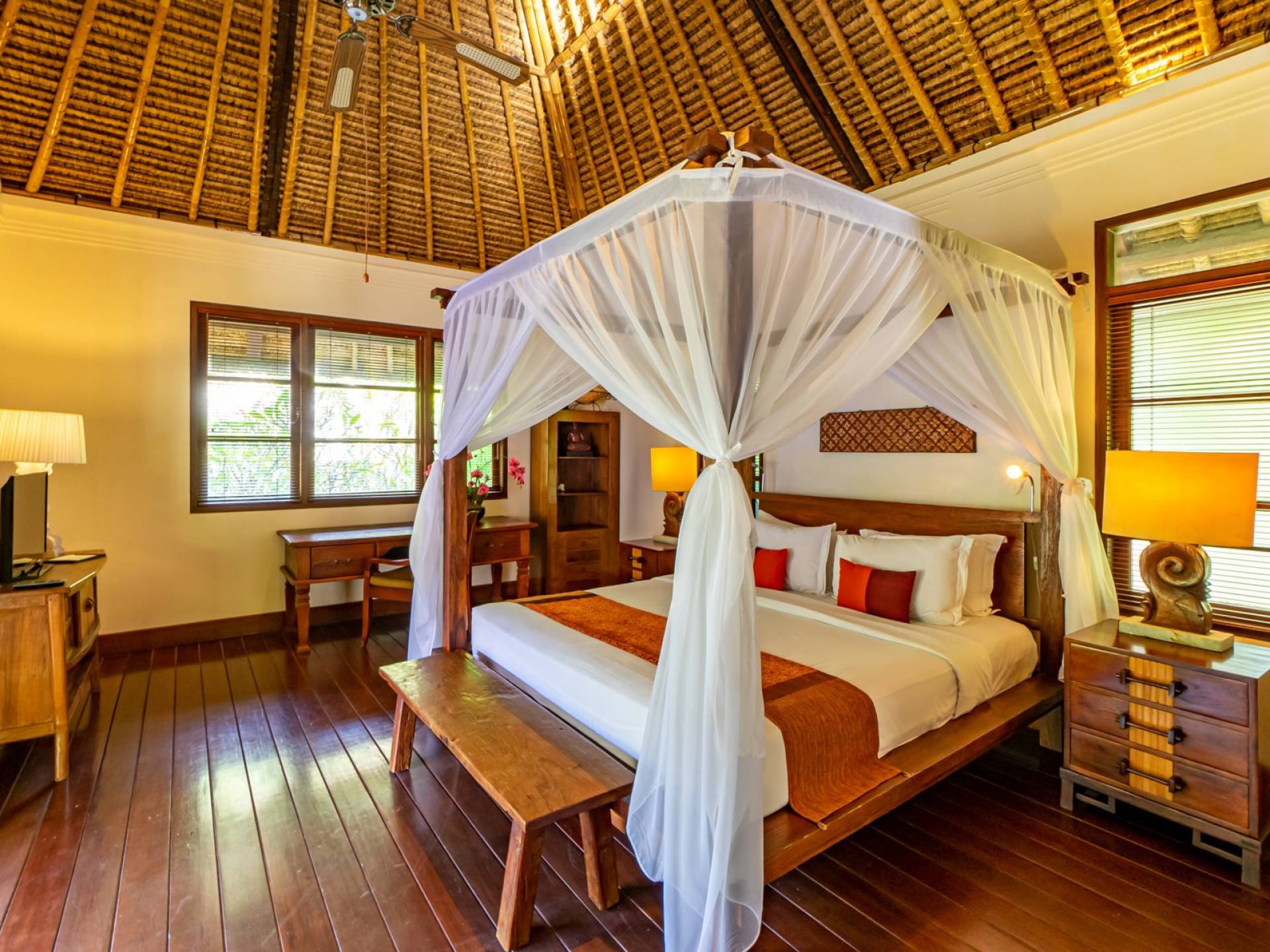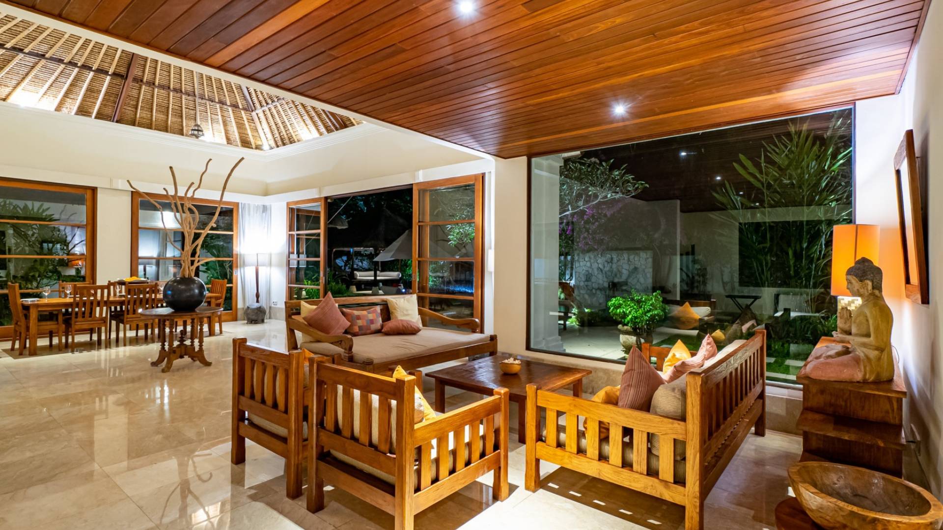 Cada una de las habitaciones tiene camas dobles, TV, aire acondicionado y está ubicada muy cerca para garantizar la máxima privacidad. Todos con baño y grandes armarios de madera, dos de los baños en la planta baja se abren a la zona del jardín exterior y el otro a un jacuzzi exterior. El dormitorio principal en el piso superior personifica la vida de lujo con una habitación separada para jacuzzi y duchas, respectivamente, y un balcón con vista al verde jardín de abajo. La decoración interior combina a la perfección el confort moderno con el toque tradicional balinés con abundante luz natural.