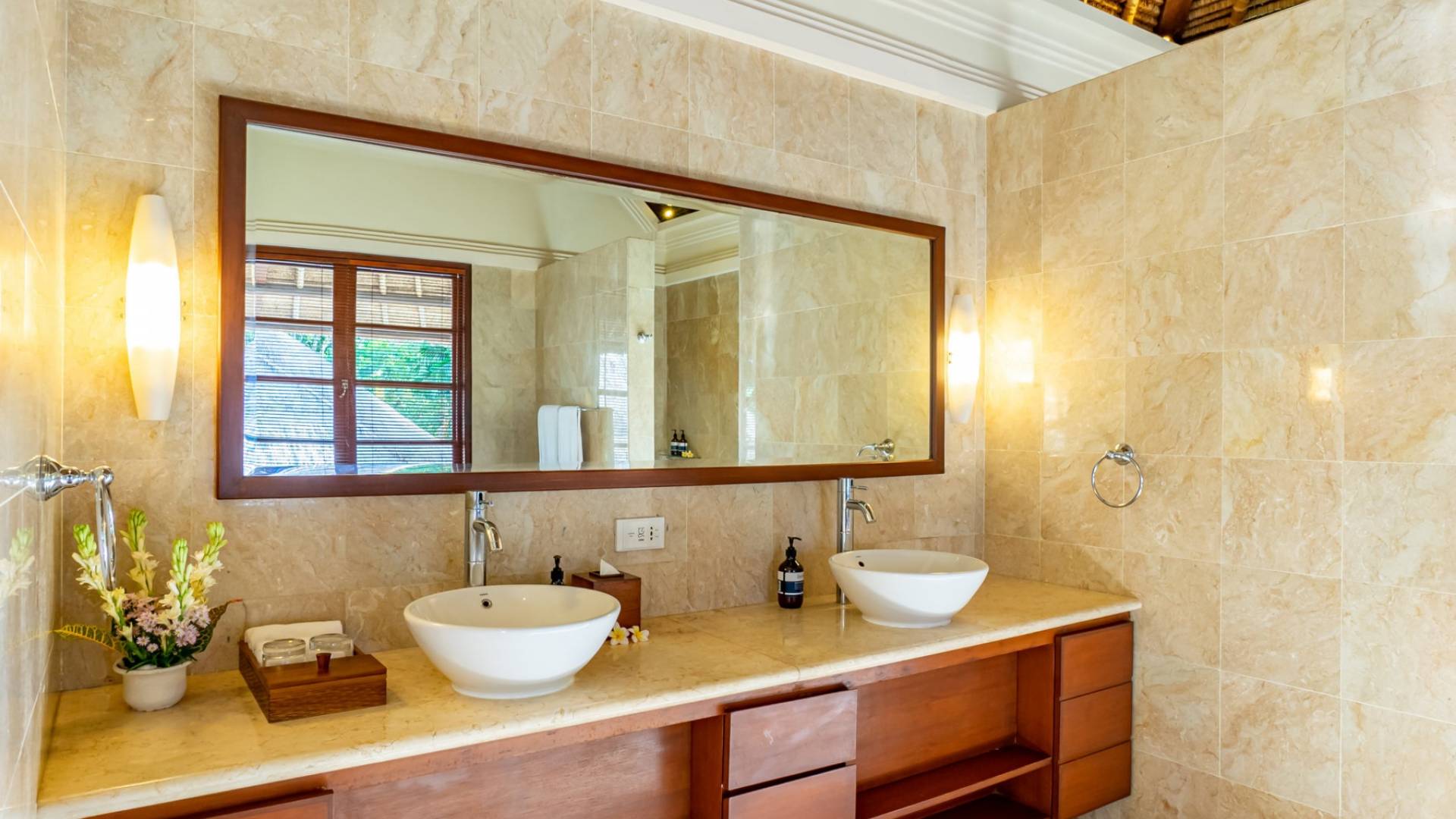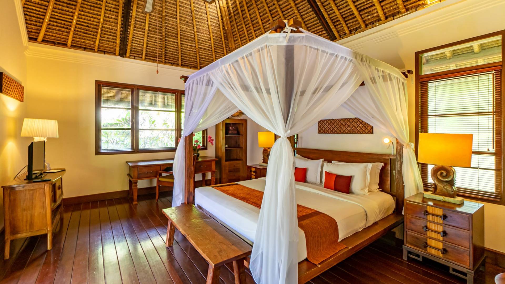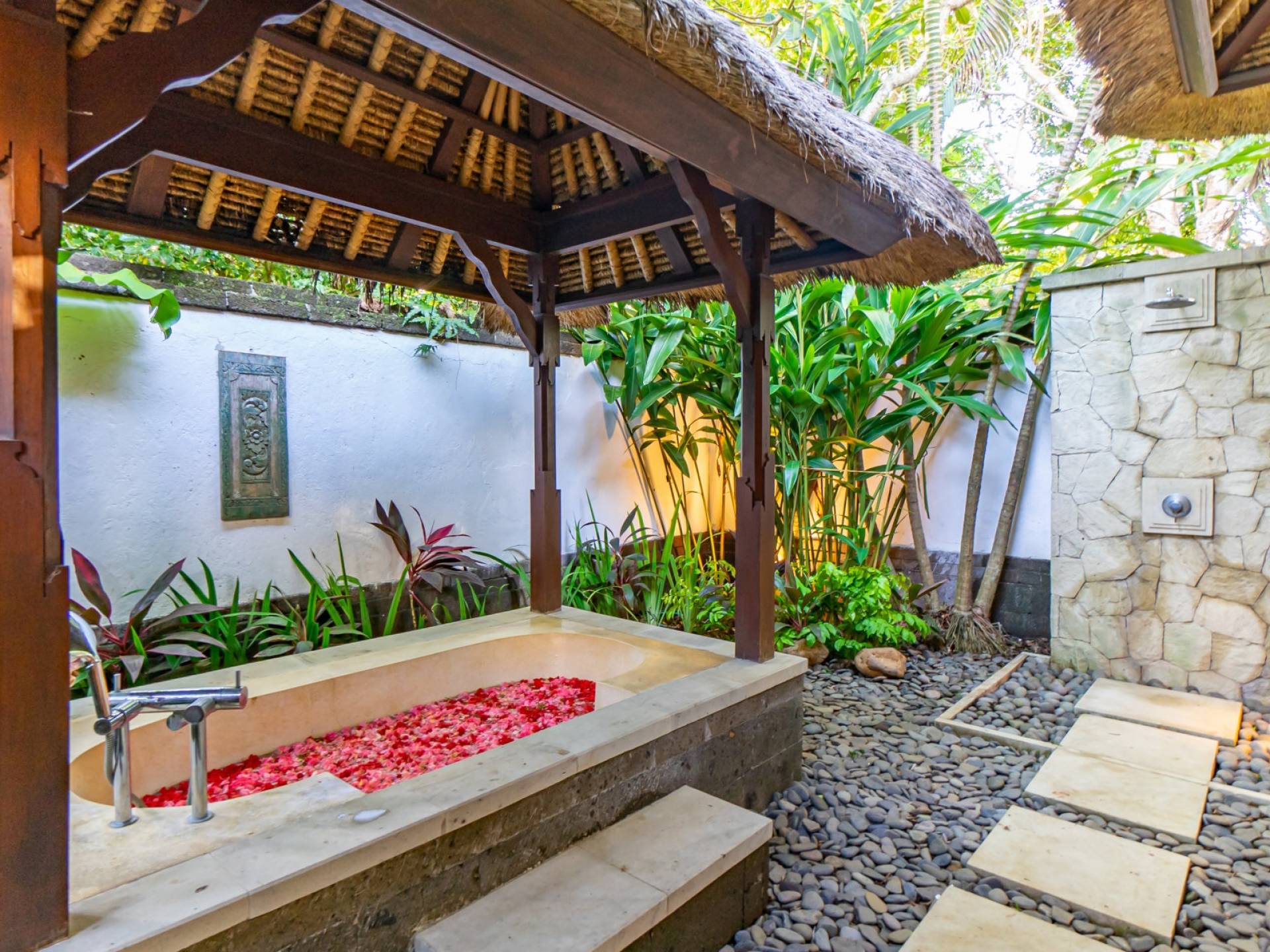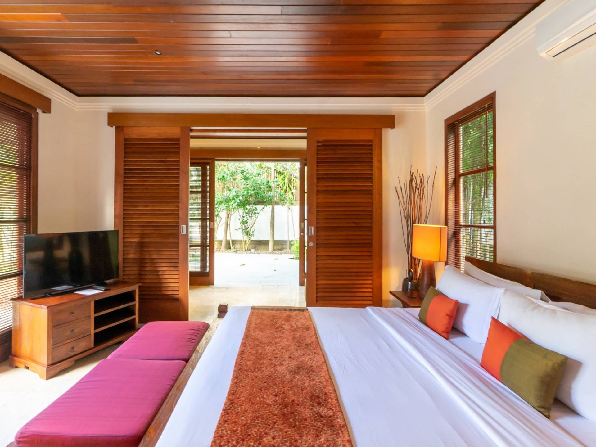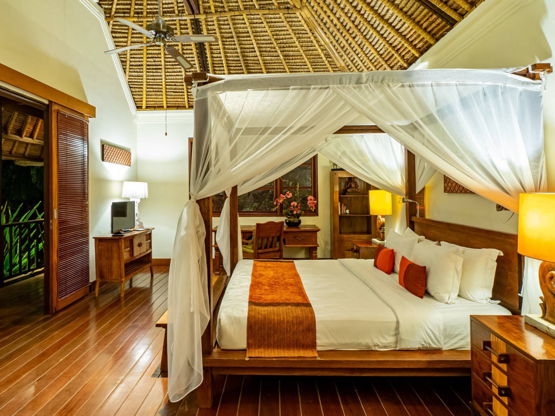 Cada una de las habitaciones tiene camas dobles, TV, aire acondicionado y está ubicada muy cerca para garantizar la máxima privacidad. Todos con baño y grandes armarios de madera, dos de los baños en la planta baja se abren a la zona del jardín exterior y el otro a un jacuzzi exterior. El dormitorio principal en el piso superior personifica la vida de lujo con una habitación separada para jacuzzi y duchas, respectivamente, y un balcón con vista al verde jardín de abajo. La decoración interior combina a la perfección el confort moderno con el toque tradicional balinés con abundante luz natural.