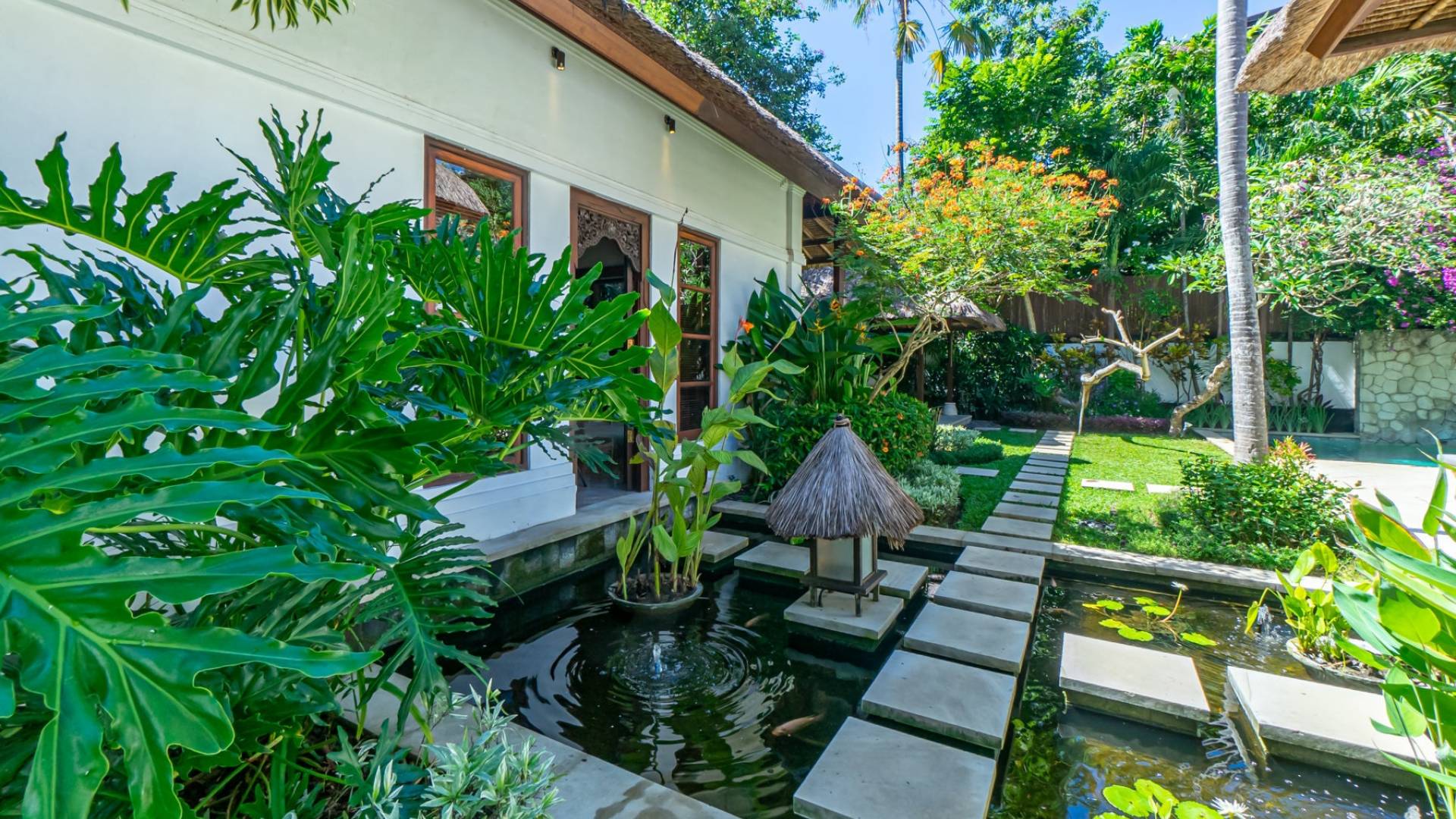 Exuberante. Tranquilo. Atractivo. Estas tres palabras me vienen a la mente al primer avistamiento de la zona ajardinada de Villa Ohm. La pieza central es la atractiva piscina al aire libre envuelta por el espeso follaje de Bougainville, rodeada de vegetación de islas tropicales de todo tipo. Hay dos estanques de koi en medio de la serenidad natural que equilibra el Feng Shui de un jardín perfecto. En el rincón más alejado del jardín había un mirador bajo un dosel de árboles densos, perfecto para pasar el día holgazaneando con su libro favorito y su bebida favorita. También hay disponible una ducha al aire libre para mayor comodidad.