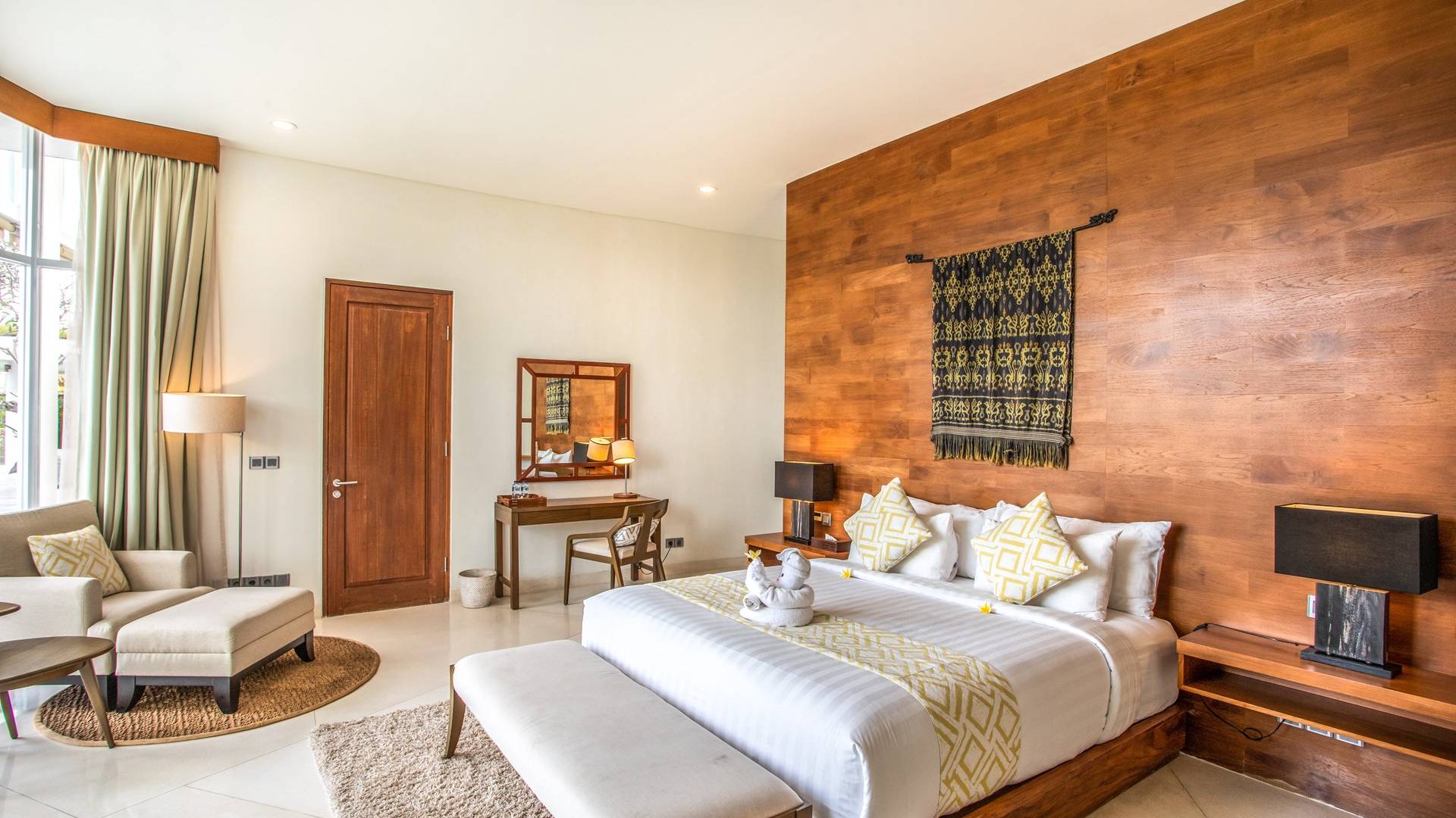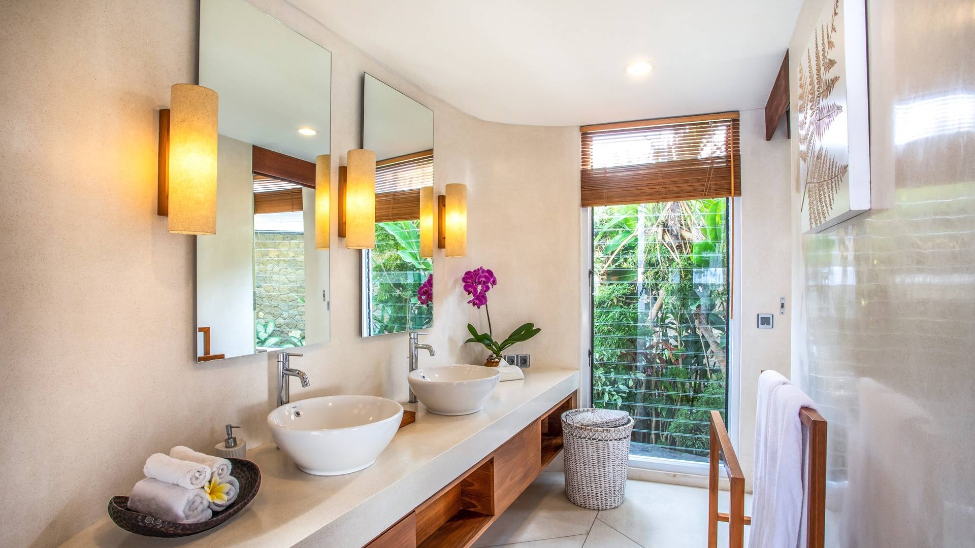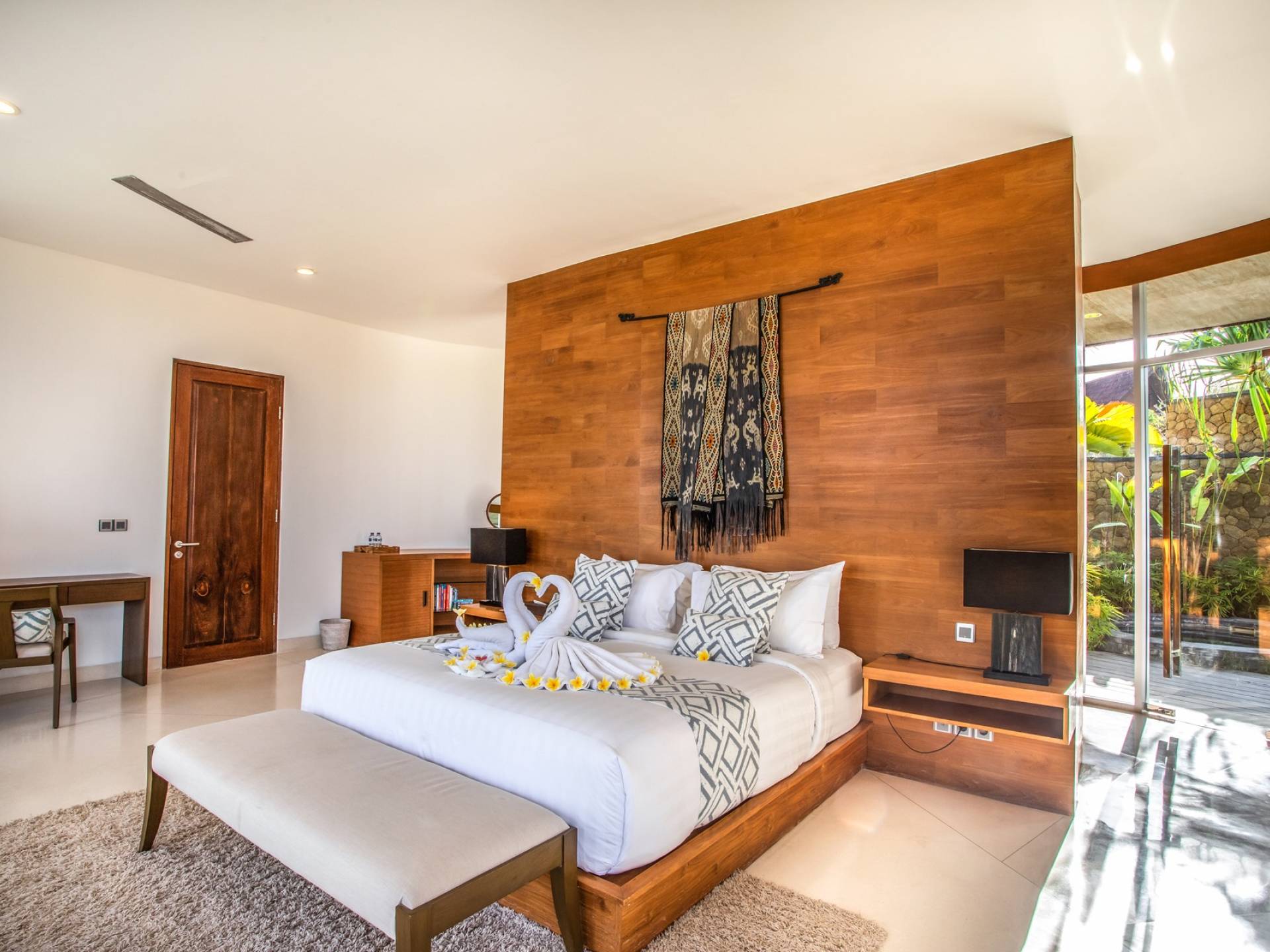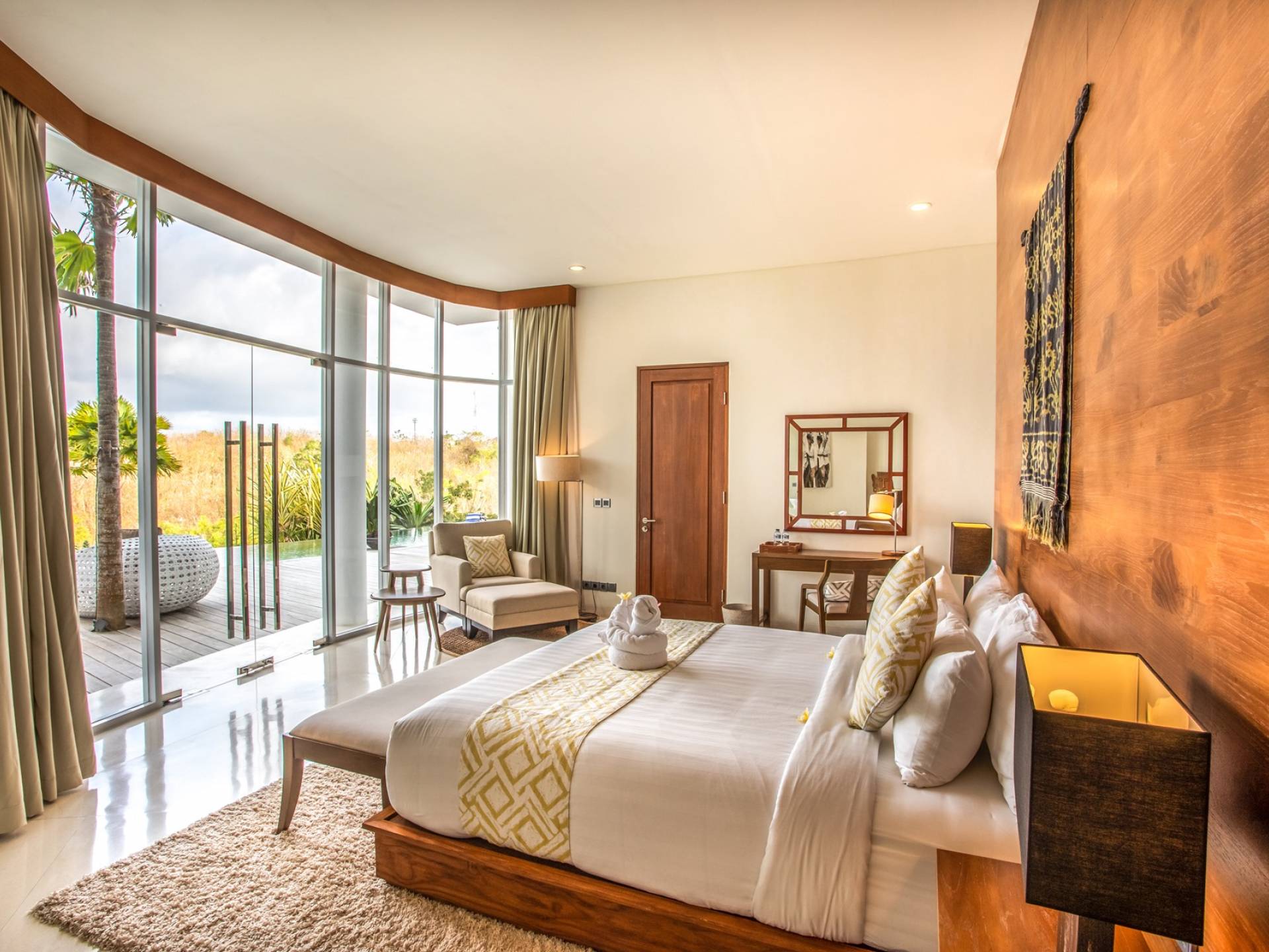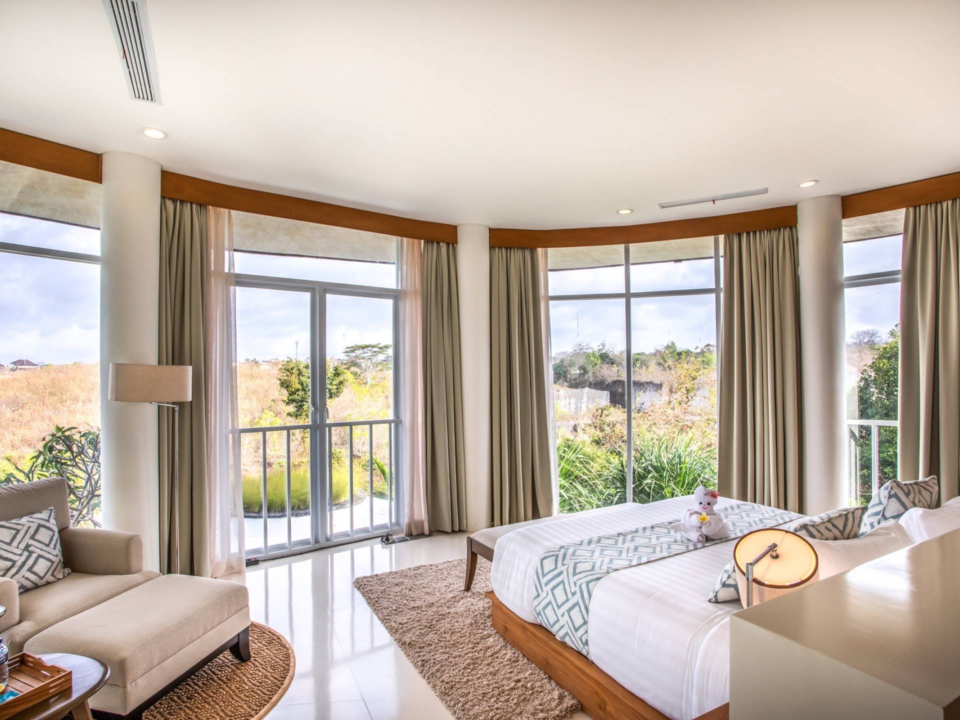 2 dormitorios se encuentran en el piso superior y 1 dormitorio en el primer piso. Todas las habitaciones cuentan con una cama tamaño king grande y cómoda, caja de seguridad, vestidor, un impresionante baño en suite y una ducha separada. En toda la villa, disfrute de la vida residencial en su máxima expresión con características y muebles modernos junto con el sentido del estilo balinés. Dayu Mirah Resort cree en hacer que el lujo sea simple y gratificante al crear experiencias únicas para los huéspedes en un entorno y diseño alucinantes. Ubicado en el borde de un acantilado con una hermosa vista al jardín, Dayu Mirah Resort tiene factores asombrosos escritos por todas partes.