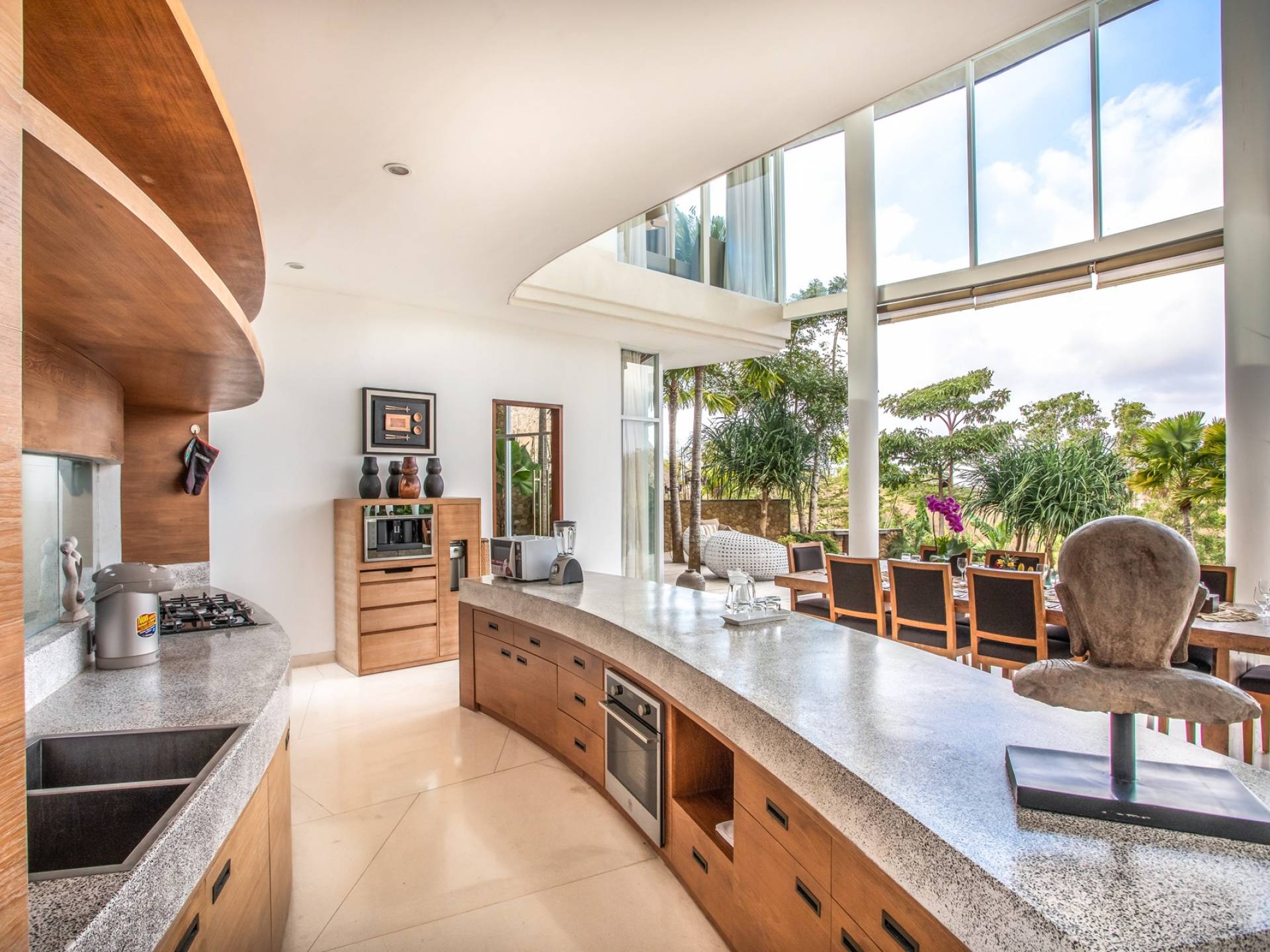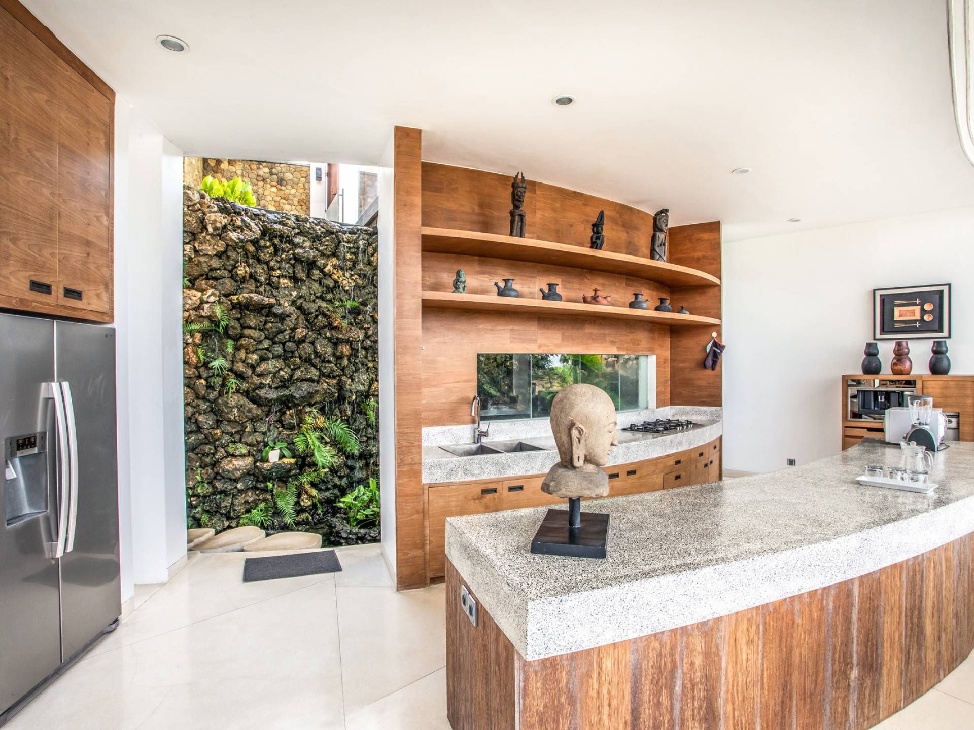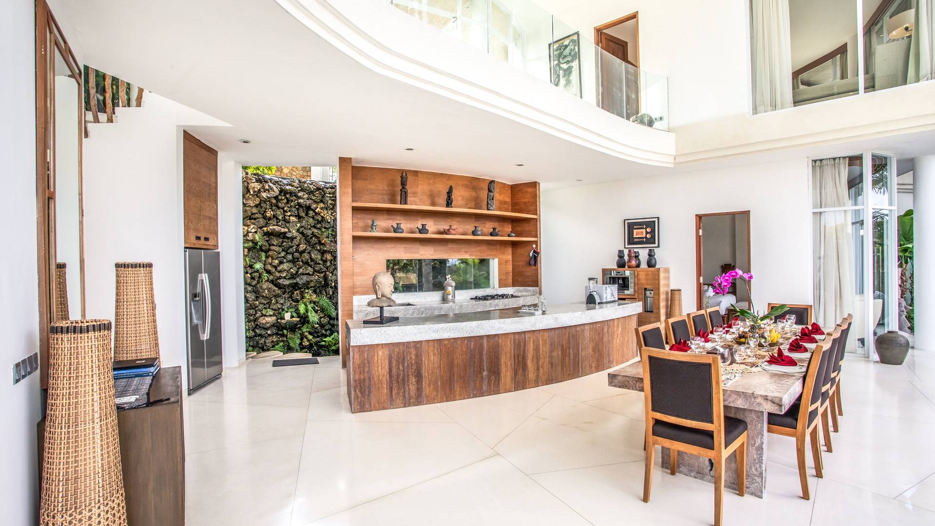 Villa Pancaloka cuenta con una villa con piscina de tres dormitorios perfectamente diseñada para familias. La amplia sala de estar y la zona de cocina abierta de la villa en el primer piso tienen vistas a los jardines y a la espectacular piscina infinita. La sala de estar cuenta con amplios y cómodos sofás, elementos de interior y equipo de karaoke. La terraza abierta le invita a relajarse y disfrutar de su noche bajo las estrellas. La cocina moderna totalmente equipada tiene un refrigerador grande, congelador y cafetera.