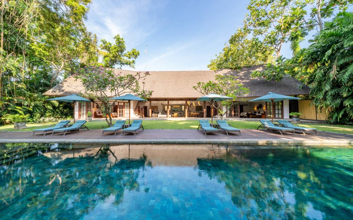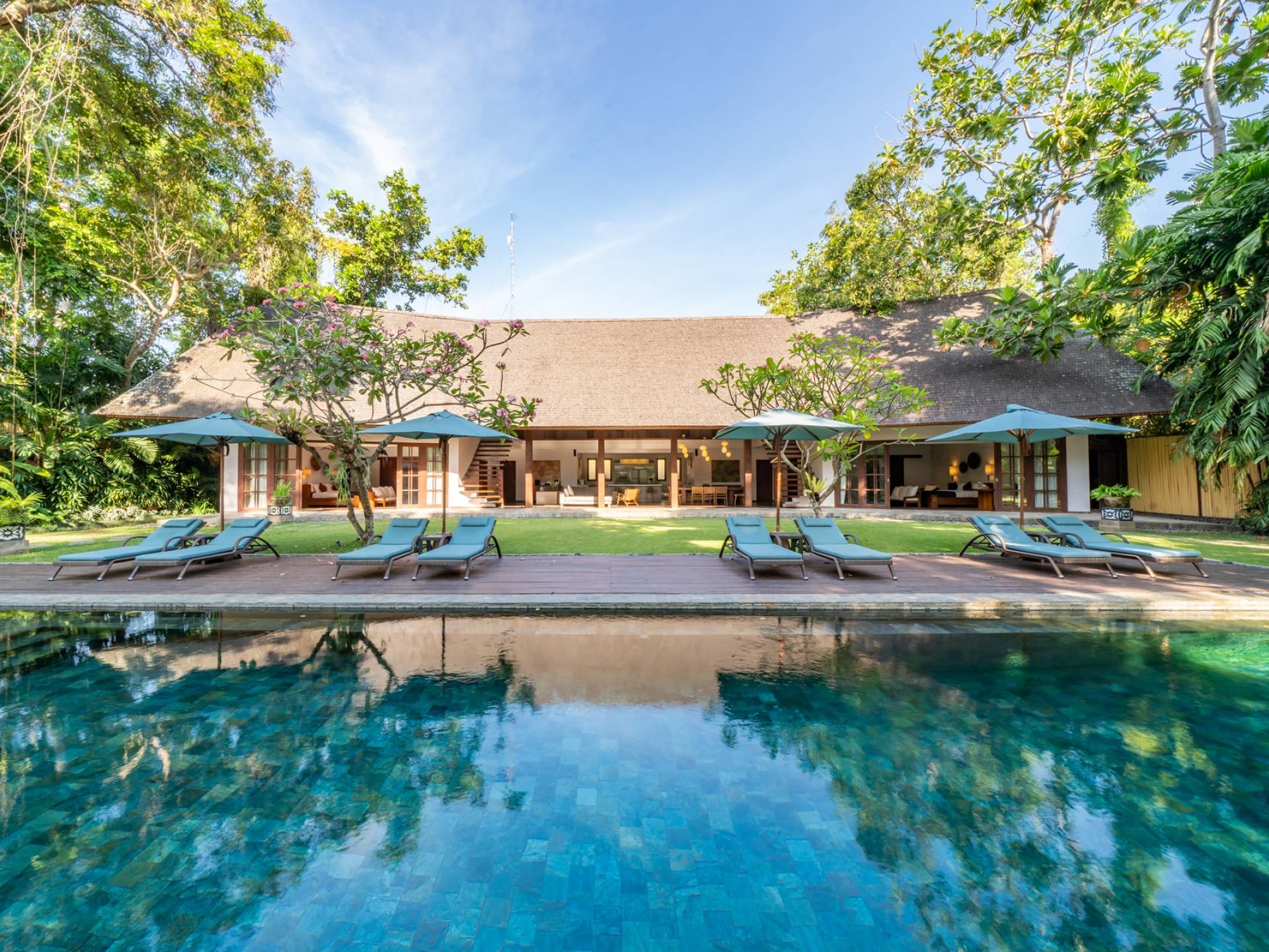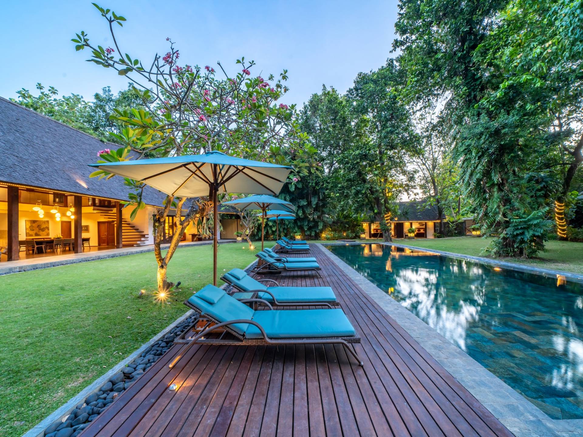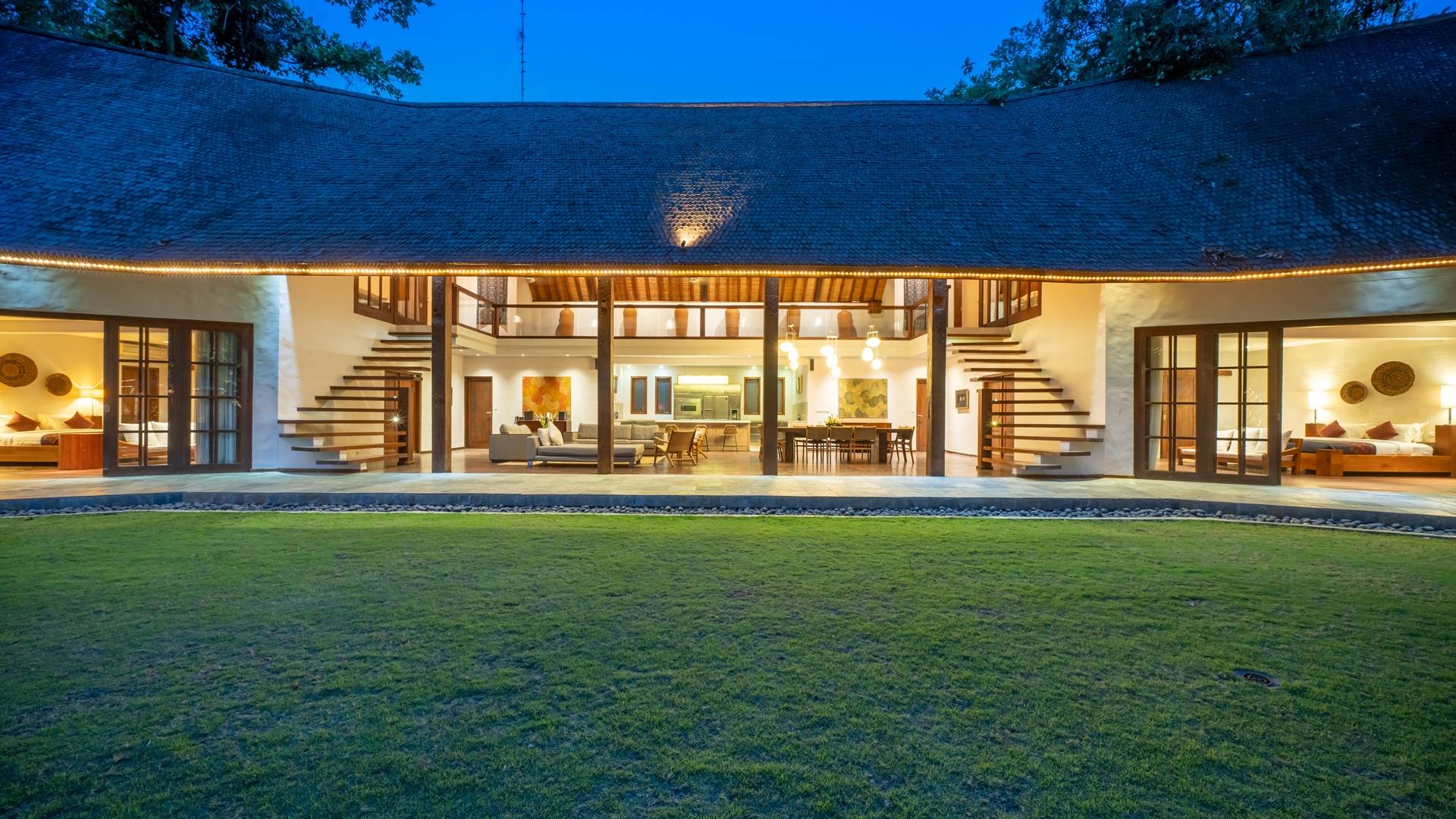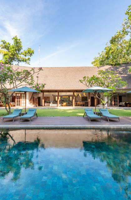 Escondida entre los arrozales de Kerobokan, Villa Tirtadari es una mansión privada con todo el personal que se extiende sobre un terreno de 2800 metros cuadrados. Con 7 amplios dormitorios en los pabellones con temática de Joglo, esta casa isleña tiene capacidad para grandes grupos de 14. El entorno se caracteriza por sus paneles de madera con tintes oscuros, escaleras flotantes, elegante diseño contemporáneo y al aire libre. Los espacios iluminados con luz dorada supervisan la reluciente piscina privada de 25 metros y el césped recién cuidado.