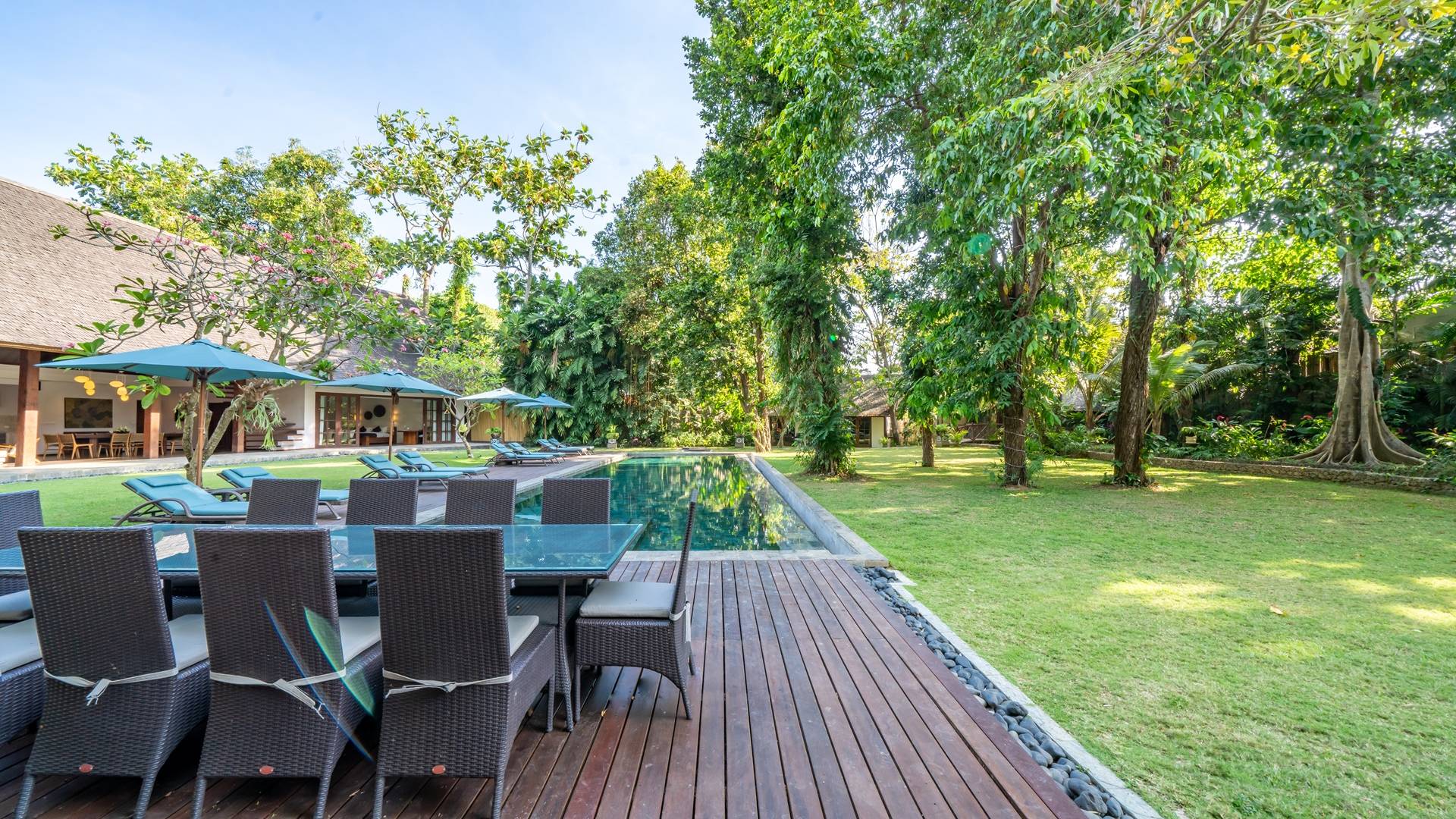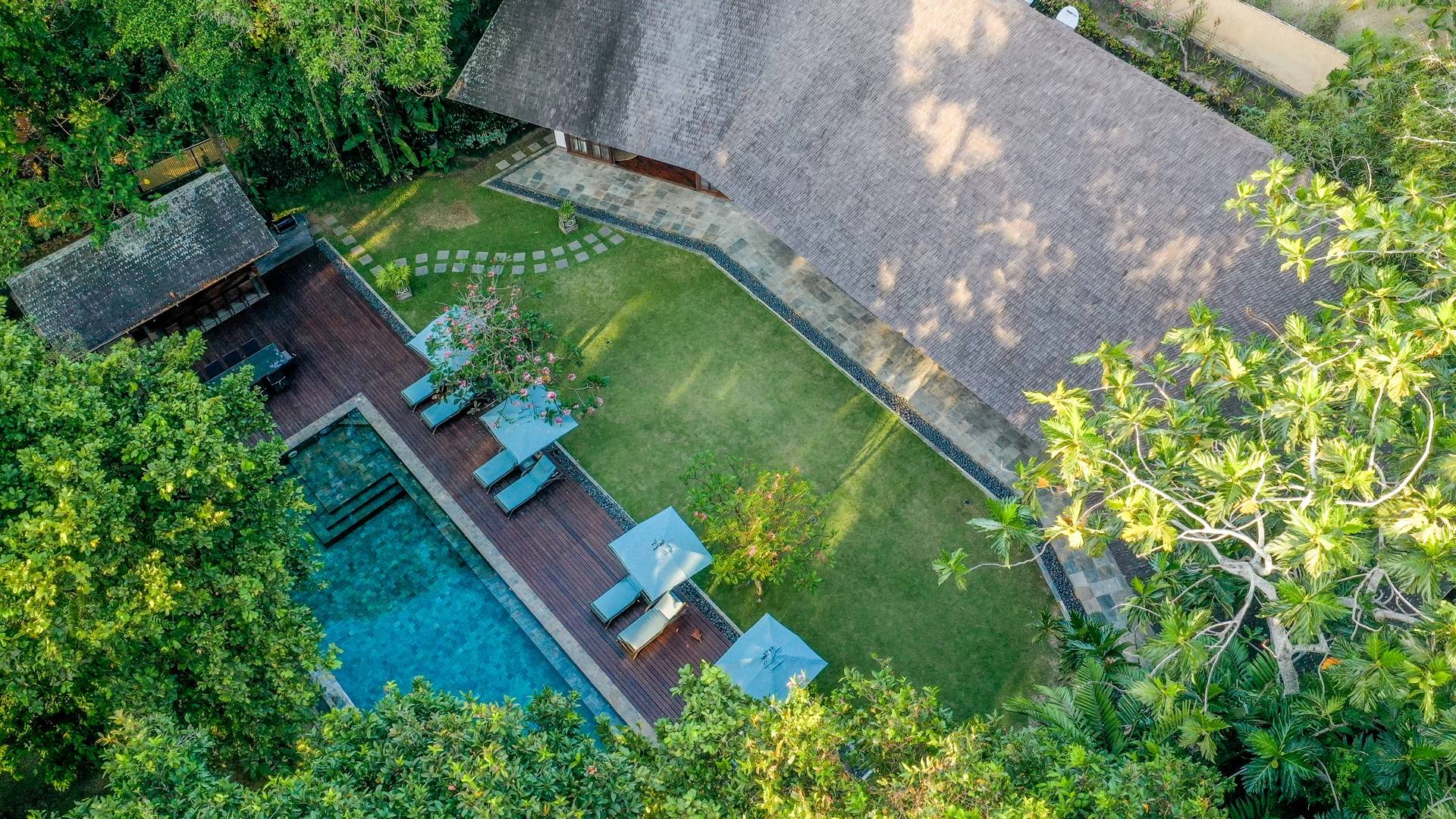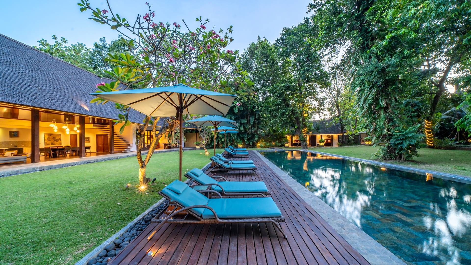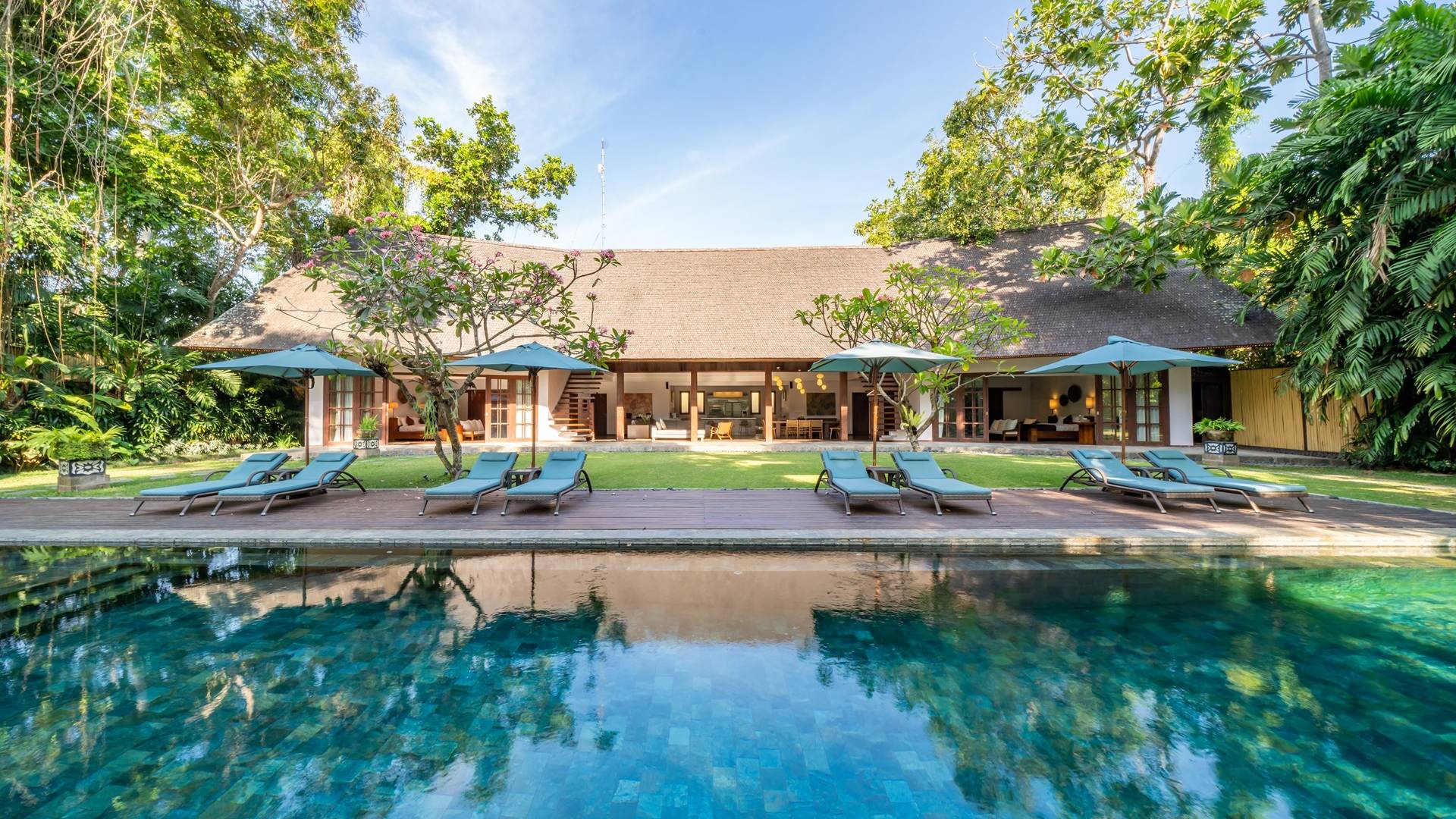 Escondida entre los arrozales de Kerobokan, Villa Tirtadari es una mansión privada con todo el personal que se extiende sobre un terreno de 2800 metros cuadrados. Con 7 amplios dormitorios en los pabellones con temática de Joglo, esta casa isleña tiene capacidad para grandes grupos de 14. El entorno se caracteriza por sus paneles de madera con tintes oscuros, escaleras flotantes, elegante diseño contemporáneo y al aire libre. Los espacios iluminados con luz dorada supervisan la reluciente piscina privada de 25 metros y el césped recién cuidado.