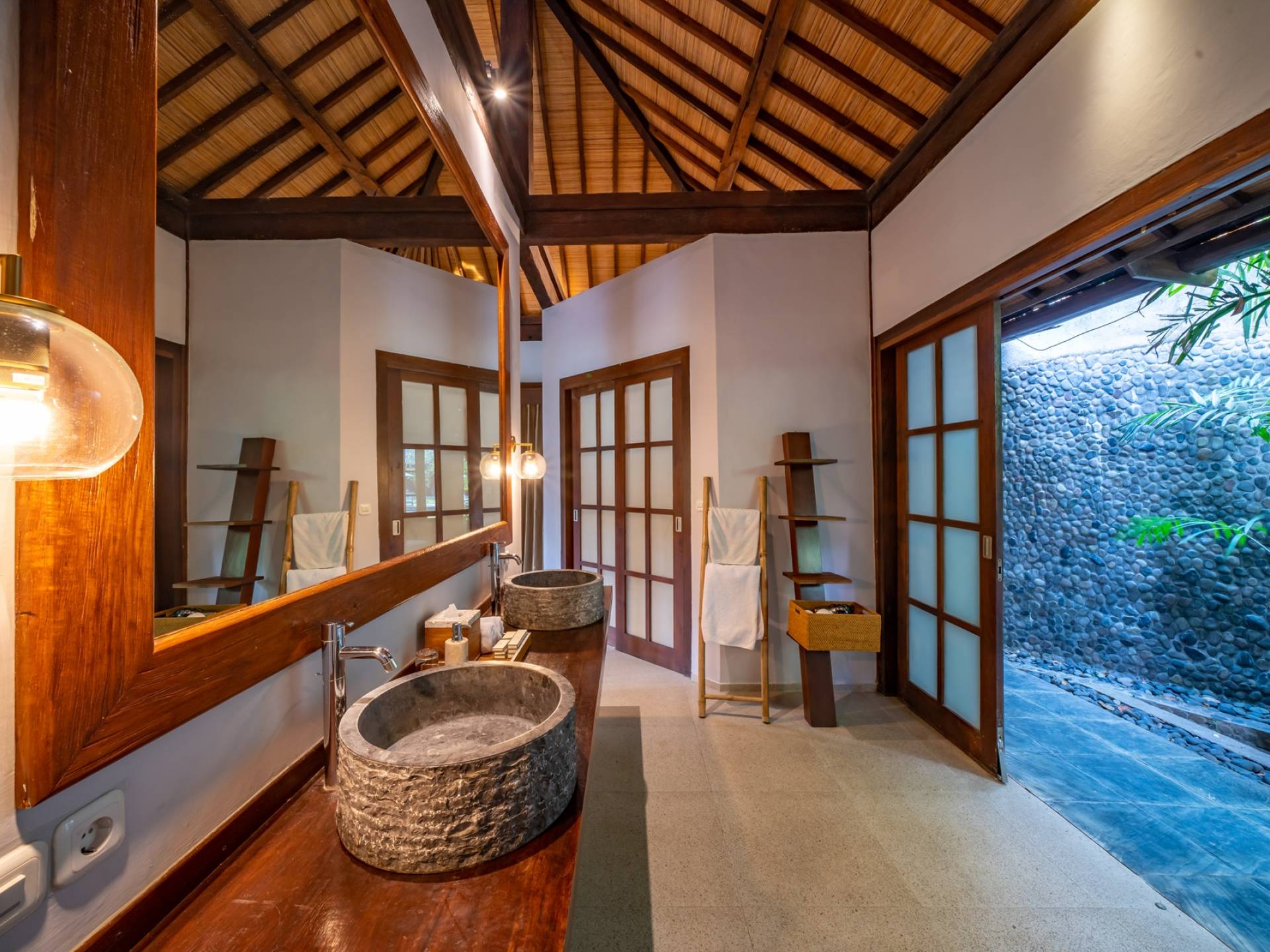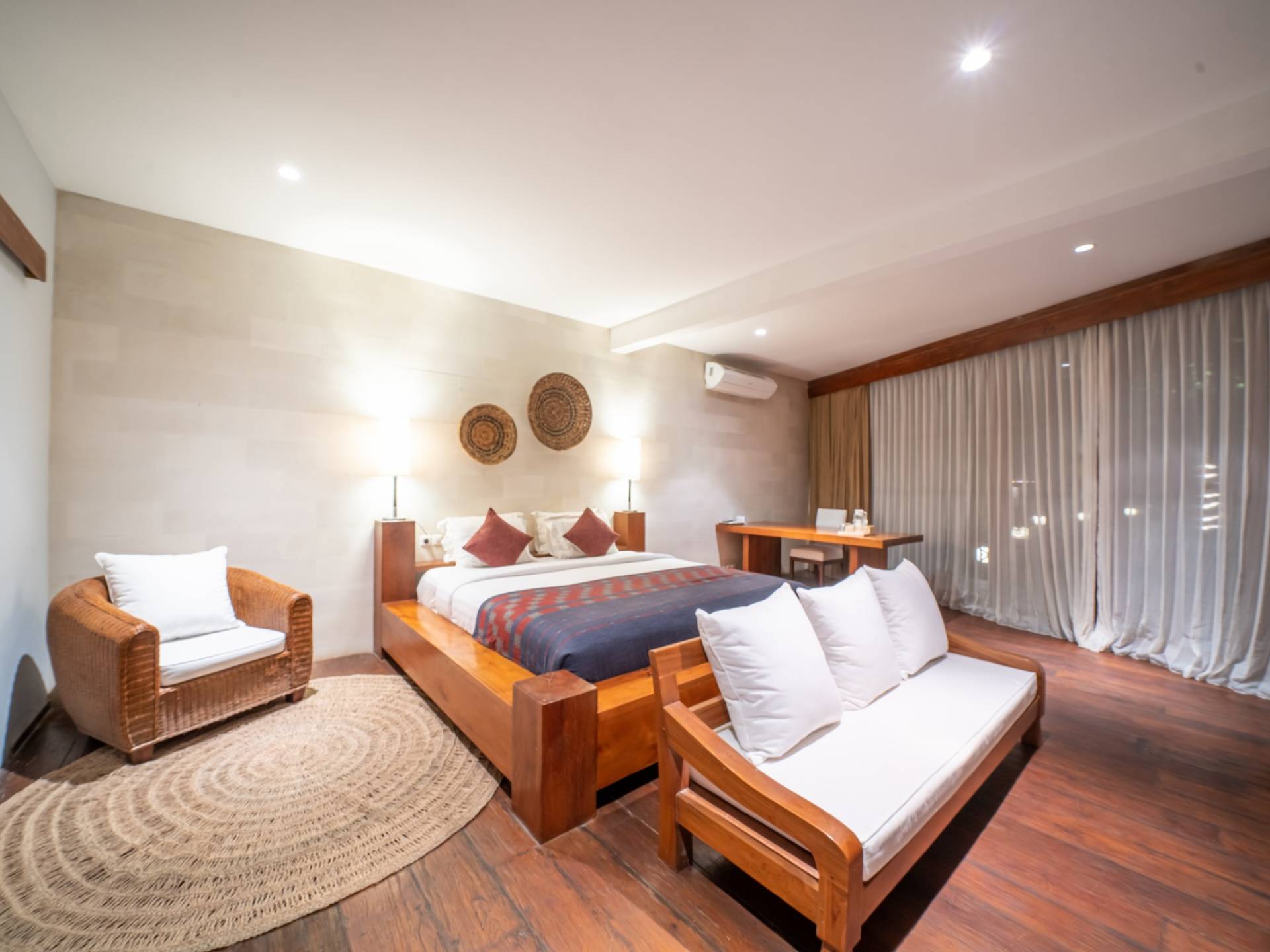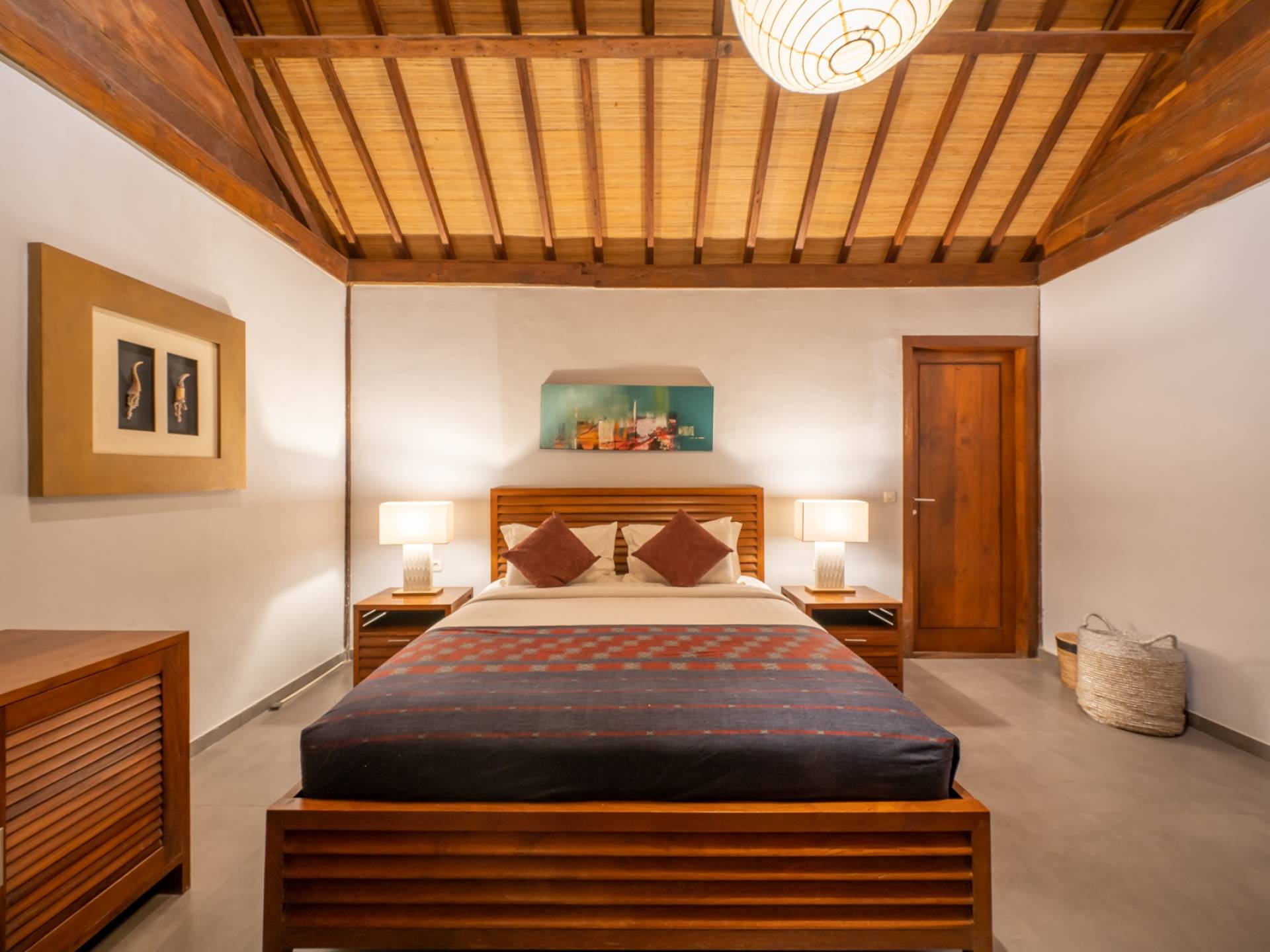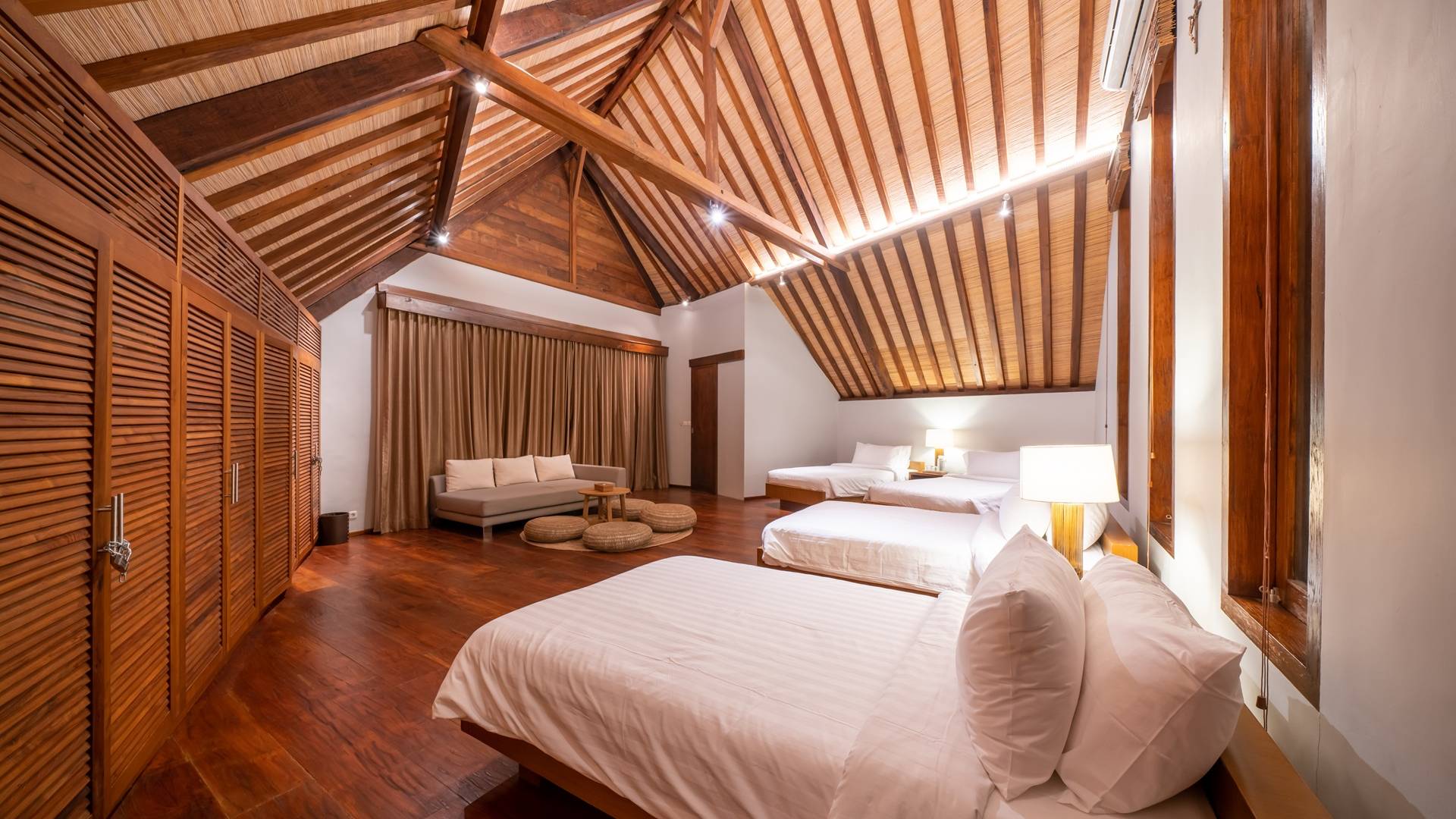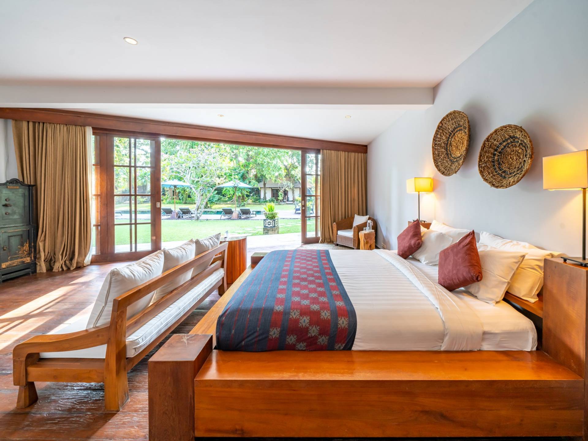 Cada una de las 7 habitaciones cuenta con su propio baño privado al aire libre, mucho espacio, hermosos pisos de madera, techos altos con techo de paja y generosas puertas corredizas de vidrio que dan la bienvenida a los rayos del sol para que se filtren. El complejo ofrece 6 camas tamaño king, una de las cuales está decorada con un marco de cuatro postes, ¡realmente apta para un rey! El ambiente de las habitaciones combina con el resplandor dorado y de roble del complejo: sábanas en tonos tierra y una variedad ecléctica de piezas de arte embellecen humildemente el espacio. Los baños privados cuentan con ducha de lluvia y un juego de tocador completo. El diseño de la arquitectura da forma a las habitaciones de manera única: con paredes en ángulo de paneles de vidrio del piso al techo, todos los huéspedes tienen el privilegio de tener vistas directas de las villas al aire libre.