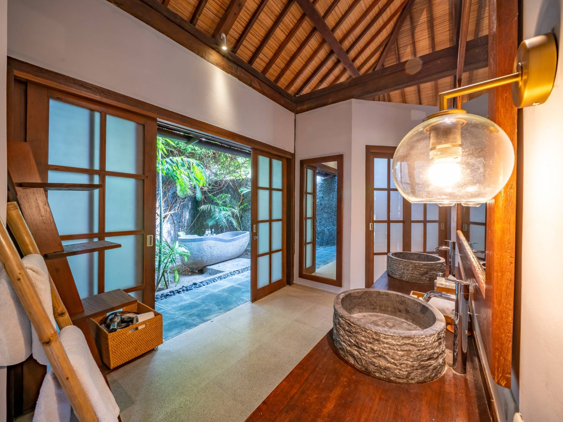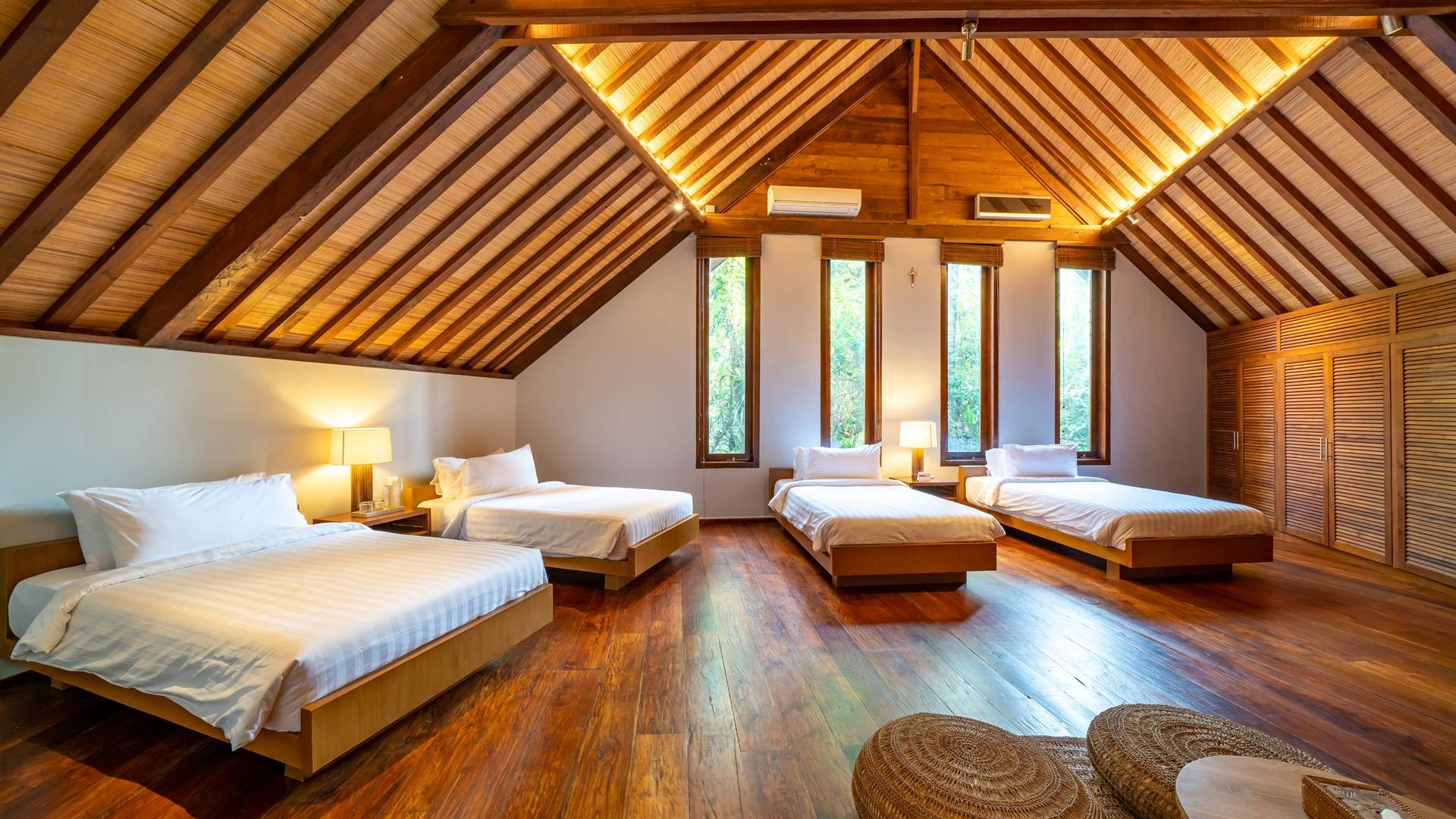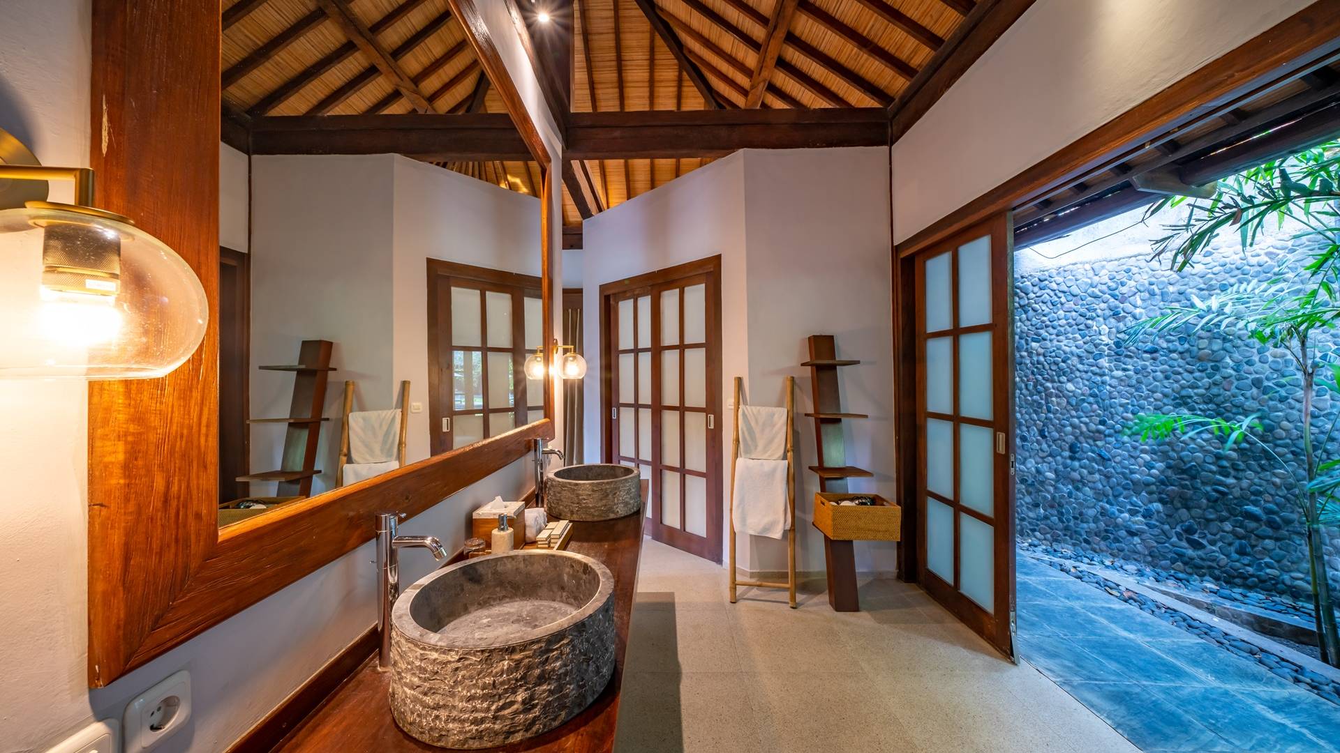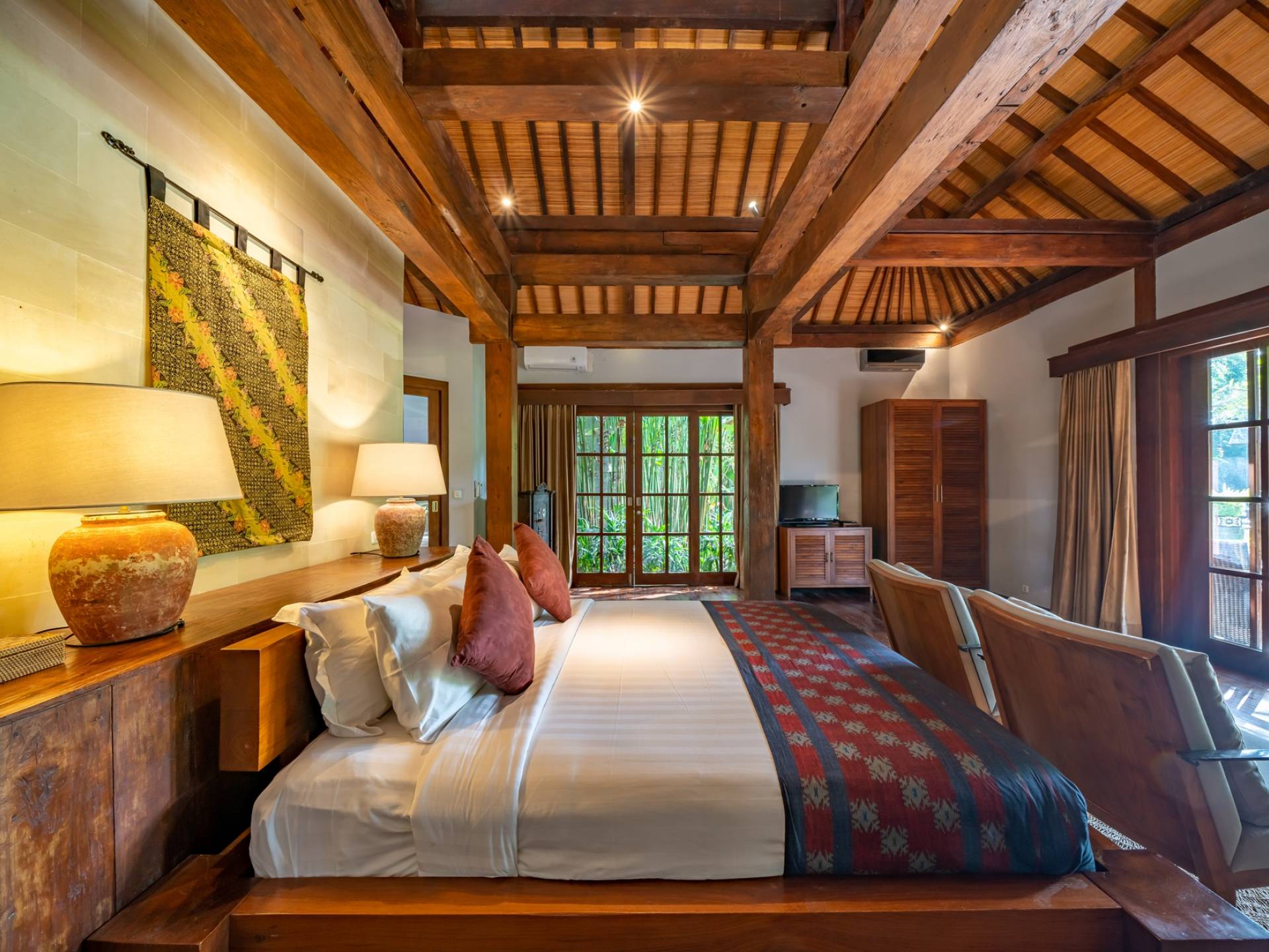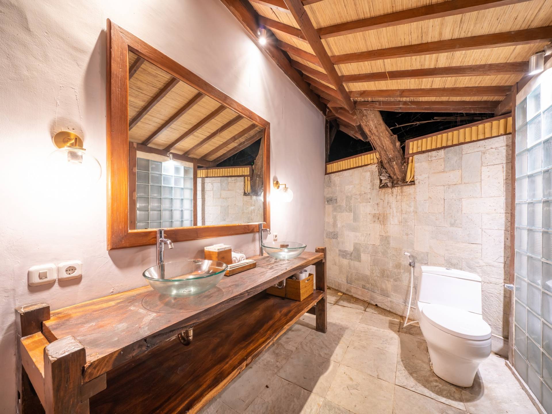 Cada una de las 7 habitaciones cuenta con su propio baño privado al aire libre, mucho espacio, hermosos pisos de madera, techos altos con techo de paja y generosas puertas corredizas de vidrio que dan la bienvenida a los rayos del sol para que se filtren. El complejo ofrece 6 camas tamaño king, una de las cuales está decorada con un marco de cuatro postes, ¡realmente apta para un rey! El ambiente de las habitaciones combina con el resplandor dorado y de roble del complejo: sábanas en tonos tierra y una variedad ecléctica de piezas de arte embellecen humildemente el espacio. Los baños privados cuentan con ducha de lluvia y un juego de tocador completo. El diseño de la arquitectura da forma a las habitaciones de manera única: con paredes en ángulo de paneles de vidrio del piso al techo, todos los huéspedes tienen el privilegio de tener vistas directas de las villas al aire libre.
