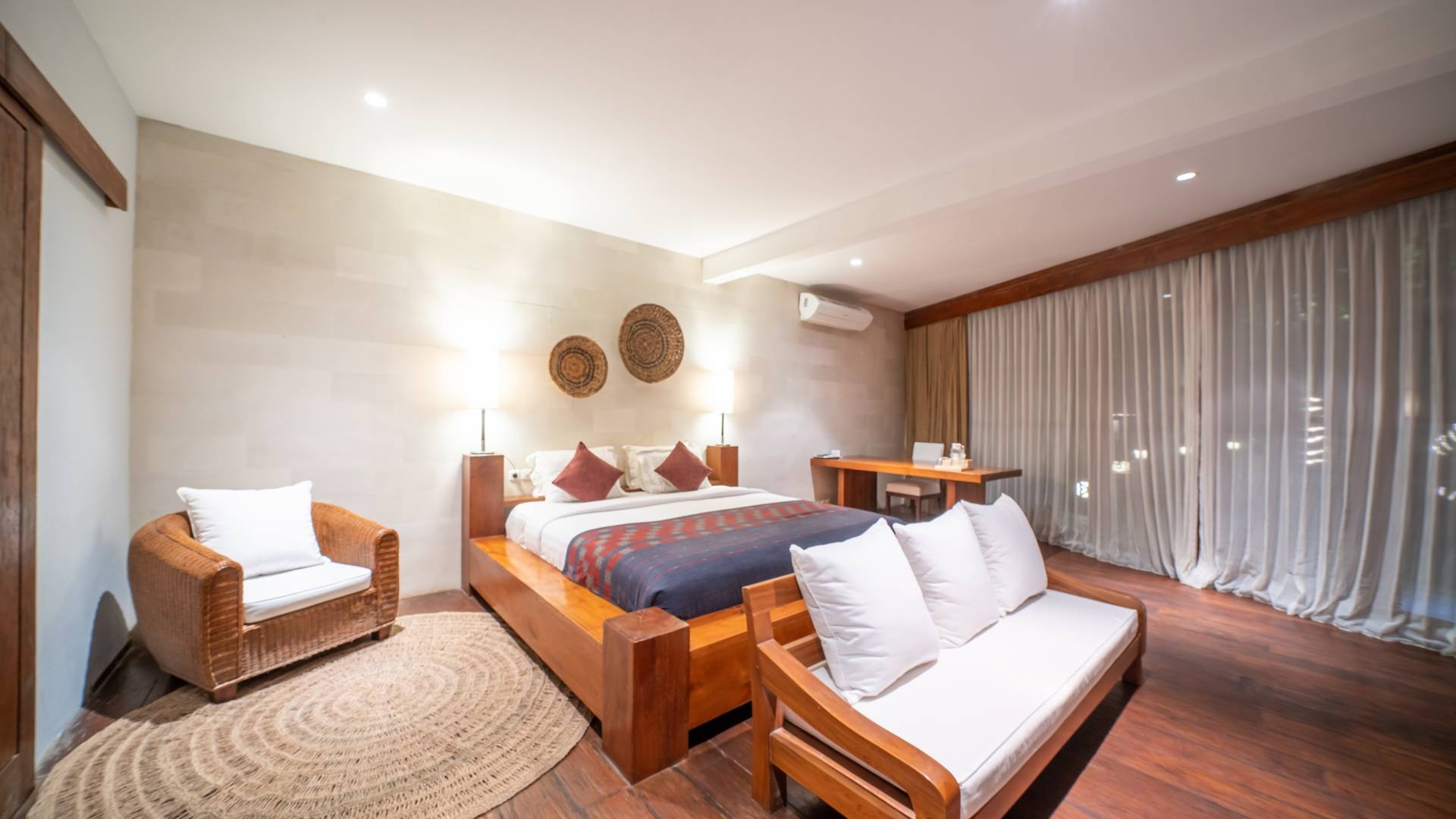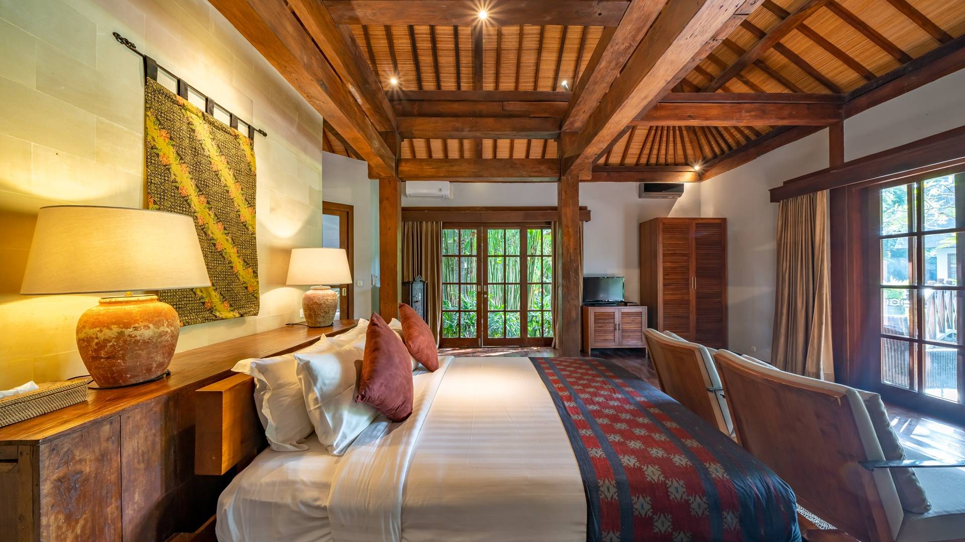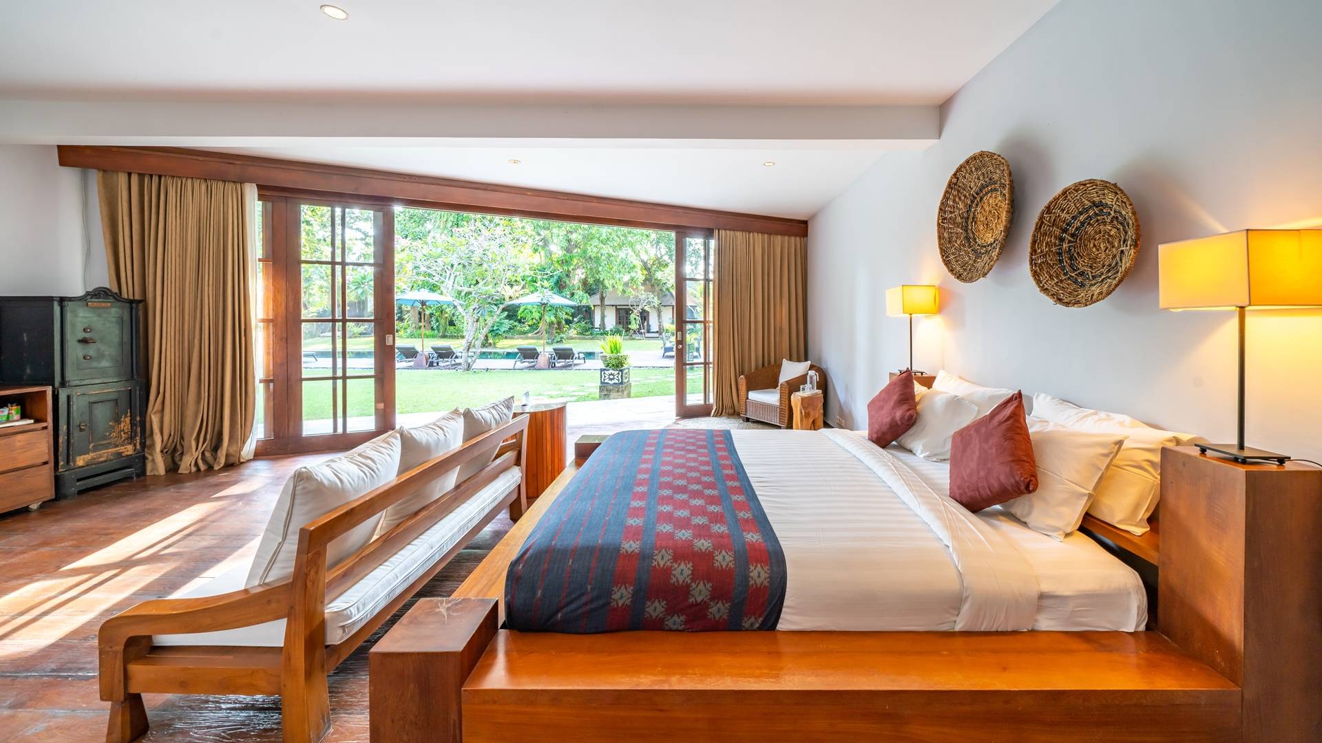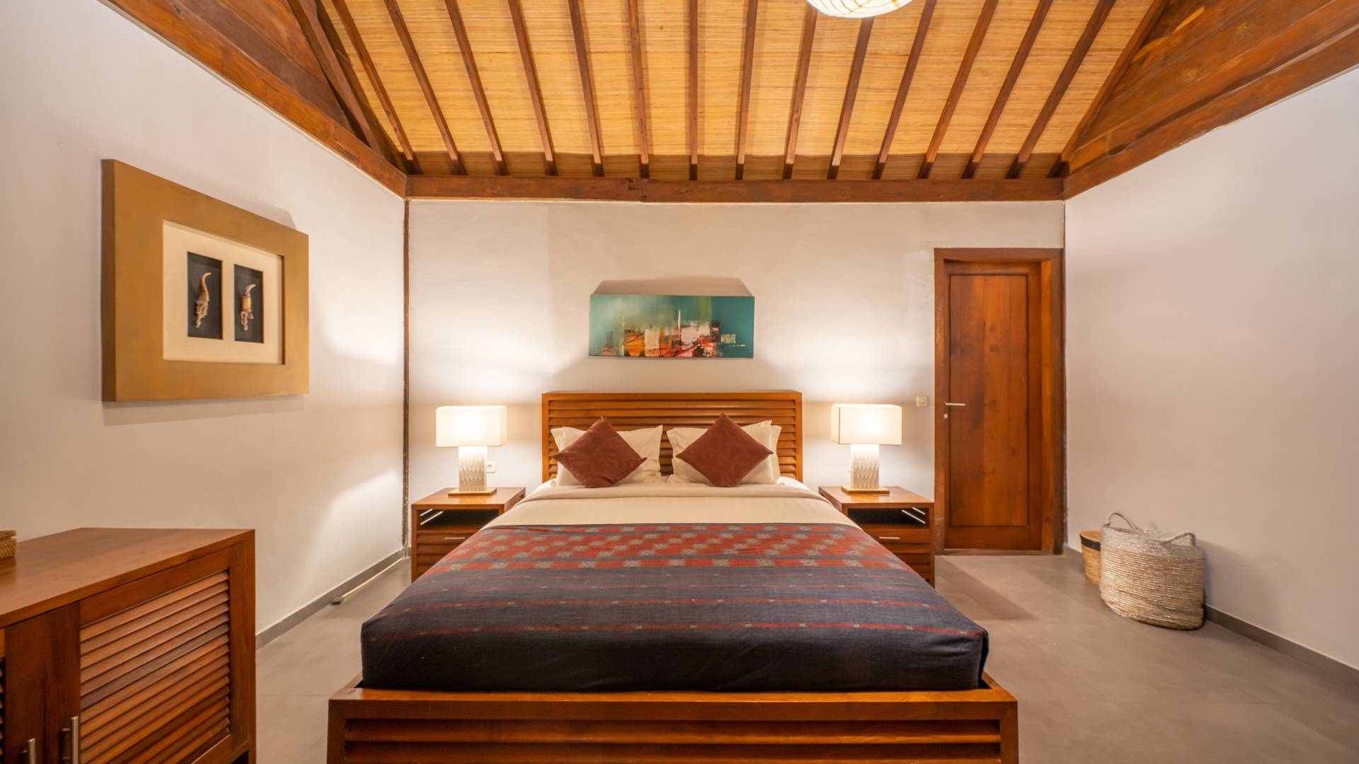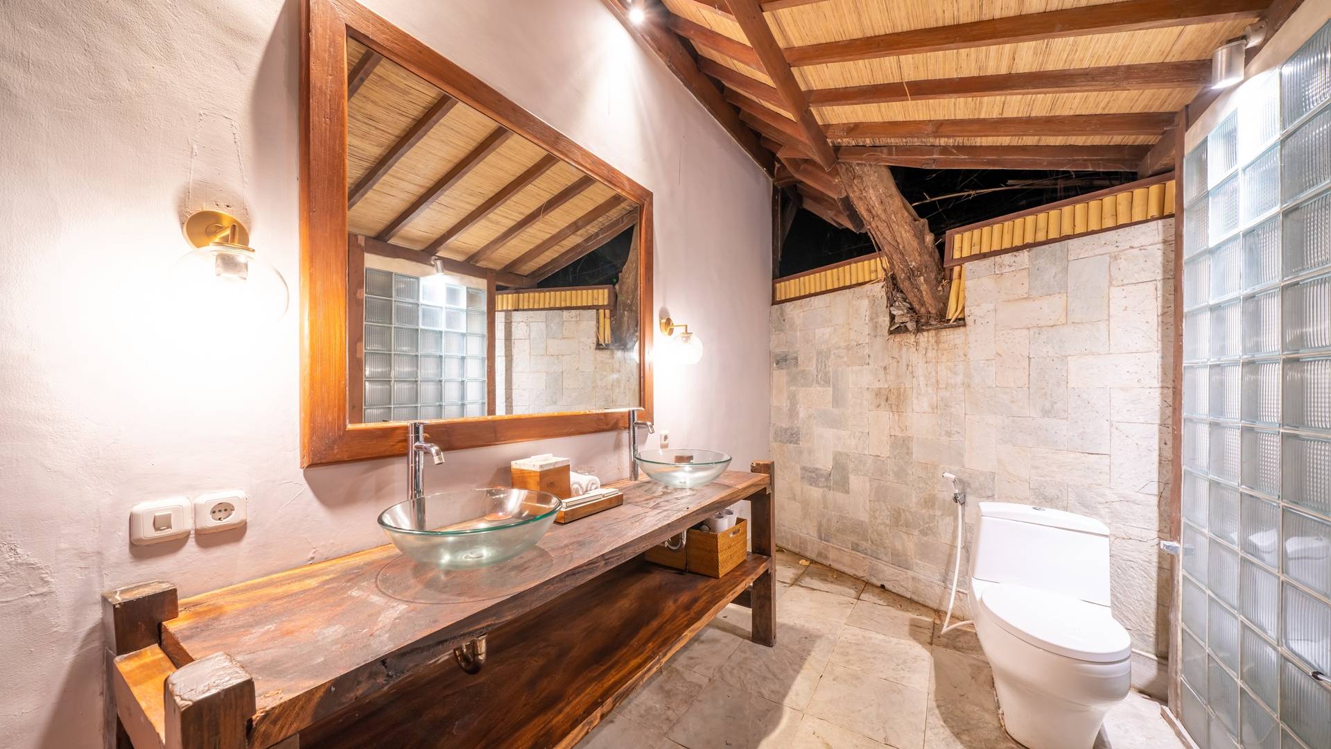 Cada una de las 7 habitaciones cuenta con su propio baño privado al aire libre, mucho espacio, hermosos pisos de madera, techos altos con techo de paja y generosas puertas corredizas de vidrio que dan la bienvenida a los rayos del sol para que se filtren. El complejo ofrece 6 camas tamaño king, una de las cuales está decorada con un marco de cuatro postes, ¡realmente apta para un rey! El ambiente de las habitaciones combina con el resplandor dorado y de roble del complejo: sábanas en tonos tierra y una variedad ecléctica de piezas de arte embellecen humildemente el espacio. Los baños privados cuentan con ducha de lluvia y un juego de tocador completo. El diseño de la arquitectura da forma a las habitaciones de manera única: con paredes en ángulo de paneles de vidrio del piso al techo, todos los huéspedes tienen el privilegio de tener vistas directas de las villas al aire libre.