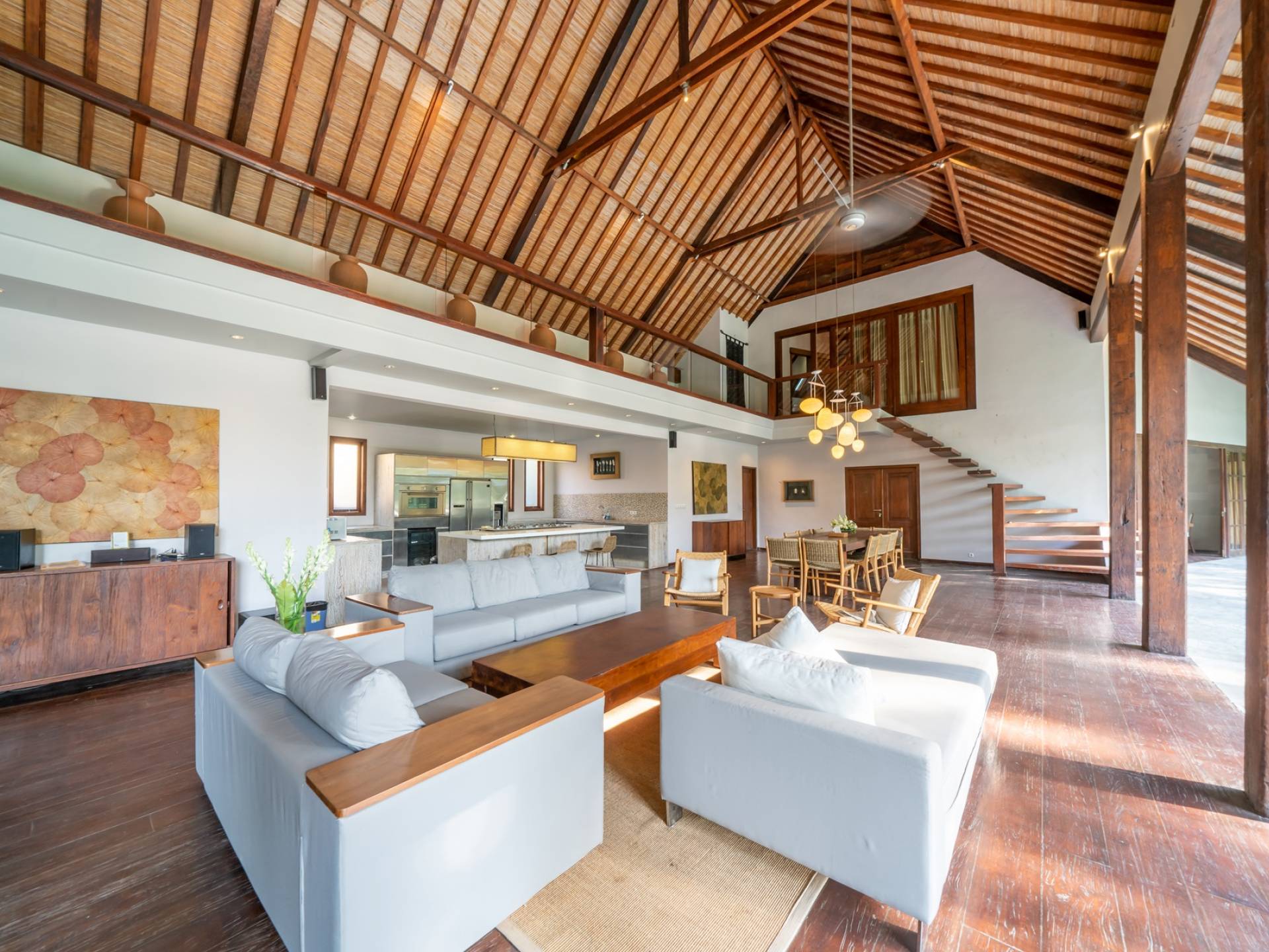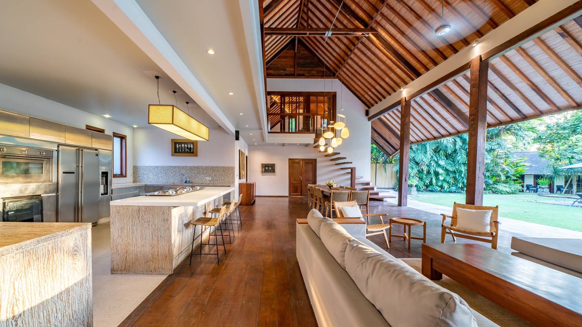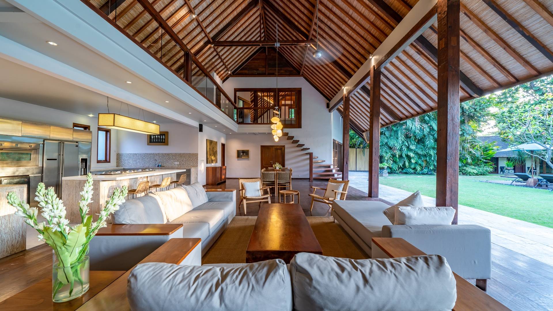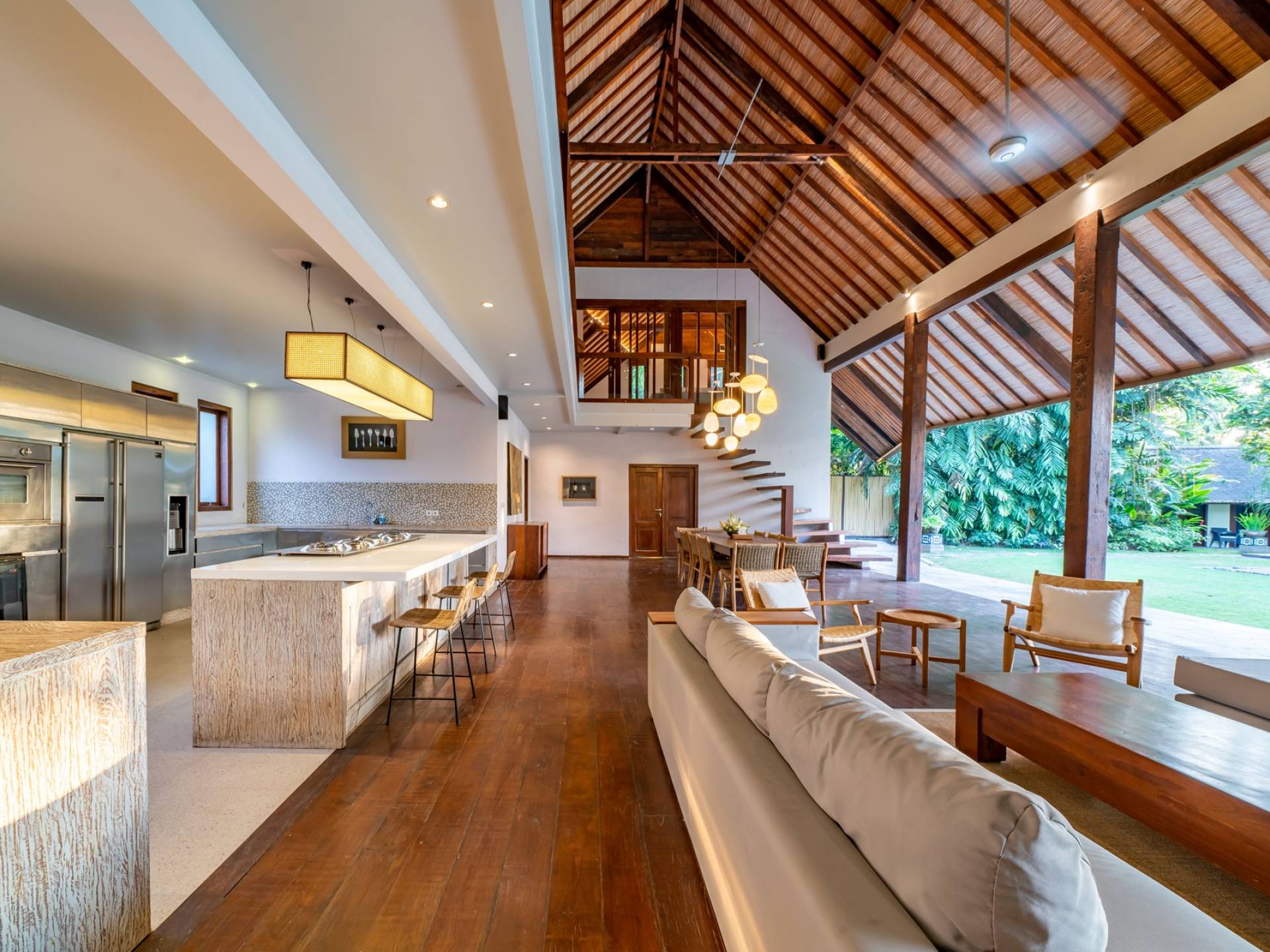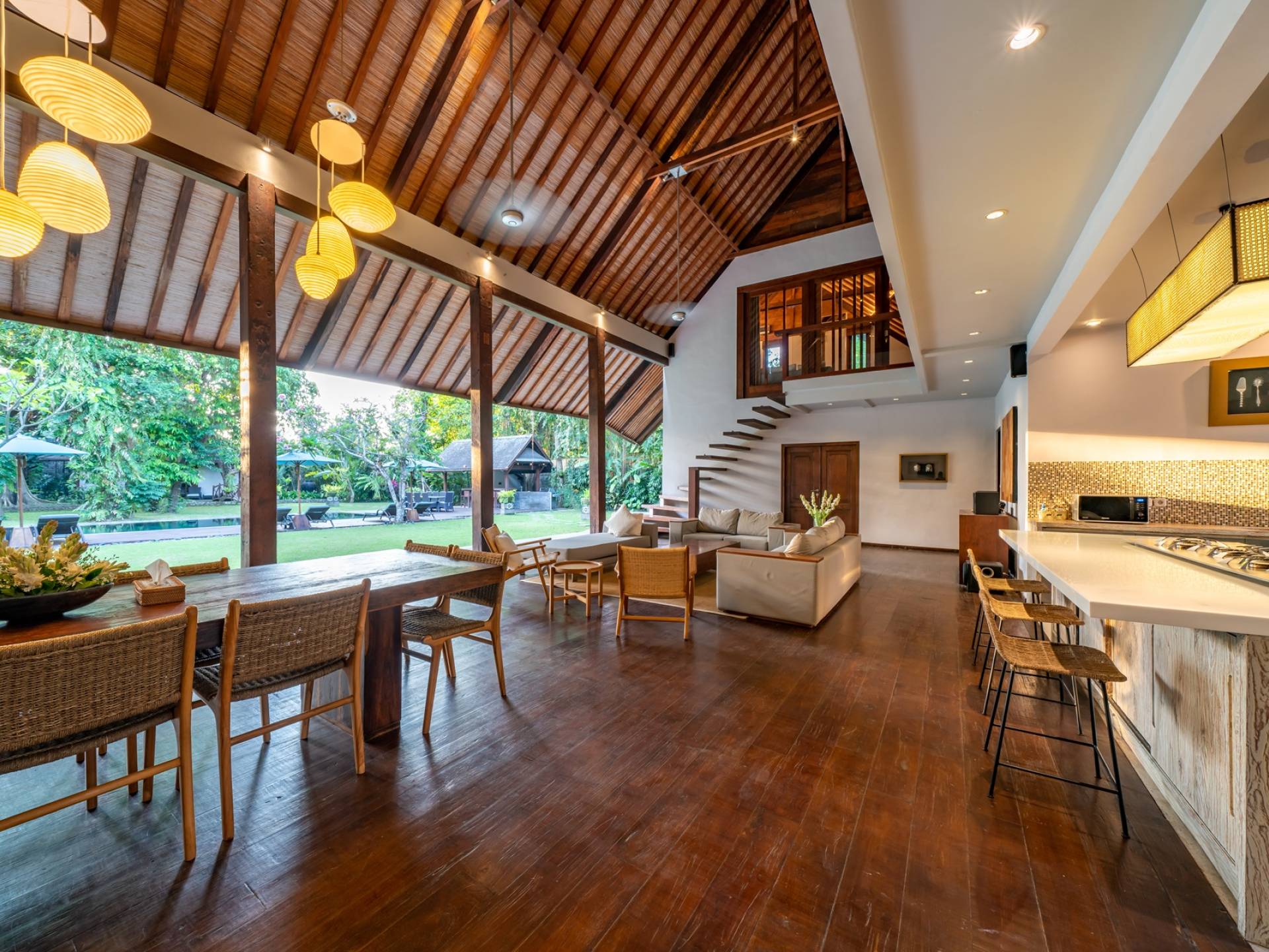 Ambas villas dentro del complejo tienen entornos similares. El ambiente de roble y los tonos dorados de sus espacios habitables están abiertos a la brisa tropical. Los espacios de estar interiores están amueblados con un lujoso sofá color topo, una mesa de café baja y un equipo de audio. Junto a él, se encuentra el comedor formal con una mesa de teca con capacidad para 10 personas. Dentro del mismo pabellón, los huéspedes pueden preparar sus propias comidas en la cocina de ensueño inmaculadamente equipada. La cocina cuenta con estantes de aluminio con marco de madera y exclusivos accesorios de iluminación de red colgados sobre la isla central.