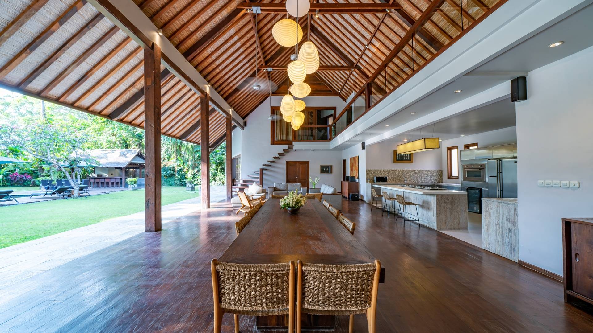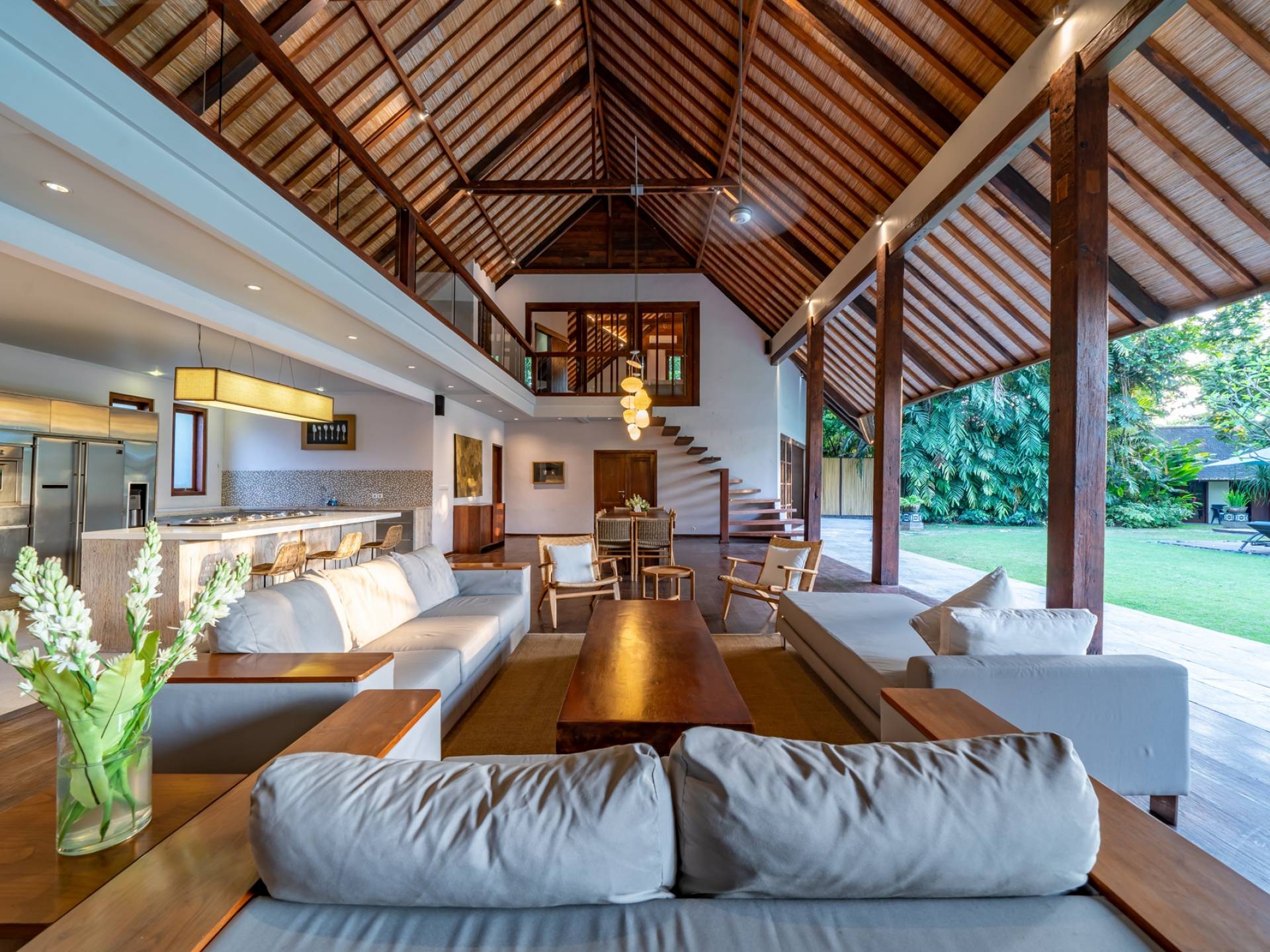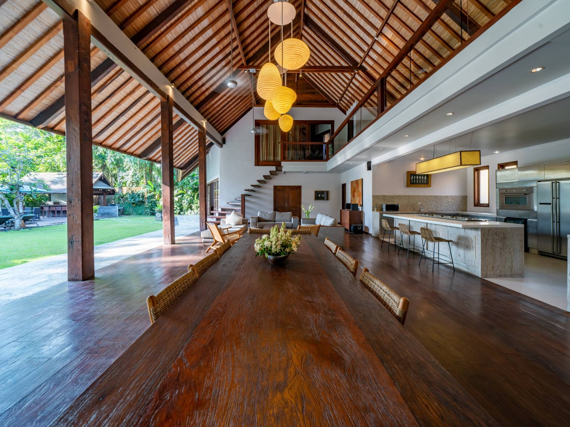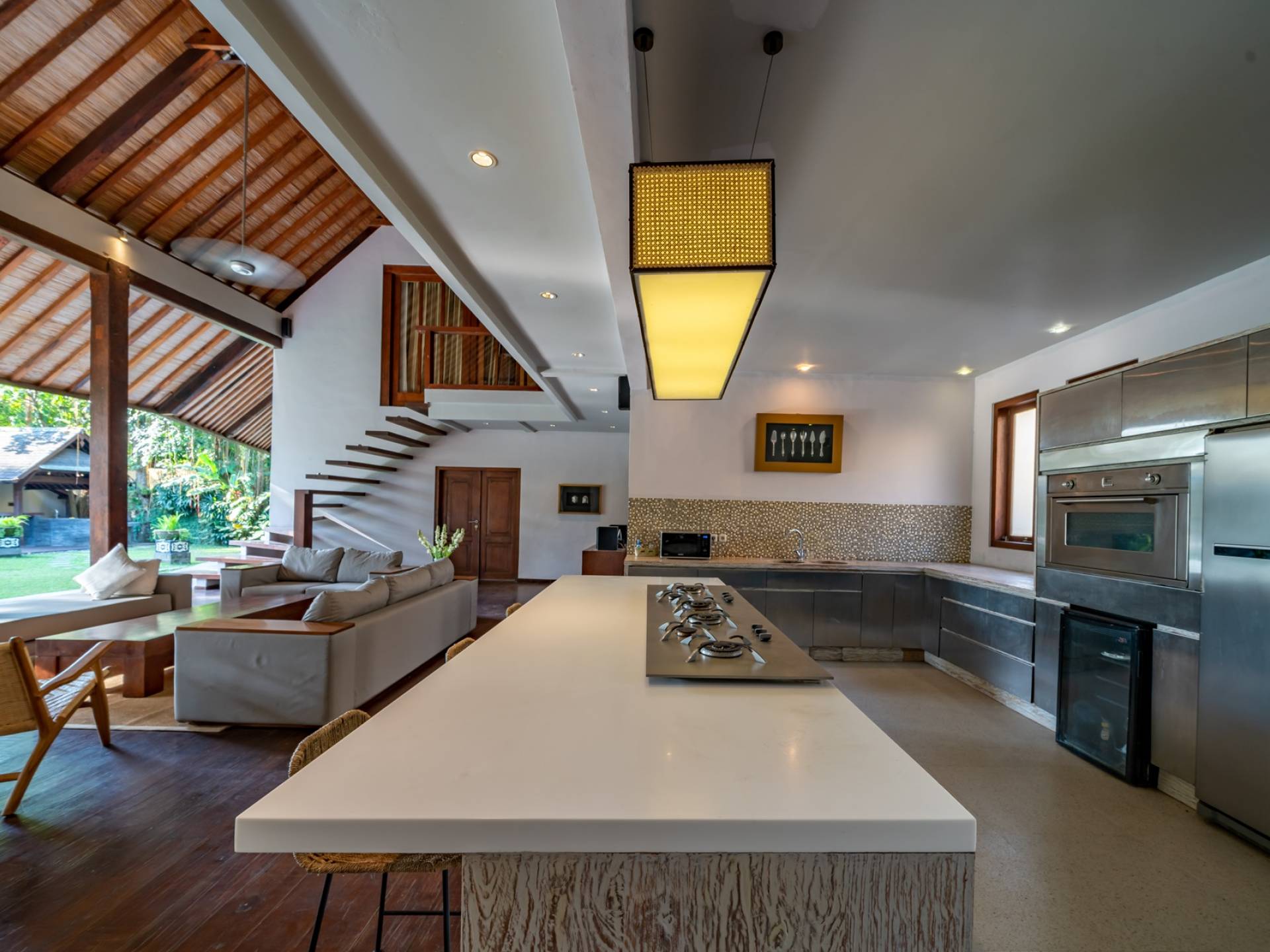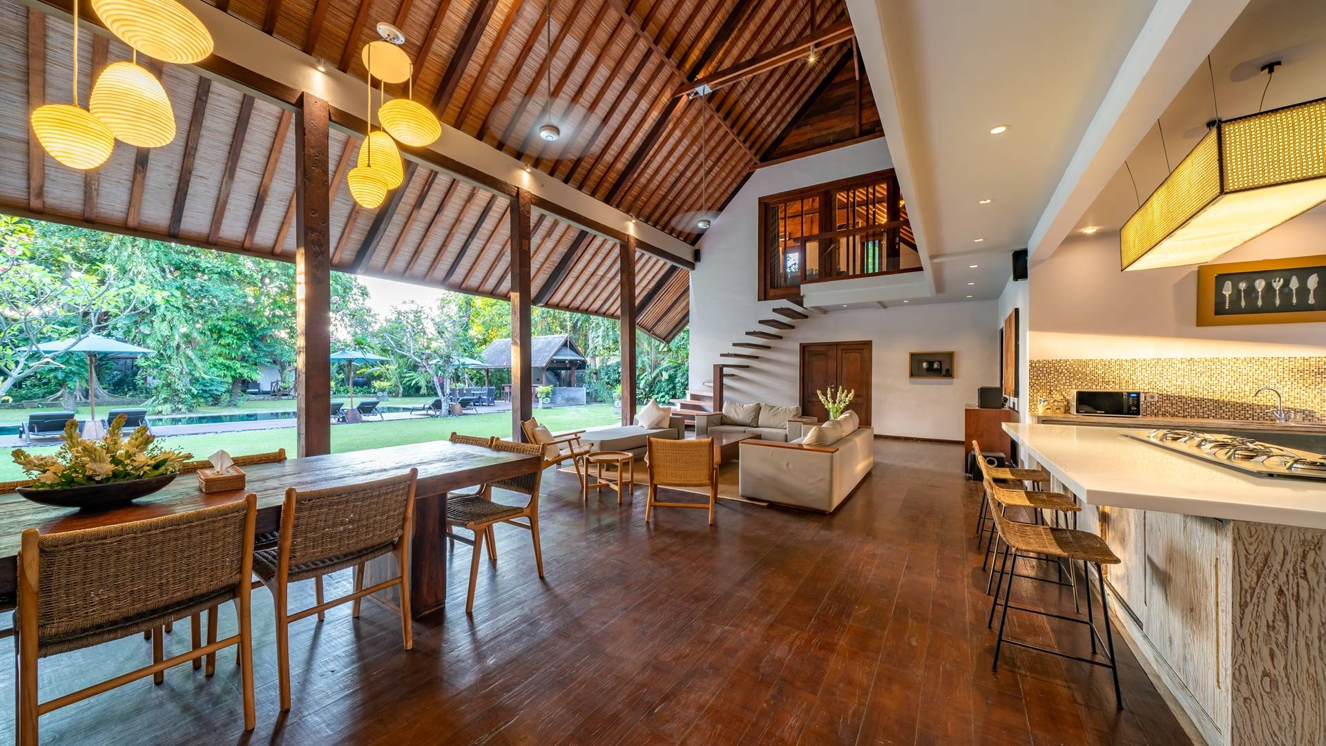 Ambas villas dentro del complejo tienen entornos similares. El ambiente de roble y los tonos dorados de sus espacios habitables están abiertos a la brisa tropical. Los espacios de estar interiores están amueblados con un lujoso sofá color topo, una mesa de café baja y un equipo de audio. Junto a él, se encuentra el comedor formal con una mesa de teca con capacidad para 10 personas. Dentro del mismo pabellón, los huéspedes pueden preparar sus propias comidas en la cocina de ensueño inmaculadamente equipada. La cocina cuenta con estantes de aluminio con marco de madera y exclusivos accesorios de iluminación de red colgados sobre la isla central.