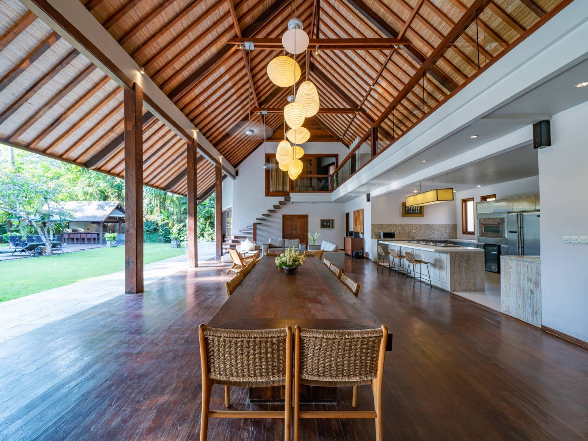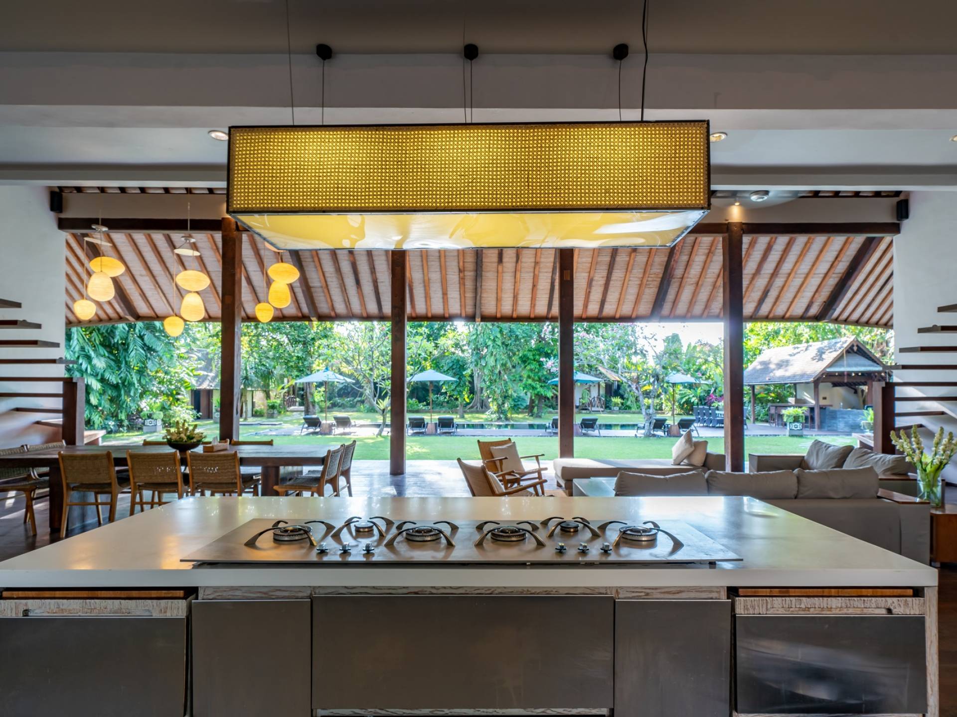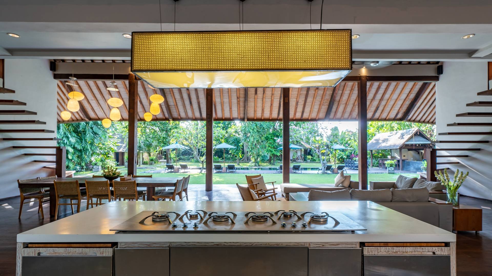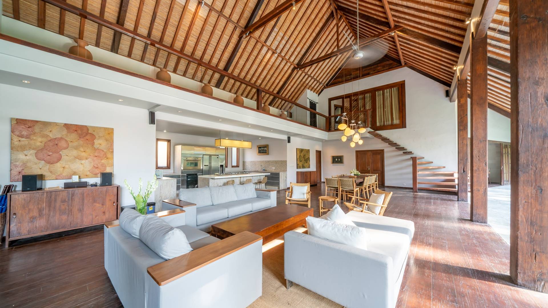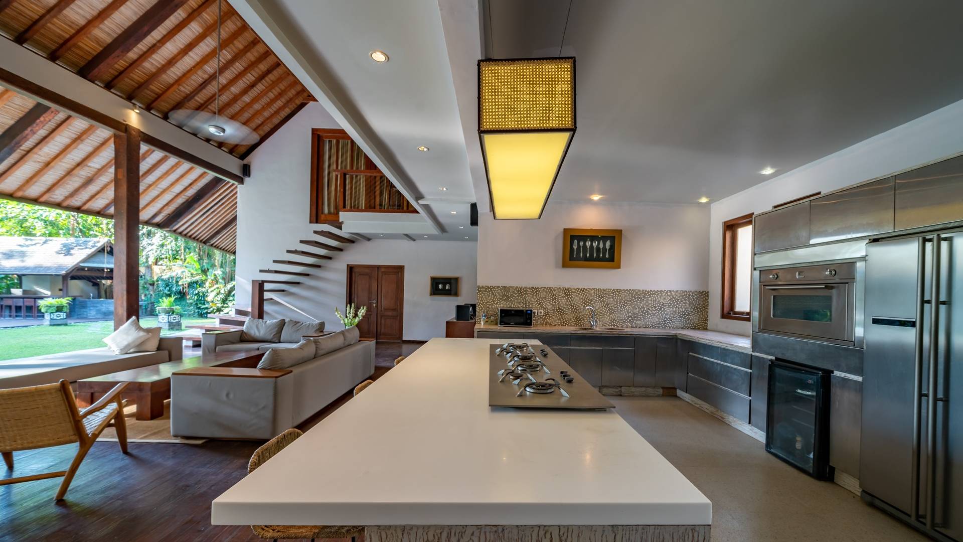 Ambas villas dentro del complejo tienen entornos similares. El ambiente de roble y los tonos dorados de sus espacios habitables están abiertos a la brisa tropical. Los espacios de estar interiores están amueblados con un lujoso sofá color topo, una mesa de café baja y un equipo de audio. Junto a él, se encuentra el comedor formal con una mesa de teca con capacidad para 10 personas. Dentro del mismo pabellón, los huéspedes pueden preparar sus propias comidas en la cocina de ensueño inmaculadamente equipada. La cocina cuenta con estantes de aluminio con marco de madera y exclusivos accesorios de iluminación de red colgados sobre la isla central.