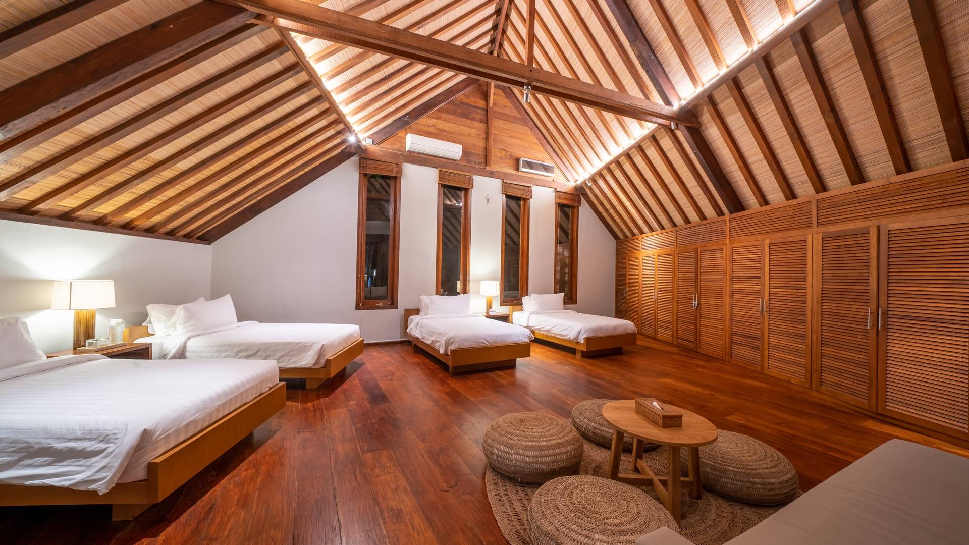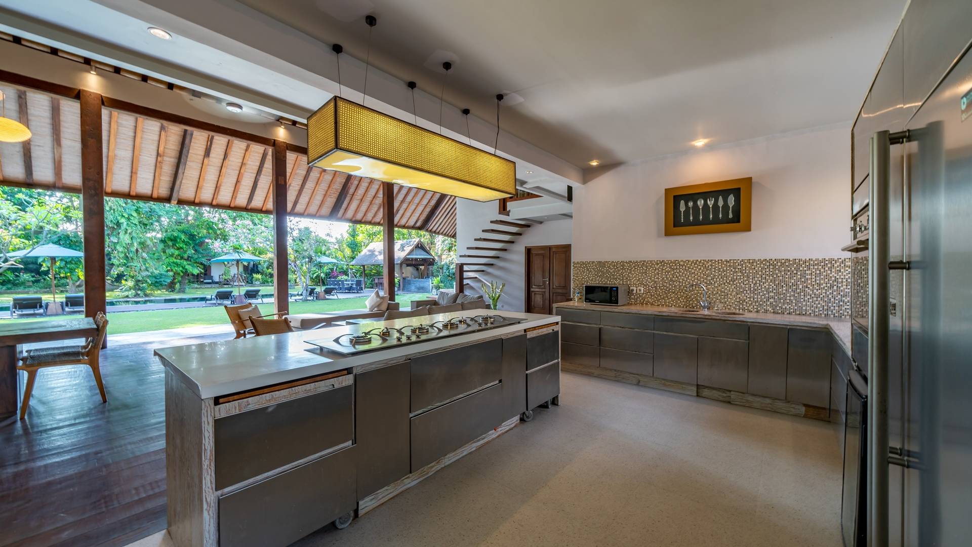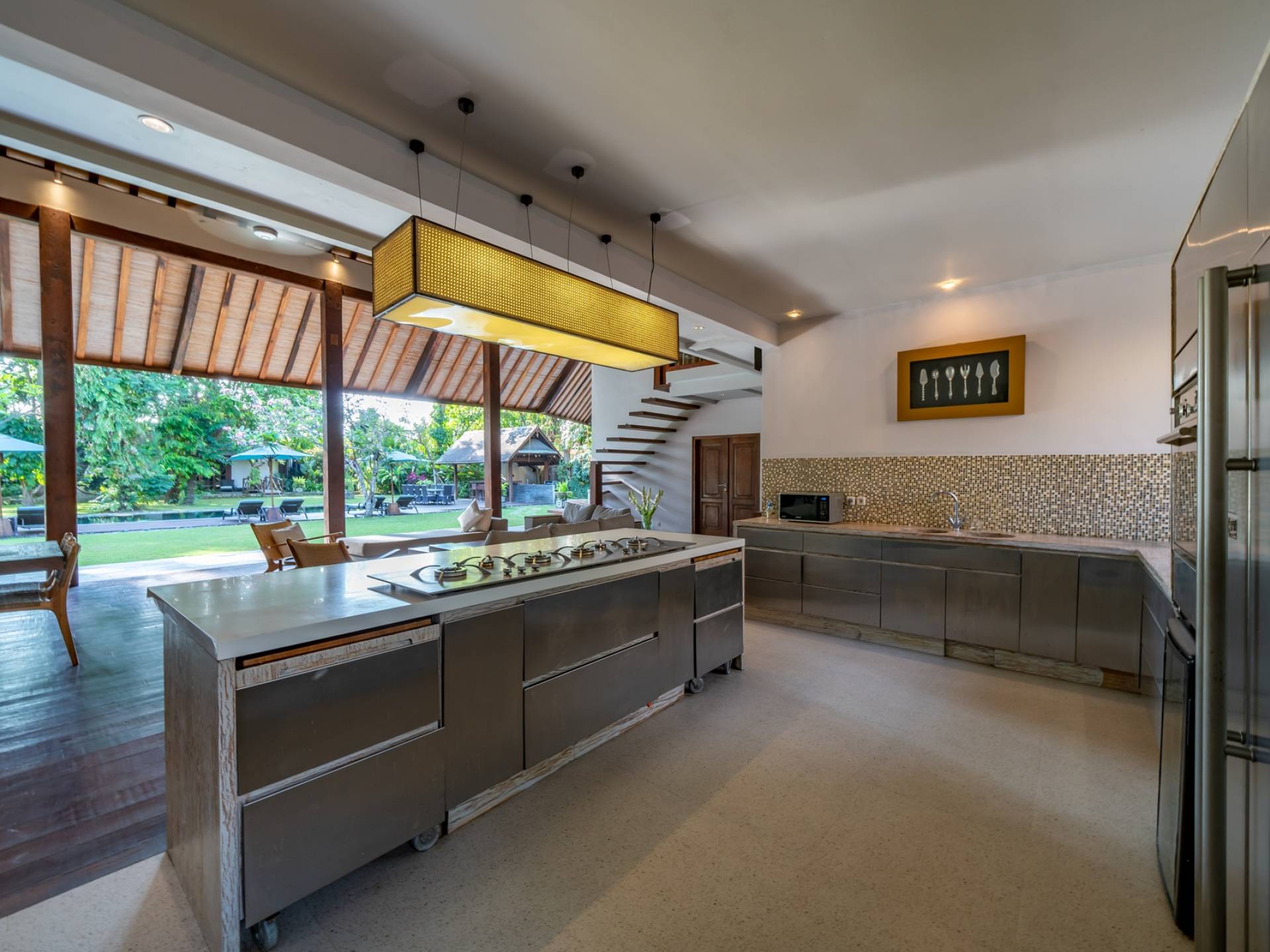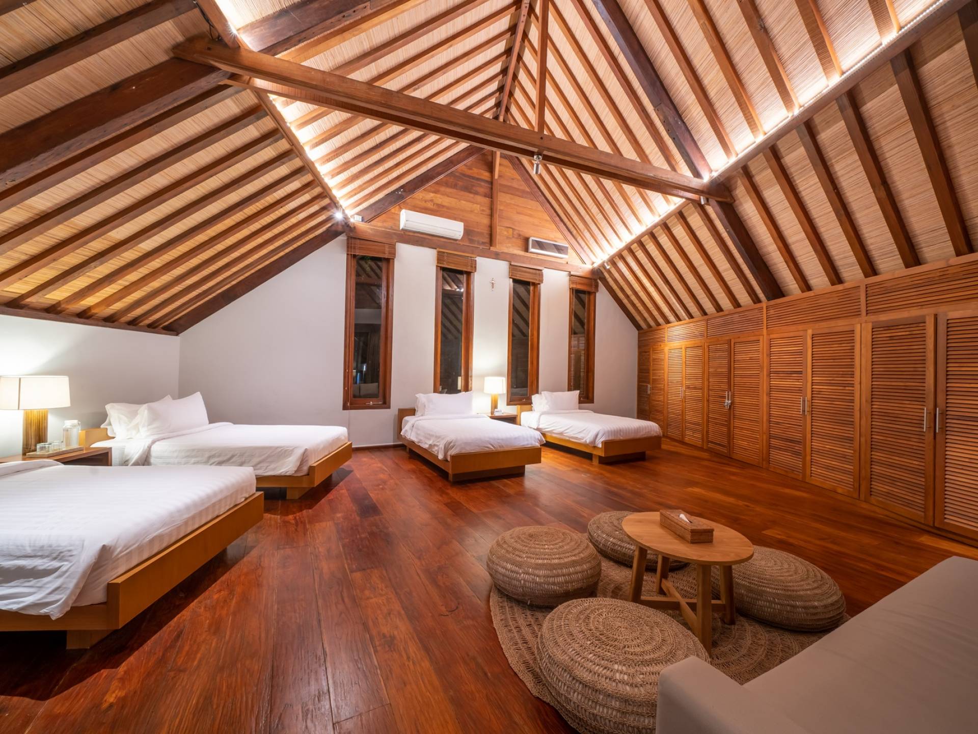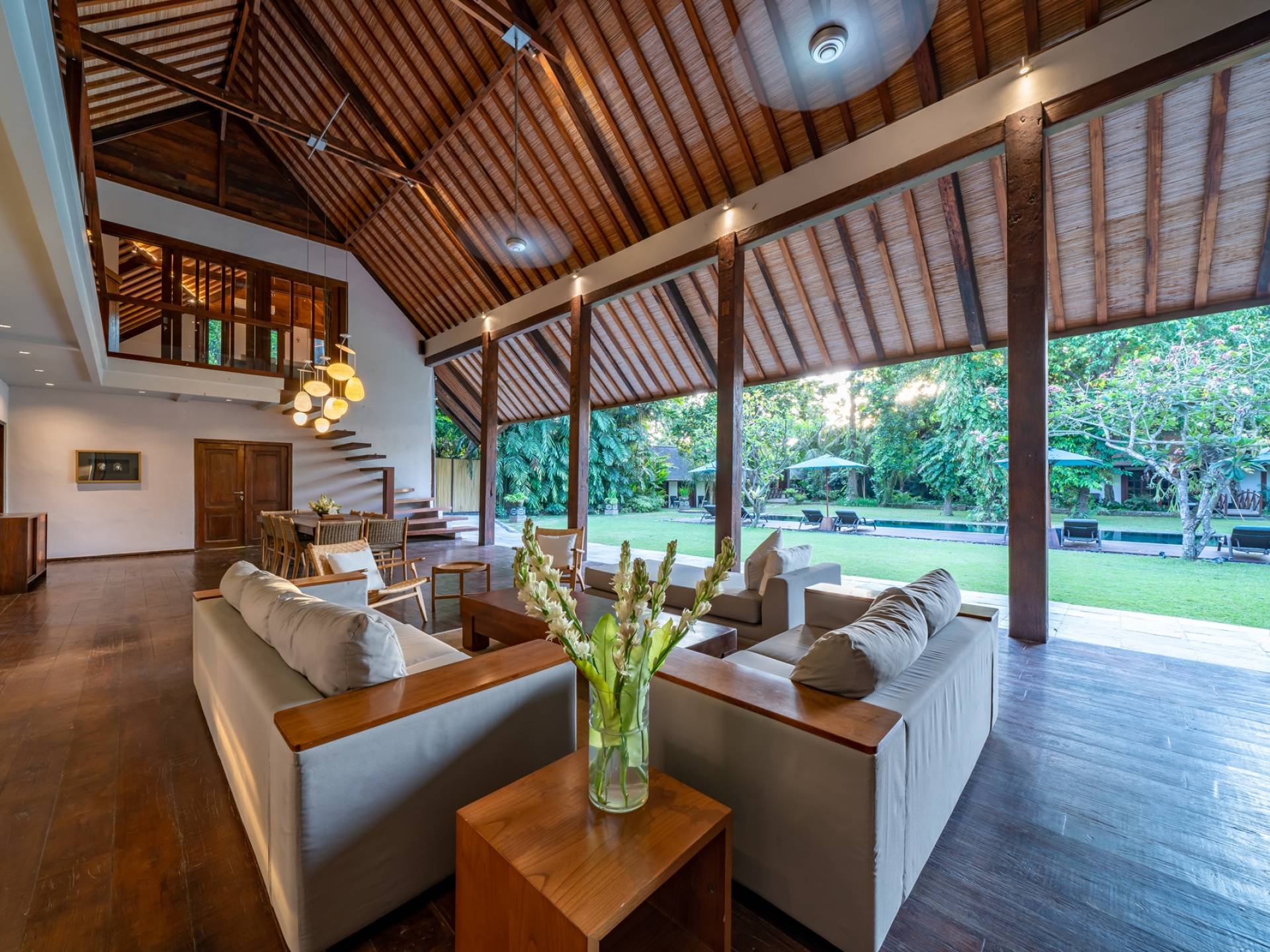 Ambas villas dentro del complejo tienen entornos similares. El ambiente de roble y los tonos dorados de sus espacios habitables están abiertos a la brisa tropical. Los espacios de estar interiores están amueblados con un lujoso sofá color topo, una mesa de café baja y un equipo de audio. Junto a él, se encuentra el comedor formal con una mesa de teca con capacidad para 10 personas. Dentro del mismo pabellón, los huéspedes pueden preparar sus propias comidas en la cocina de ensueño inmaculadamente equipada. La cocina cuenta con estantes de aluminio con marco de madera y exclusivos accesorios de iluminación de red colgados sobre la isla central.