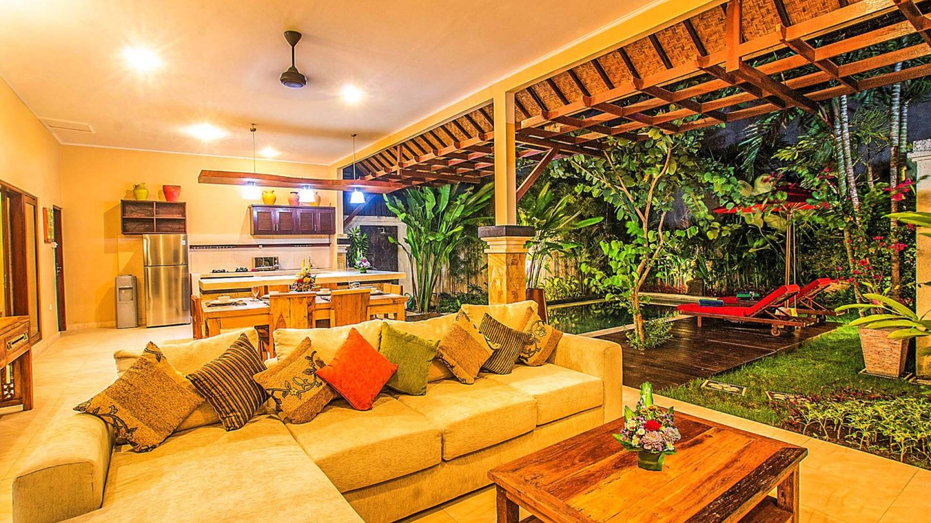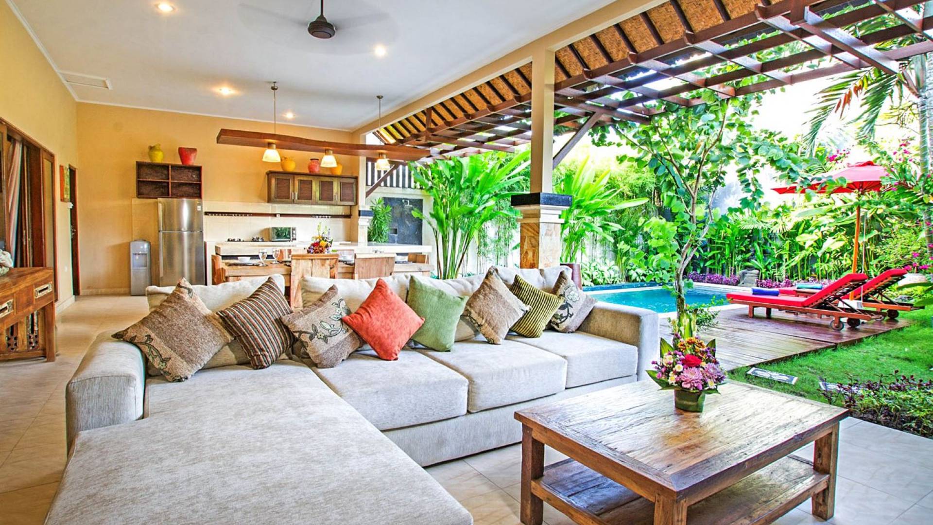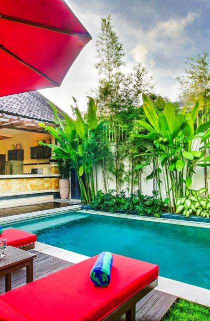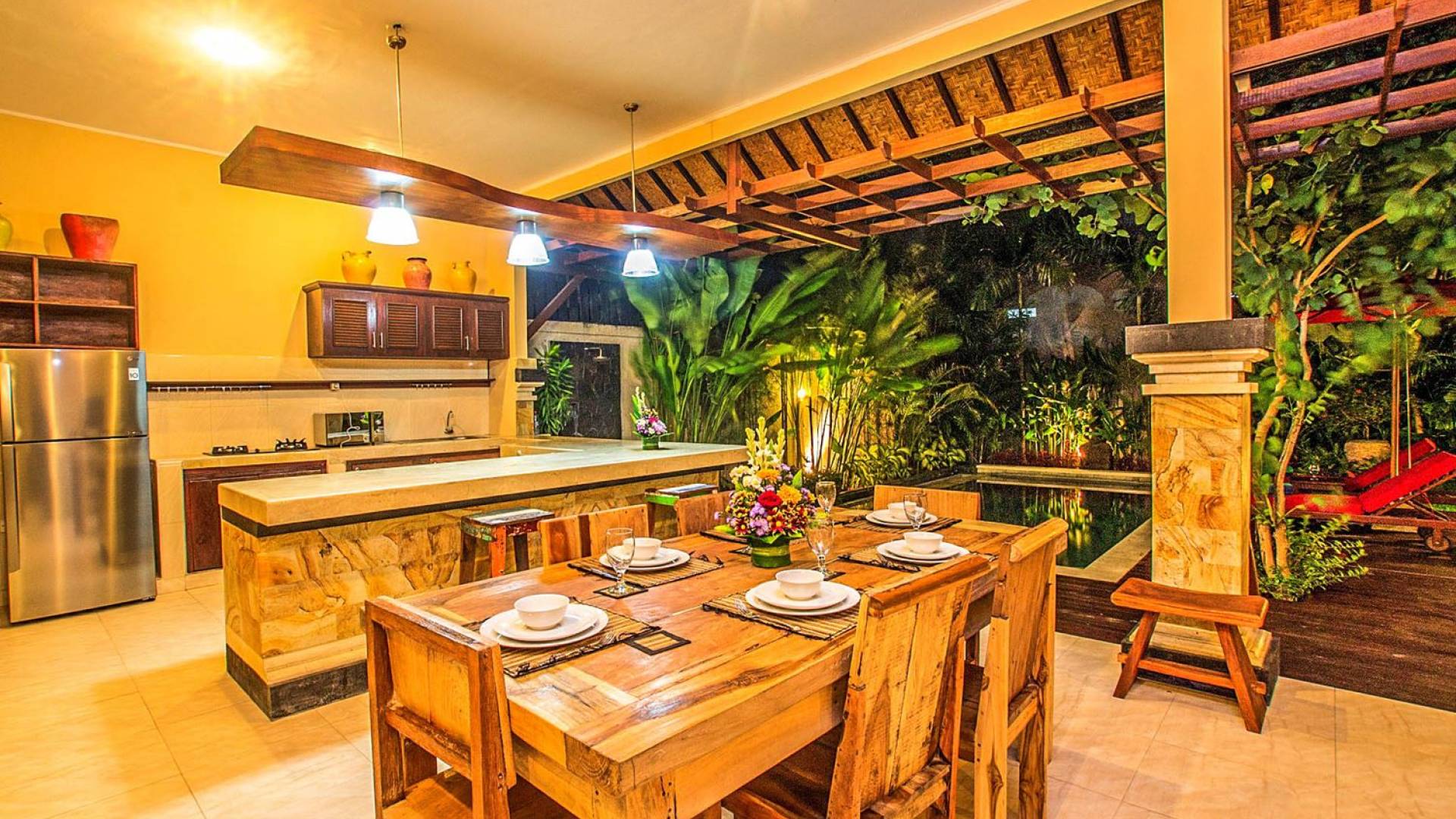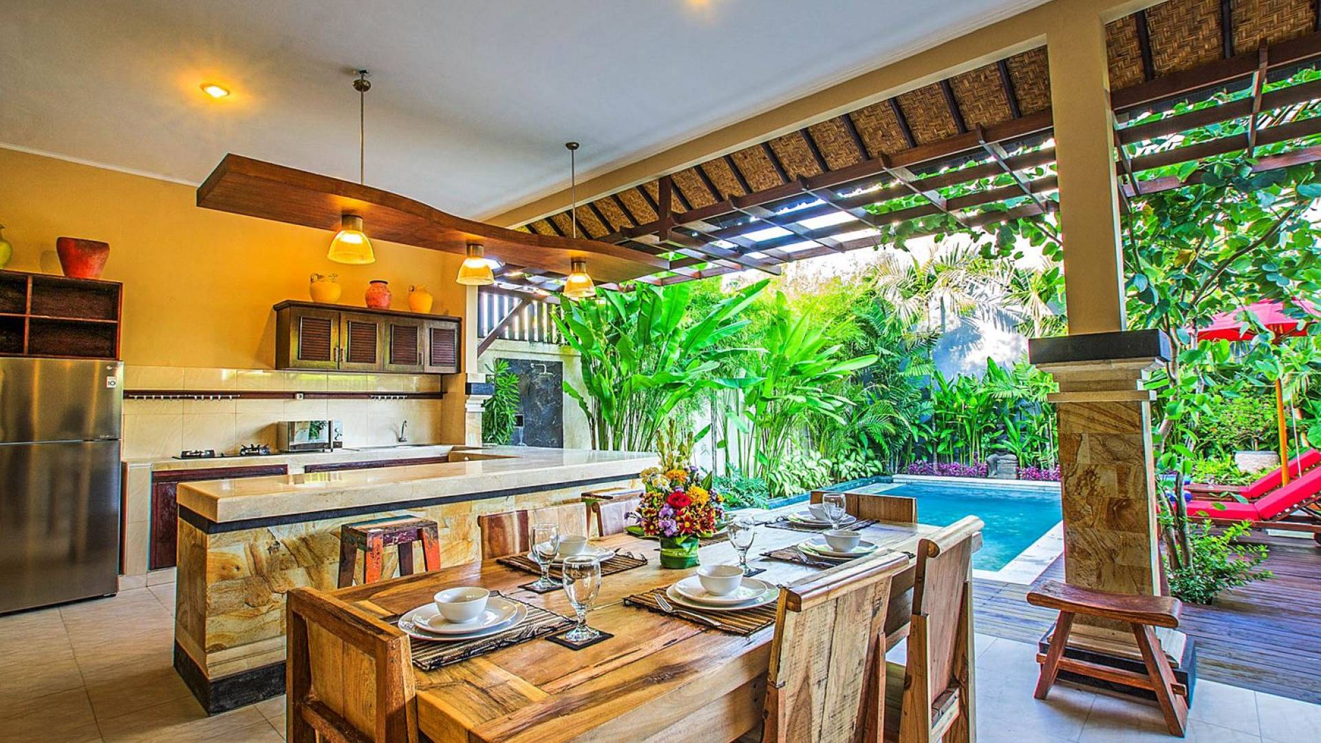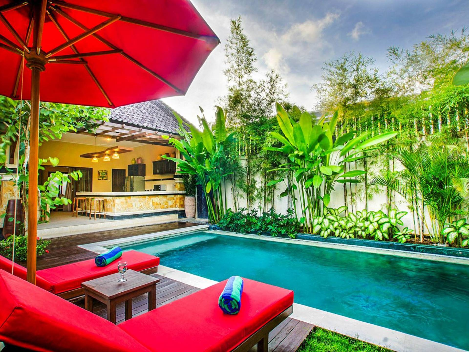 Villa Ashira Seminyak es una villa de lujo en alquiler con 2 dormitorios y piscina privada. Con una ubicación ideal en el centro de Seminyak, Villa Ashira ofrece una encantadora villa tradicional de estilo balinés equipada con comodidades modernas. La propiedad cuenta con 2 dormitorios, sala de estar al aire libre contigua al comedor e incluye una cocina moderna equipada con taburetes de bar. En el exterior, el verde rodea una piscina privada con tumbonas junto a la piscina.