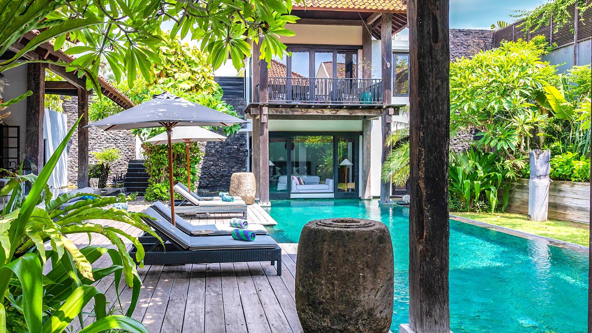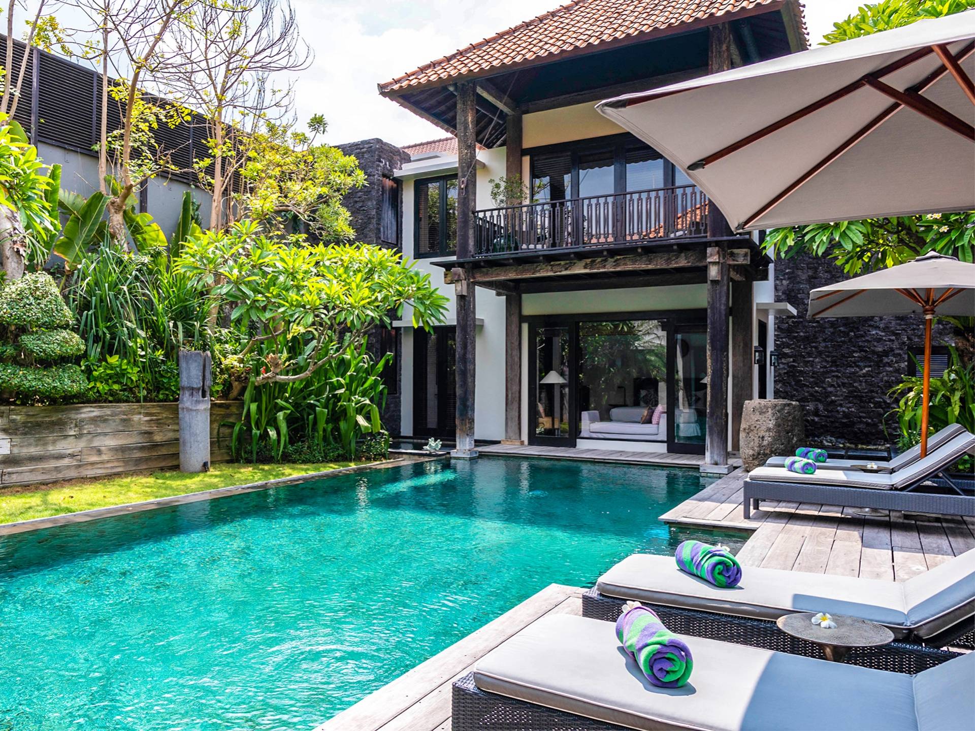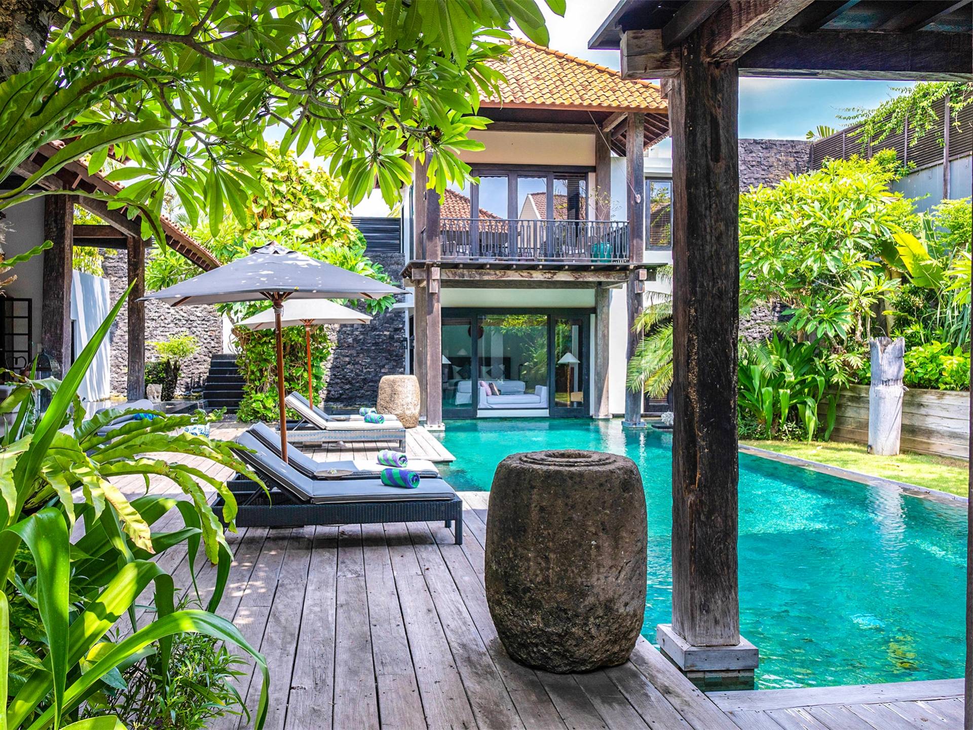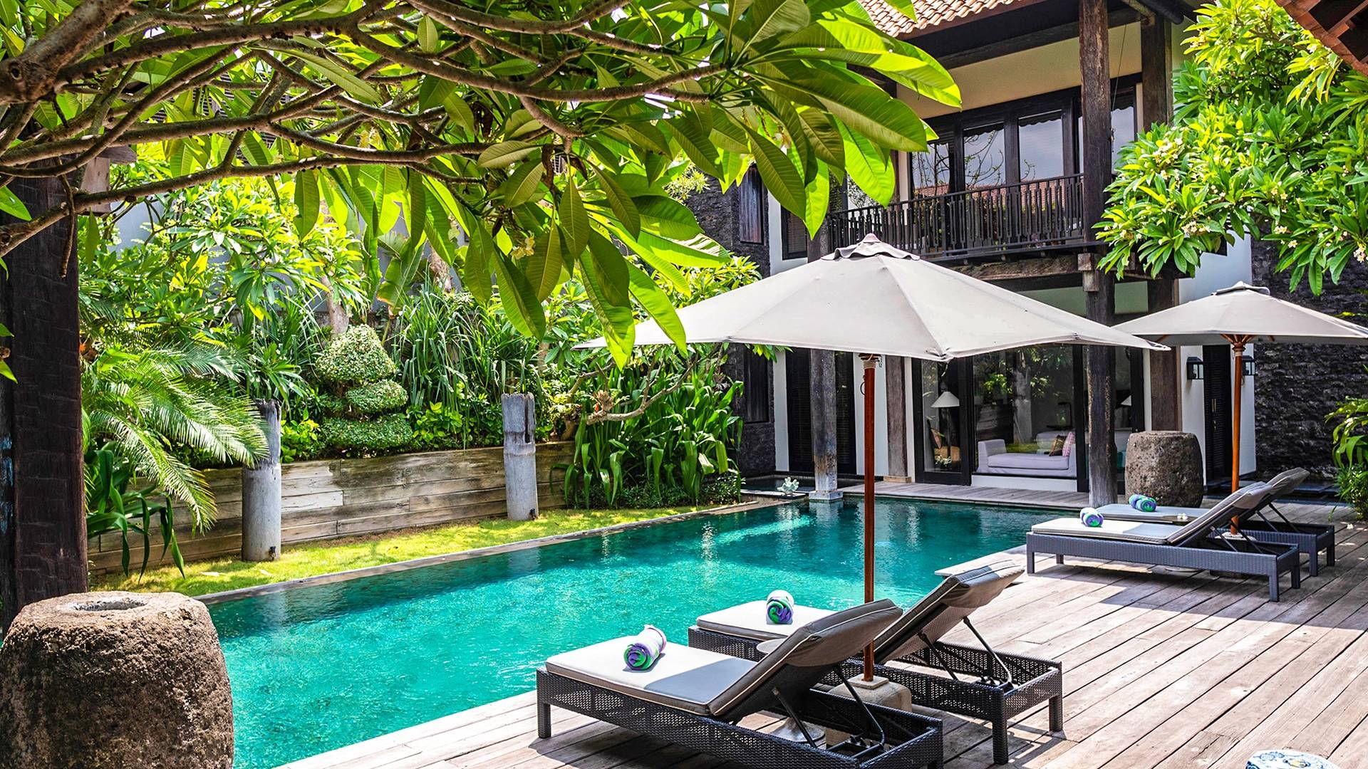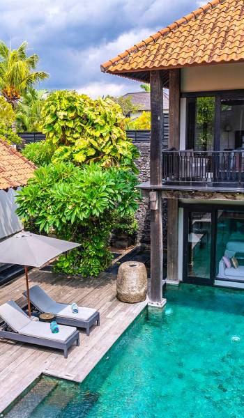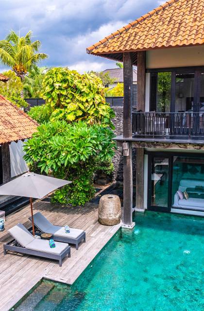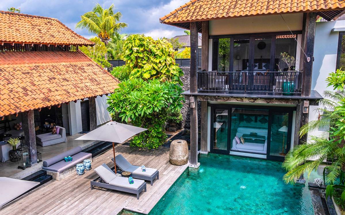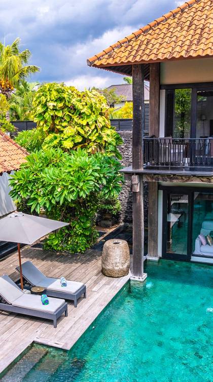 Rústica pero refinada, Villa De Suma insinúa la gracia y el romance de una época pasada, con sus majestuosos pilares de madera de hierro reciclado, antigüedades orientales y curiosidades indonesias. Sin embargo, hay muchas comodidades para garantizar las vacaciones más lujosas, incluidos muebles personalizados, WiFi, parlantes Bose y TV LCD vía satélite en todas partes. La piscina tropical de 12 metros da a un jardín vertical repleto de follaje tropical, mientras que una amplia terraza para tomar el sol tiene tumbonas y tumbonas incorporadas. Las cuatro espaciosas habitaciones son de estilo contemporáneo, con vestidores grandes y baños elegantes y relucientes con azulejos de granito negro y equipados con duchas de efecto lluvia.