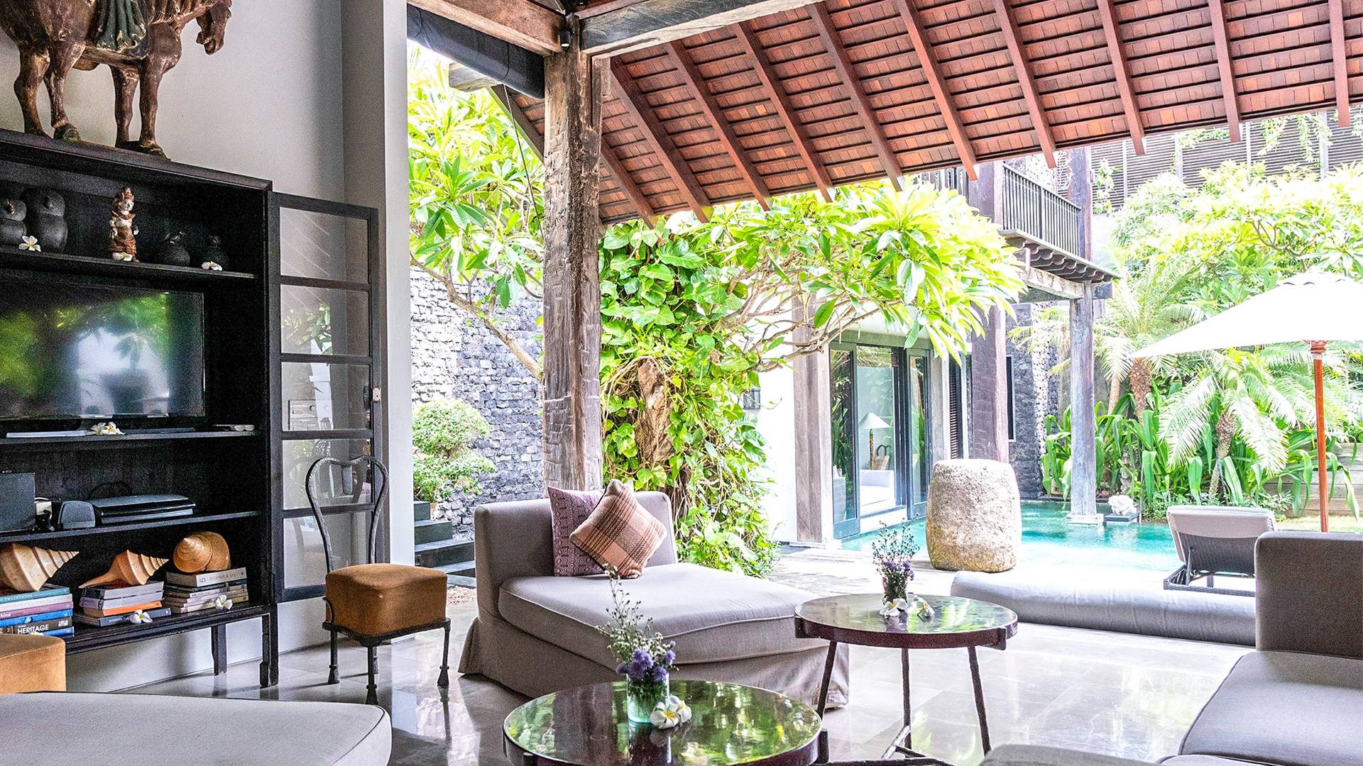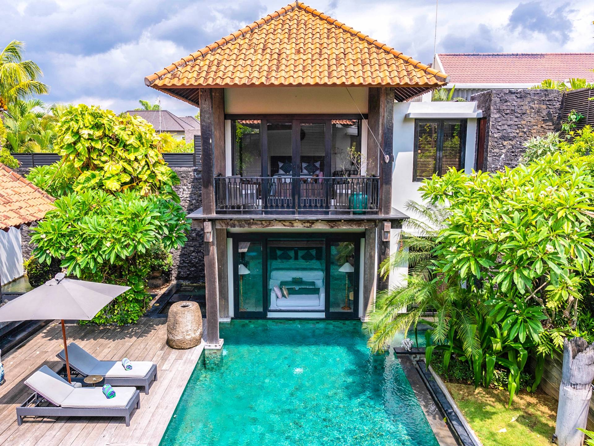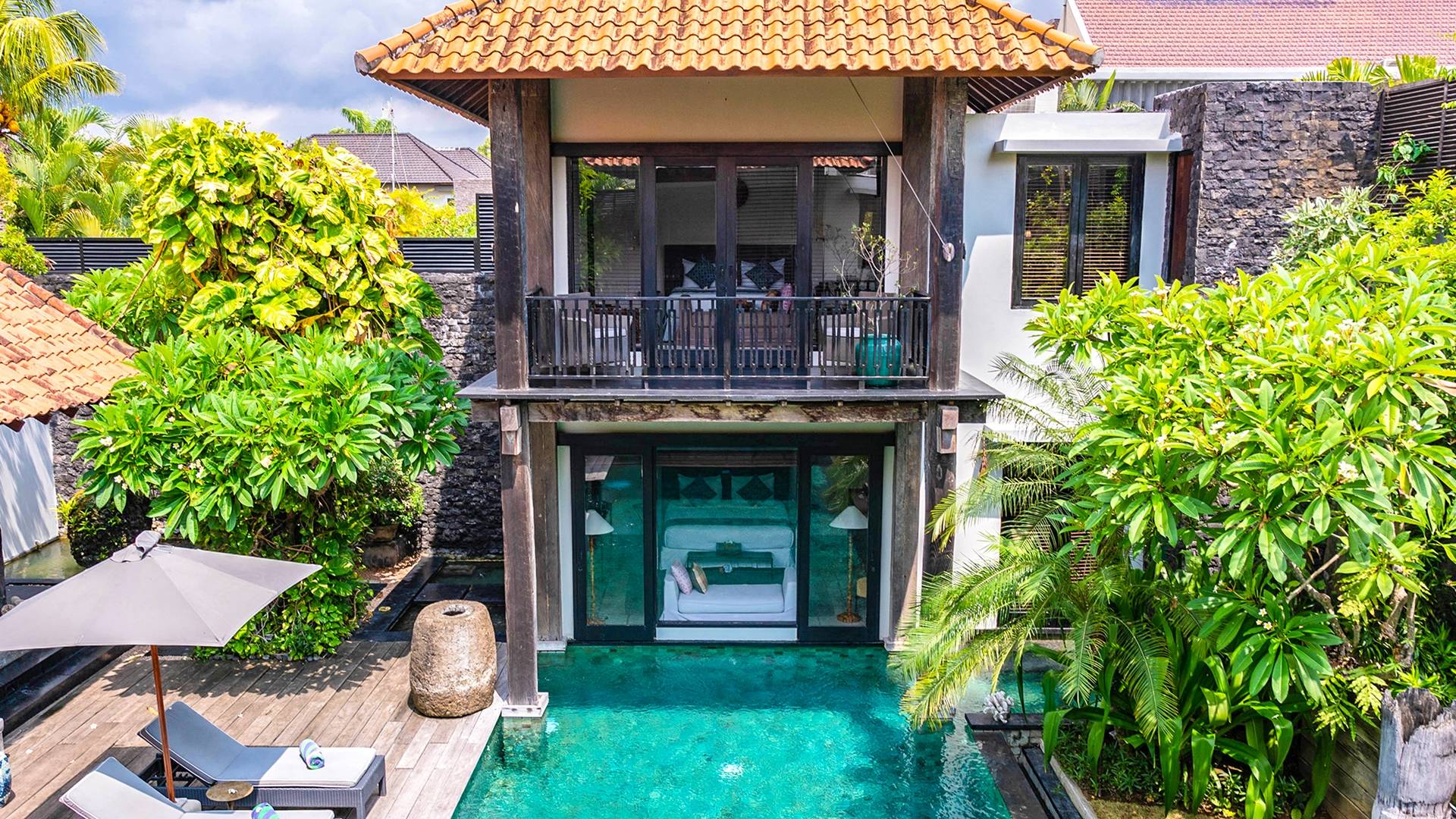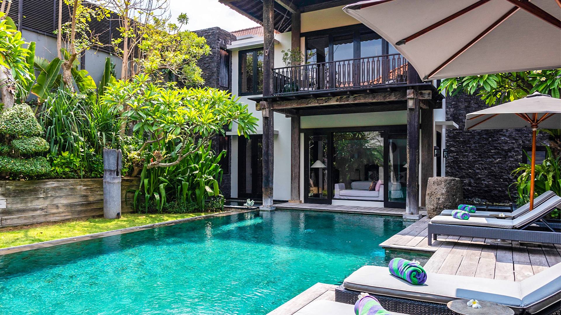 Rústica pero refinada, Villa De Suma insinúa la gracia y el romance de una época pasada, con sus majestuosos pilares de madera de hierro reciclado, antigüedades orientales y curiosidades indonesias. Sin embargo, hay muchas comodidades para garantizar las vacaciones más lujosas, incluidos muebles personalizados, WiFi, parlantes Bose y TV LCD vía satélite en todas partes. La piscina tropical de 12 metros da a un jardín vertical repleto de follaje tropical, mientras que una amplia terraza para tomar el sol tiene tumbonas y tumbonas incorporadas. Las cuatro espaciosas habitaciones son de estilo contemporáneo, con vestidores grandes y baños elegantes y relucientes con azulejos de granito negro y equipados con duchas de efecto lluvia.