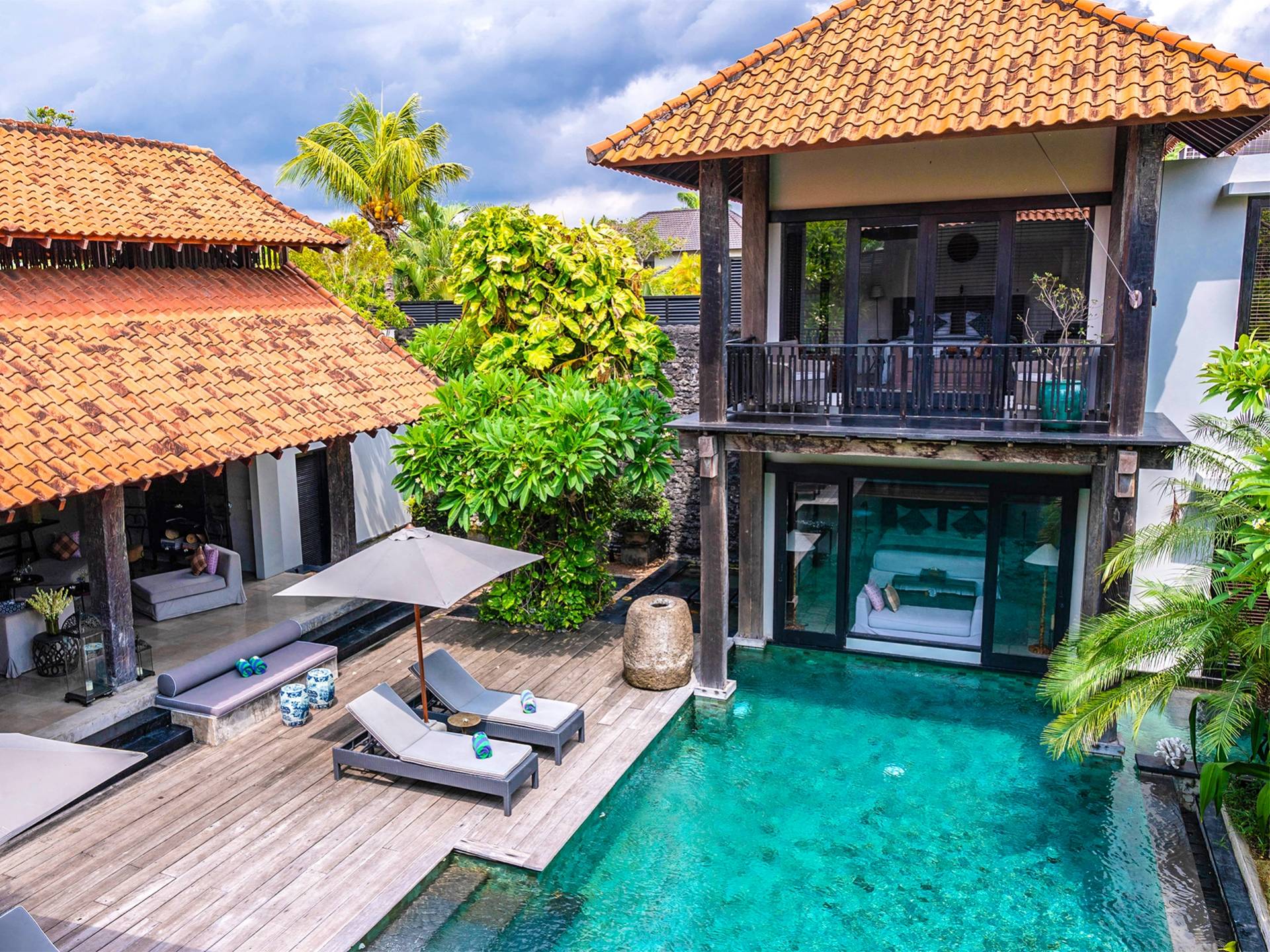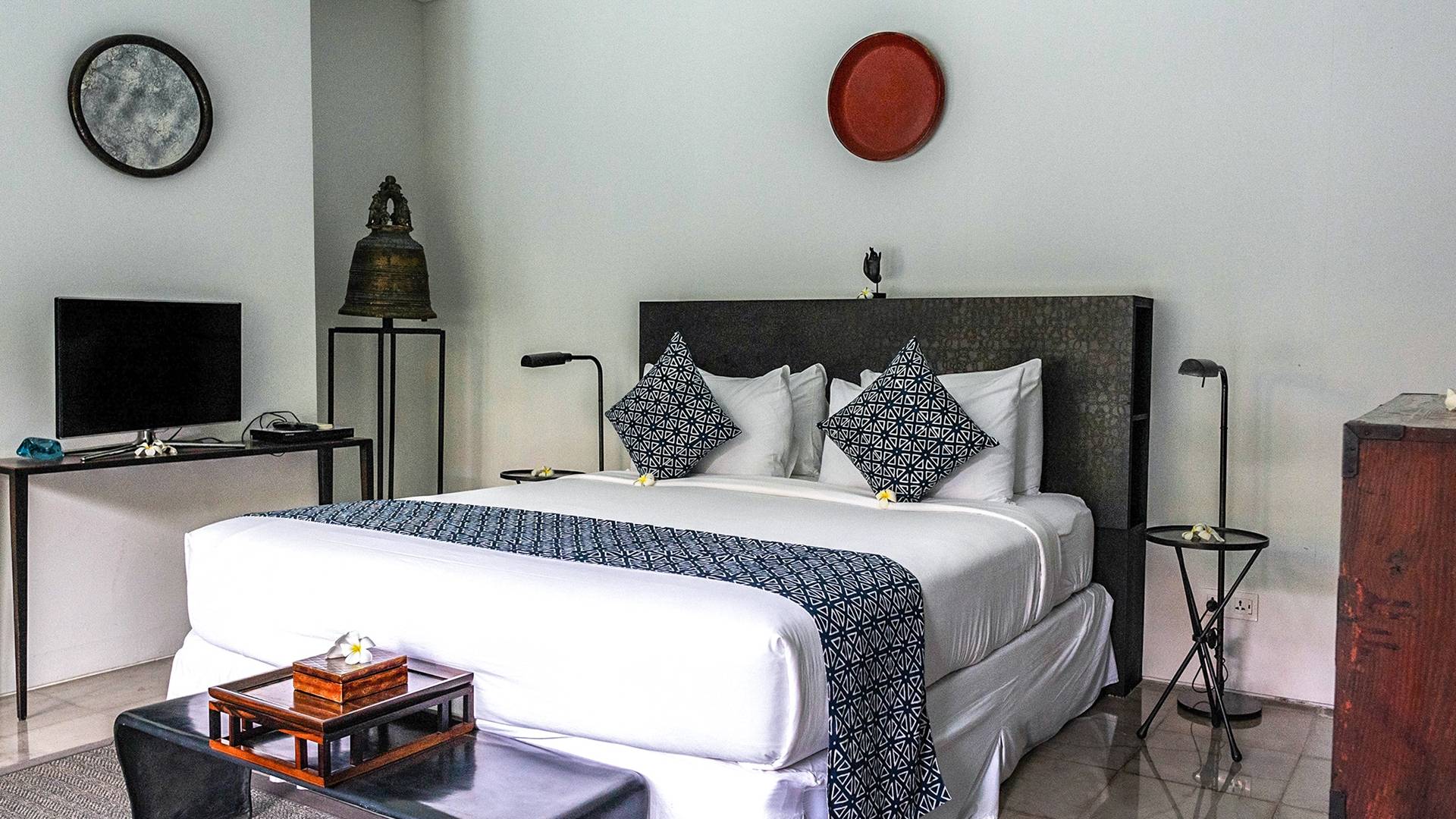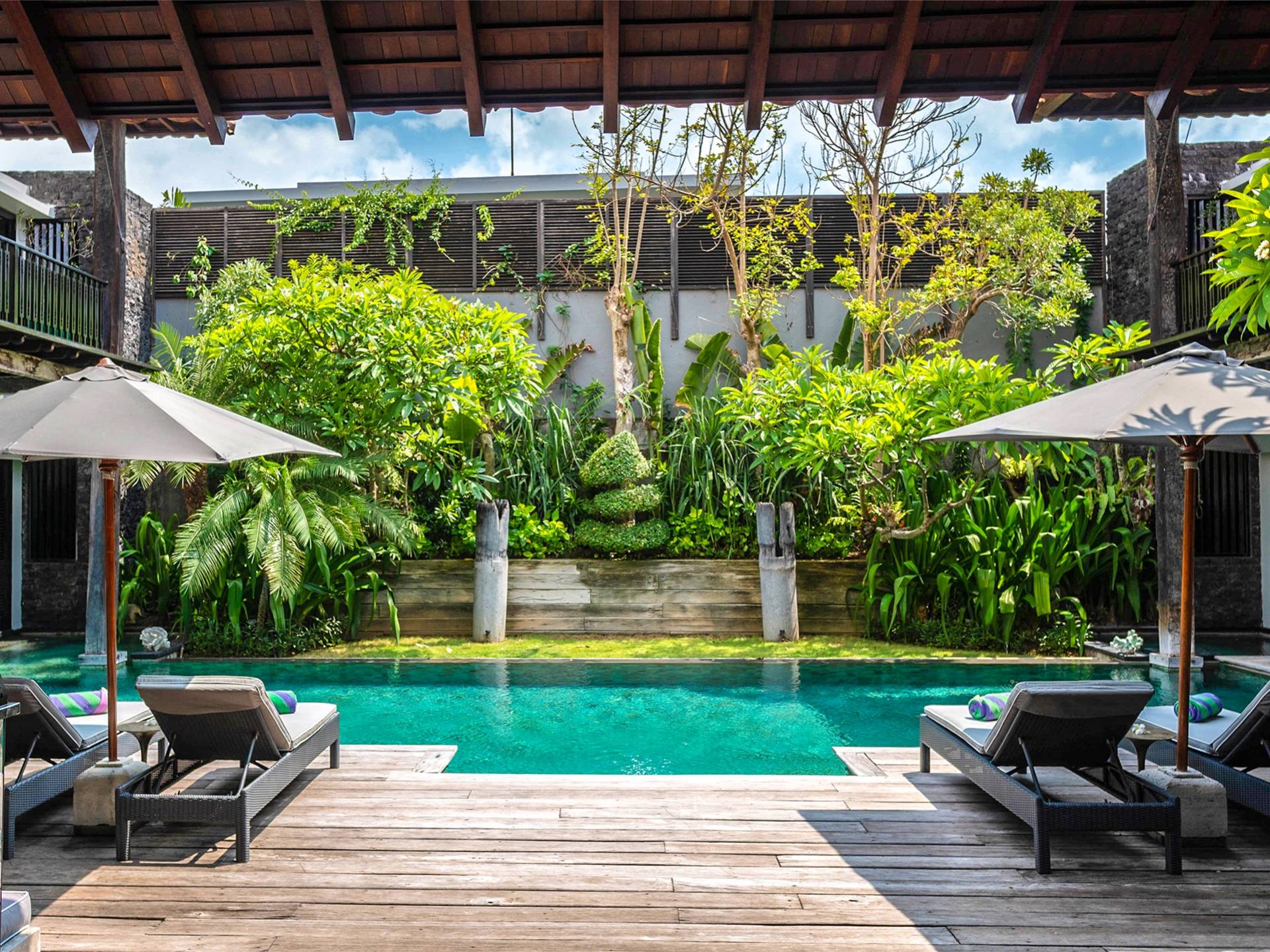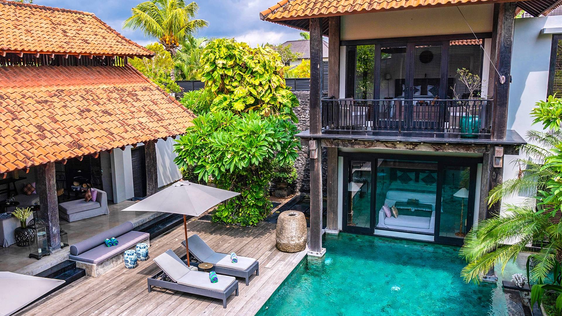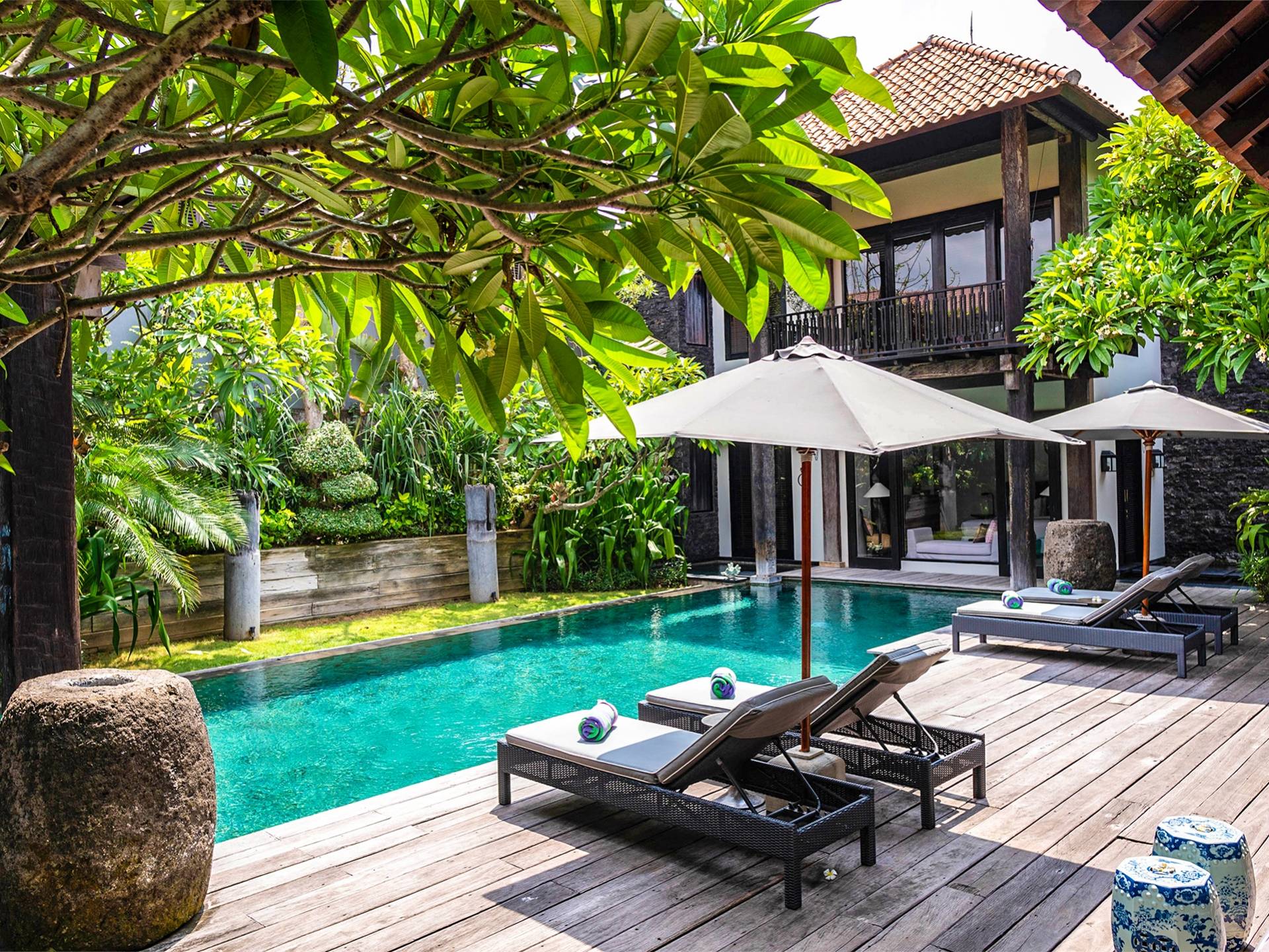 Rústica pero refinada, Villa De Suma insinúa la gracia y el romance de una época pasada, con sus majestuosos pilares de madera de hierro reciclado, antigüedades orientales y curiosidades indonesias. Sin embargo, hay muchas comodidades para garantizar las vacaciones más lujosas, incluidos muebles personalizados, WiFi, parlantes Bose y TV LCD vía satélite en todas partes. La piscina tropical de 12 metros da a un jardín vertical repleto de follaje tropical, mientras que una amplia terraza para tomar el sol tiene tumbonas y tumbonas incorporadas. Las cuatro espaciosas habitaciones son de estilo contemporáneo, con vestidores grandes y baños elegantes y relucientes con azulejos de granito negro y equipados con duchas de efecto lluvia.