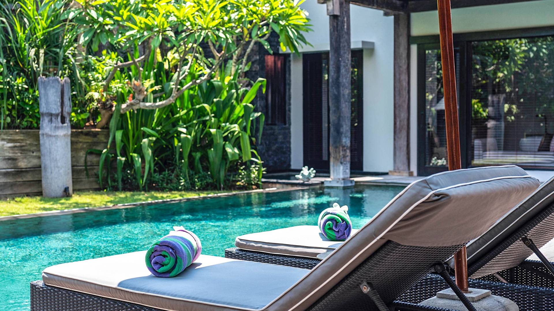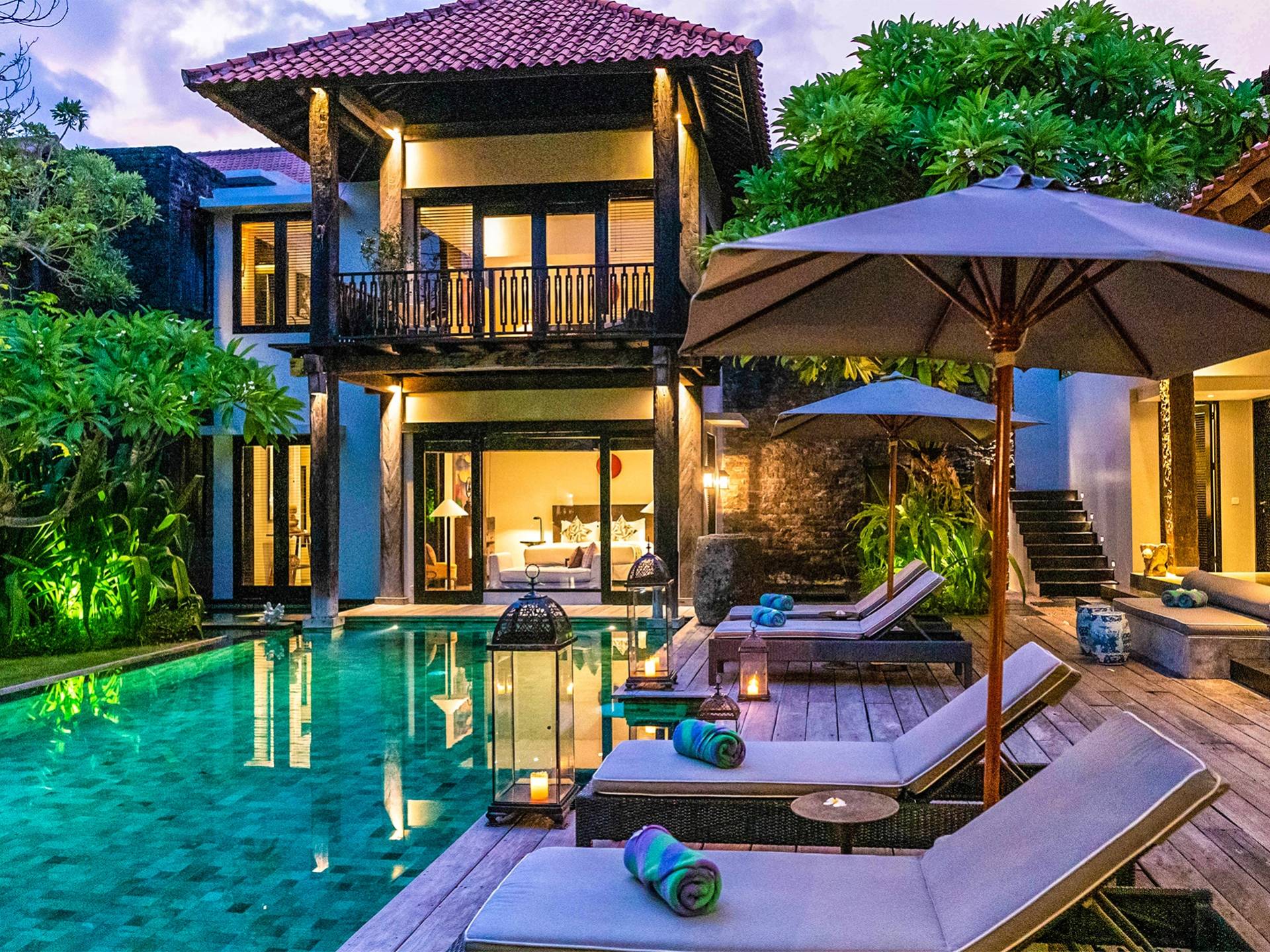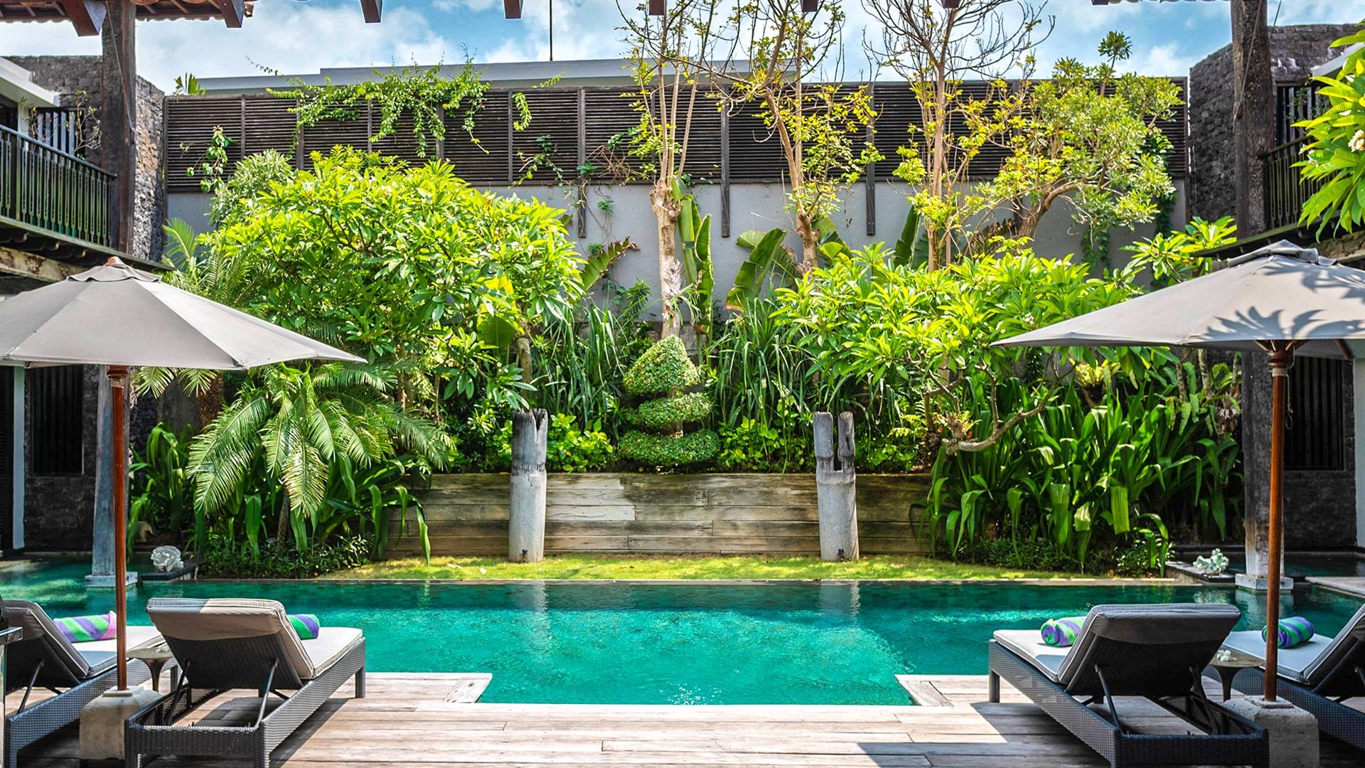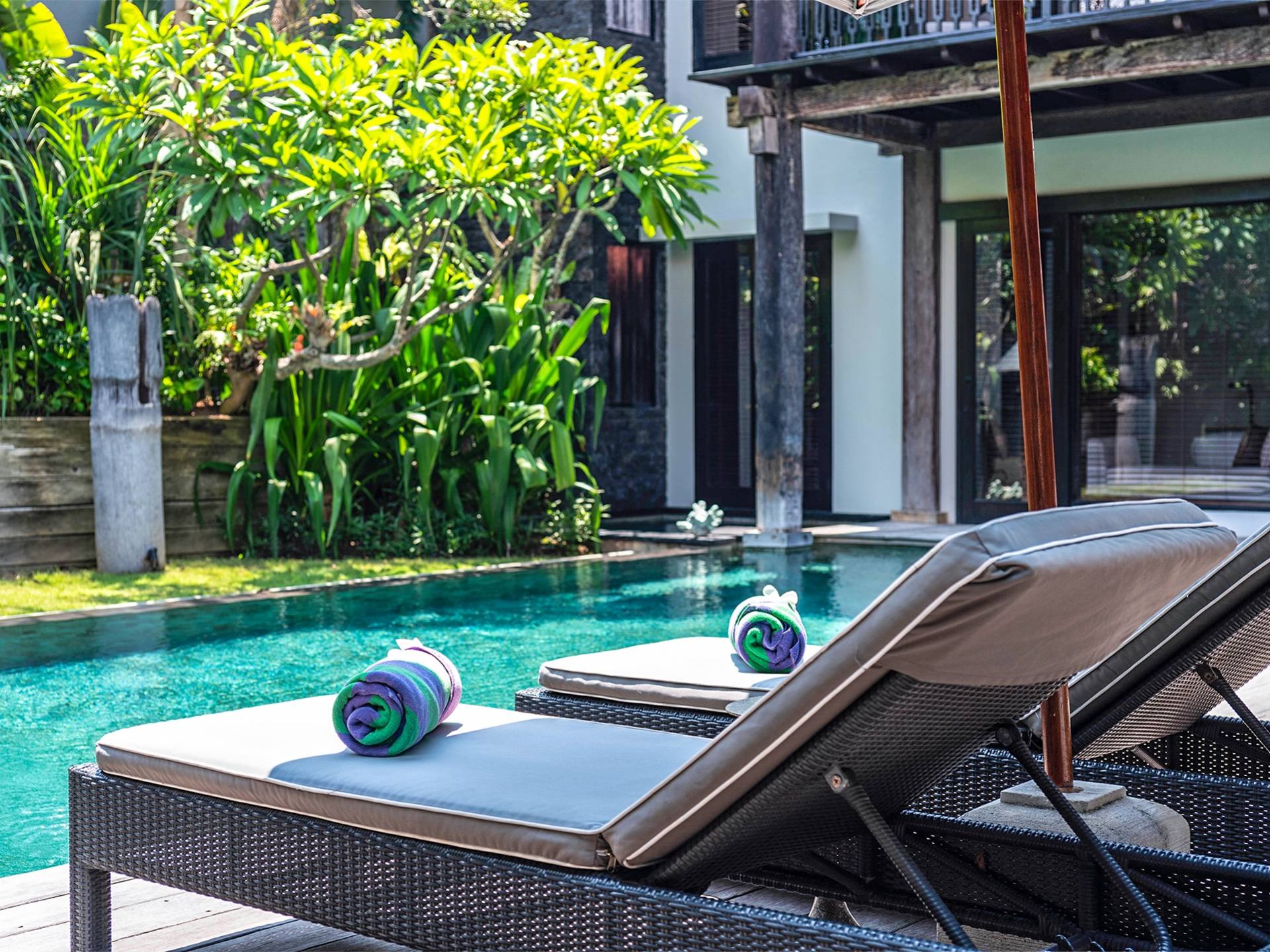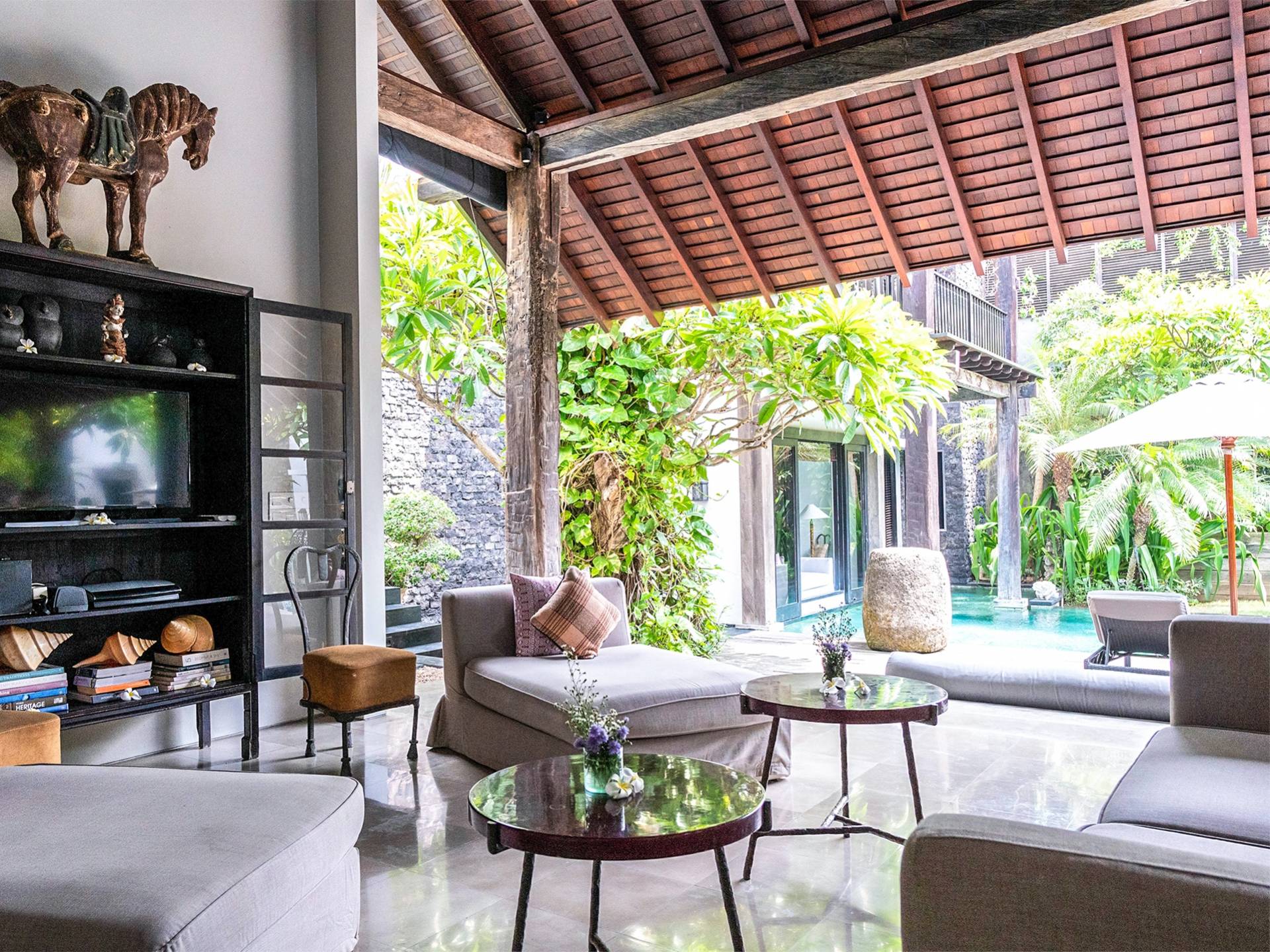 Rústica pero refinada, Villa De Suma insinúa la gracia y el romance de una época pasada, con sus majestuosos pilares de madera de hierro reciclado, antigüedades orientales y curiosidades indonesias. Sin embargo, hay muchas comodidades para garantizar las vacaciones más lujosas, incluidos muebles personalizados, WiFi, parlantes Bose y TV LCD vía satélite en todas partes. La piscina tropical de 12 metros da a un jardín vertical repleto de follaje tropical, mientras que una amplia terraza para tomar el sol tiene tumbonas y tumbonas incorporadas. Las cuatro espaciosas habitaciones son de estilo contemporáneo, con vestidores grandes y baños elegantes y relucientes con azulejos de granito negro y equipados con duchas de efecto lluvia.