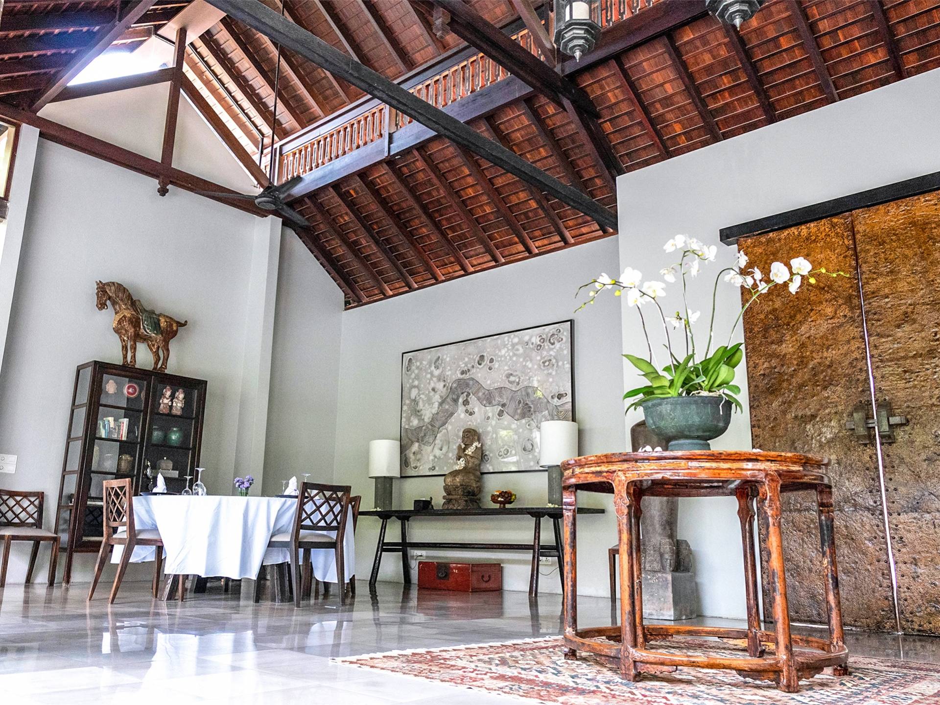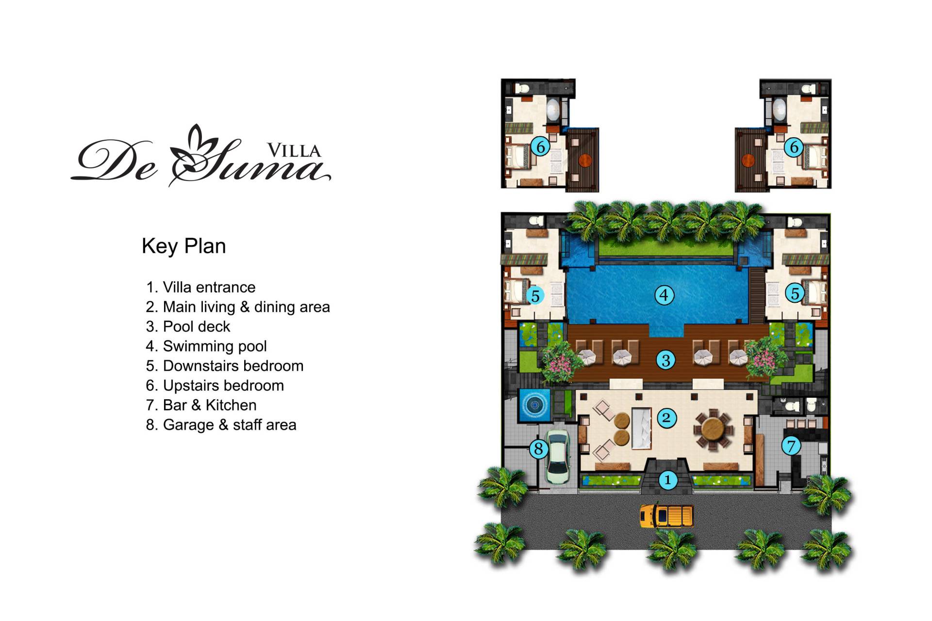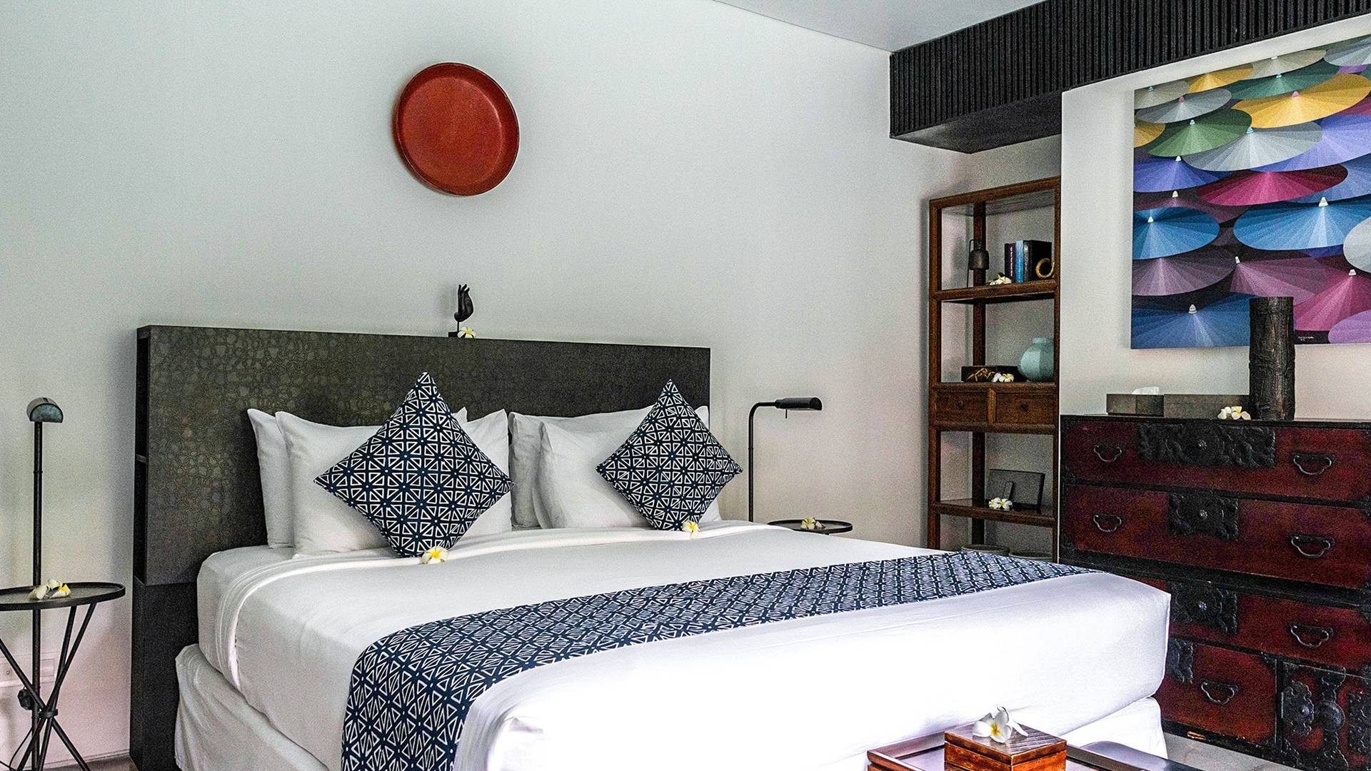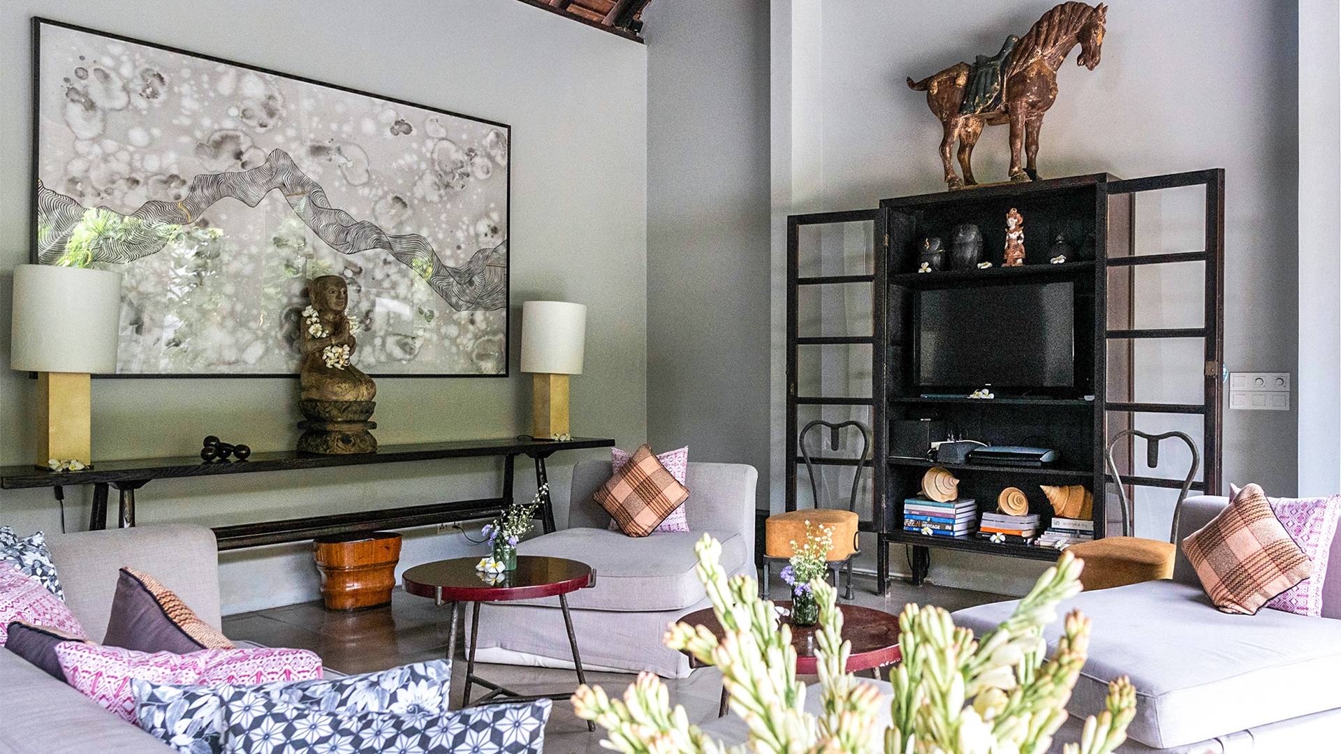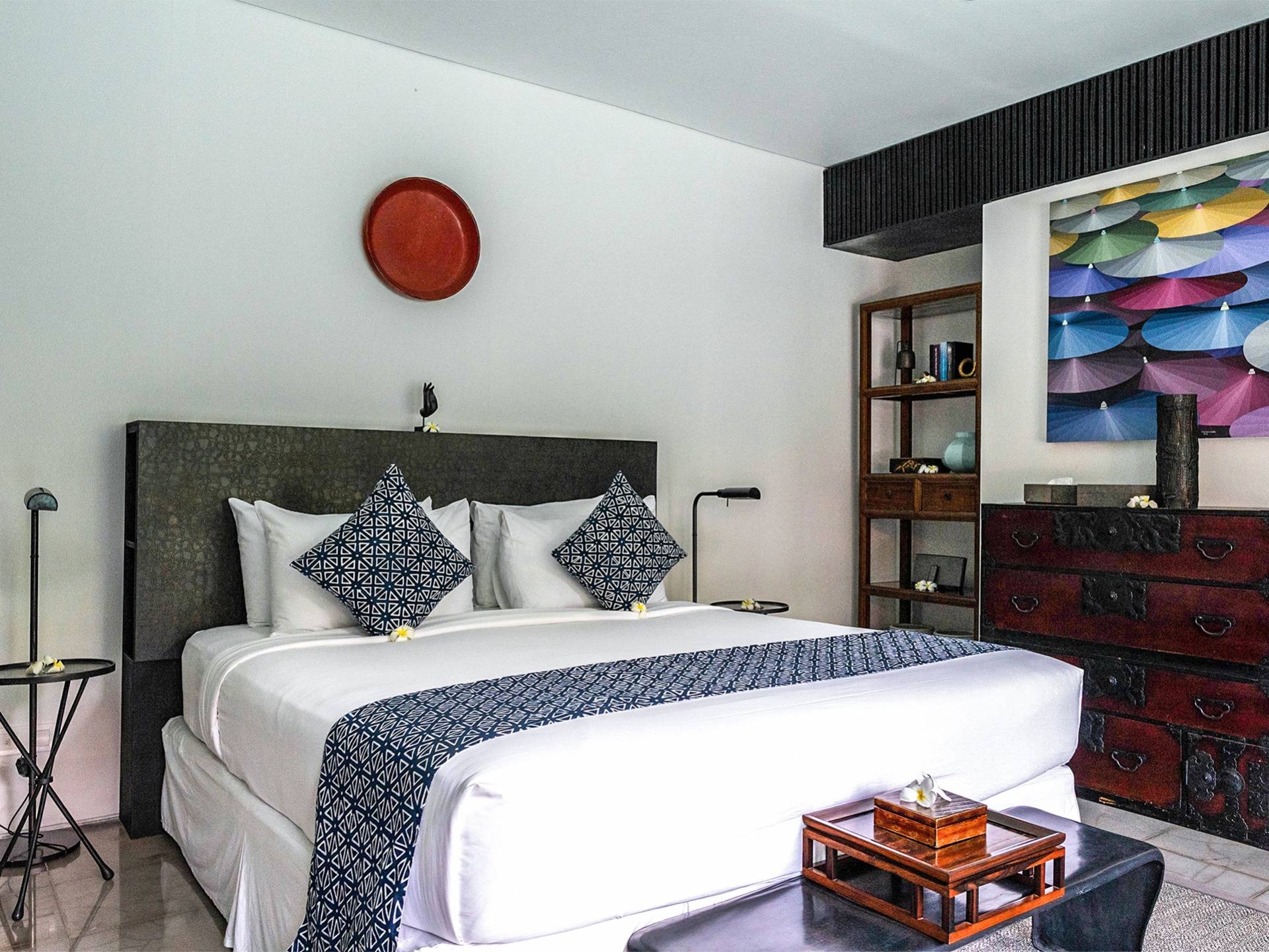 Rústica pero refinada, Villa De Suma insinúa la gracia y el romance de una época pasada, con sus majestuosos pilares de madera de hierro reciclado, antigüedades orientales y curiosidades indonesias. Sin embargo, hay muchas comodidades para garantizar las vacaciones más lujosas, incluidos muebles personalizados, WiFi, parlantes Bose y TV LCD vía satélite en todas partes. La piscina tropical de 12 metros da a un jardín vertical repleto de follaje tropical, mientras que una amplia terraza para tomar el sol tiene tumbonas y tumbonas incorporadas. Las cuatro espaciosas habitaciones son de estilo contemporáneo, con vestidores grandes y baños elegantes y relucientes con azulejos de granito negro y equipados con duchas de efecto lluvia.
