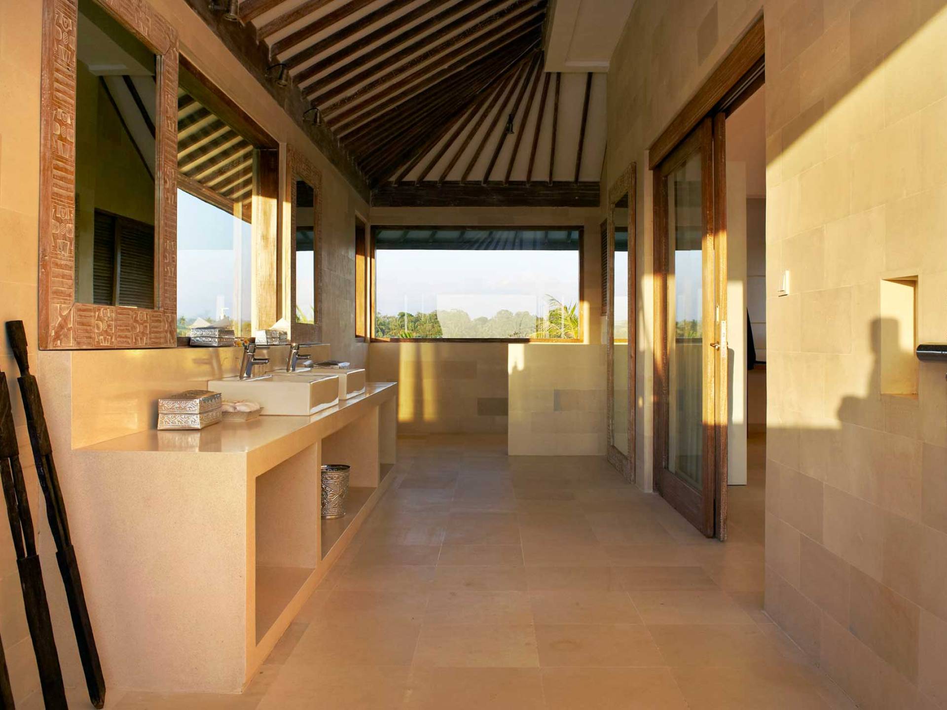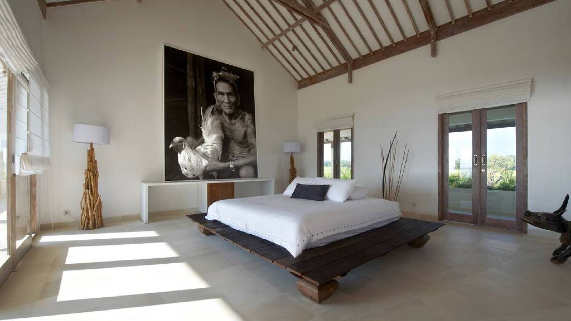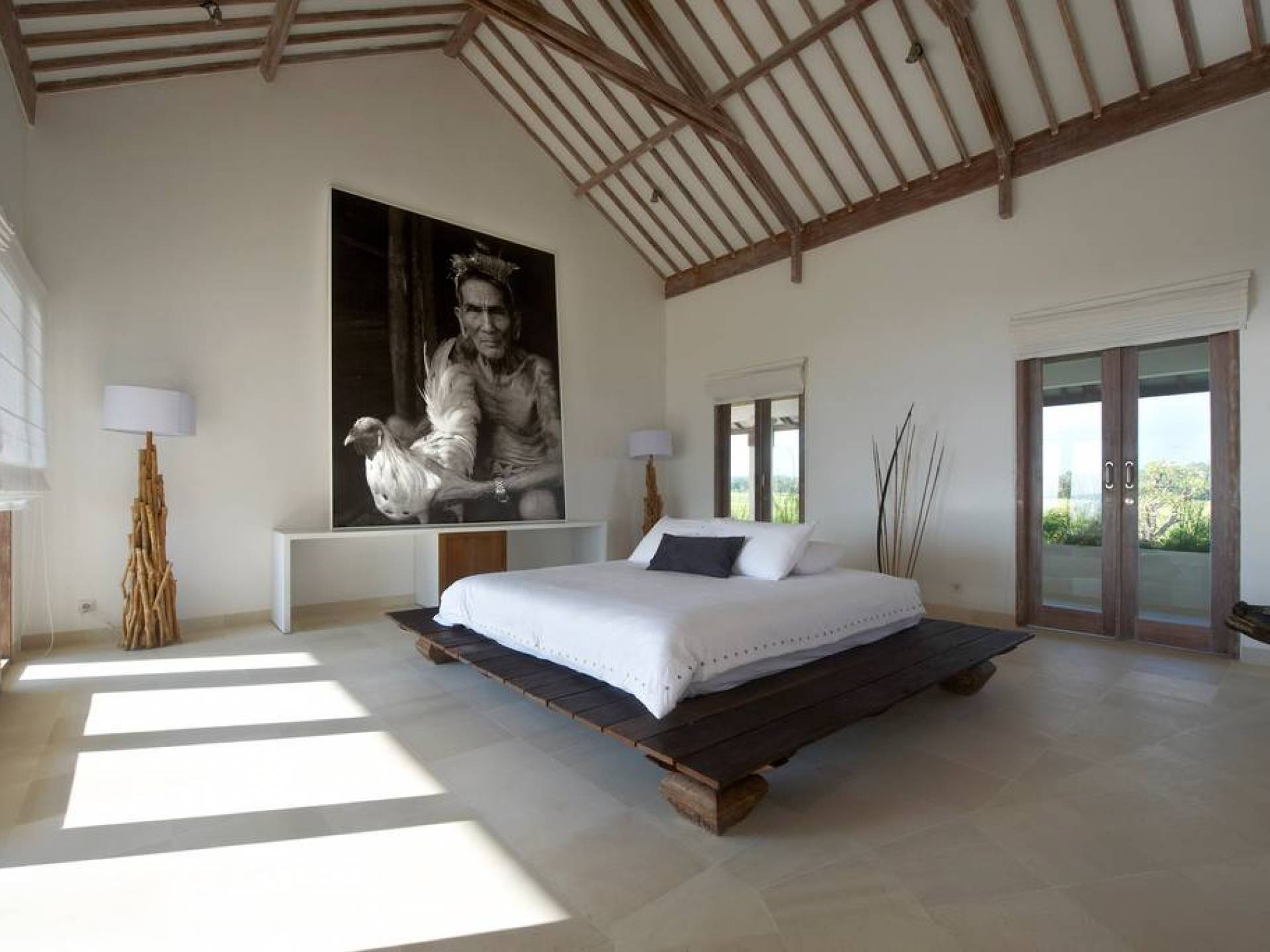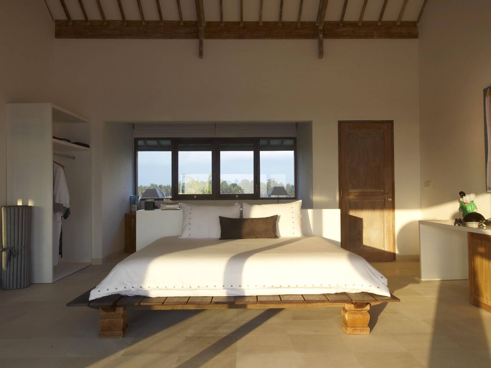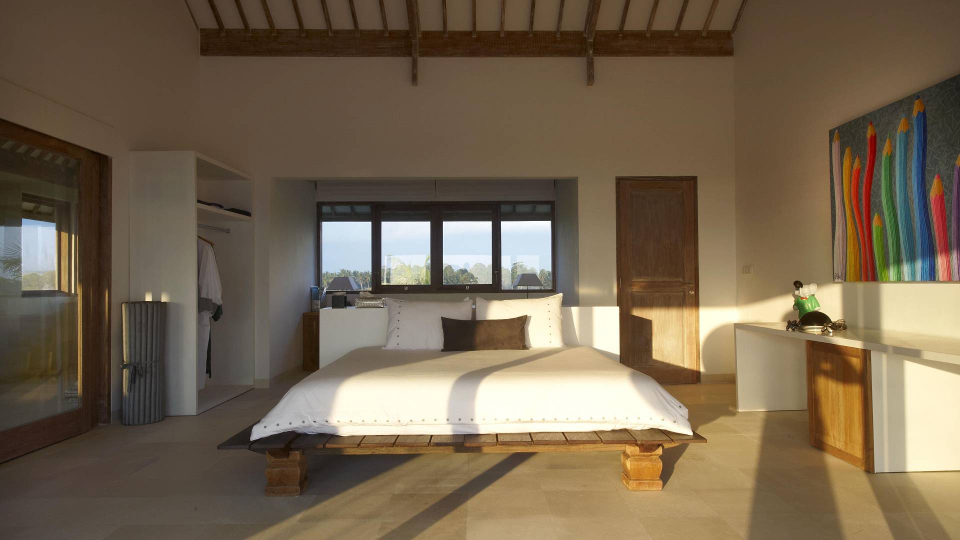 Dormitorio principal de Villa Babar, caracterizado por puertas de vidrio en dos lados, que permiten el acceso desde ambos lados del edificio. Cuenta con un piso de piedra Yogya bajo un techo altísimo con vigas abiertas. Está amueblada con una cama kingsize, que está equipada con un colchón profundo que descansa sobre una base de tablones de madera de hierro antiguo. También hay espacio para colgar, un aparador empotrado, estatuas de madera de Kalimantan y un escritorio junto a una amplia ventana con vistas a los arrozales y al monte Batukaru. Hay una amplia terraza soleada en la parte delantera de esta habitación, que ofrece maravillosas vistas de la costa y el cielo nocturno.