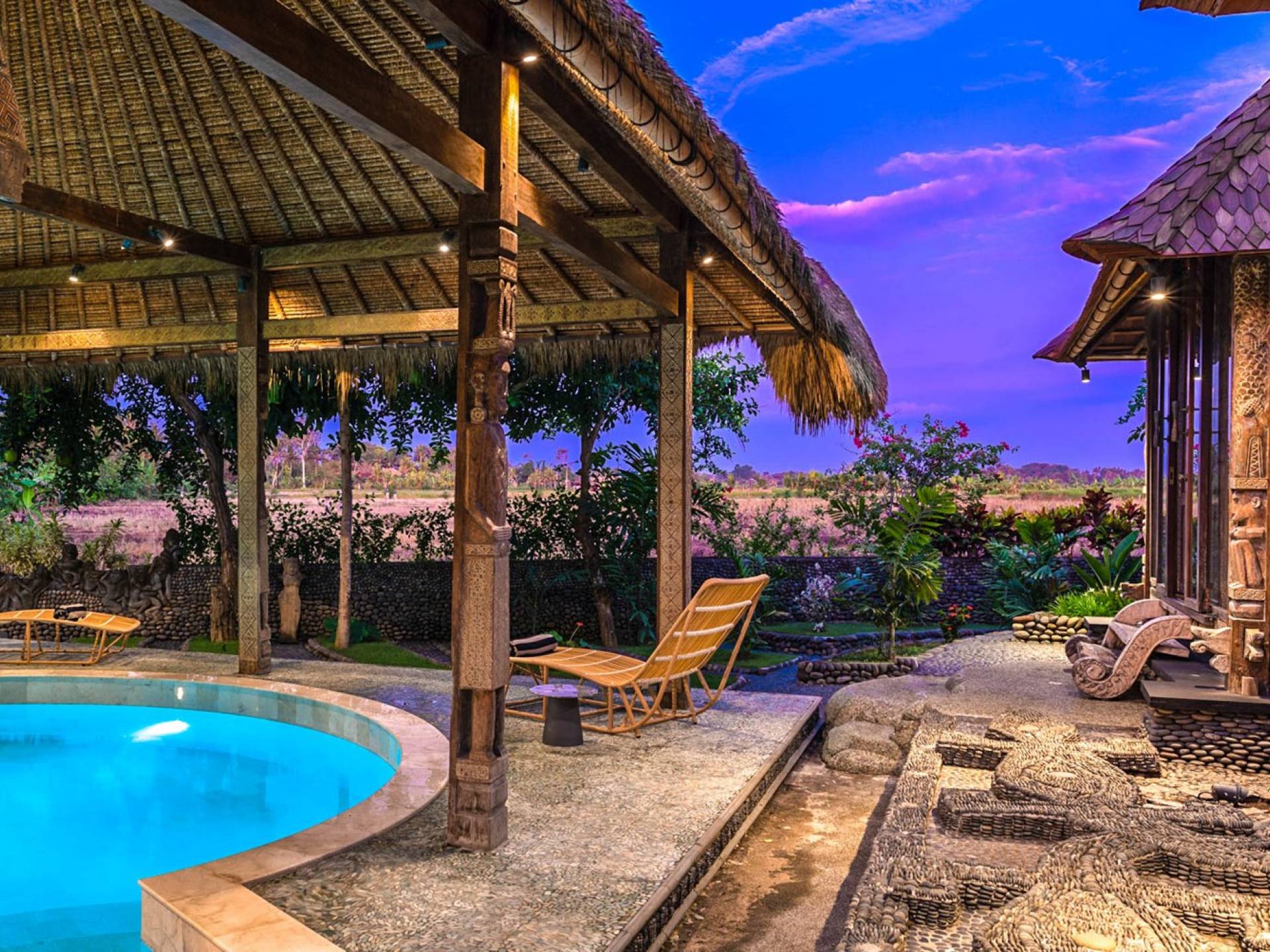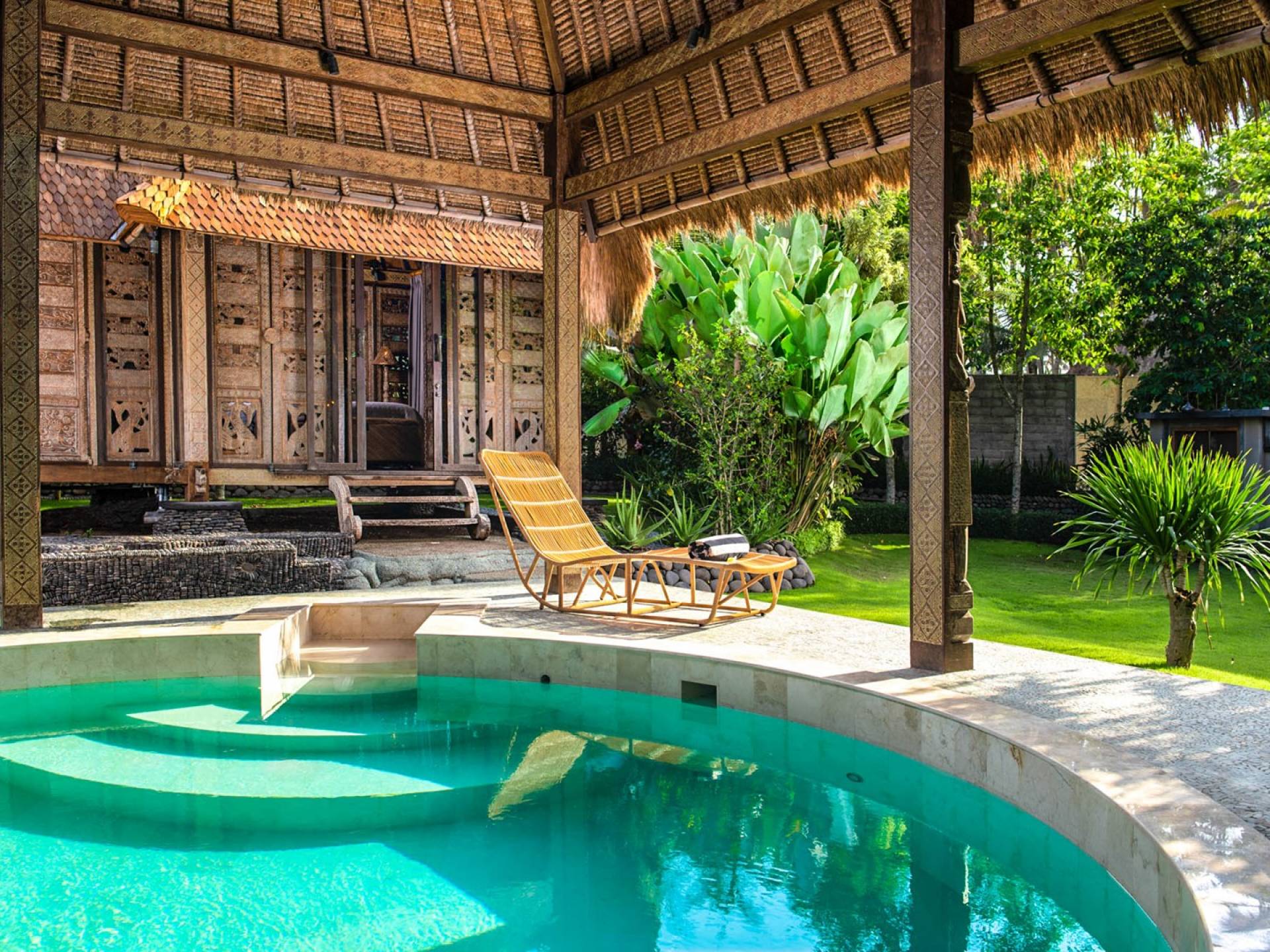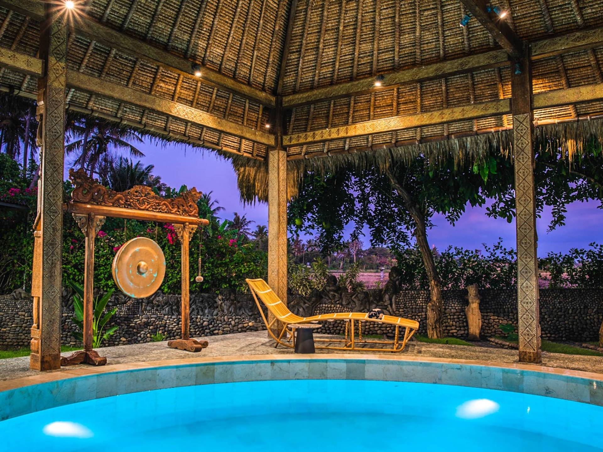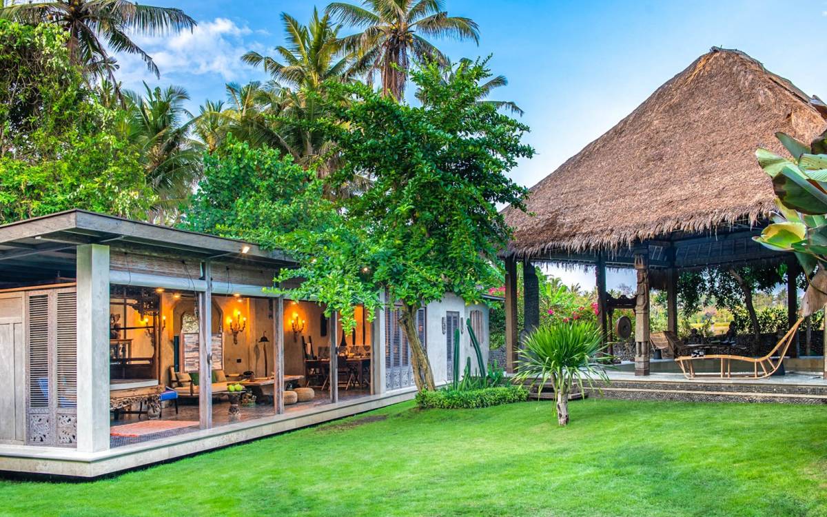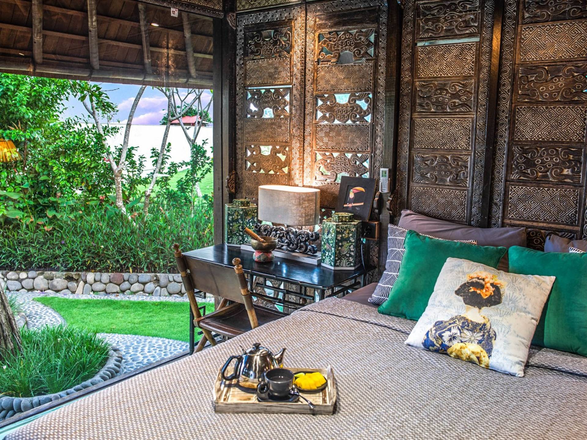 La villa cuenta con artefactos únicos de todo el planeta: meticulosos tallados en madera de Timor y Bali, lámparas de cobre y bronce de Marruecos y muebles antiguos de Java y China. Su jardín privado está lleno de árboles frutales, lo que brinda una sensación verdaderamente tropical. La piscina está techada para mayor privacidad durante los tratamientos de spa tradicionales y las prácticas curativas. La propiedad está rodeada de interminables campos de arroz, verde esmeralda por la mañana, naranja o violeta al atardecer