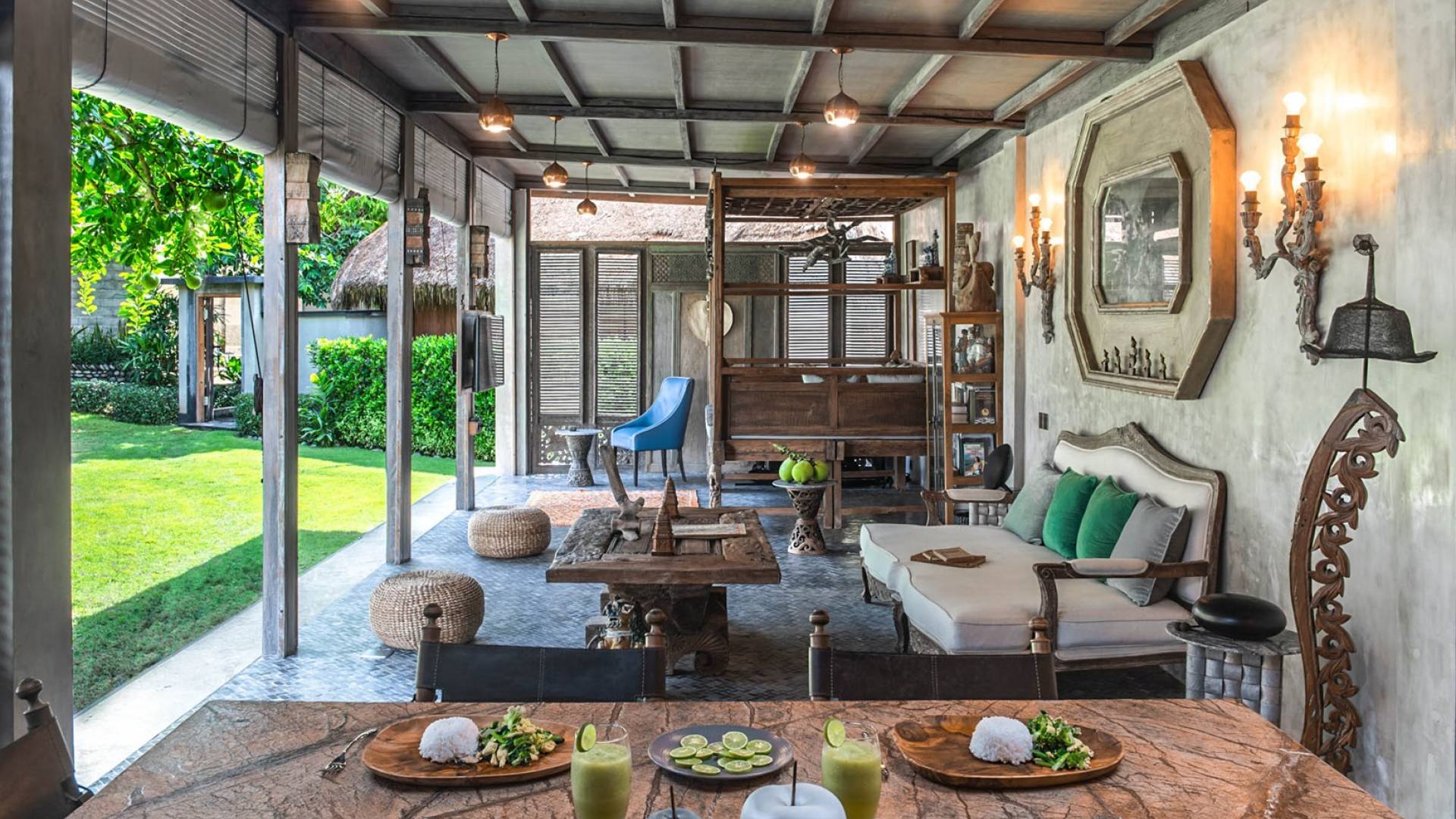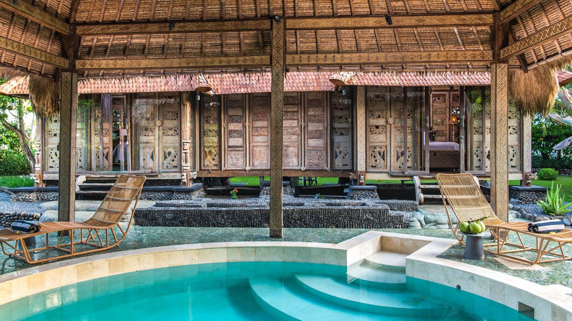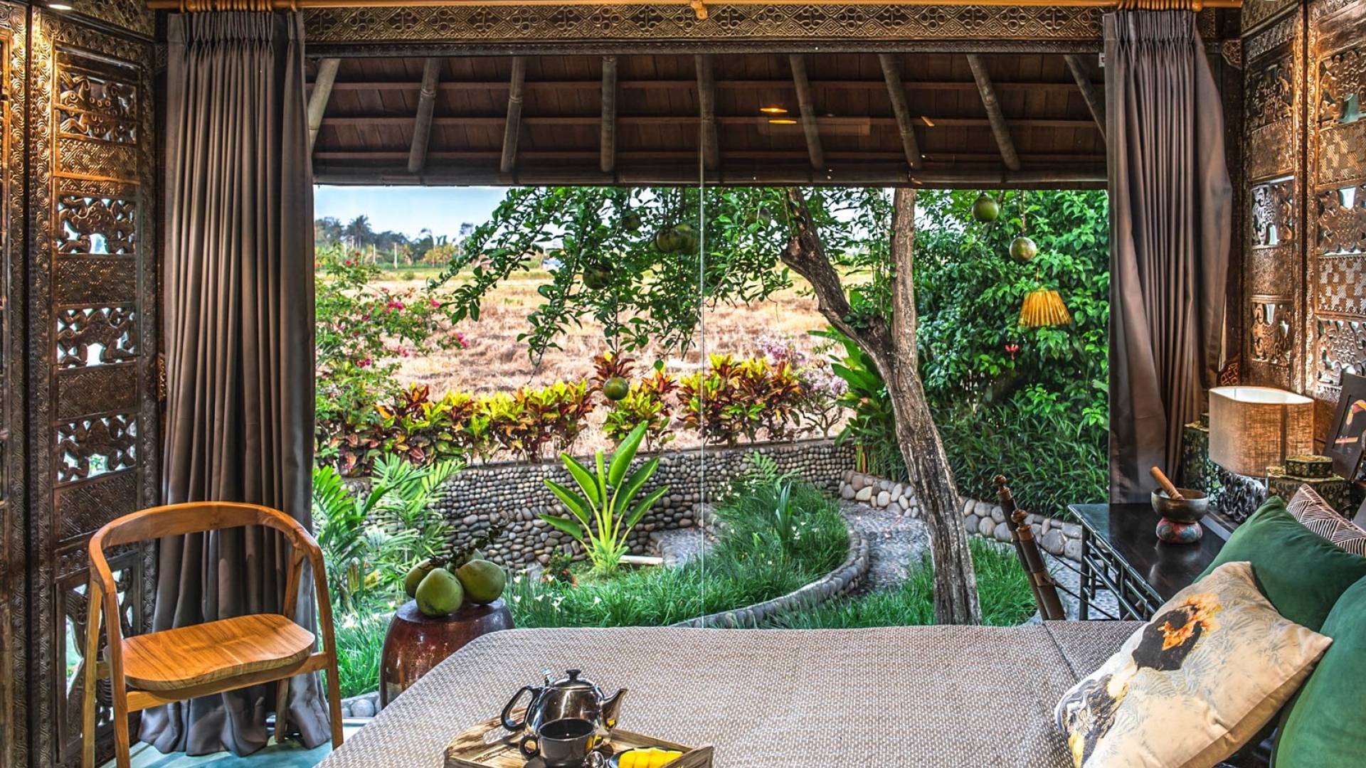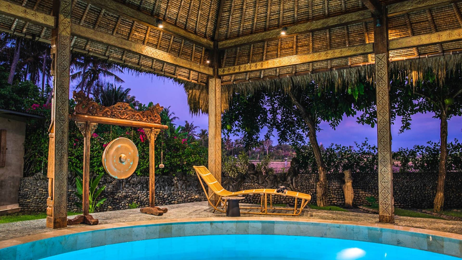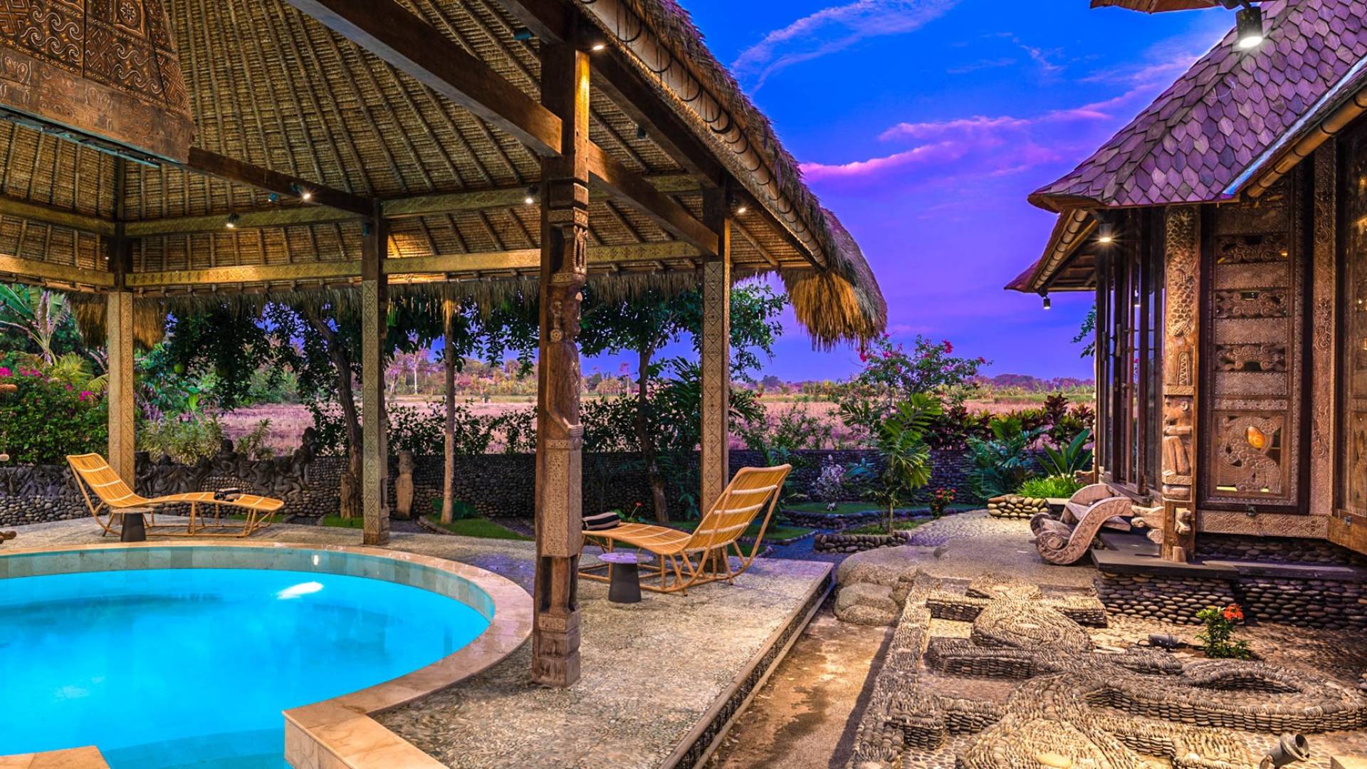 La villa cuenta con artefactos únicos de todo el planeta: meticulosos tallados en madera de Timor y Bali, lámparas de cobre y bronce de Marruecos y muebles antiguos de Java y China. Su jardín privado está lleno de árboles frutales, lo que brinda una sensación verdaderamente tropical. La piscina está techada para mayor privacidad durante los tratamientos de spa tradicionales y las prácticas curativas. La propiedad está rodeada de interminables campos de arroz, verde esmeralda por la mañana, naranja o violeta al atardecer