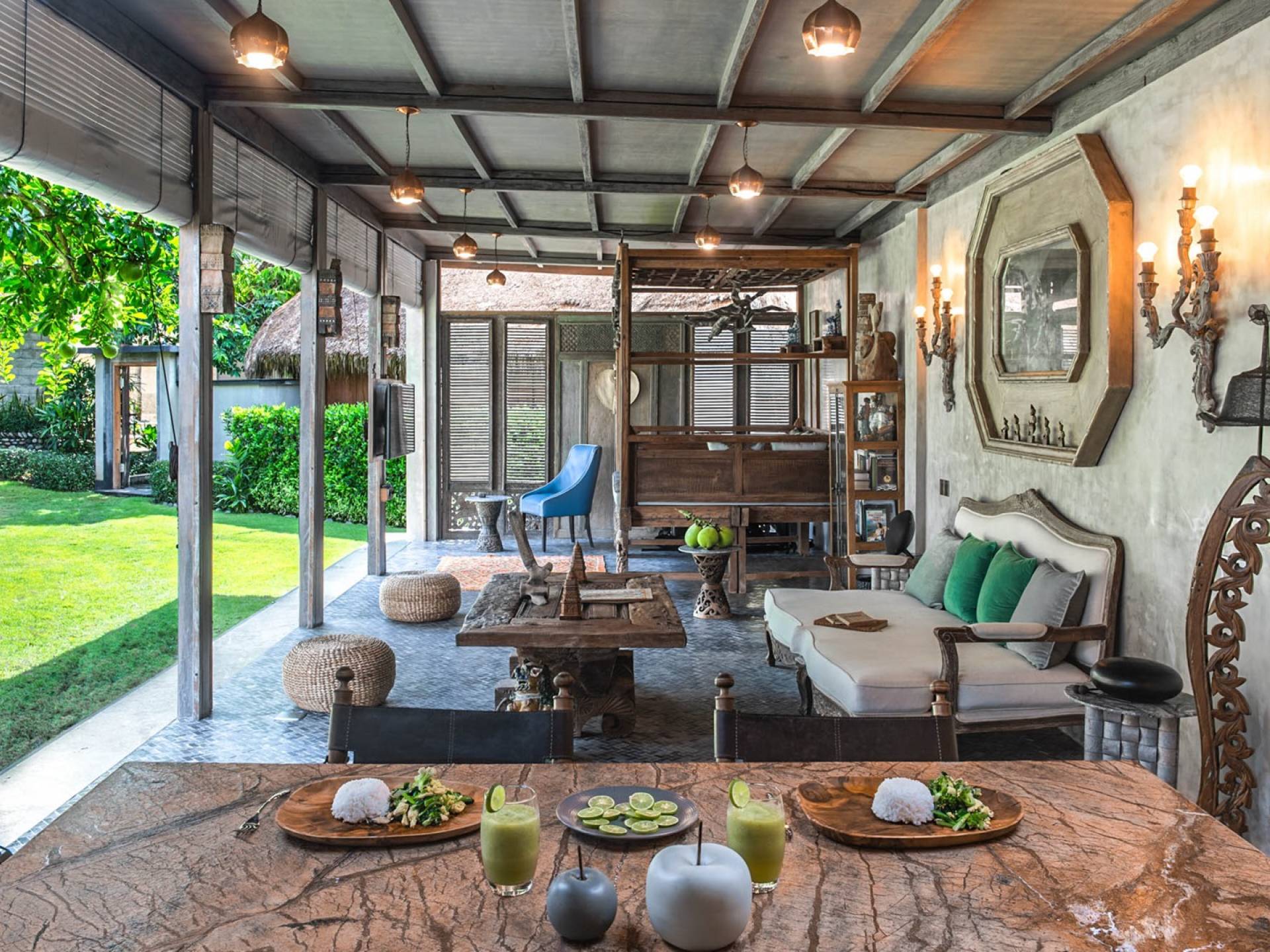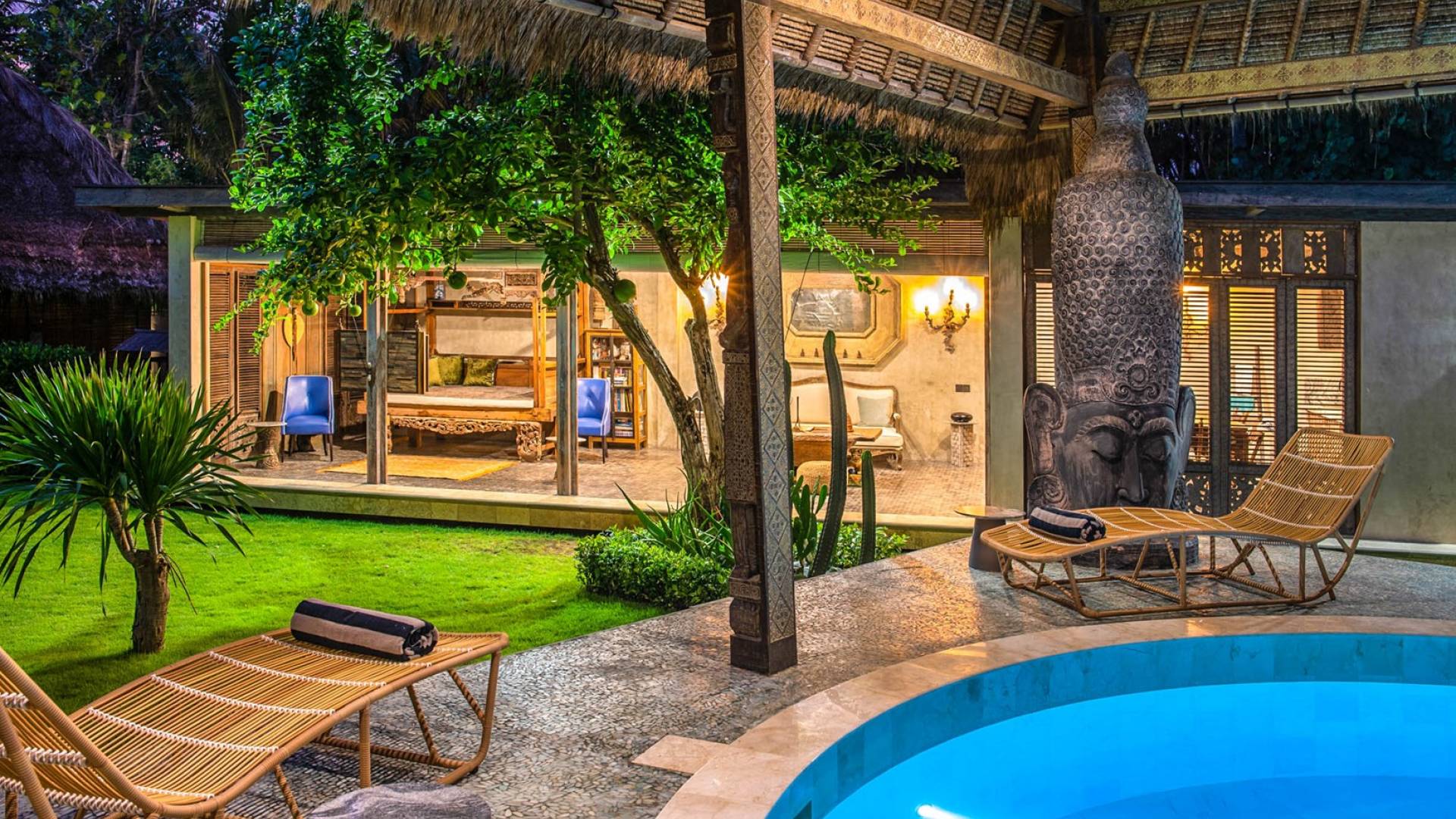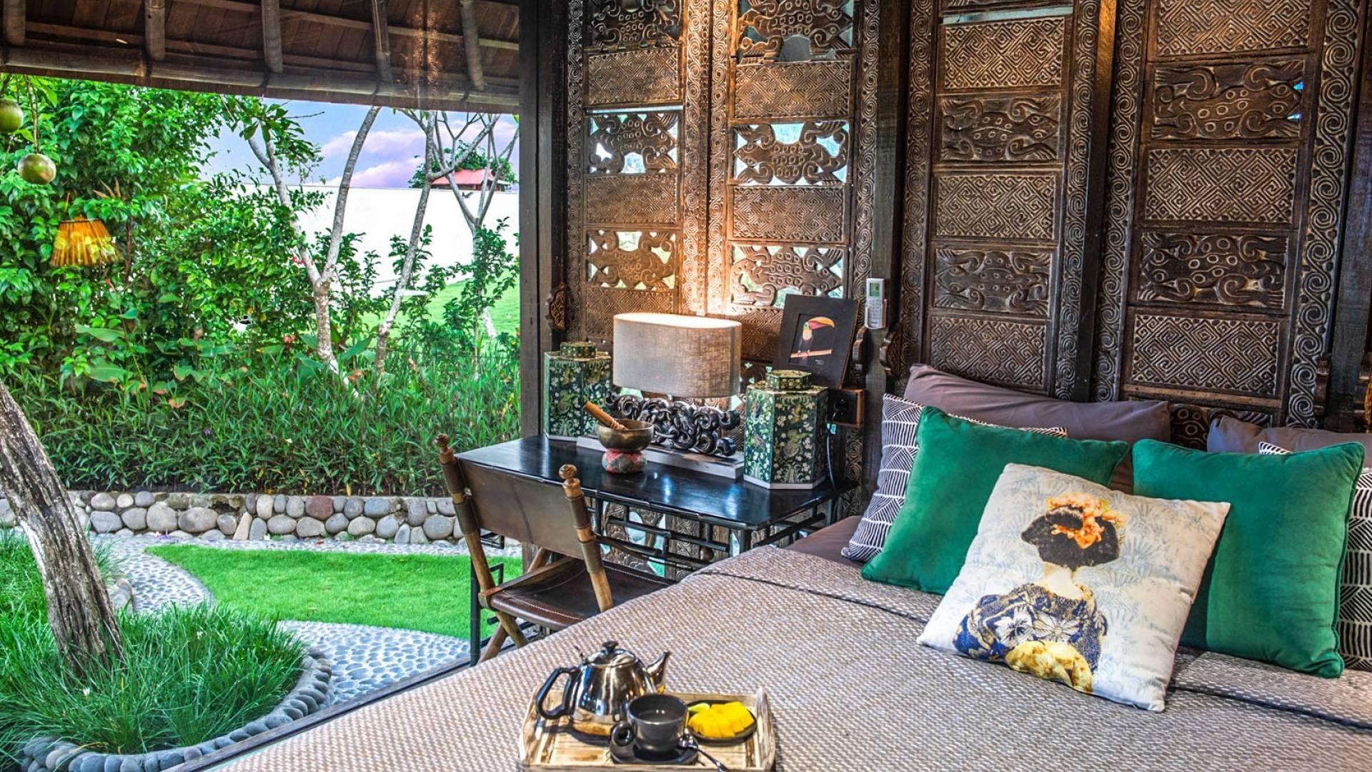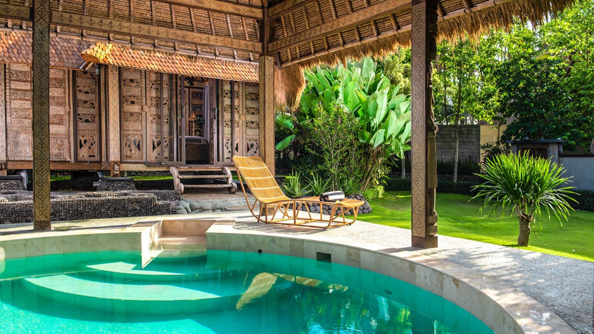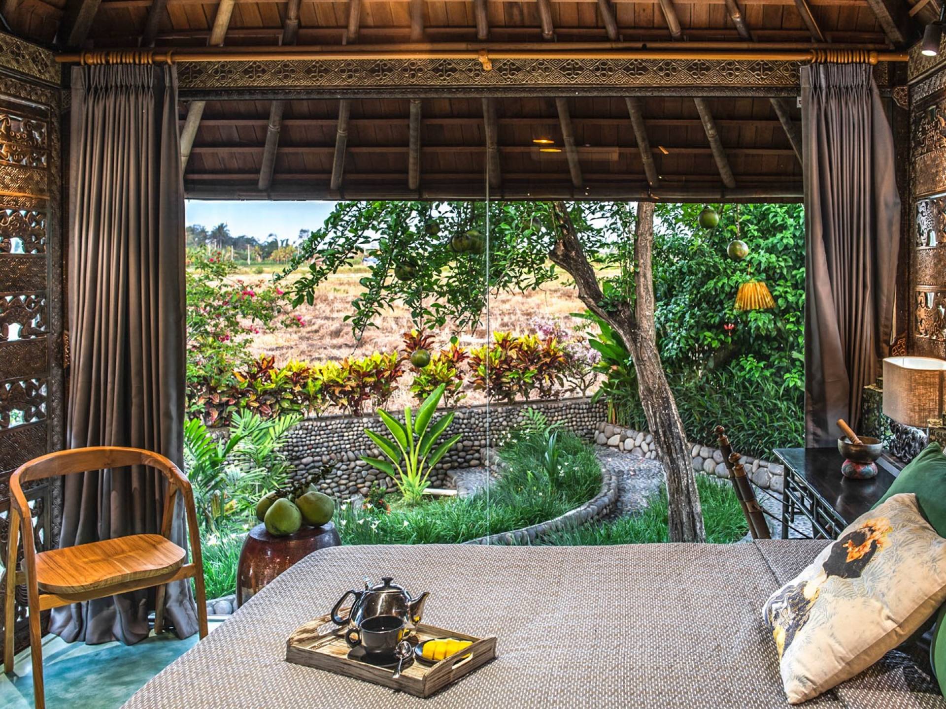 La villa cuenta con artefactos únicos de todo el planeta: meticulosos tallados en madera de Timor y Bali, lámparas de cobre y bronce de Marruecos y muebles antiguos de Java y China. Su jardín privado está lleno de árboles frutales, lo que brinda una sensación verdaderamente tropical. La piscina está techada para mayor privacidad durante los tratamientos de spa tradicionales y las prácticas curativas. La propiedad está rodeada de interminables campos de arroz, verde esmeralda por la mañana, naranja o violeta al atardecer